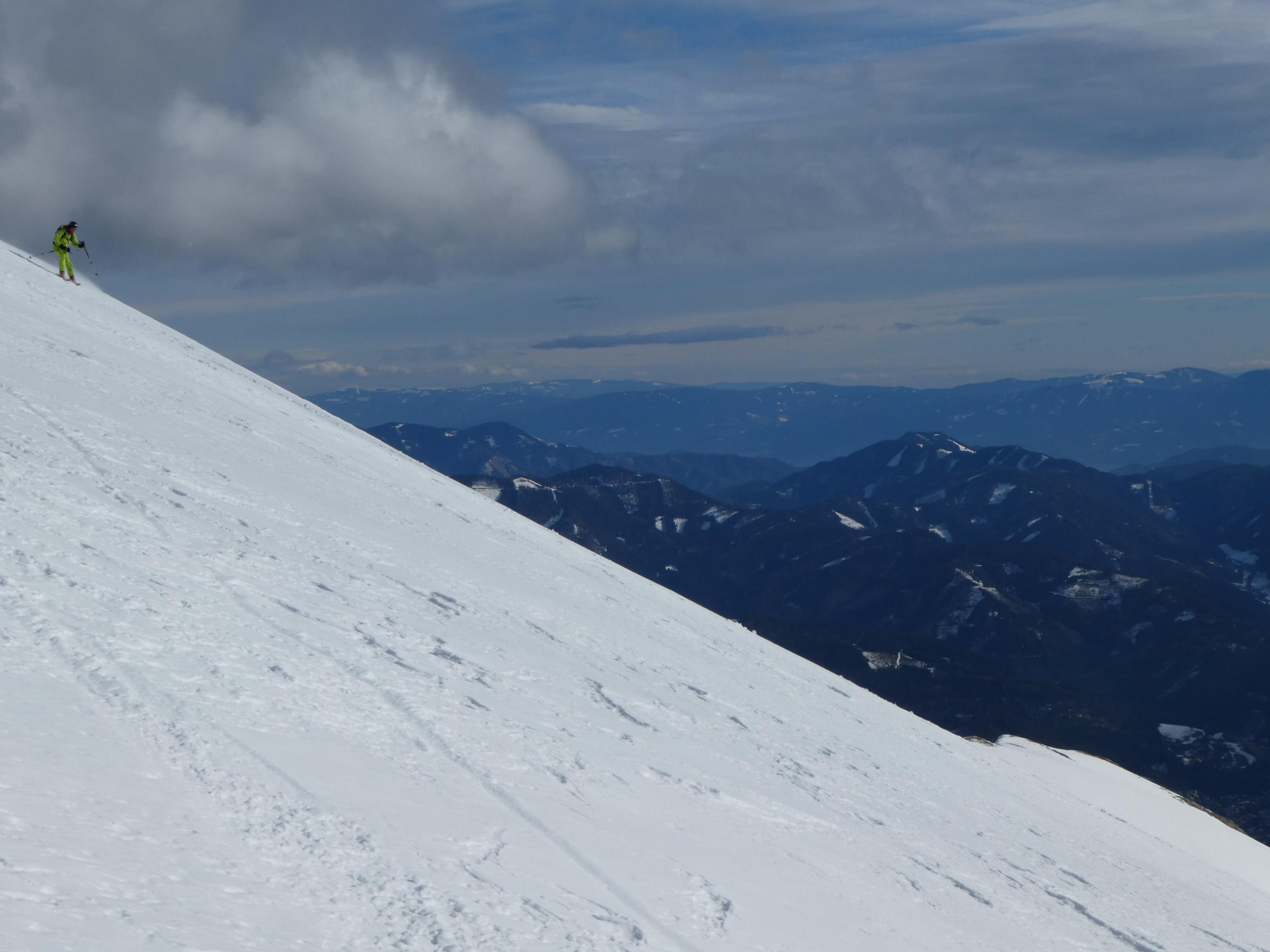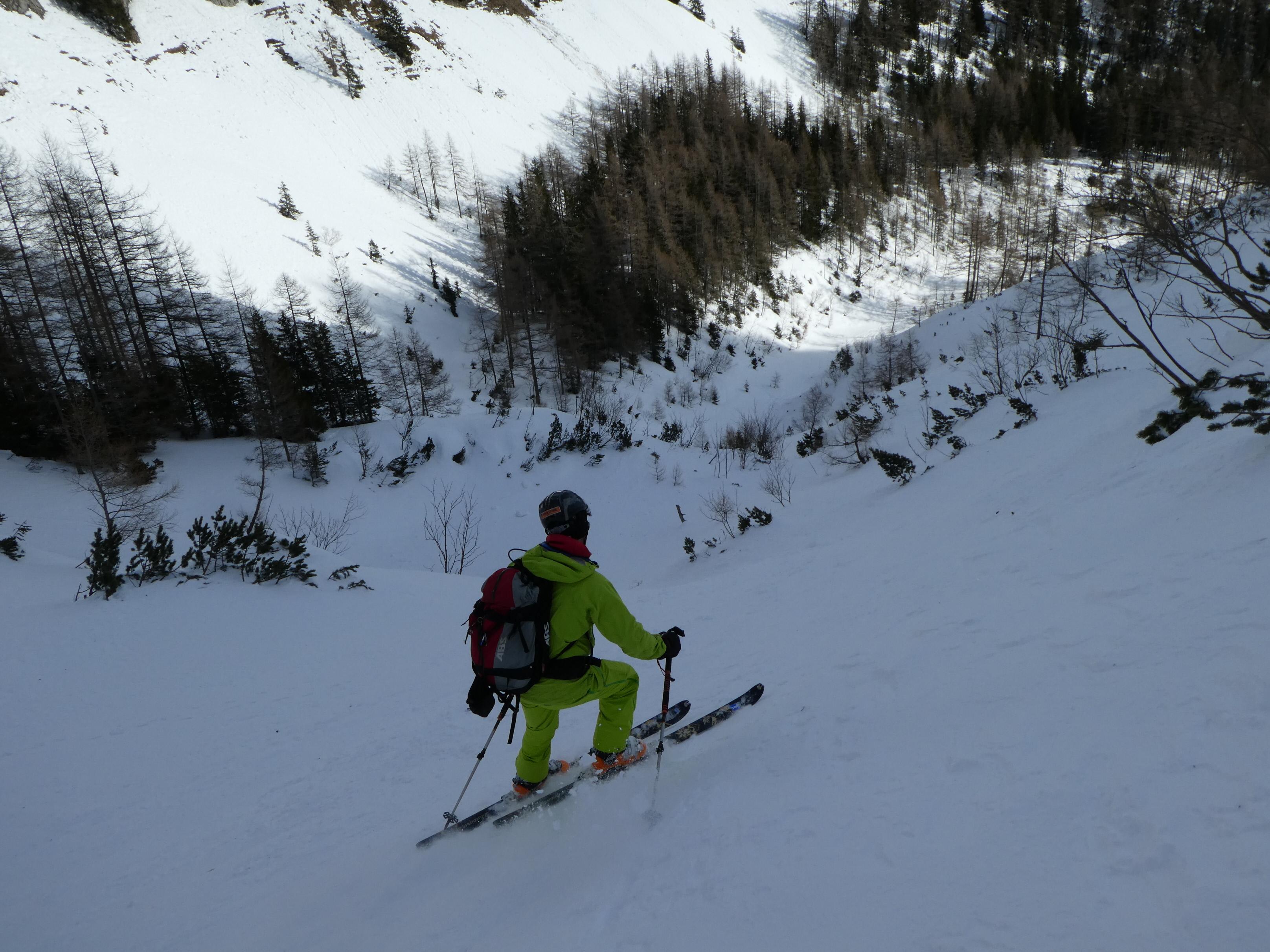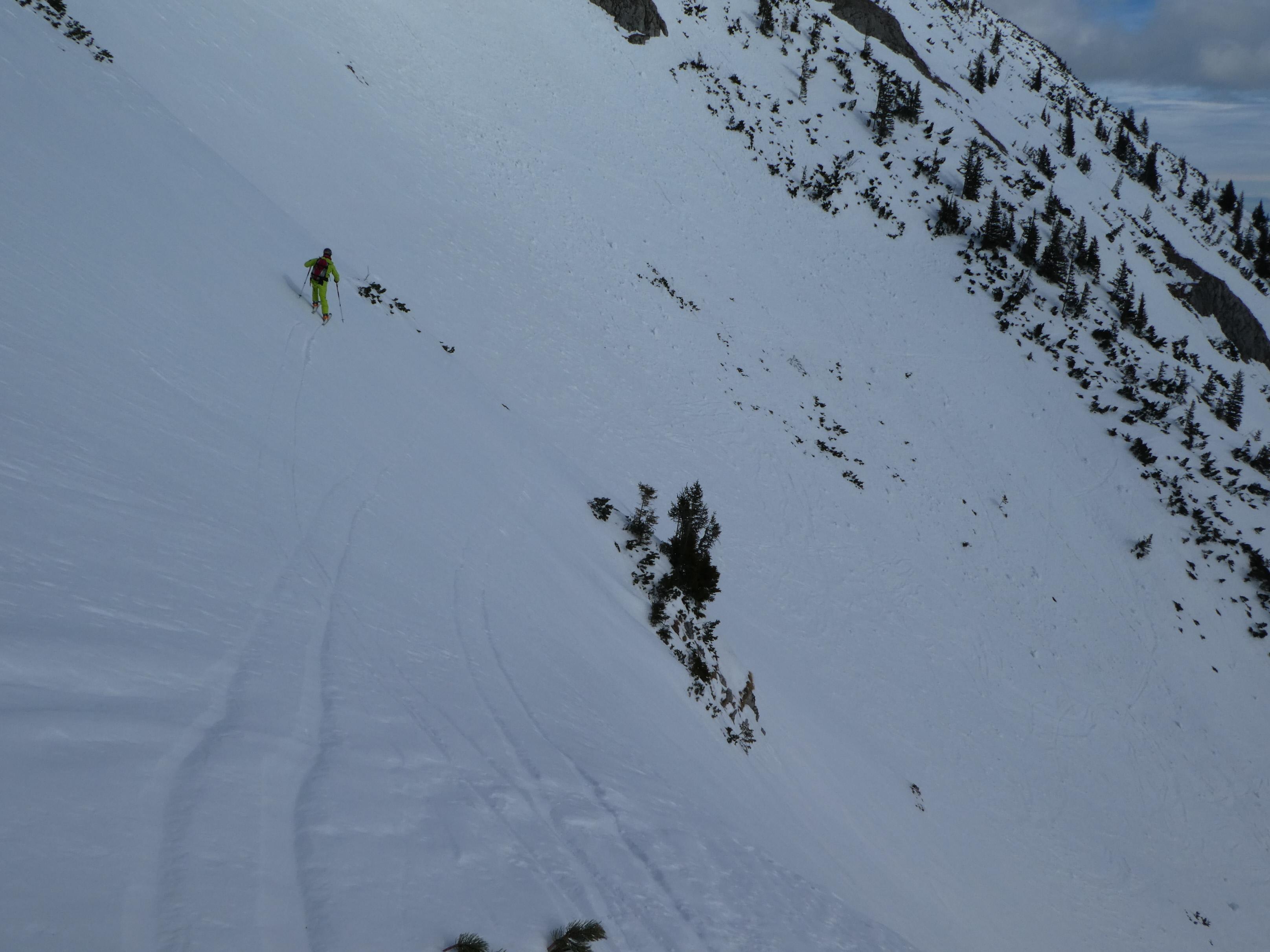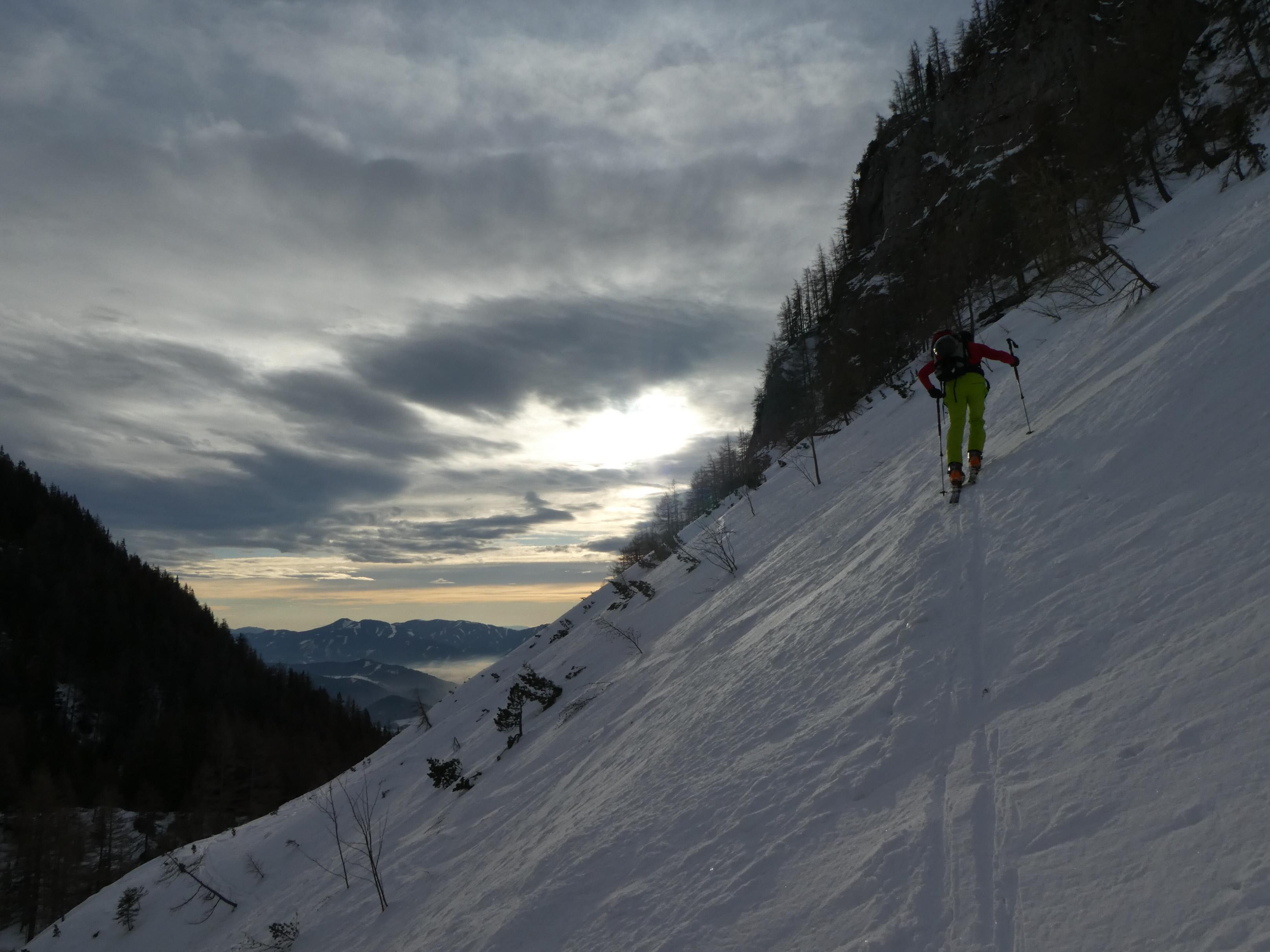 Wegen des sehr kurzen Schönwetterfensters am Vormittag vor dem Herannahen der Front hat es nicht aufegfirnt. Das hat die Tour über 1.350 Hm, gespickt mit 4 Steilstufen zu einem sehr alpinen Abenteuer gemacht. Vor allem die letzte Querung in der 4. Steilstufe war trotz Harscheisen auf der pickelharten Unterlage sehr fordernd und tw. grenzwertig