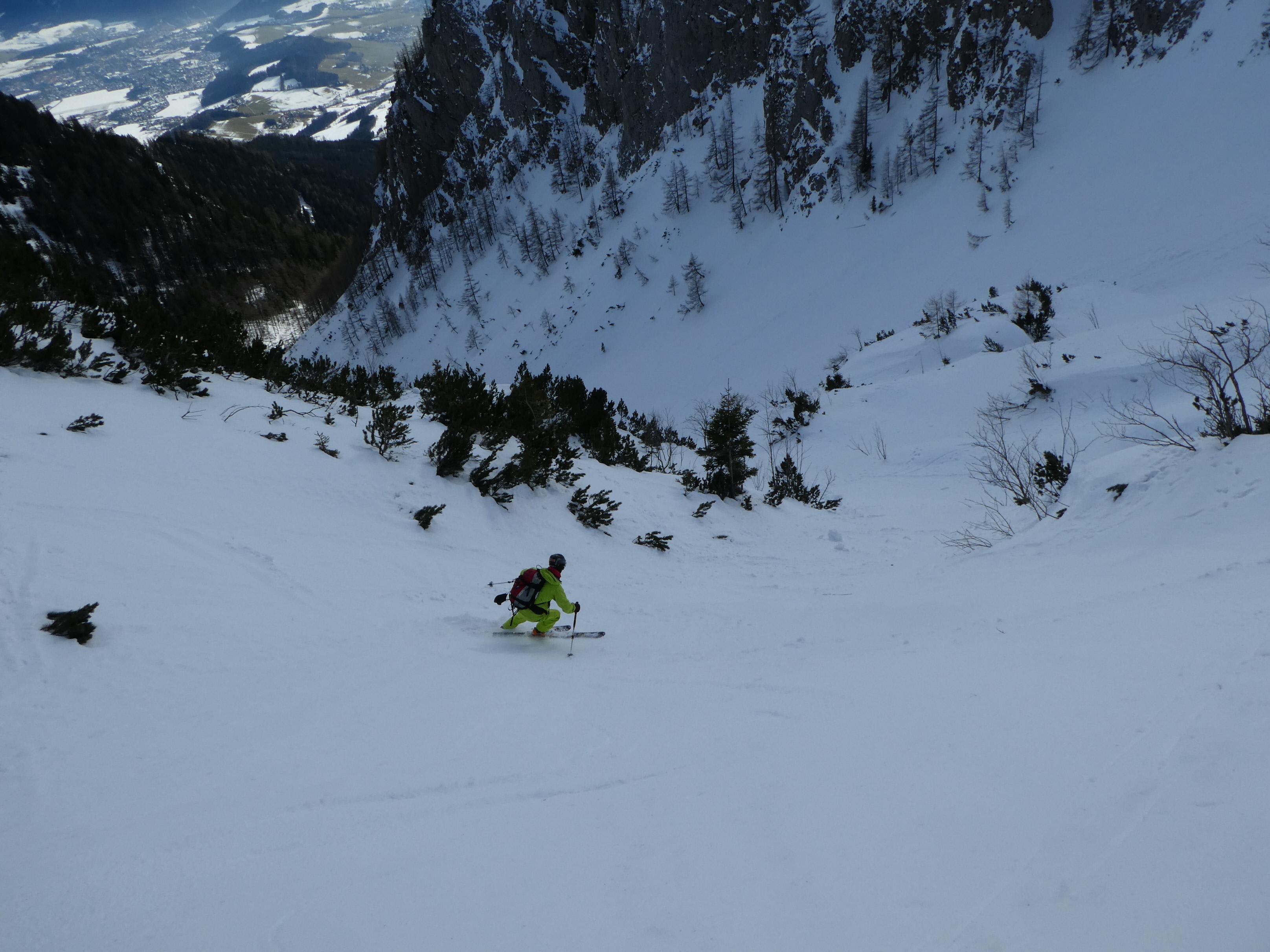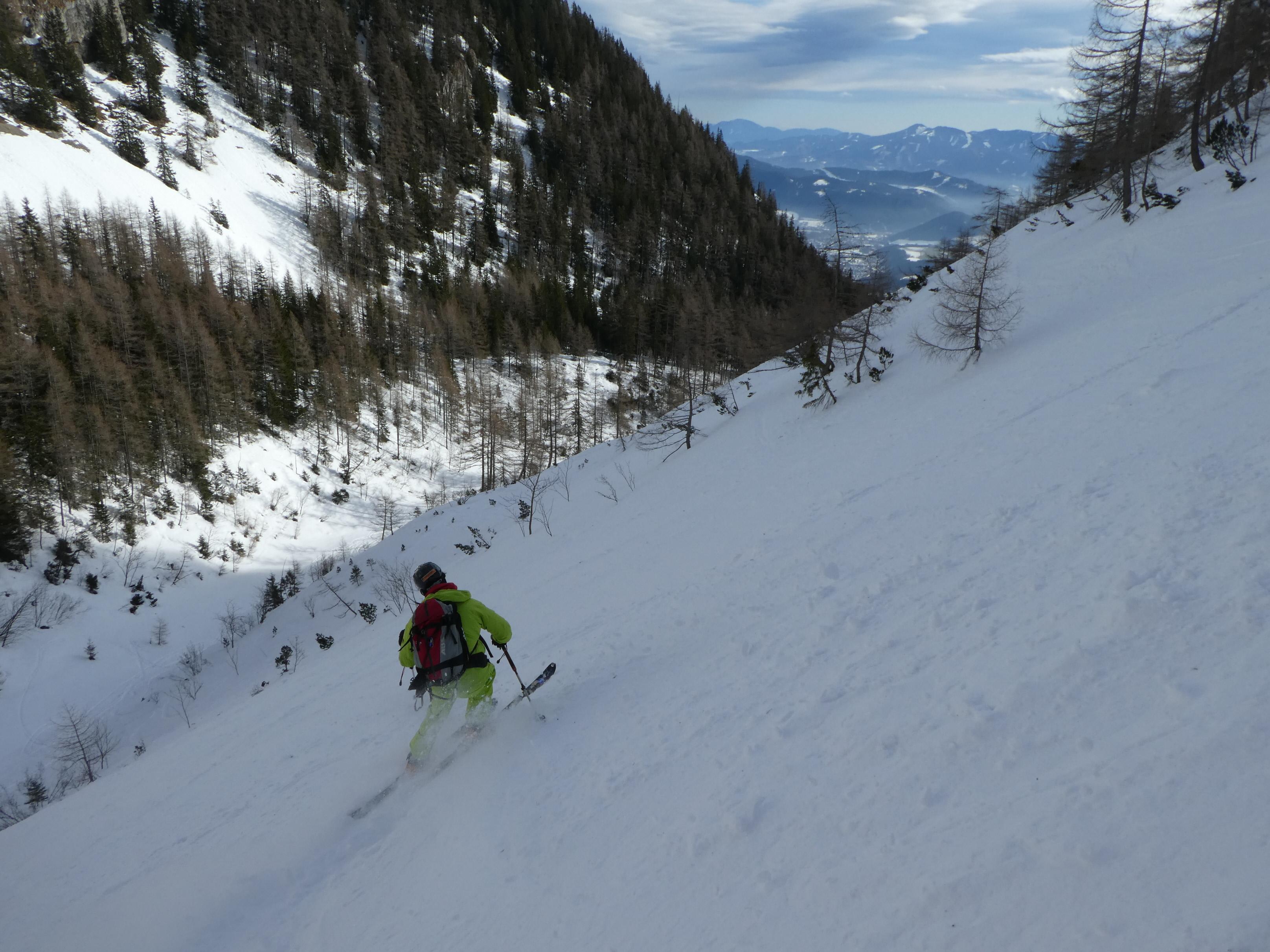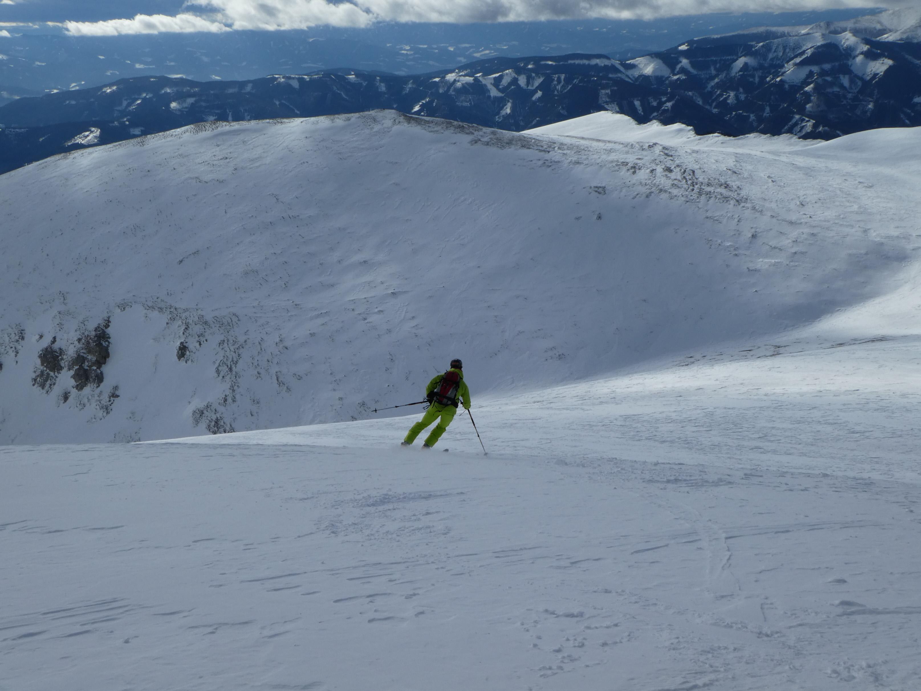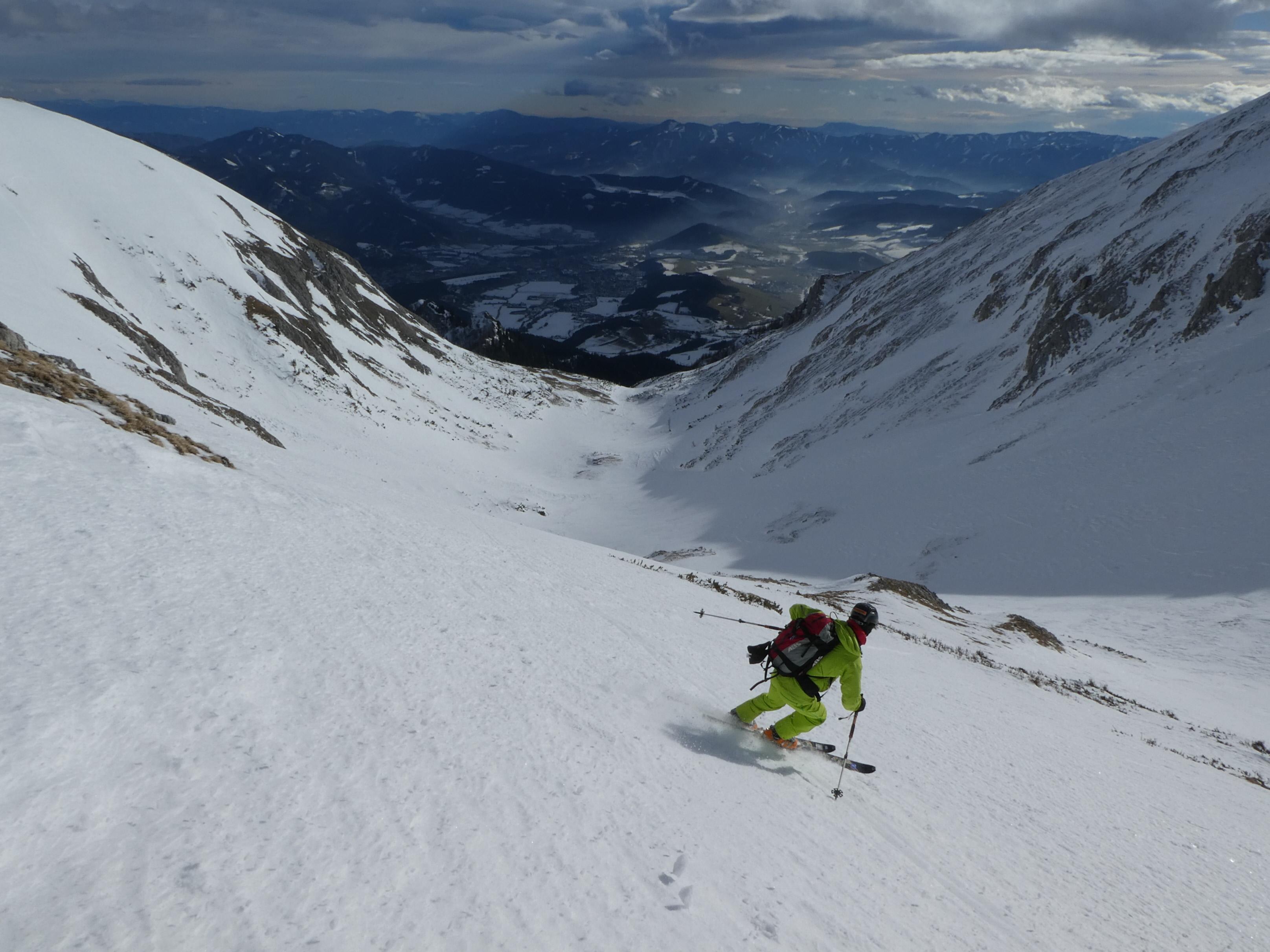 Wegen des sehr kurzen Schönwetterfensters am Vormittag vor dem Herannahen der Front hat es nicht aufegfirnt. Das hat die Tour über 1.350 Hm, gespickt mit 4 Steilstufen zu einem sehr alpinen Abenteuer gemacht. Vor allem die letzte Querung in der 4. Steilstufe war trotz Harscheisen auf der pickelharten Unterlage sehr fordernd und tw. grenzwertig