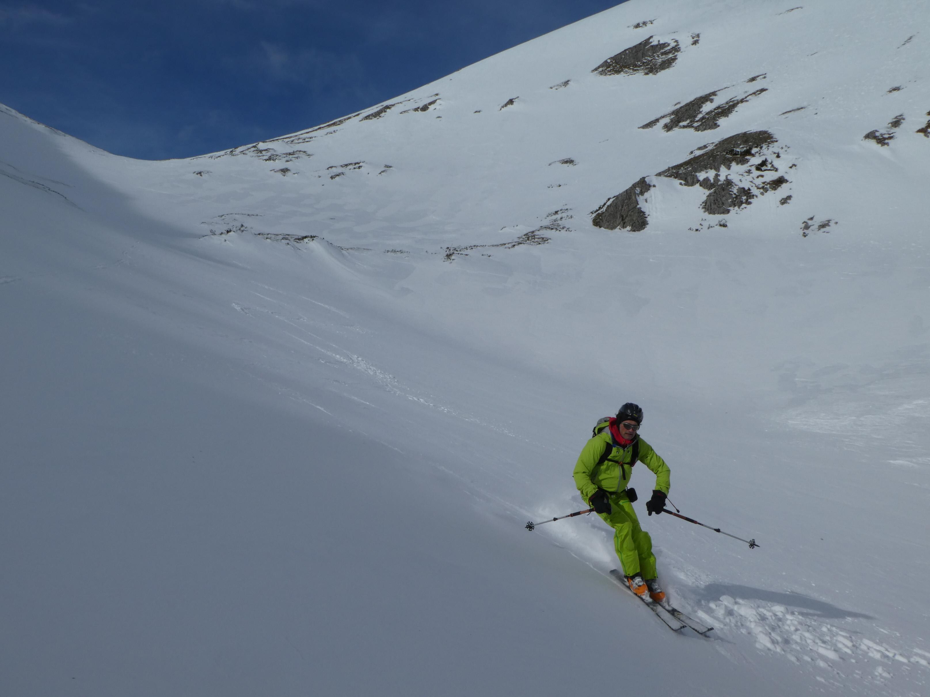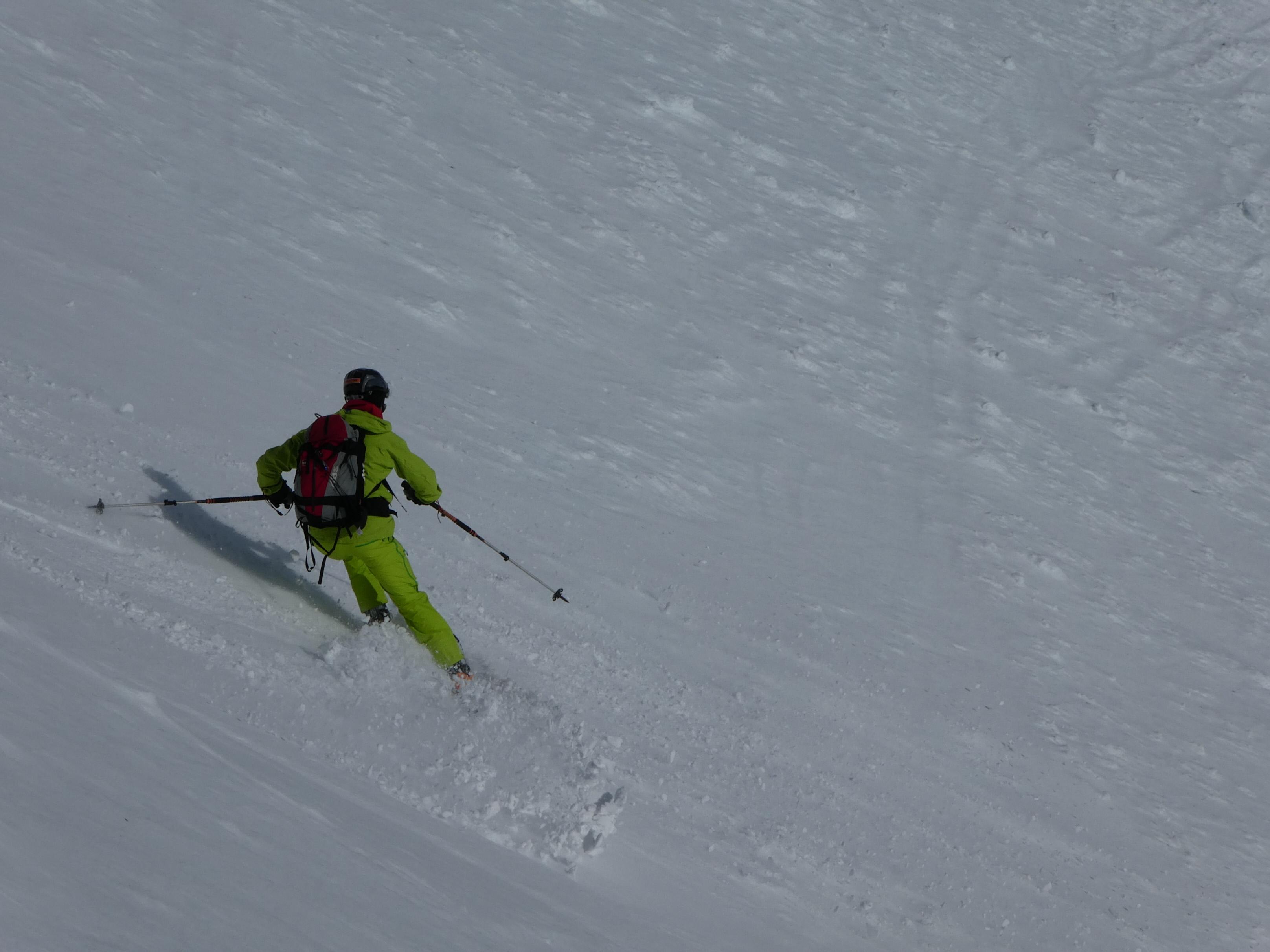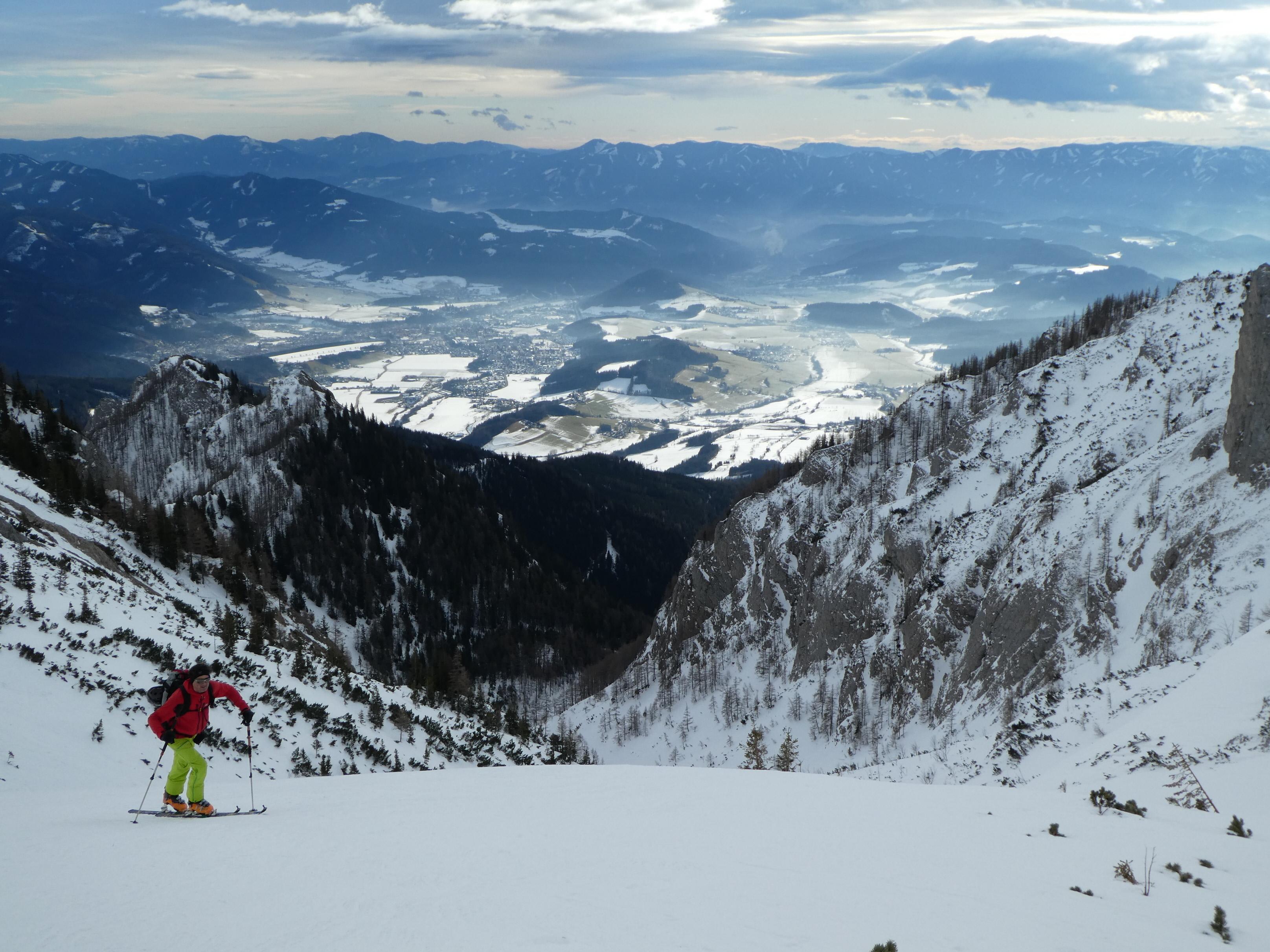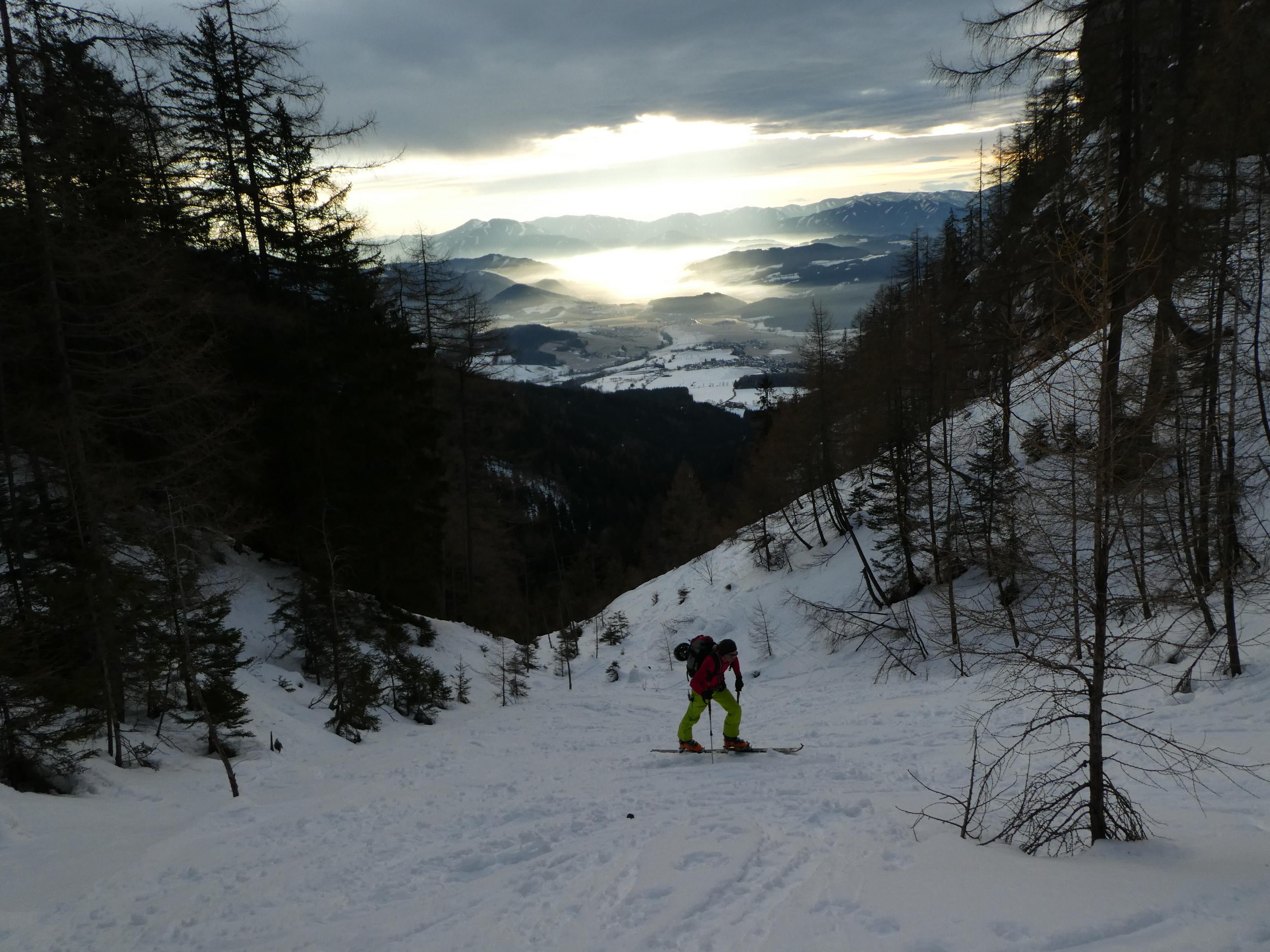Wegen des sehr kurzen Schönwetterfensters am Vormittag vor dem Herannahen der Front hat es nicht aufegfirnt. Das hat die Tour über 1.350 Hm, gespickt mit 4 Steilstufen zu einem sehr alpinen Abenteuer gemacht. Vor allem die letzte Querung in der 4. Steilstufe war trotz Harscheisen auf der pickelharten Unterlage sehr fordernd und tw. grenzwertig