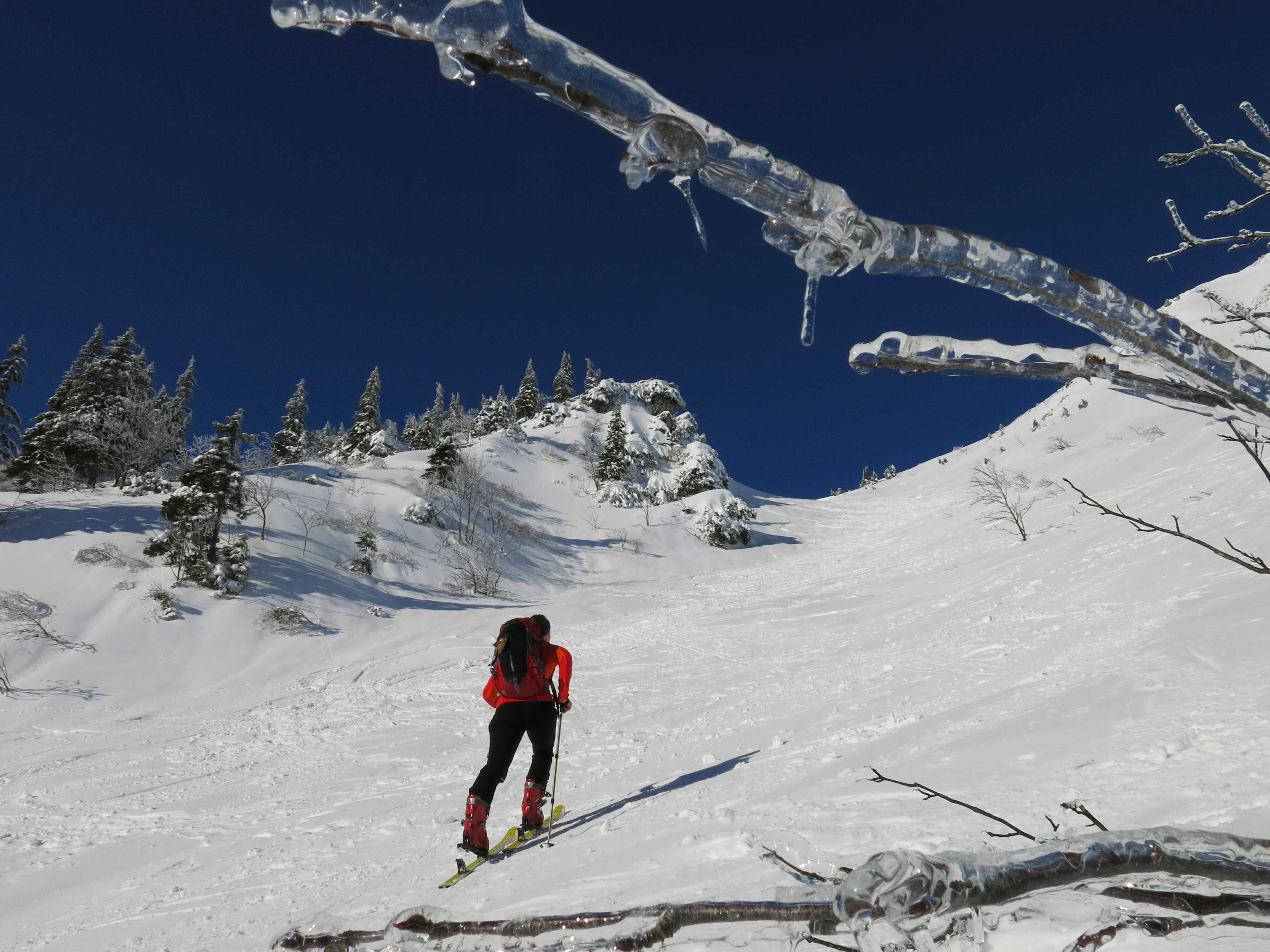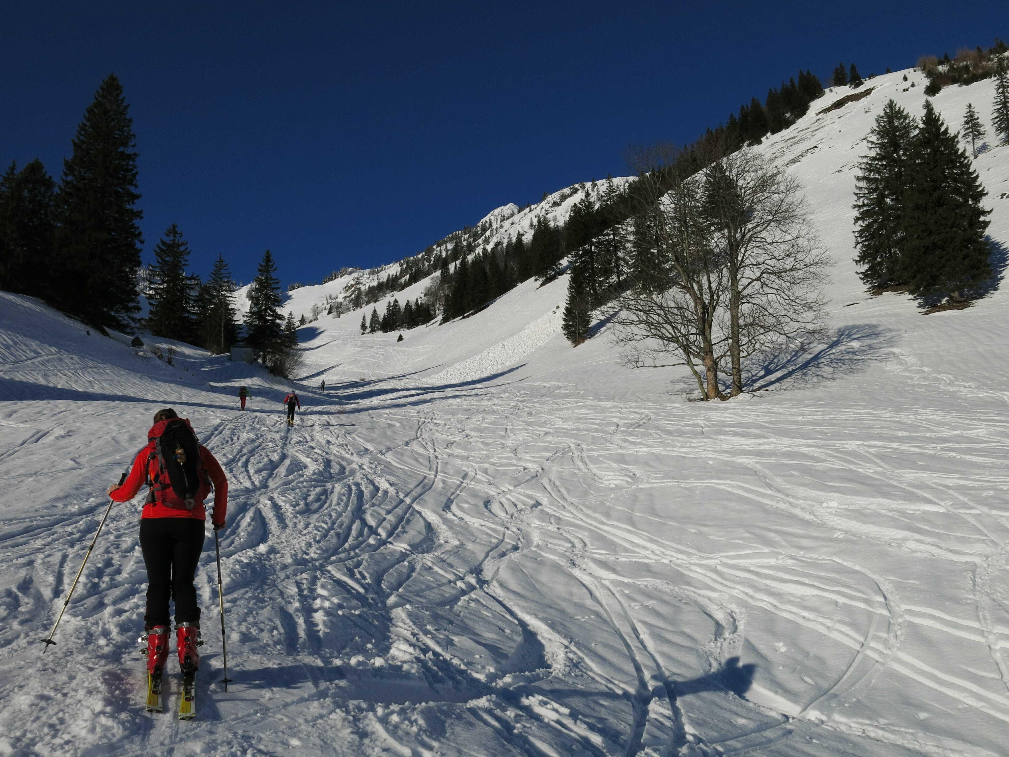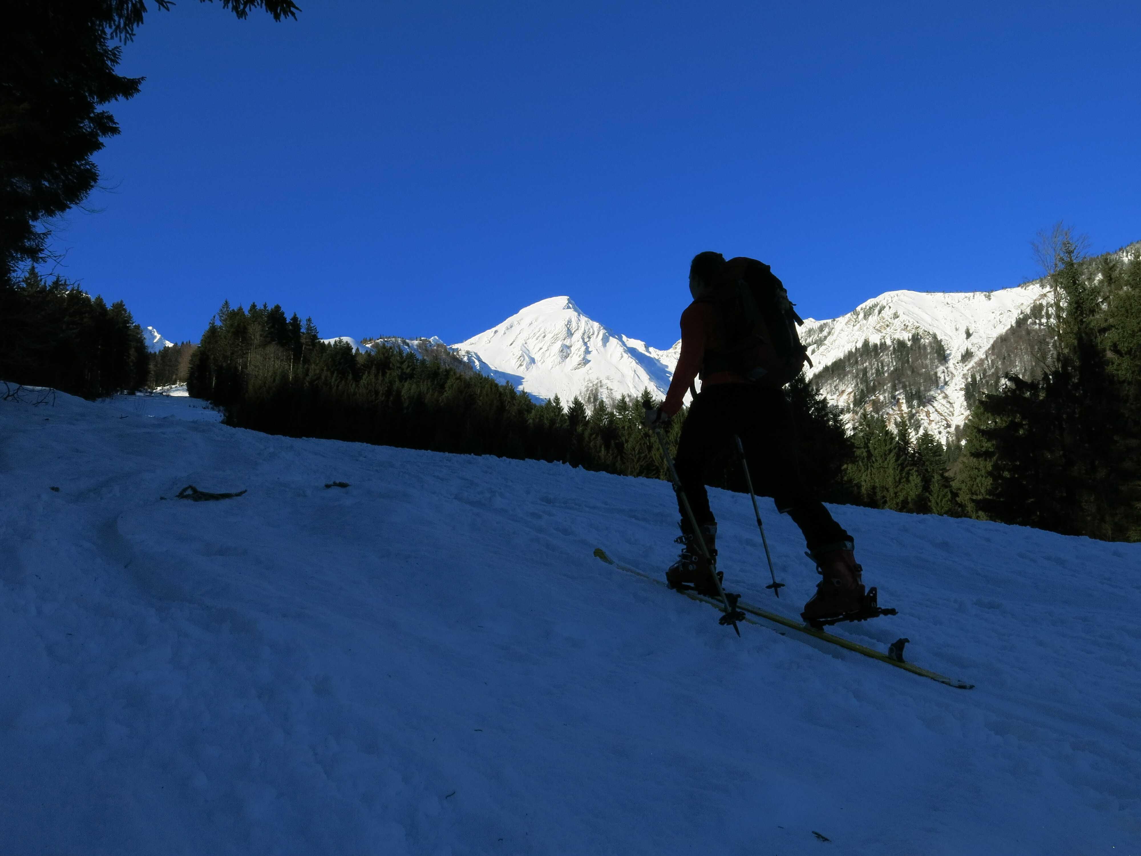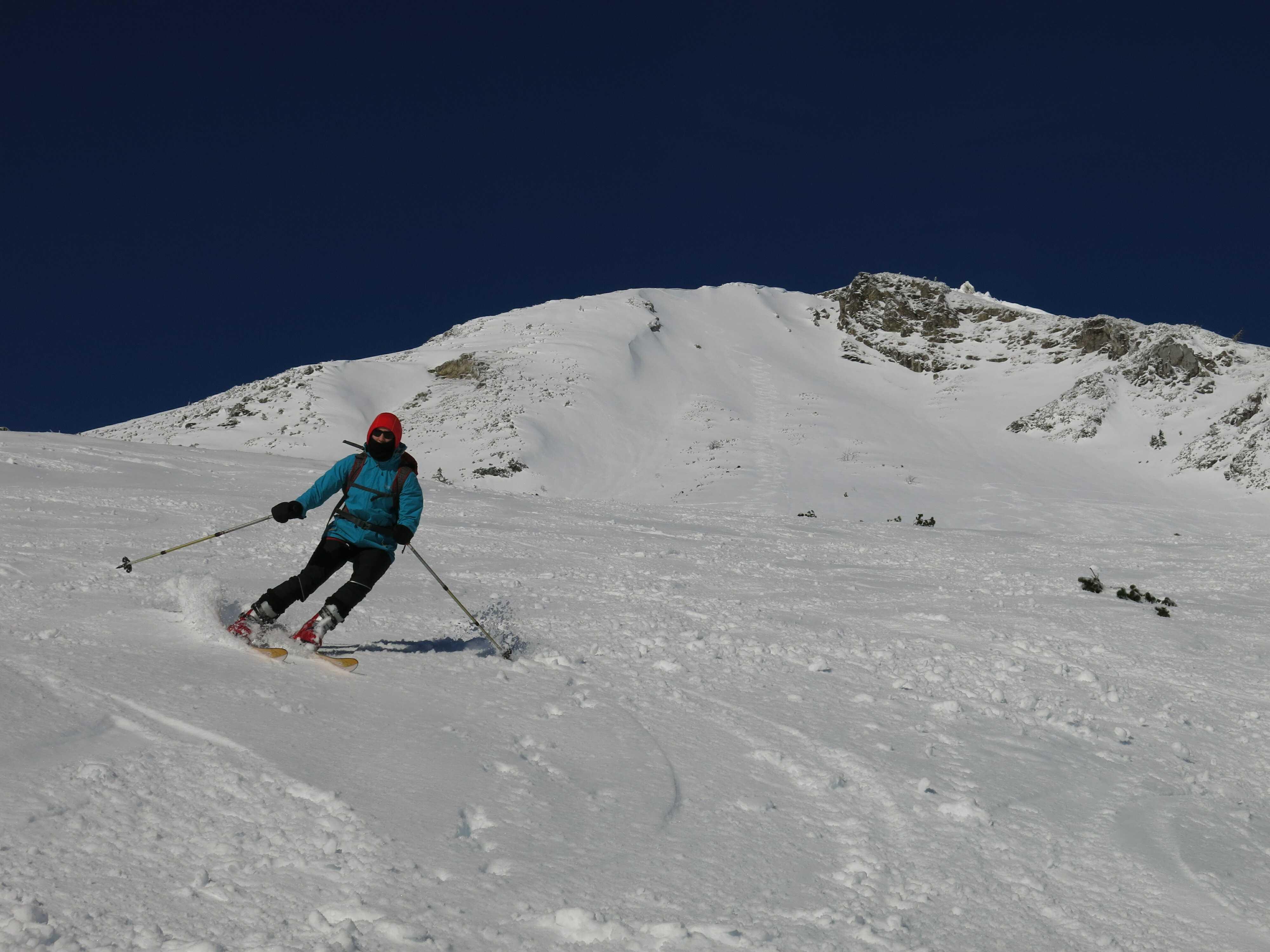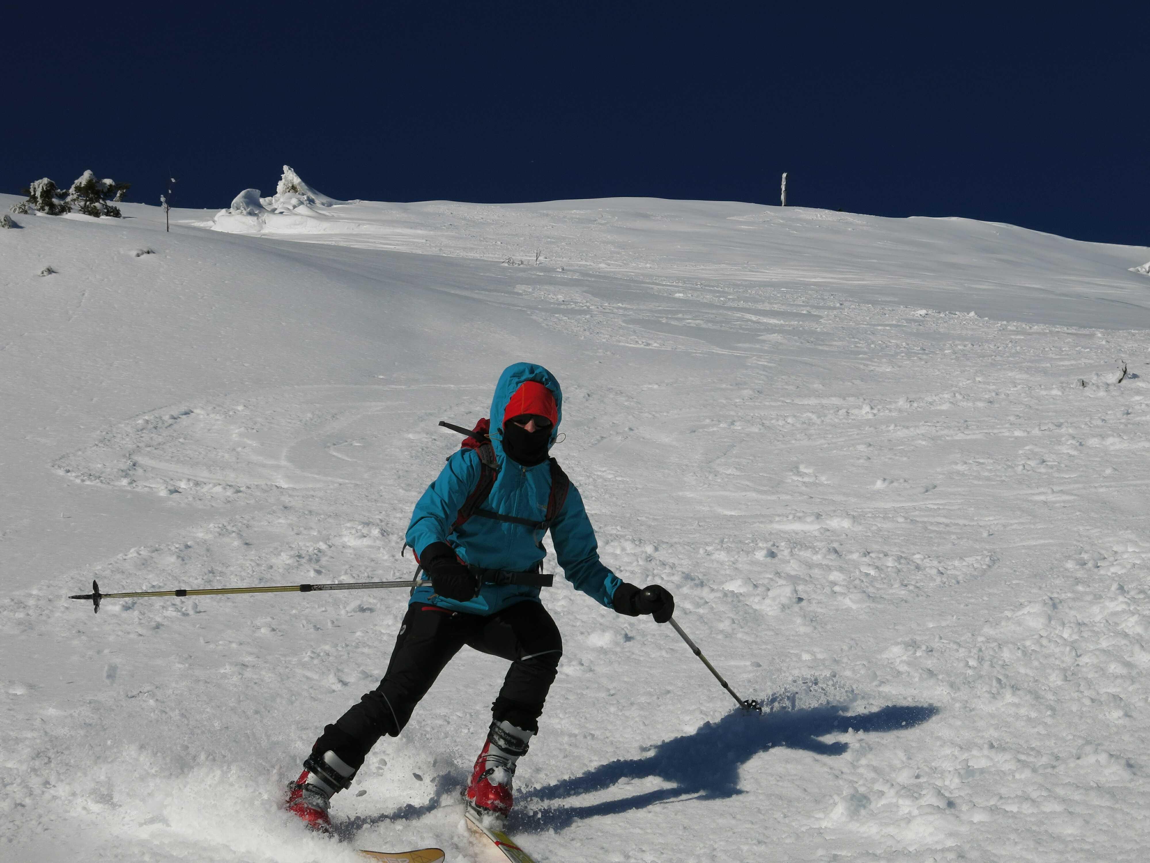 Schneelage: Vom PP noch genug Schnee, nur der unterste Hang hat einzelne Steine. Im Schatten meist tragender Harsch mit z.T. eingefrorenen alten Spuren. Alte Pistenabfahrt aber gut eingefahren. In der direkten Sonne wurde es bei der Abfahrt bereits etwas firnig. Gipfelanstiegshang komplett mit Regeneisschicht überzogen. Platt ganz oben noch etwas hart, dann aber gut fahrbar. Abfahrt im Schatten auf tragendem Harsch war noch ganz o.k. (immer noch besser als Bruchharsch).