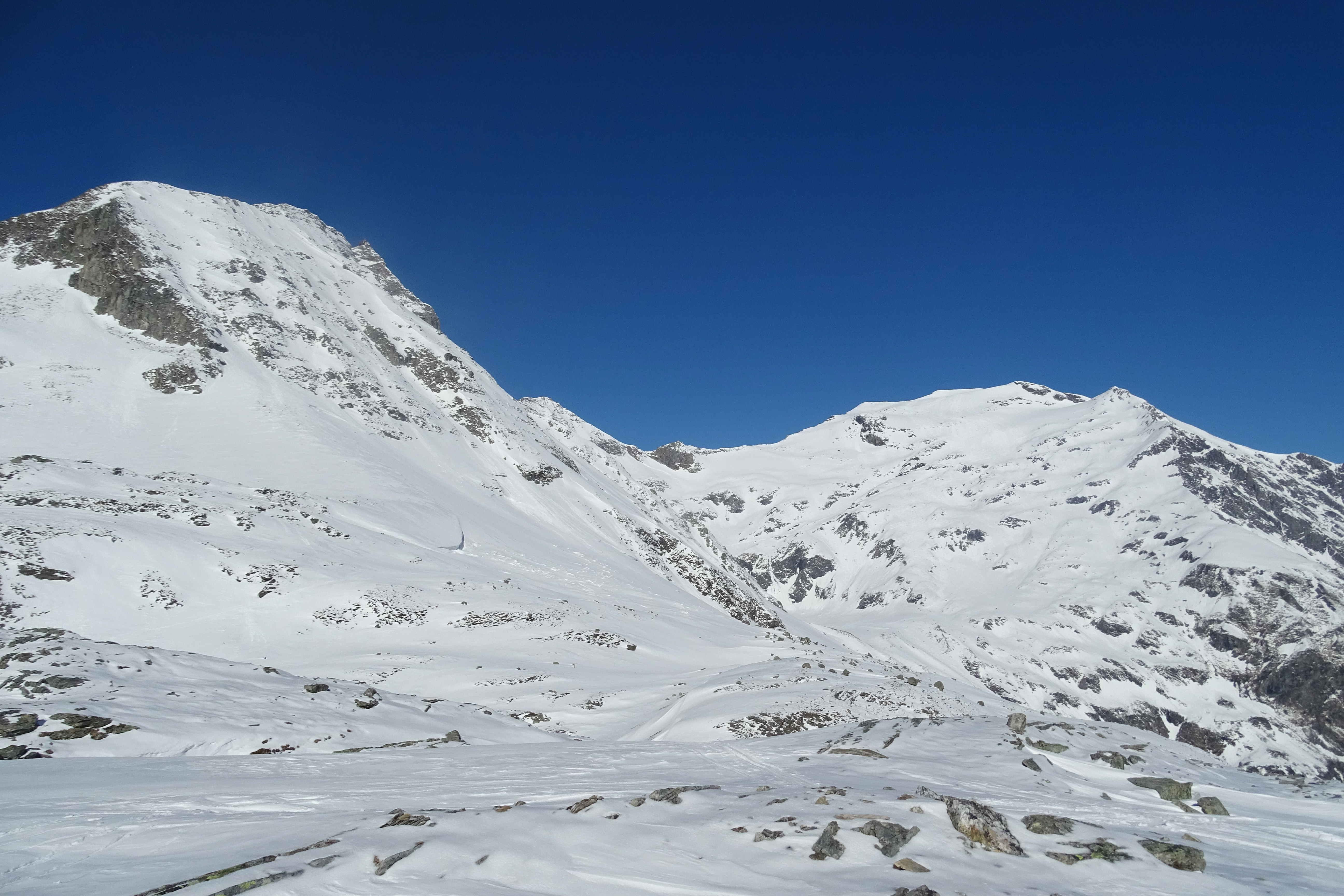 Harschiger Beginn, ein paar Meter müssen die Ski getragen werden. Trotz der vielen Spuren vom Vortag gute Aufstiegsspur. Nach der Querung nach dem Neubau dann Firn im Aufstieg, Wärme, kein Wind (ein kühlendes Lüftchen wäre ganz angenehm gewesen).
