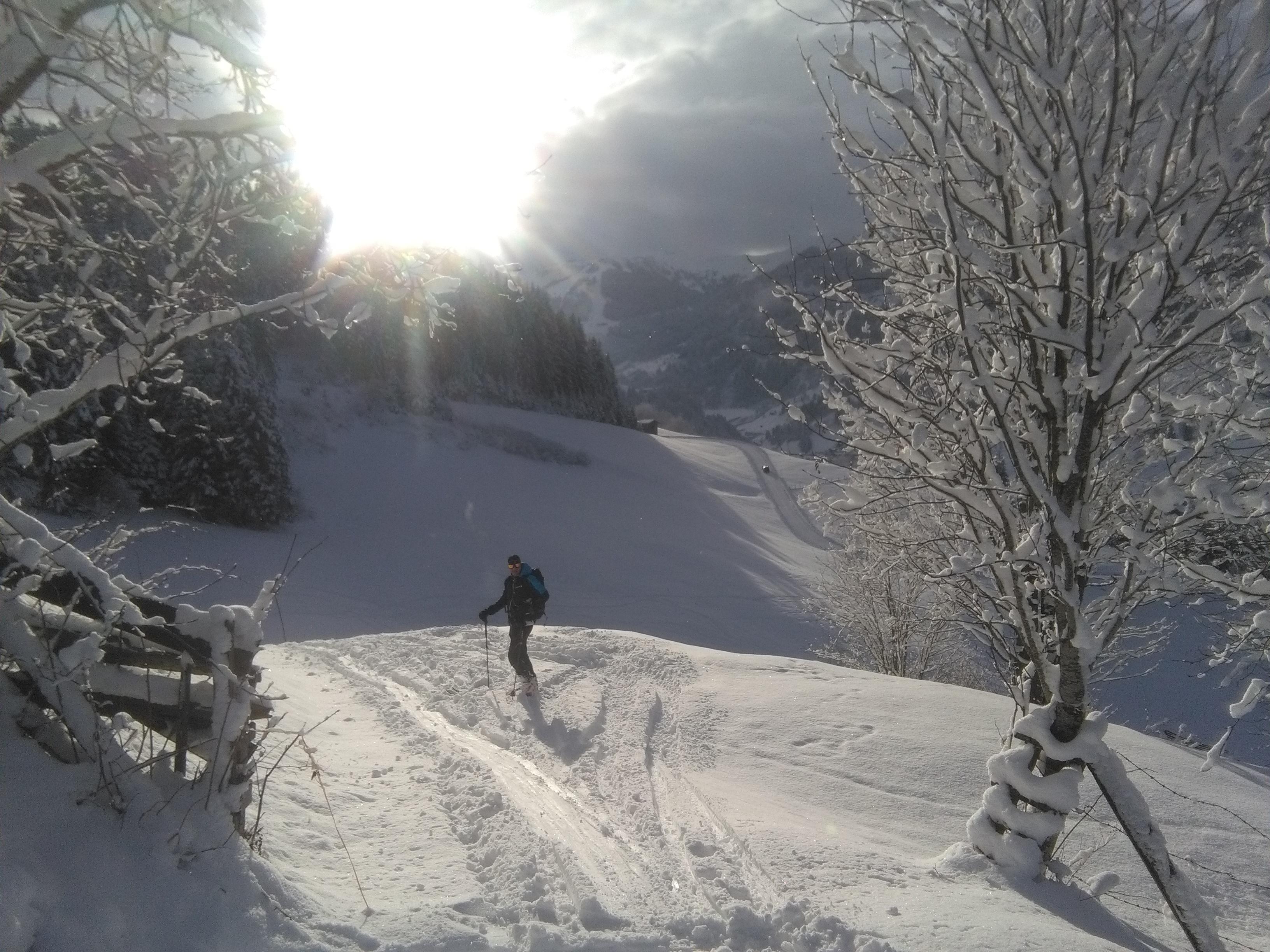 schlechtwettertour am eingang zum großarltal. pp gegnüber bushaltestelle au. über die bauernwiesen ri breitebenalm, dann aber rechts halten in den steilen wald , viele hindernisse durch windbruch, neue z.t. steile windwurfschneisen, fast bis zum wintergipfel. 1150 hm