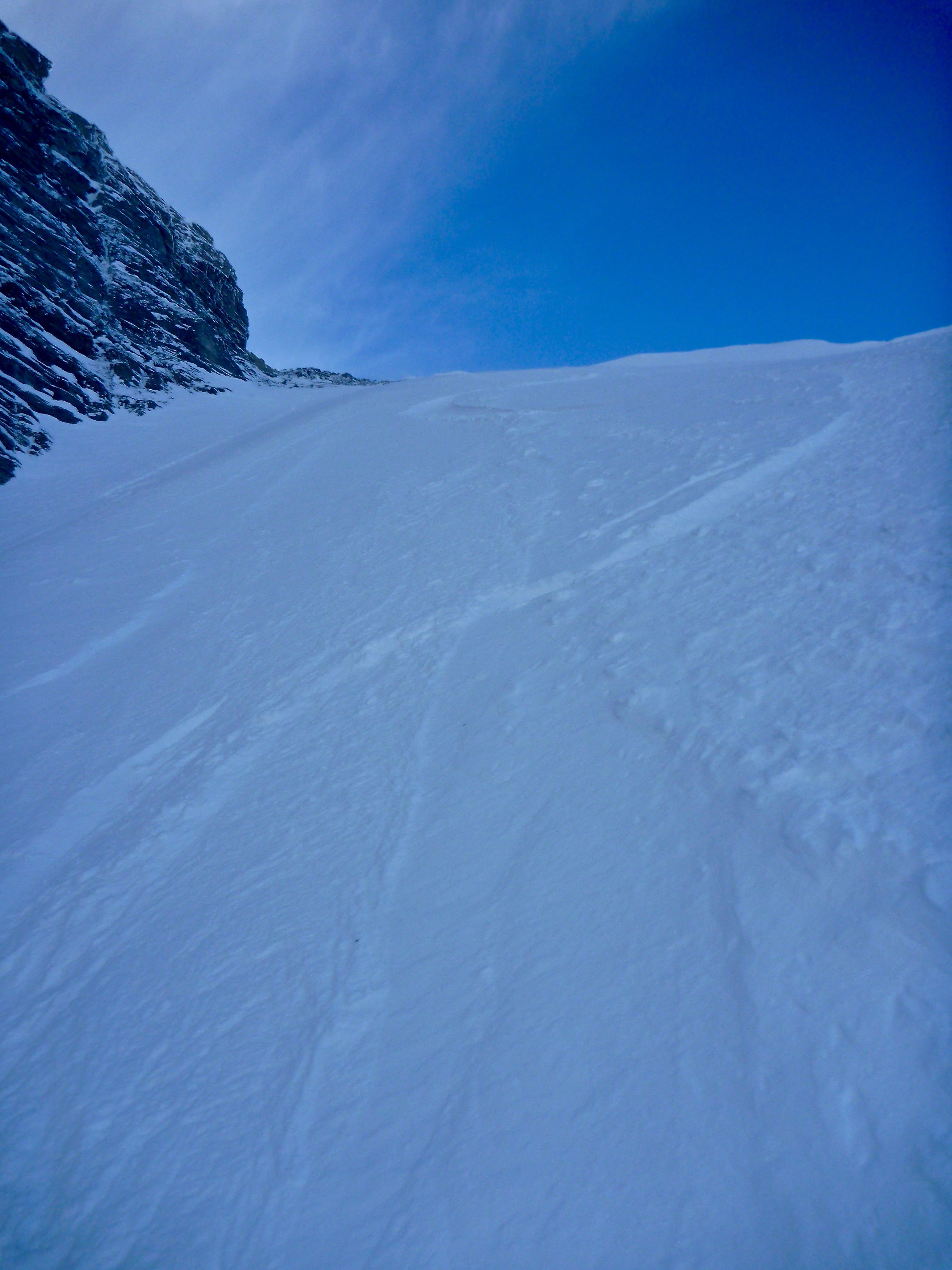 Lawinen: Im Steilbereich kam oberflächlich vom Wind ausgelöst was Lockeres Oberflächliches daher und knapp 100hm unterm Gipfel hat sich 20m ober mir ein Schneebrett gelöst, war aber überschaubar da locker und Anrisshöhe nur 5cm, der Rest darunter war stabil. Ziemlich mächtige Gleitschneerisse bz. -löcher warten auch auf Erwärmung.