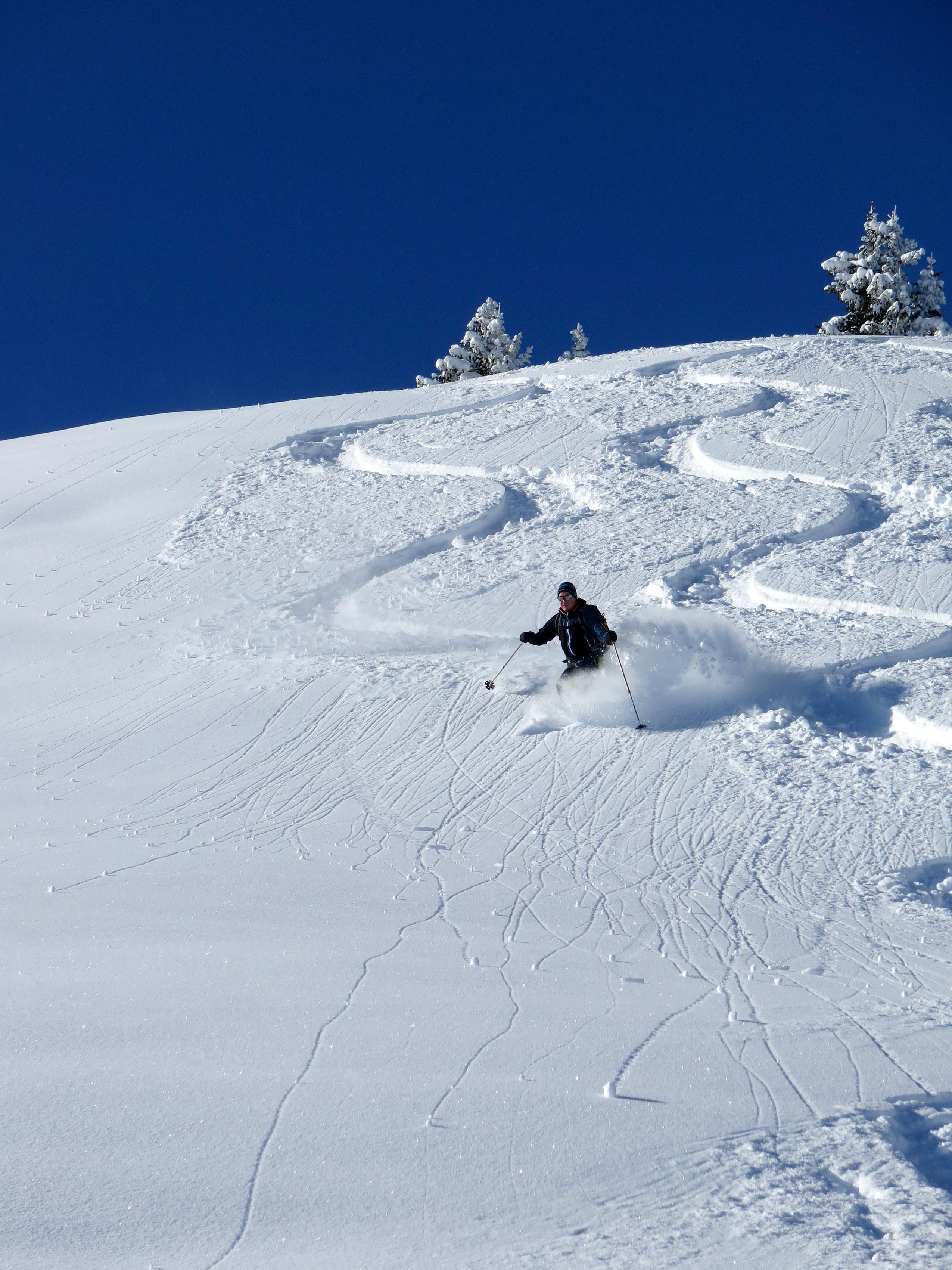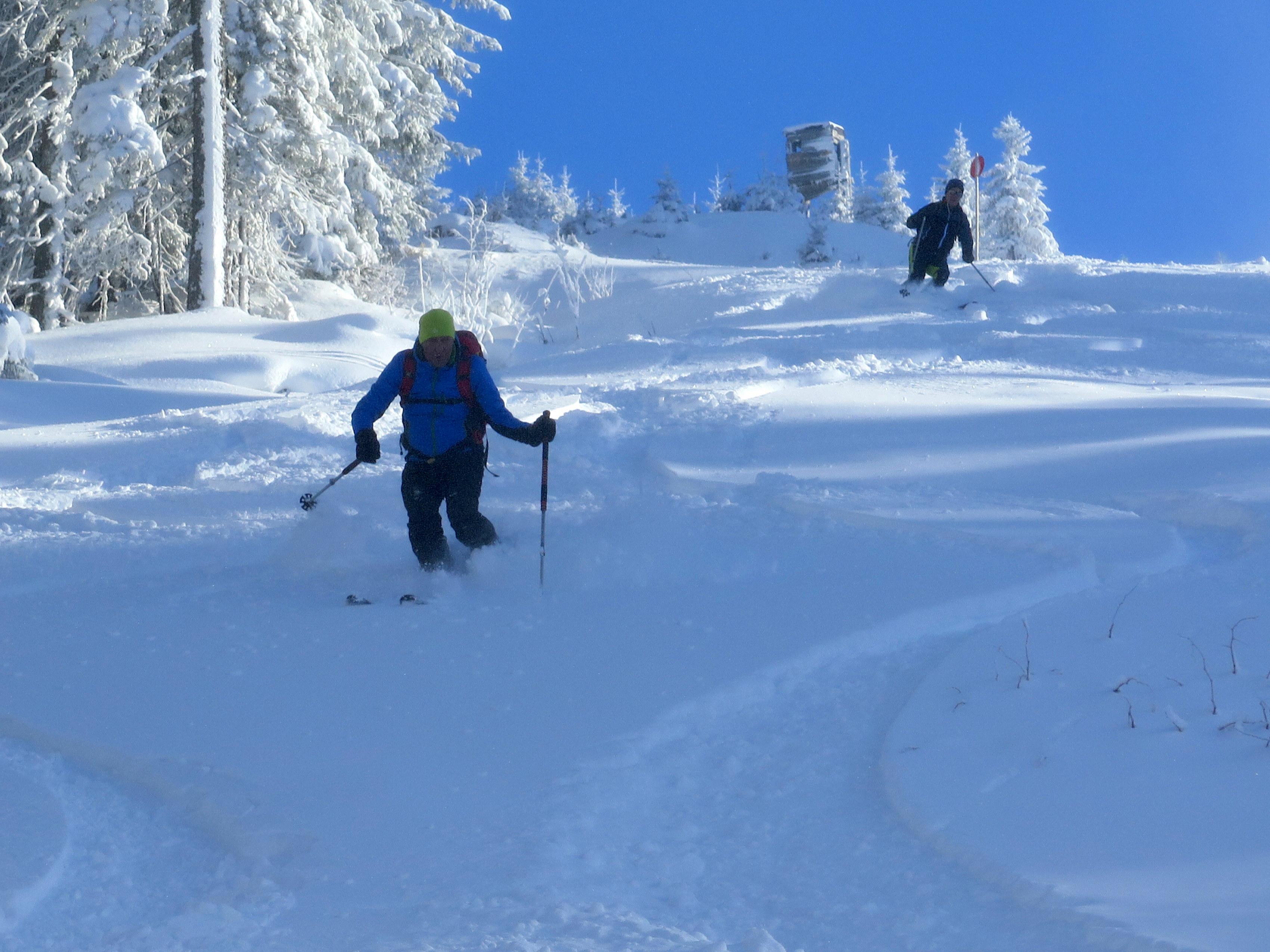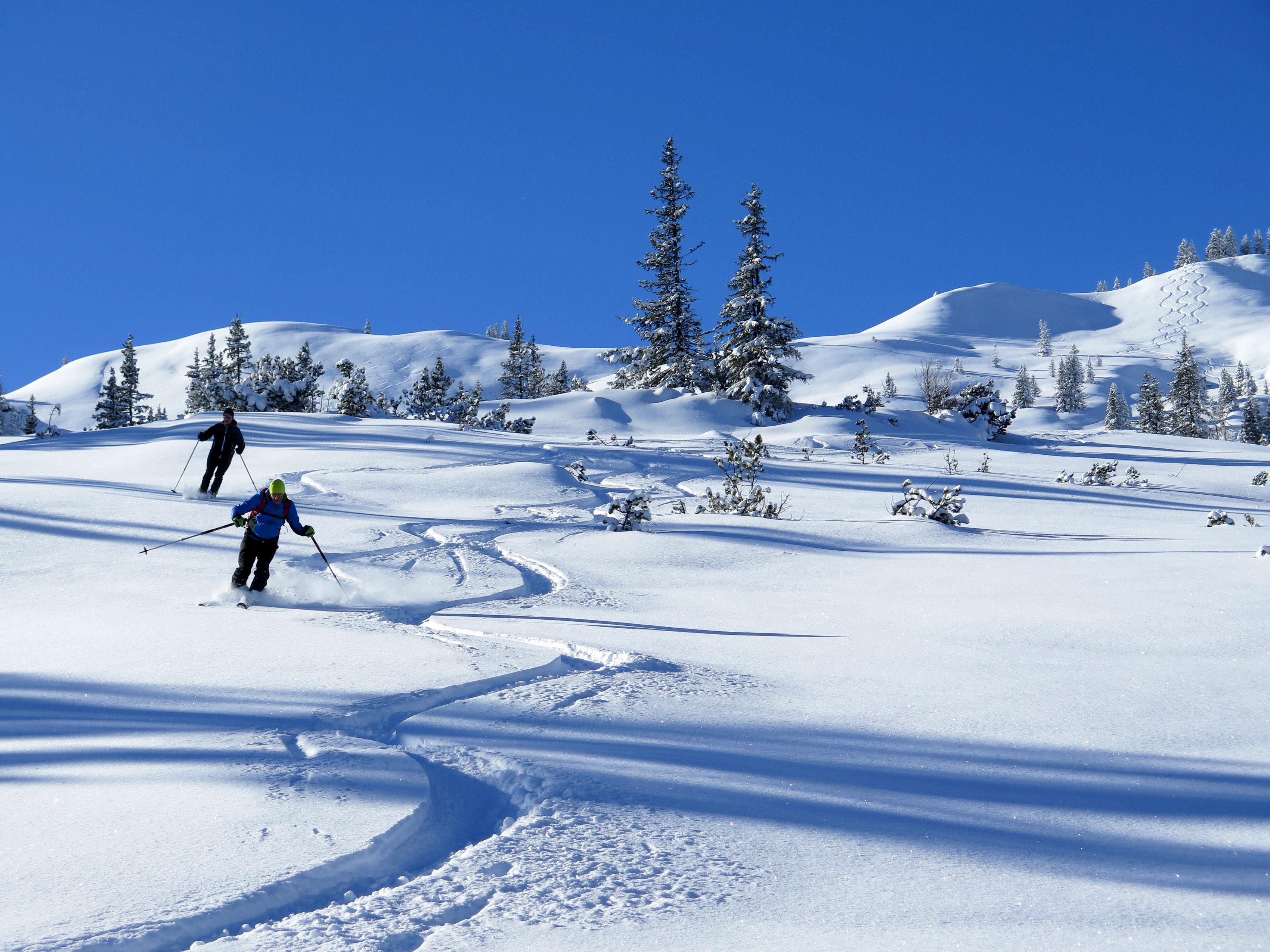 Anstieg vom Dientner Sattel über den bereits gut eingeschneiten Auwald auf direkter Linie zur Höhe mit der Bergstation der Dacheggbahn, wodurch die Querung der Pisten im Bereich der Tiergartenalm vermieden wird. Abfahrt vom Kollmannsegg zur Klingelbergalm im allerfeinsten Pulver, auch das kurze Grabenstück zuletzt bereits mit guter Grundlage. Nach sonniger Rast Wiederanstieg zur Höhe der Bergstation der Kings Cab auf einer schön angelegten Spur. (Danke dem Unbekannten mit dem angenehmen "L-Sensor" im Sprunggelenk!) Die abschließende Abfahrt hinunter Richtung Dachegg nochmals schöner Pulver auf guter Unterlage am Rand bzw. im Nahbereich der beinahe fertig präparierten, aber noch gesperrten Piste unter der Dacheggbahn.
