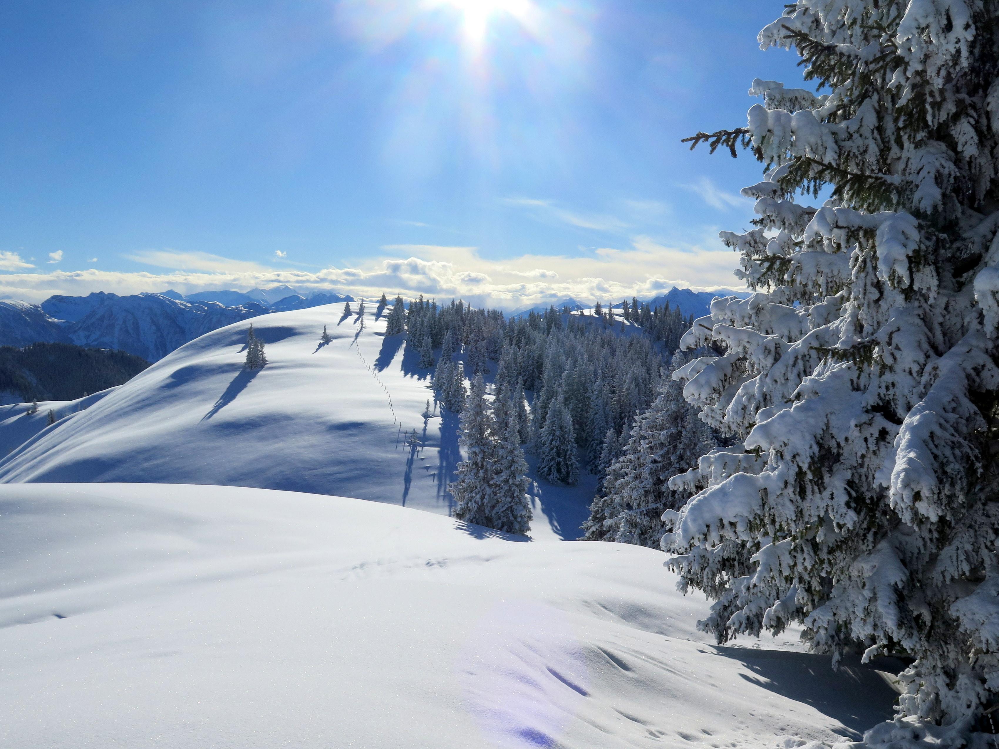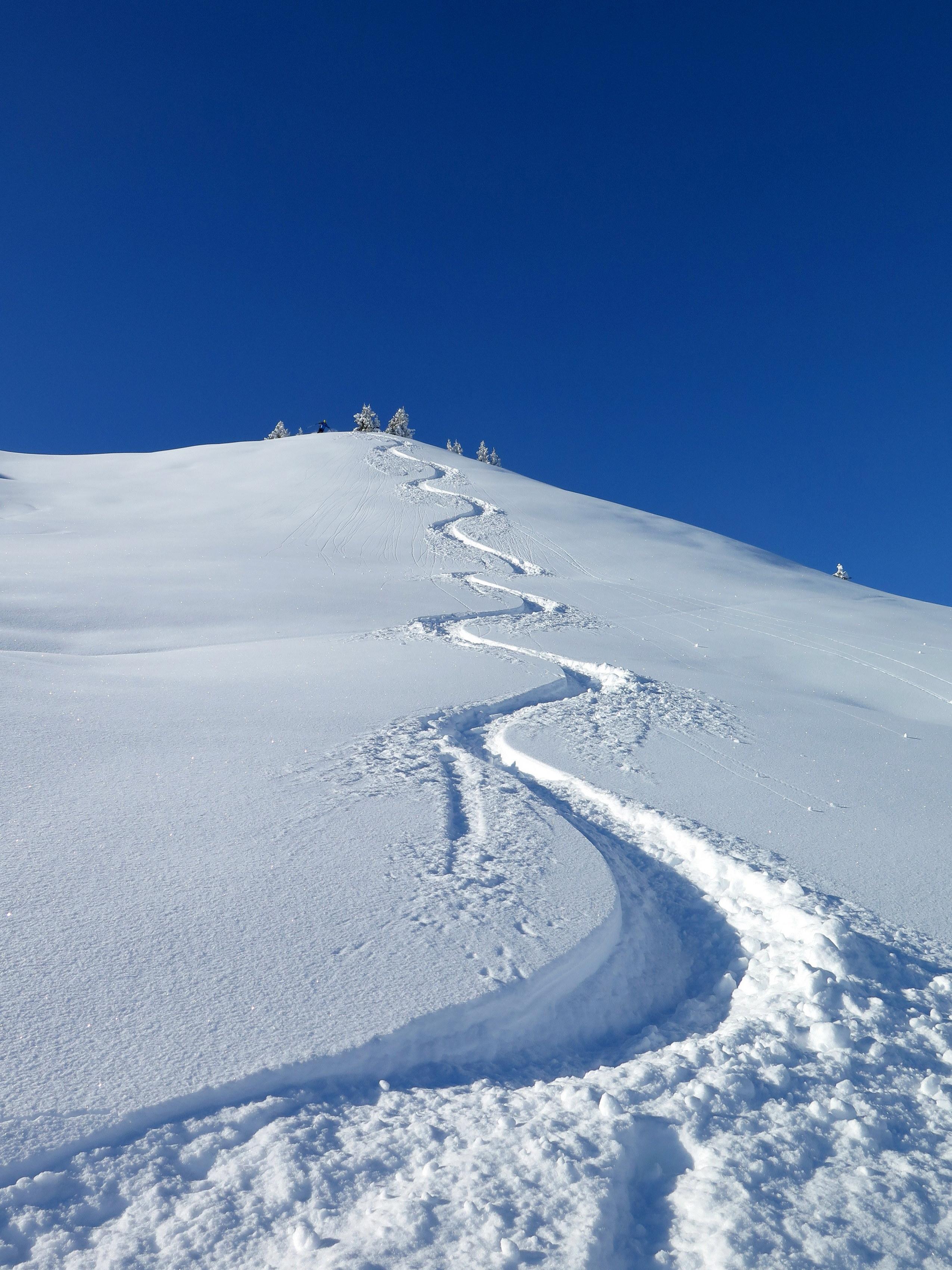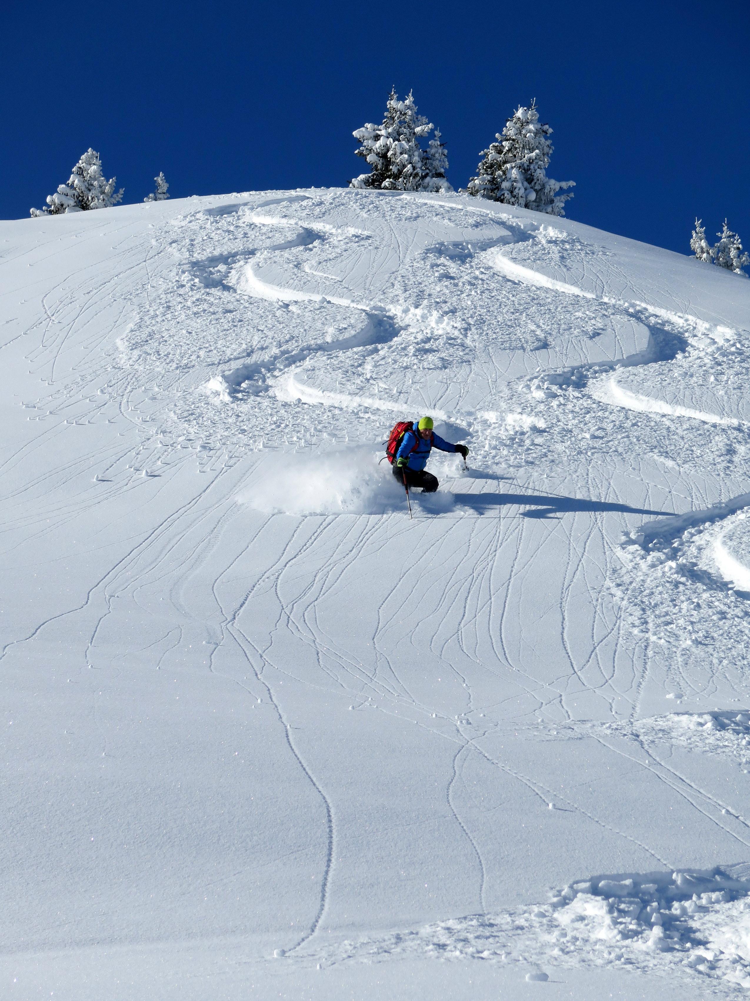 Anstieg vom Dientner Sattel über den bereits gut eingeschneiten Auwald auf direkter Linie zur Höhe mit der Bergstation der Dacheggbahn, wodurch die Querung der Pisten im Bereich der Tiergartenalm vermieden wird. Abfahrt vom Kollmannsegg zur Klingelbergalm im allerfeinsten Pulver, auch das kurze Grabenstück zuletzt bereits mit guter Grundlage. Nach sonniger Rast Wiederanstieg zur Höhe der Bergstation der Kings Cab auf einer schön angelegten Spur. (Danke dem Unbekannten mit dem angenehmen "L-Sensor" im Sprunggelenk!) Die abschließende Abfahrt hinunter Richtung Dachegg nochmals schöner Pulver auf guter Unterlage am Rand bzw. im Nahbereich der beinahe fertig präparierten, aber noch gesperrten Piste unter der Dacheggbahn.