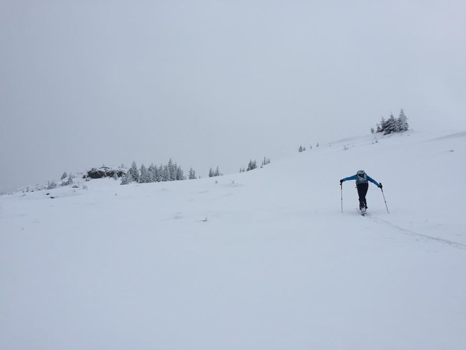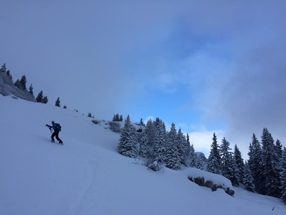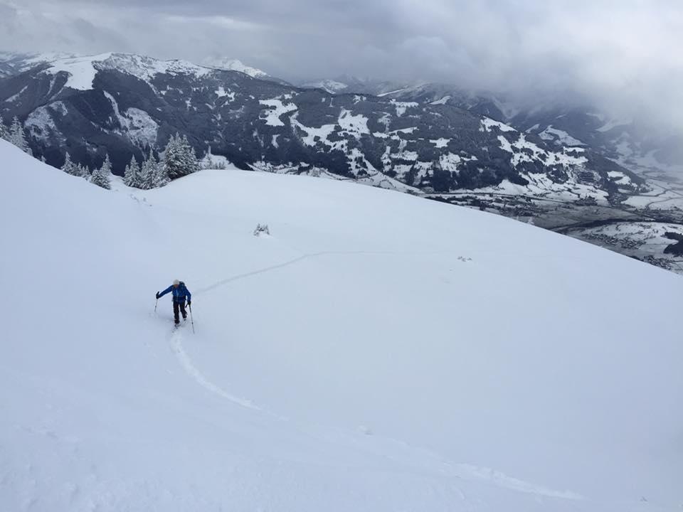Verhältnisse: Weniger Schnee im Gebiet als erwartet. 20-35 cm Neuschnee. Die ersten 250-300 hm ohne Unterlage. Über der Waldgrenze Windeinfluss. Pulver der nach unten ein bisschen schwerer wird.