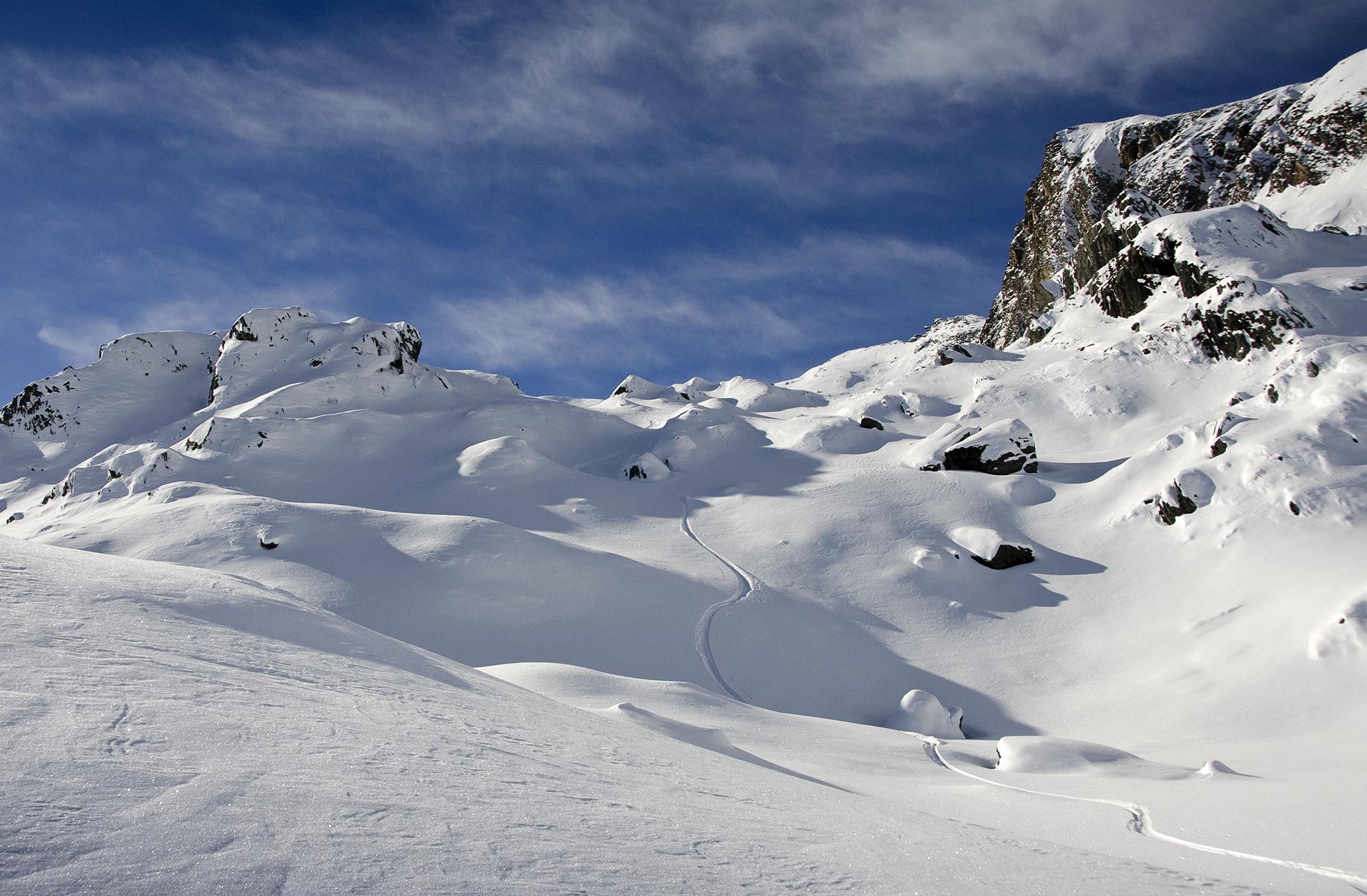 Im Gelände abseits der Pisten ist der Schnee zum Teil windgepresst, in Rinnen und an windgeschützten Hängen zwischen 2200 und 2600m Höhe gibt es Pulverschnee. Die Stoa-Ski sind jedoch angebracht, und unterhalb 2000 m Höhe (zwischen Kristallbahn und Langwiedboden) sollte man nicht ins Gelände gehen, da fehlt einfach noch Schnee.
