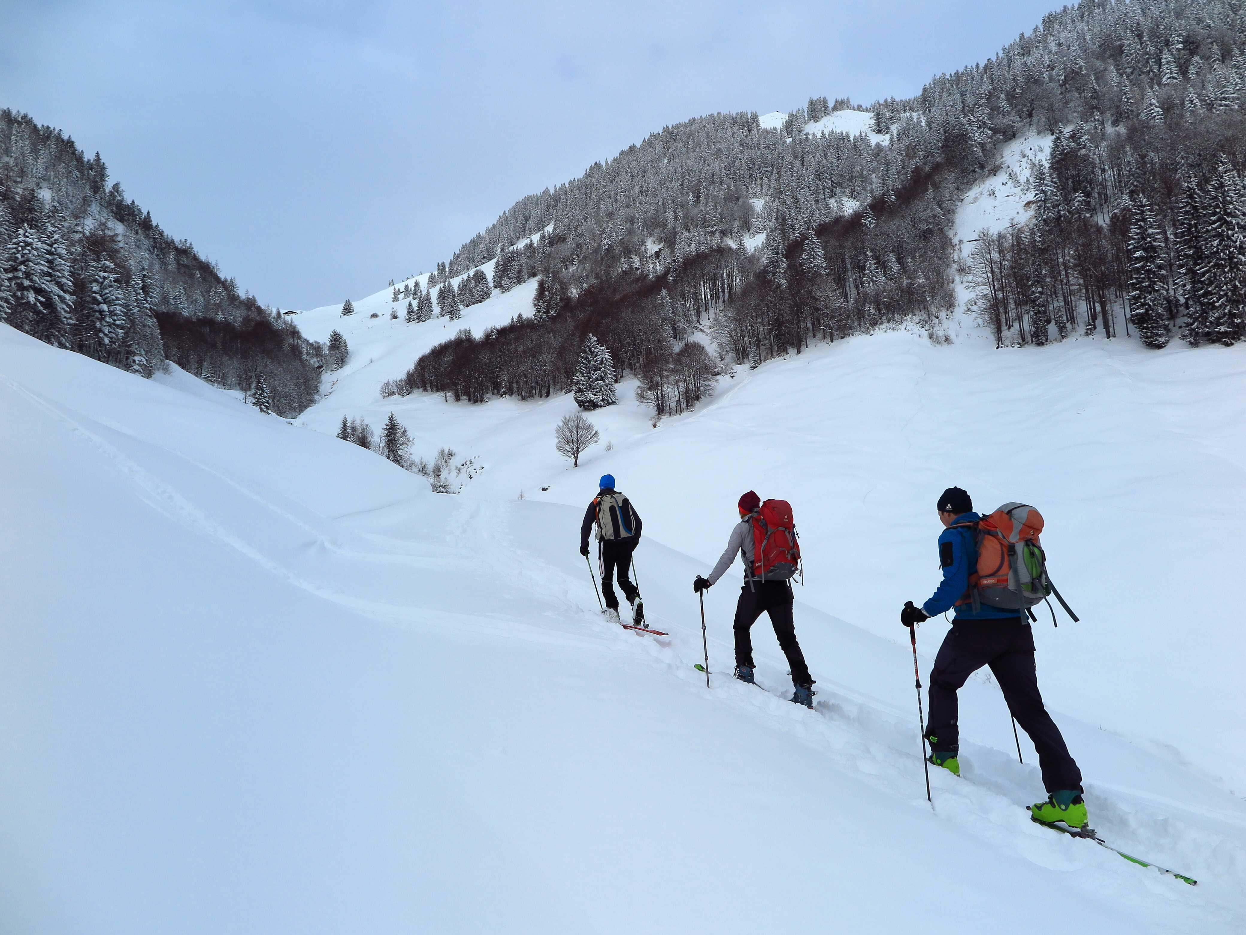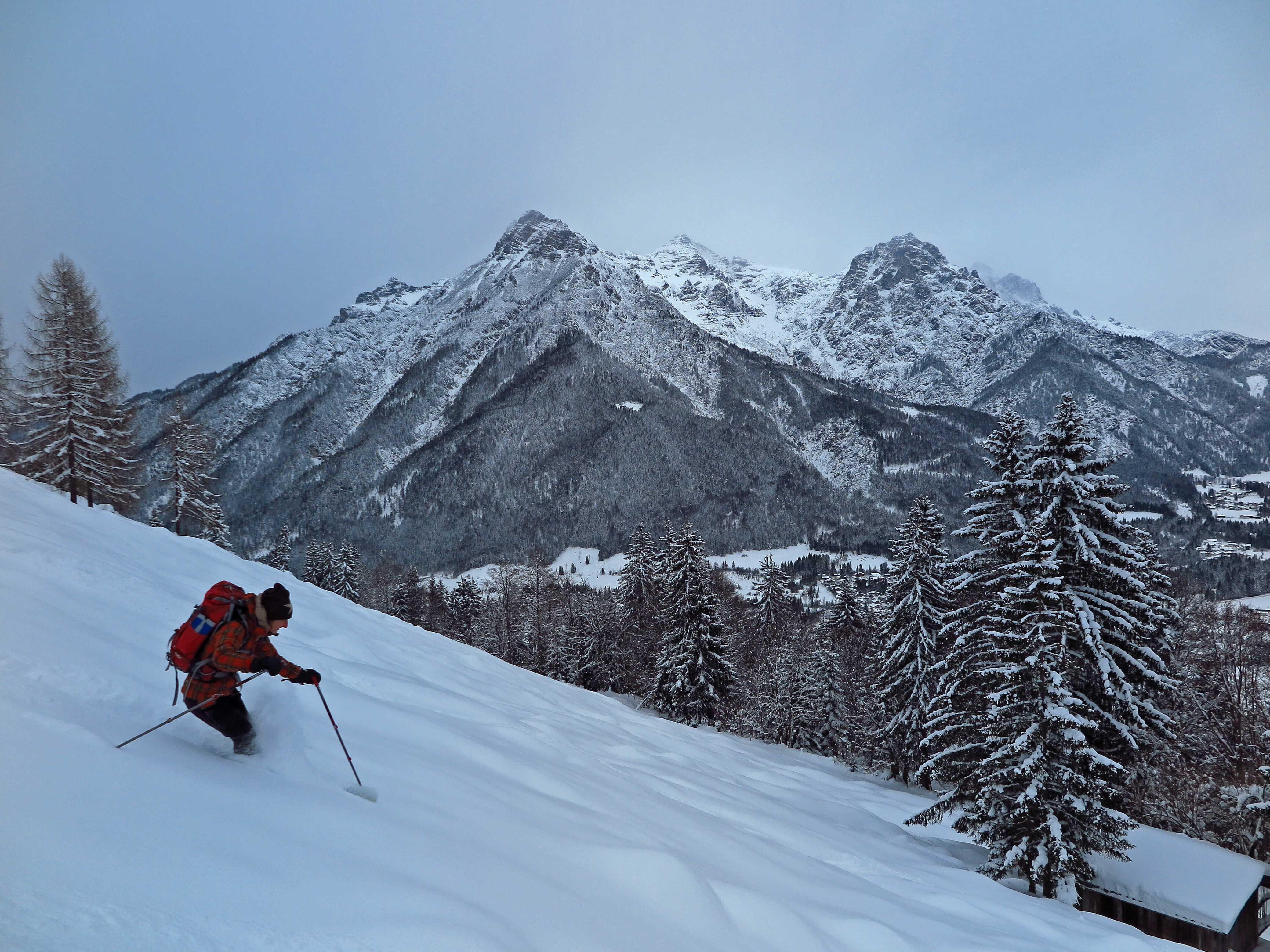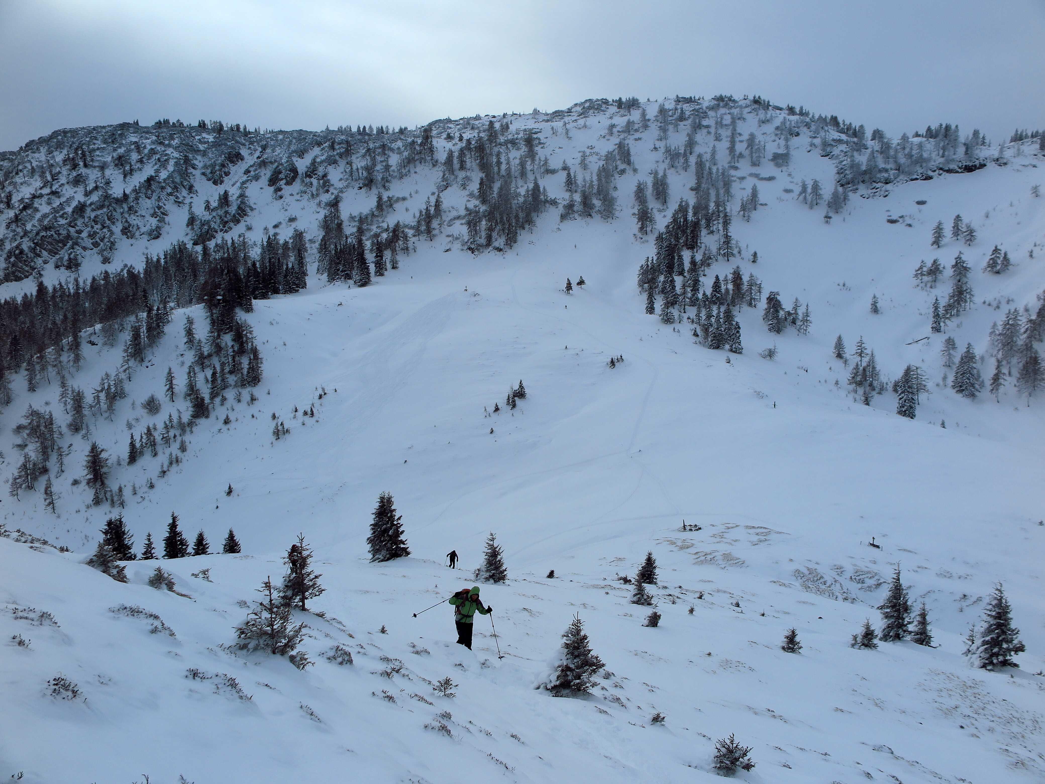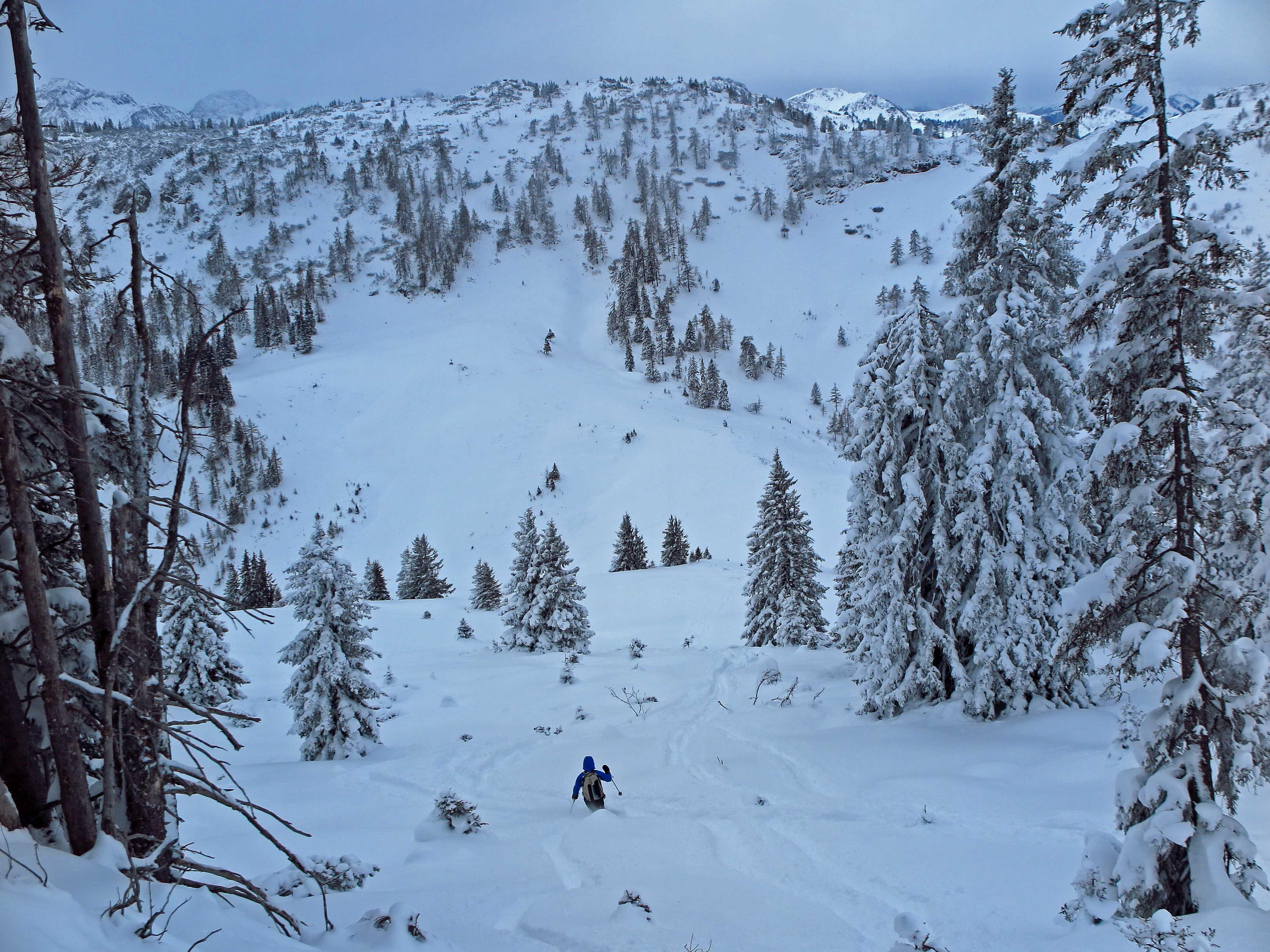 Schneelage: Bei -18°C und tiefwinterlichen Verhältnissen gestartet. Am PP ca. 40cm. oben je nach Windeinfluss 10 - ca. 50cm Pulver, meist ohne Unterlage. Bei umsichtiger Fahrweise nur wenig Steinkontakte. Insgesamt recht brauchbare Bedingungen vom Gipfel bis ins Tal.
