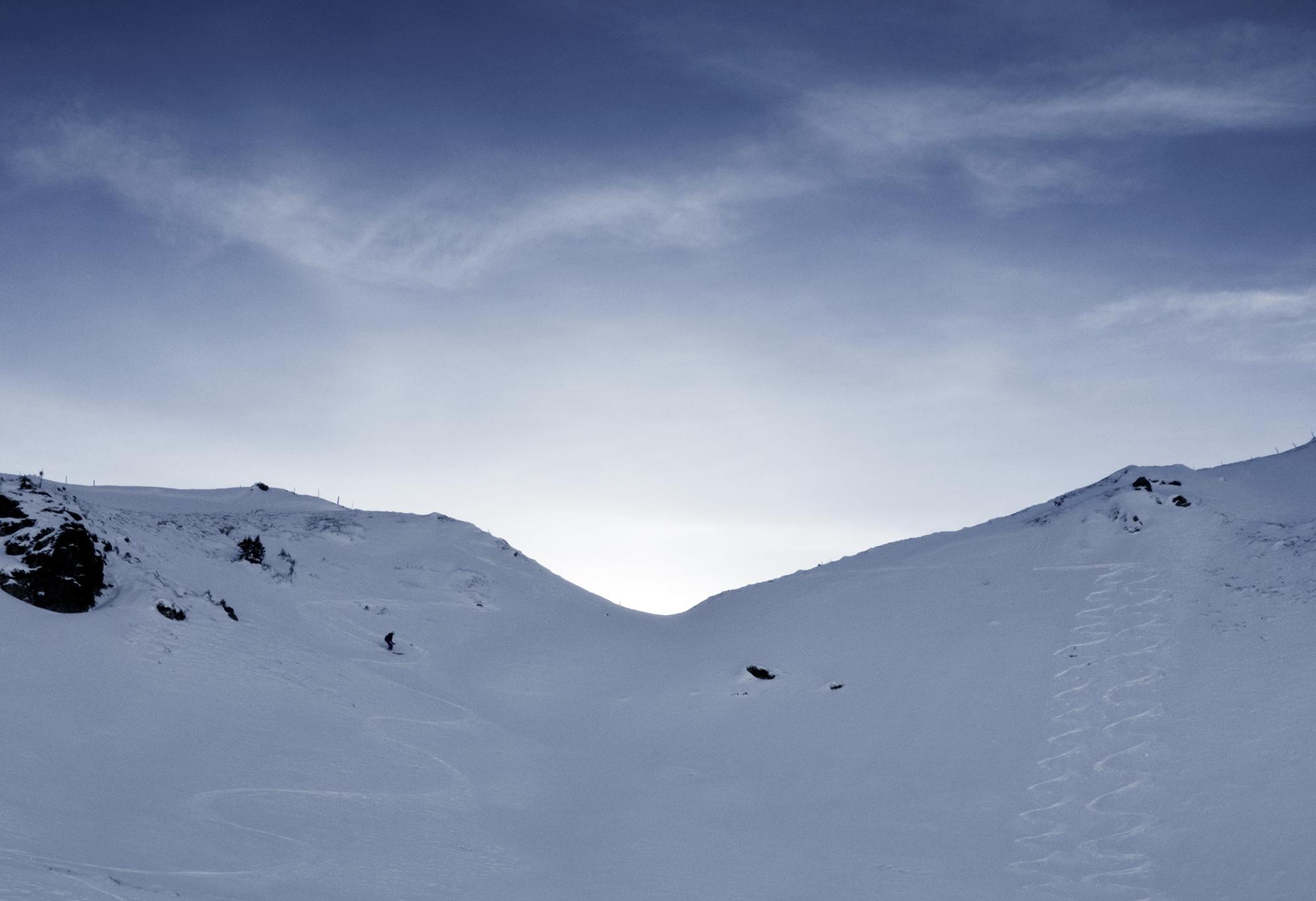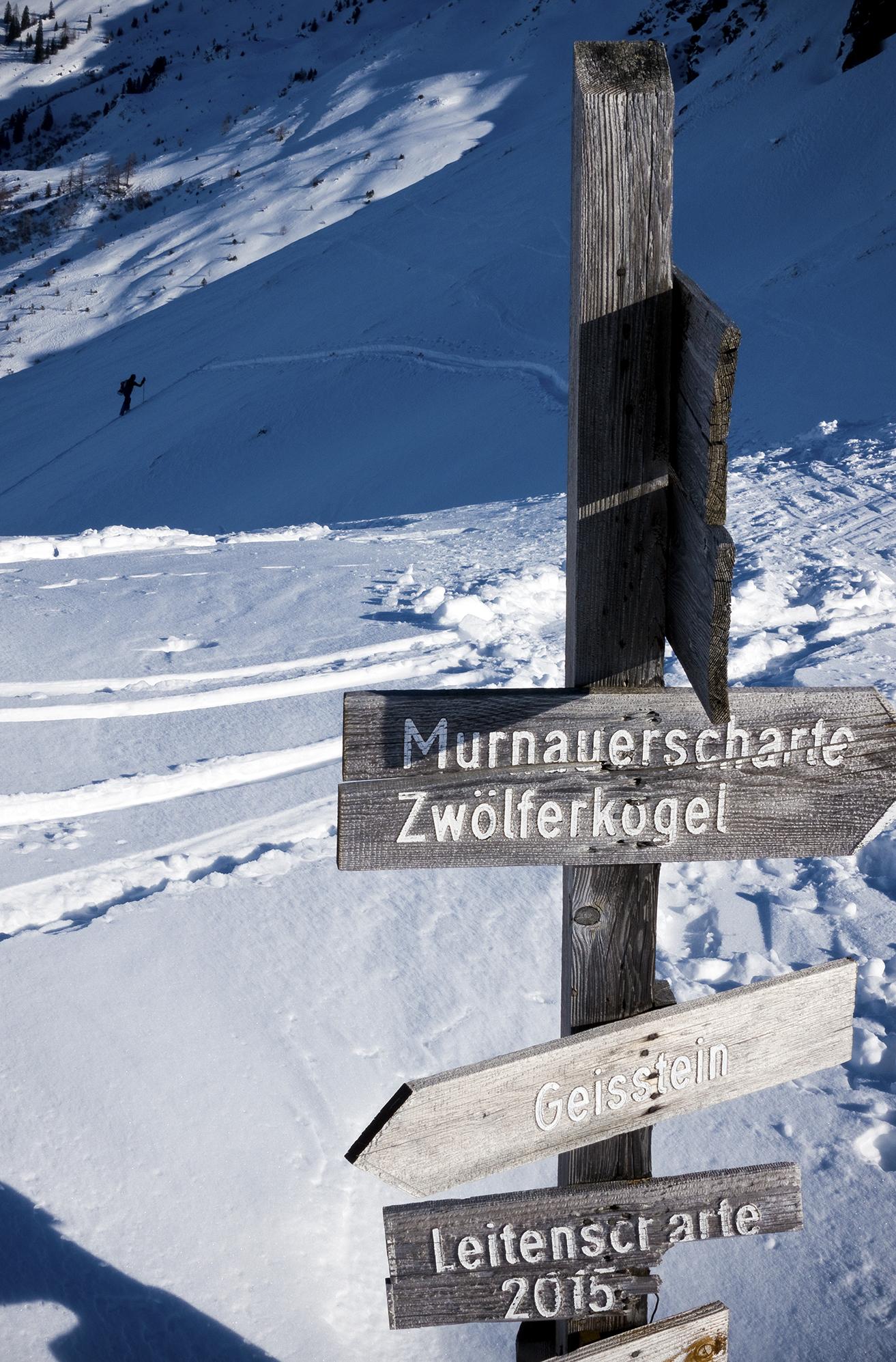 Der Schnee ist nach oben zur Leitenscharte hin zunehmend vom Wind verfestigt und hat manchmal auch ein "Krüstchen". Es gibt aber immer wieder Pulverfelder. Am gering verwechteten Kamm und in der Leitenscharte etwas Triebschnee. Vom Leitenkogel fahren wir südostseitig im weichen, leicht fahrbaren Schnee in die Murnauer Scharte. Hier geht es hinab in den nordseitigen Schattenhang, der trotz Windbehandlung gut fahrbar ist.