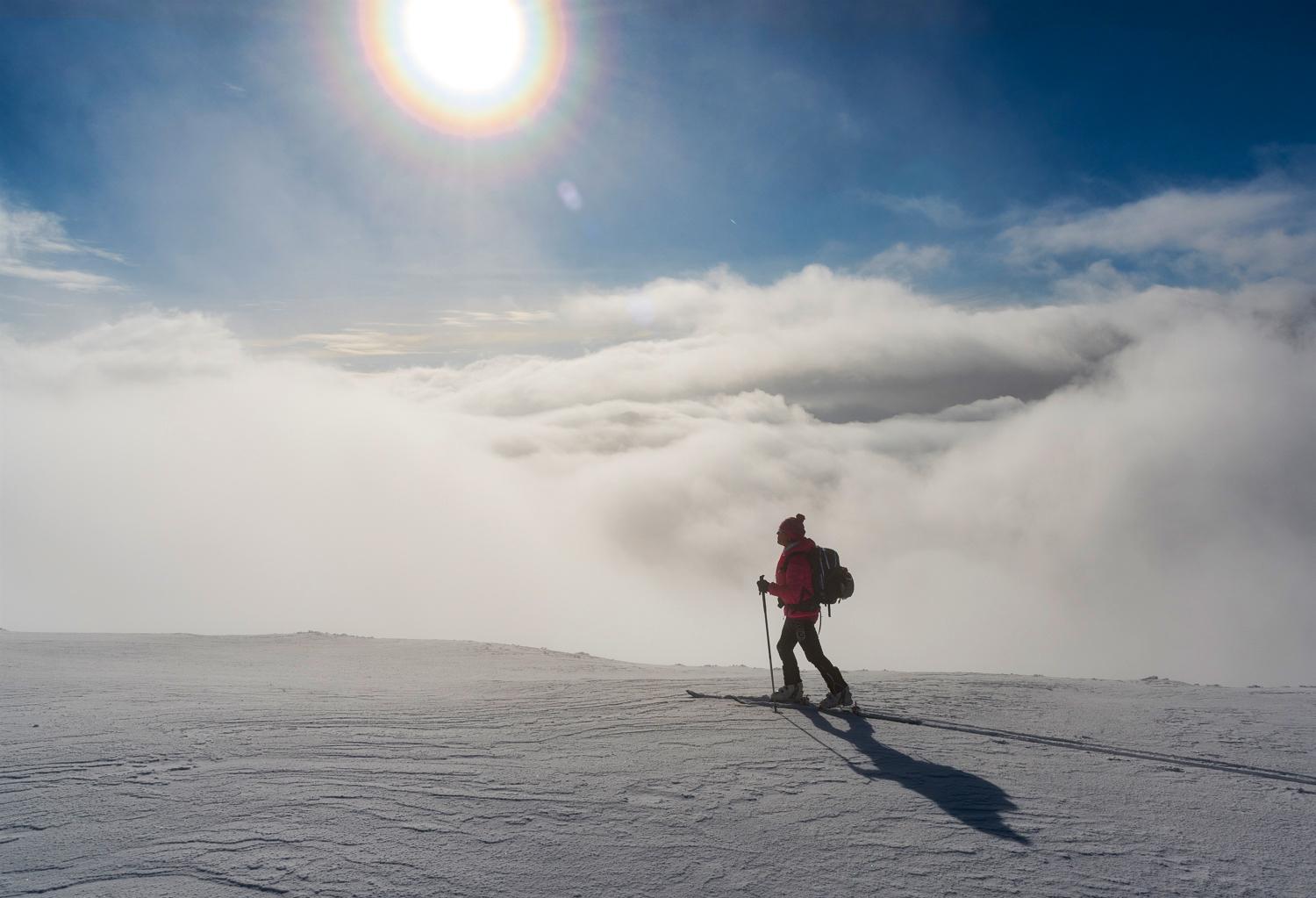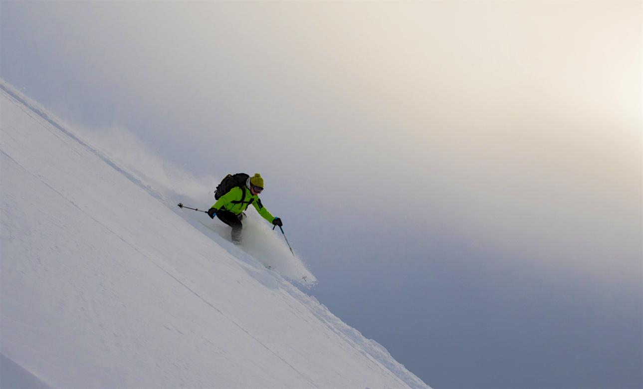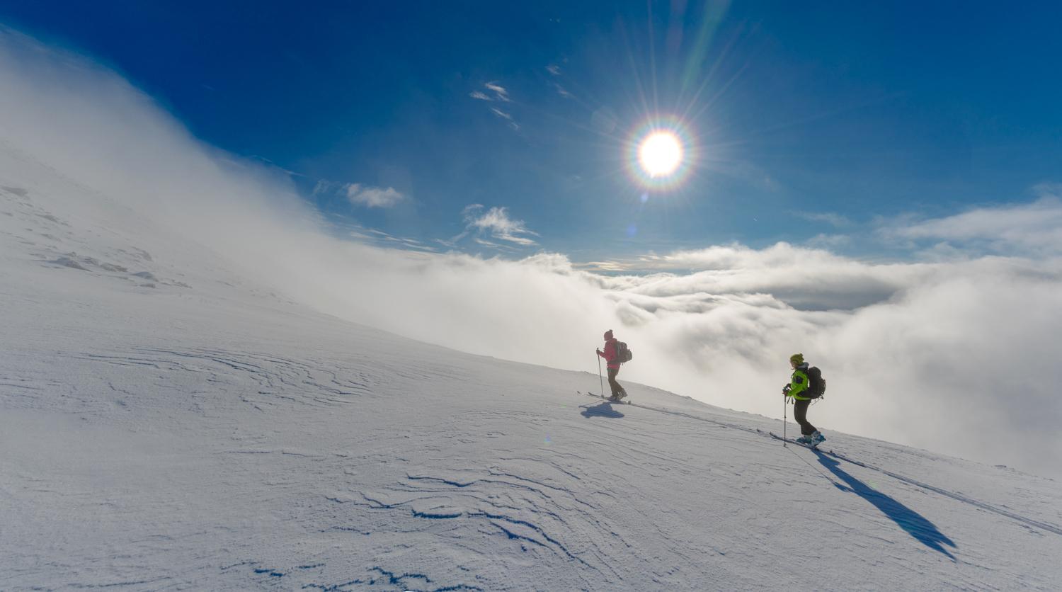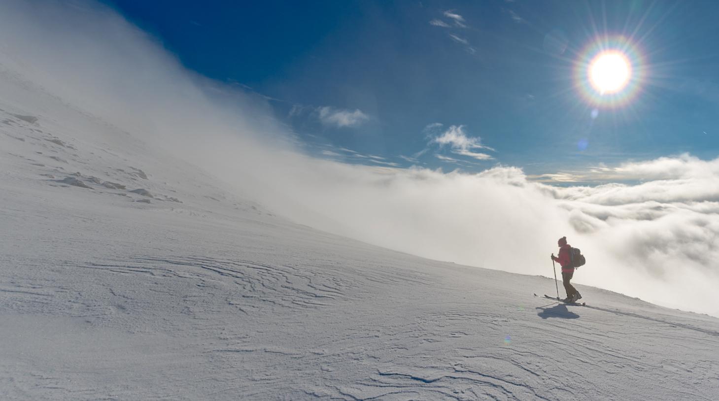 15 cm Puiva - unverspurt. Nebelreißen - tolle Wolkenstimmung. Herrliche BEDINGUNGEN . Am Übergang zum Gipfelgrat - Vorsicht Steine.- Der Neuschnee hat die Steine verdeckt.
