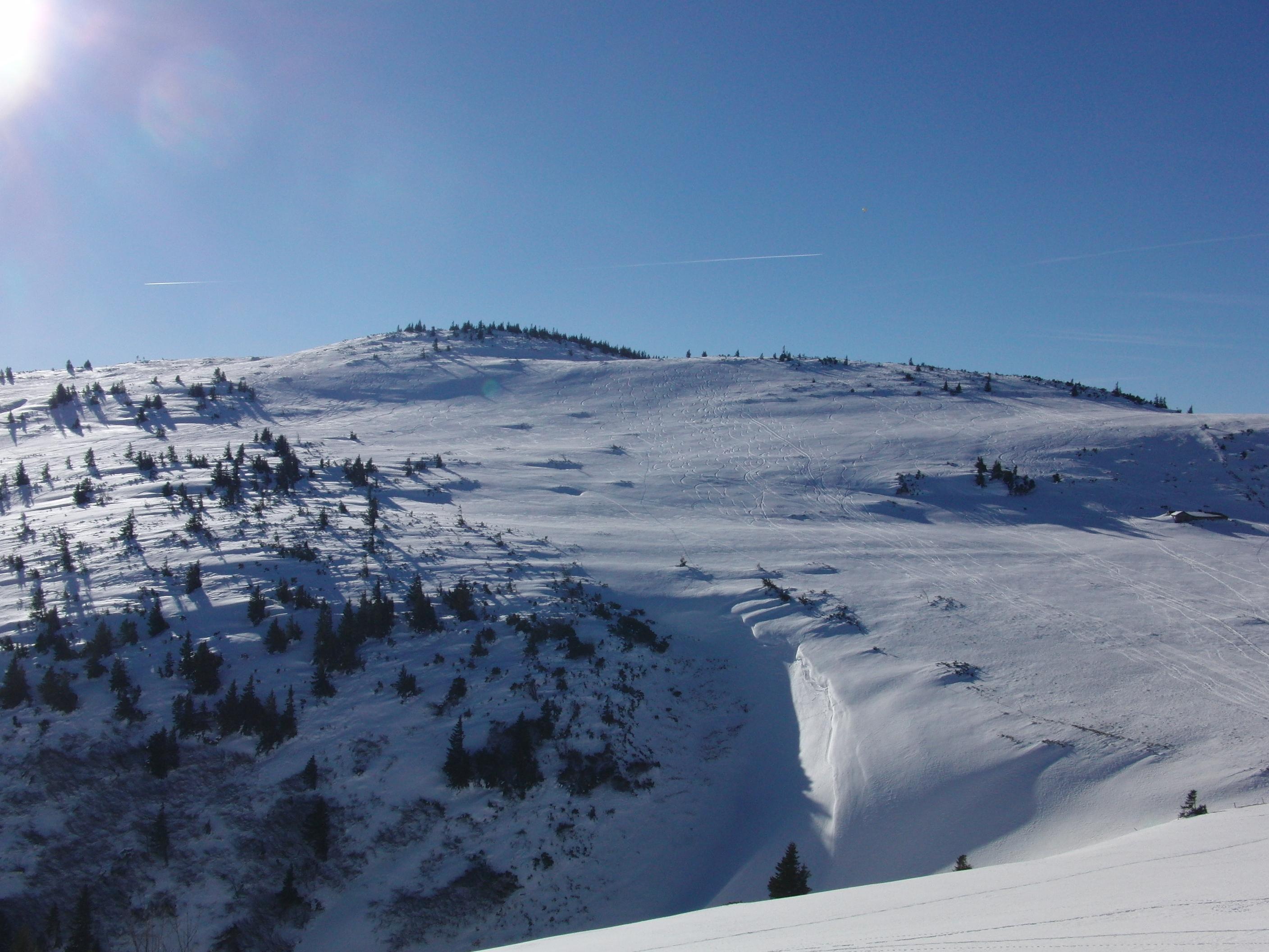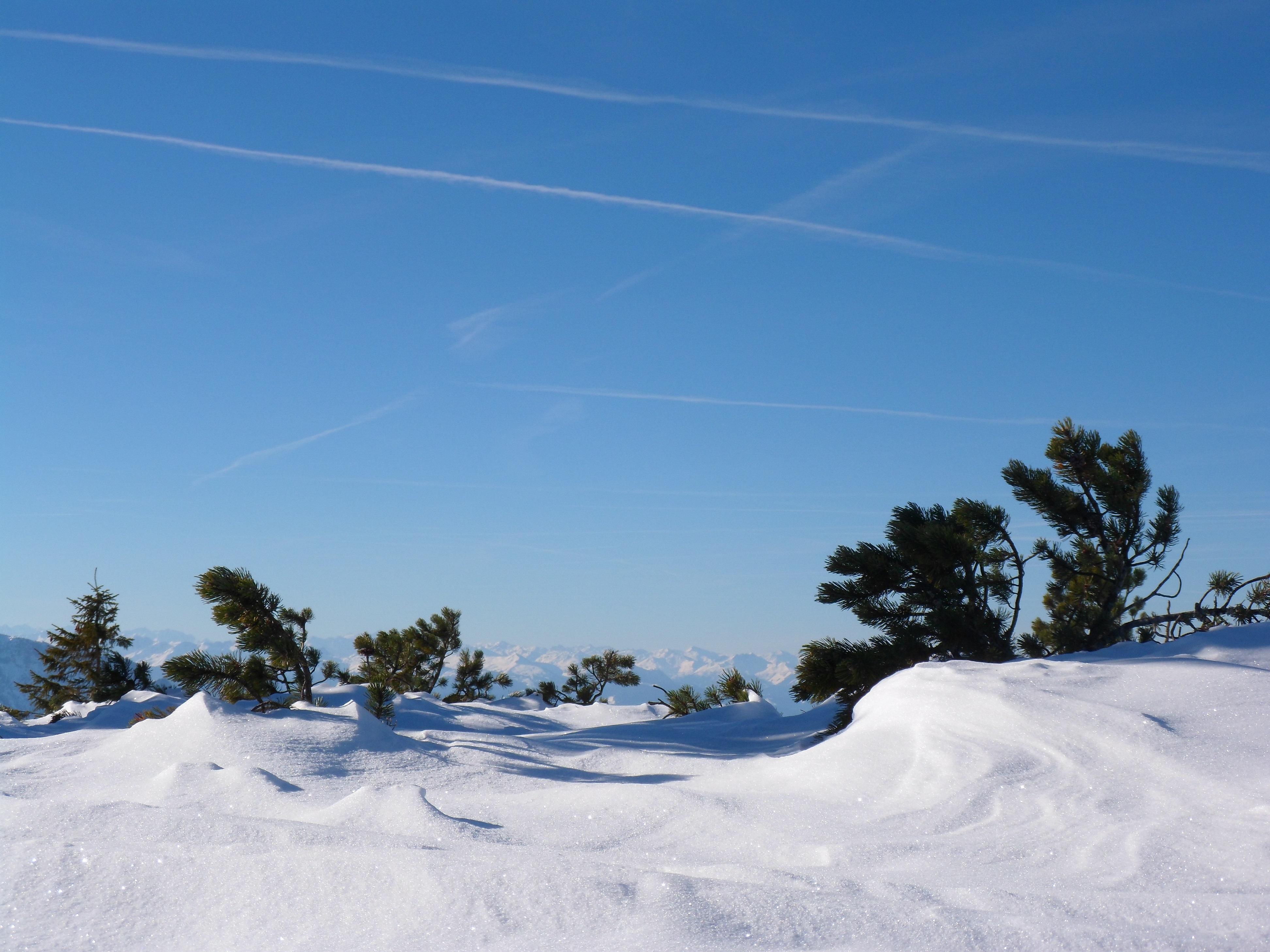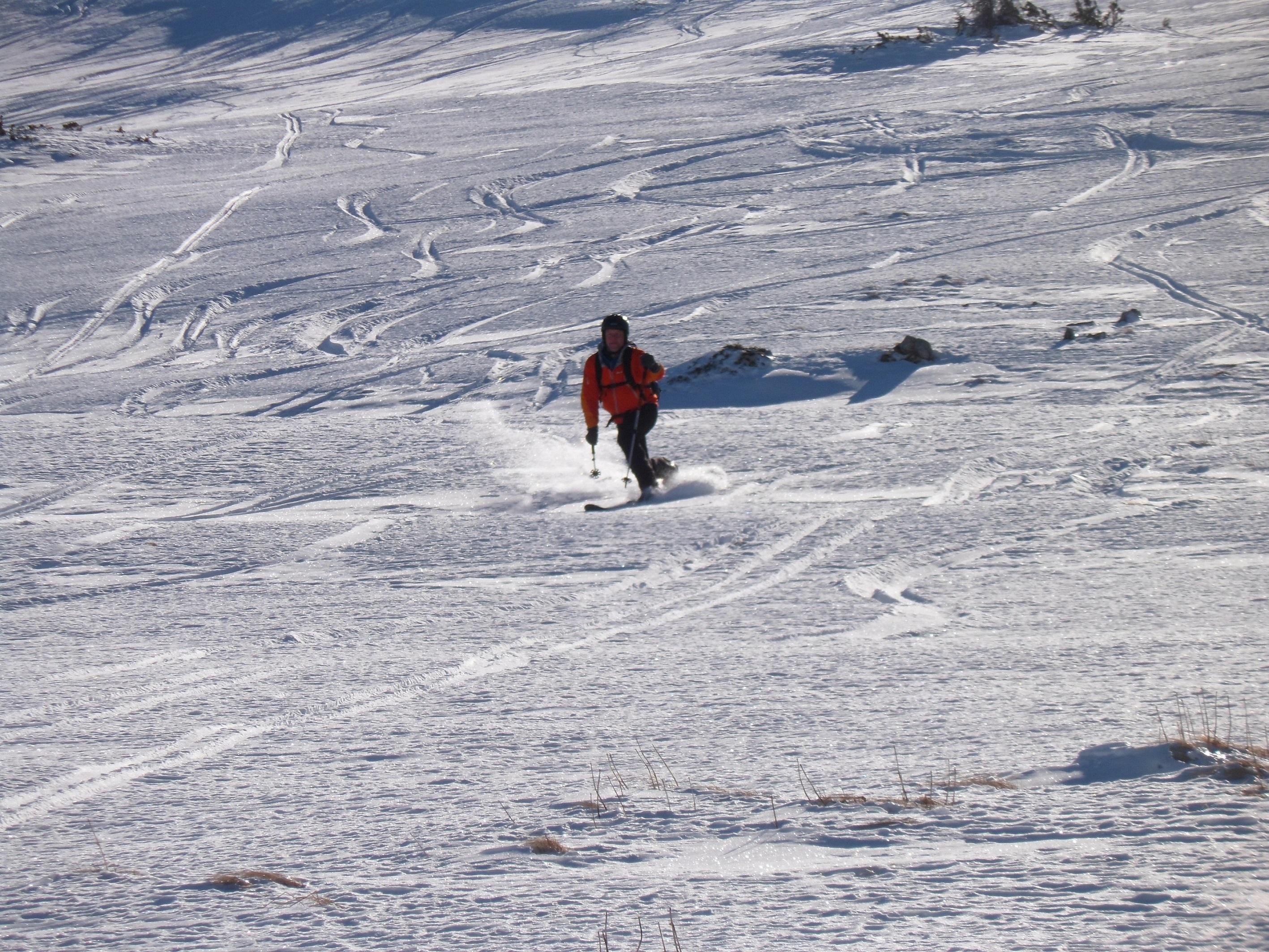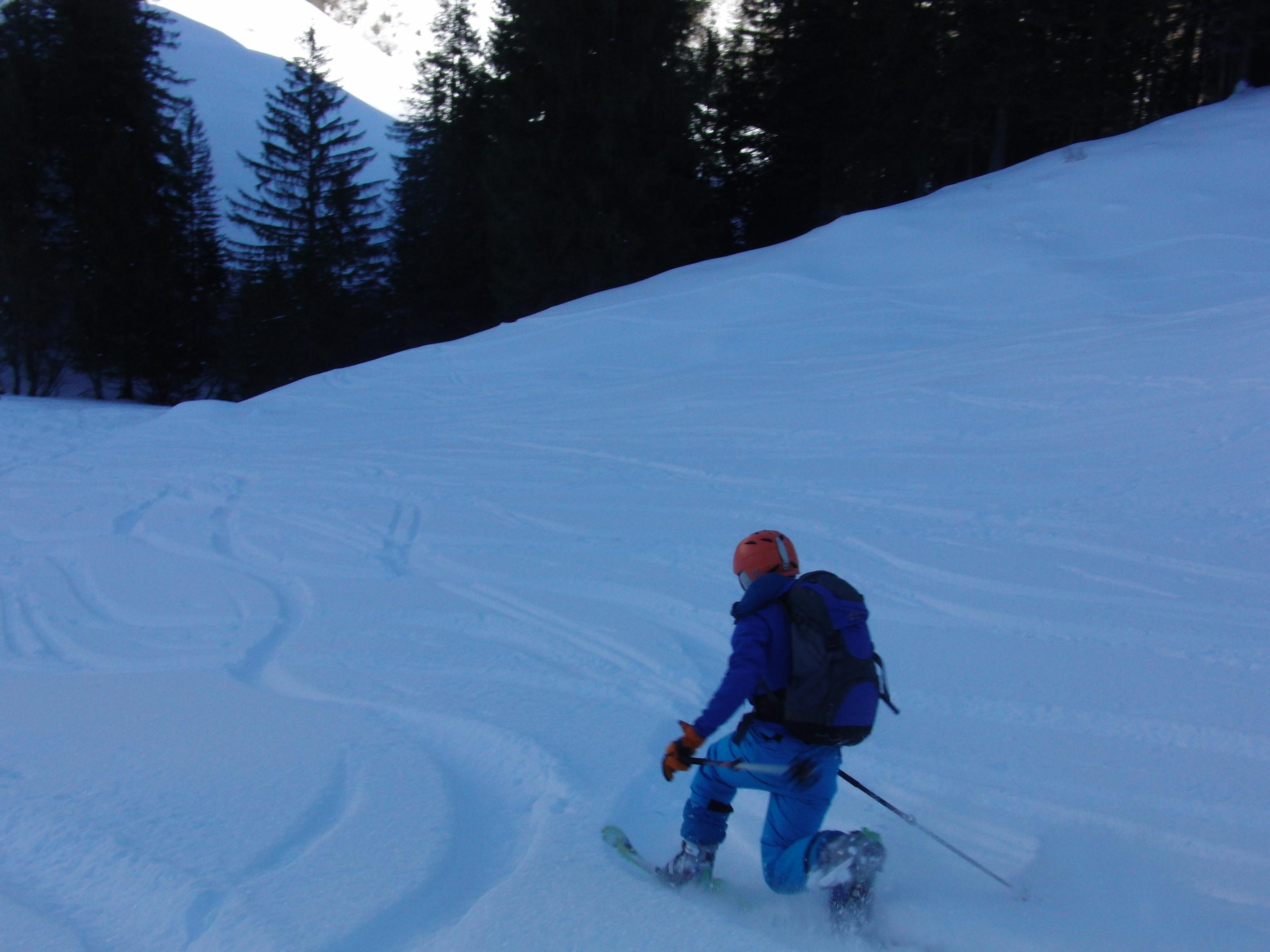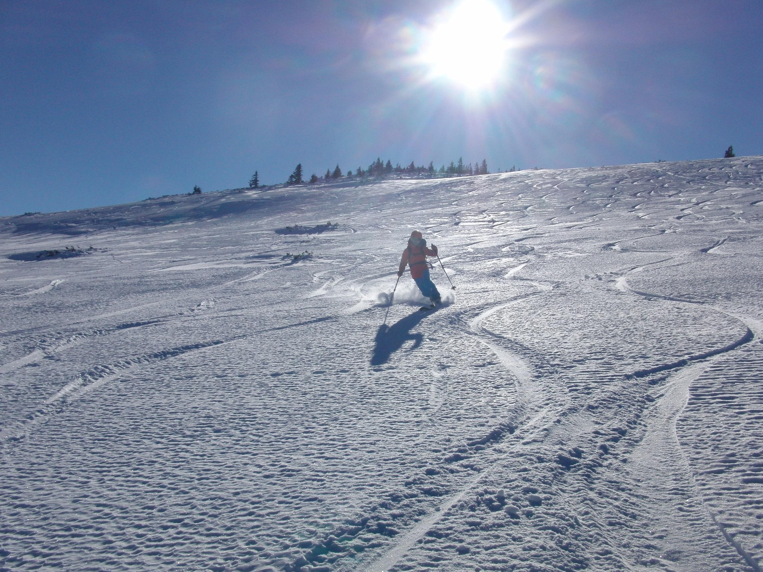 Vom Parkplatz Mühlau über die Dalsenalmen auf die Aschentaler Wände. Gegenanstieg auf der Roßalm auf eine kleine Anhöhe, um den feinen besonnten Schnee mitzunehmen.