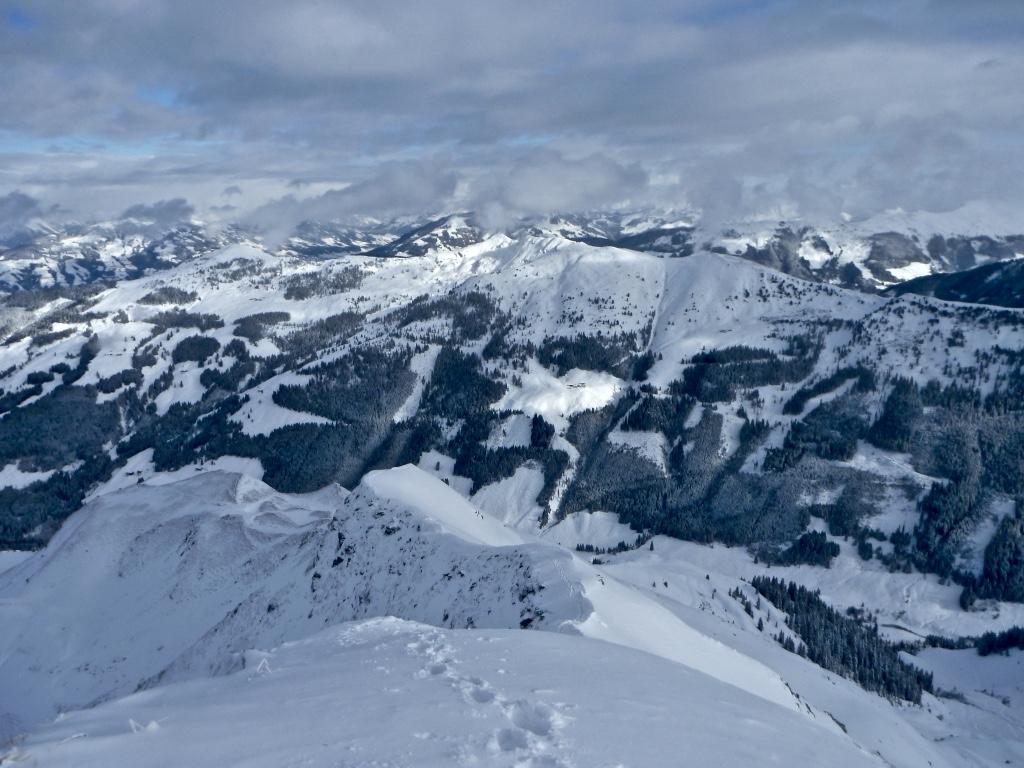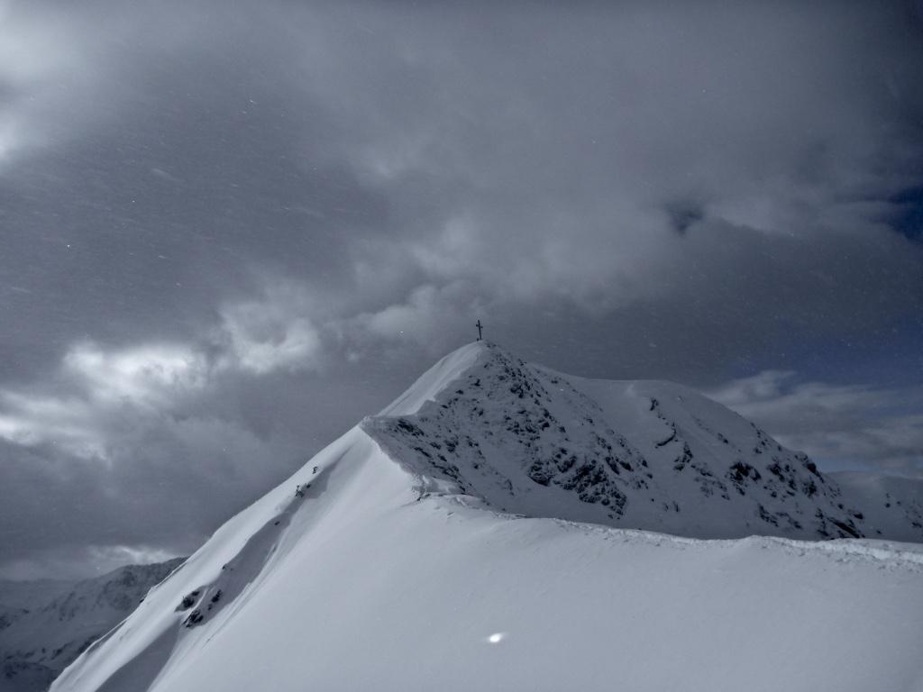 Dank der letzten intensiven Schneefälle (guter halber Meter nach oben hin mehr) sehr gute Bedingungen, davor wars wohl grün?, mühsame Spurarbeit, da noch wenig Setzung. Gipfelgrat zu Fuß.