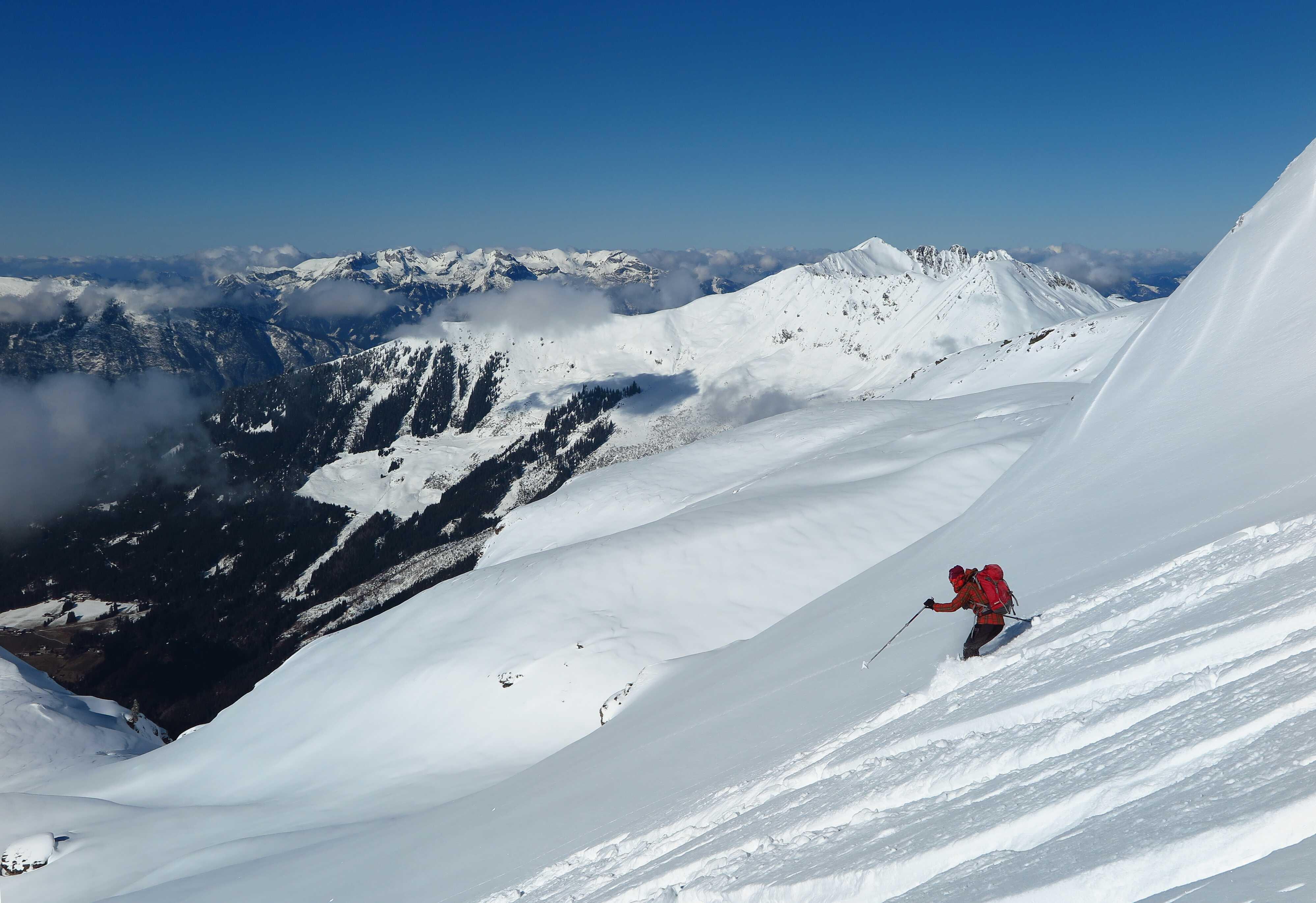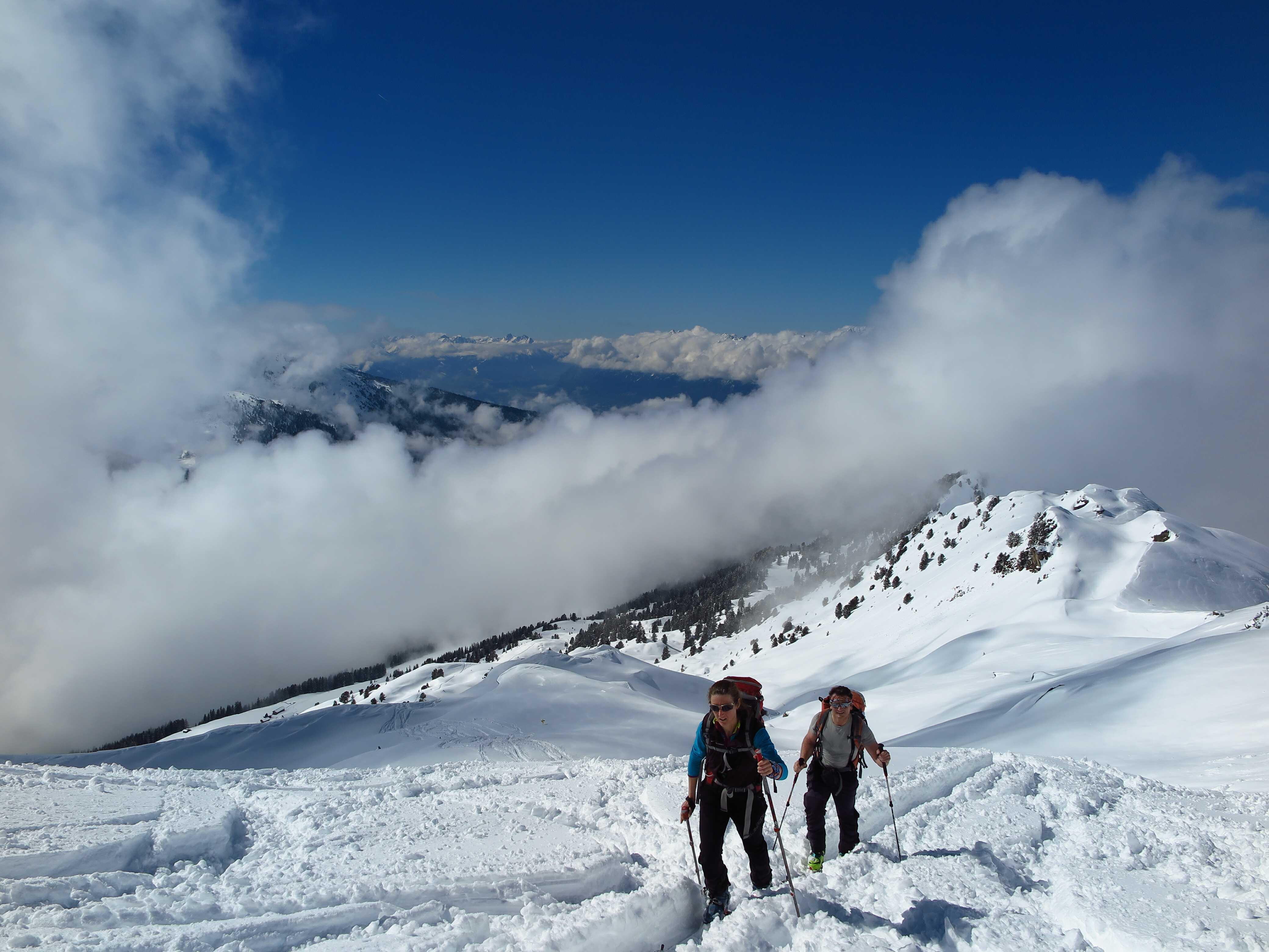 Schneelage: Schneefallgrenze ca. 1100m, am PP ca. 10cm Pappschnee, Schneehöhe stieg mit der Höhe rasch an auf ca. 30-40cm. In der Sonne war der Schnee bereits pappig und wurde z.T. auch schon schwer. Die Abfahrt N-seitig war großenteils noch pulvrig, der Schnee teilweise fast zu tief (bis ca. 50cm) für flachere Hänge.