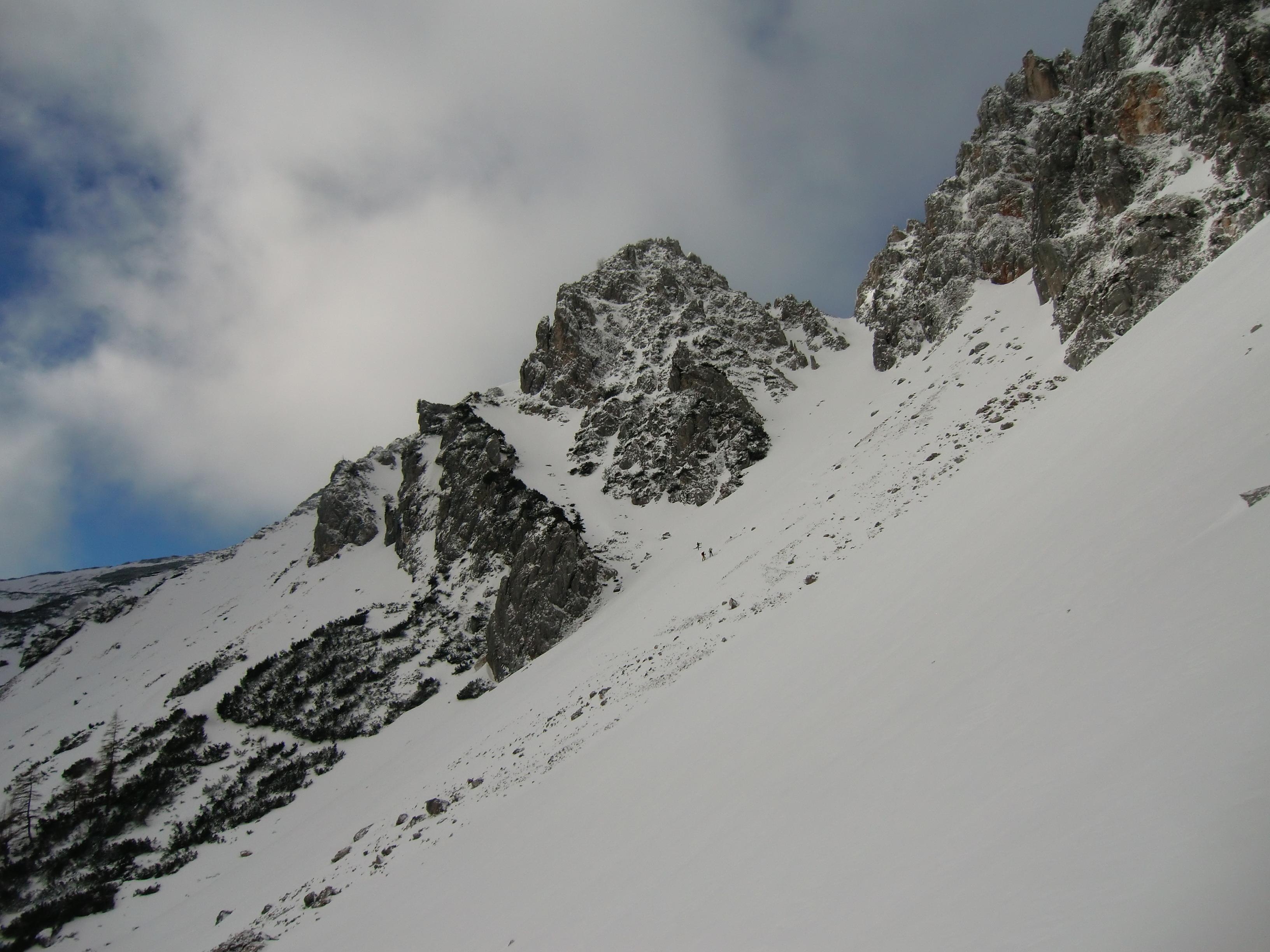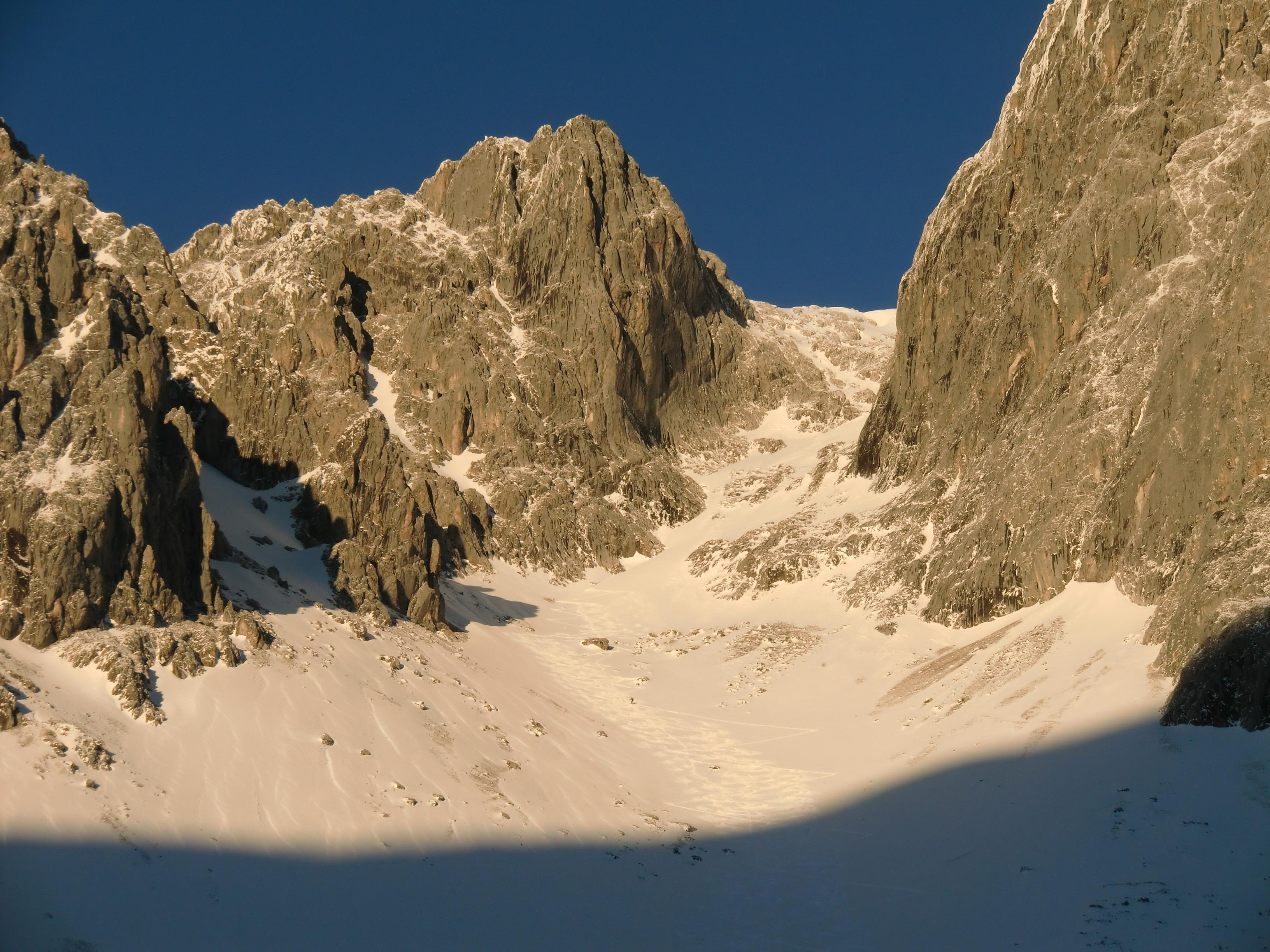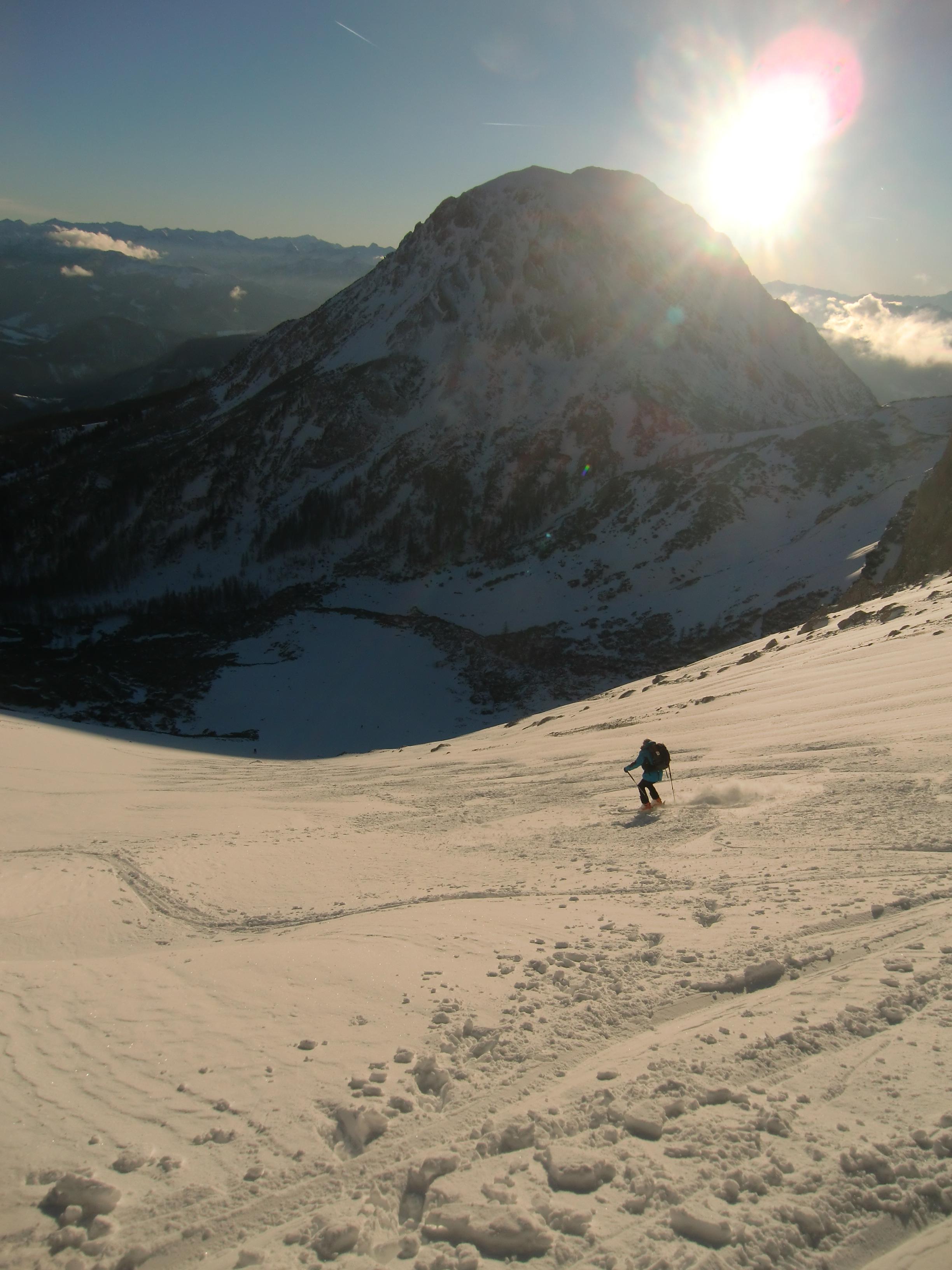 Der Wetterbericht hat ja von Salzburg nach Osten am meisten Neuschnee versprochen (Tennengebirge, Gosaukamm, Dachstein), dann noch der gestrige Eintrag von Martin und Karo zur Sulzenschneid und der Entschluss, wo das Kriterium des ersten Schnees stattfinden sollte, war gefasst. Andrang: Am Bachlalmparkplatz etwa 15 Autos. Rauchkar: 2 (wir beide). Windlegerkar: außer uns 6. Westlichster Gully im Kar: 8. Der Rest (ca. 15 Eiskarlschneid). Mehrfachbegehungen natürlich möglich.