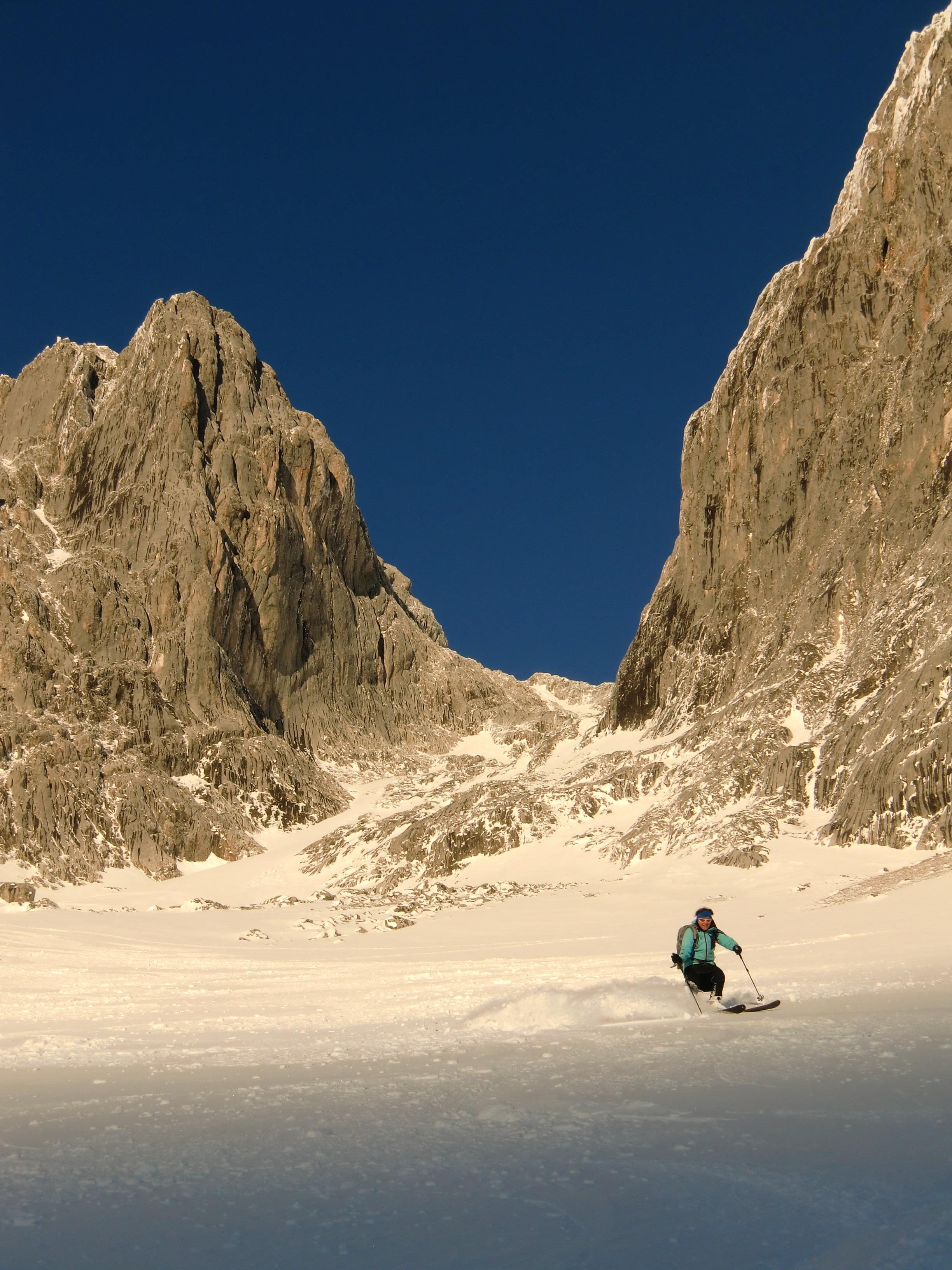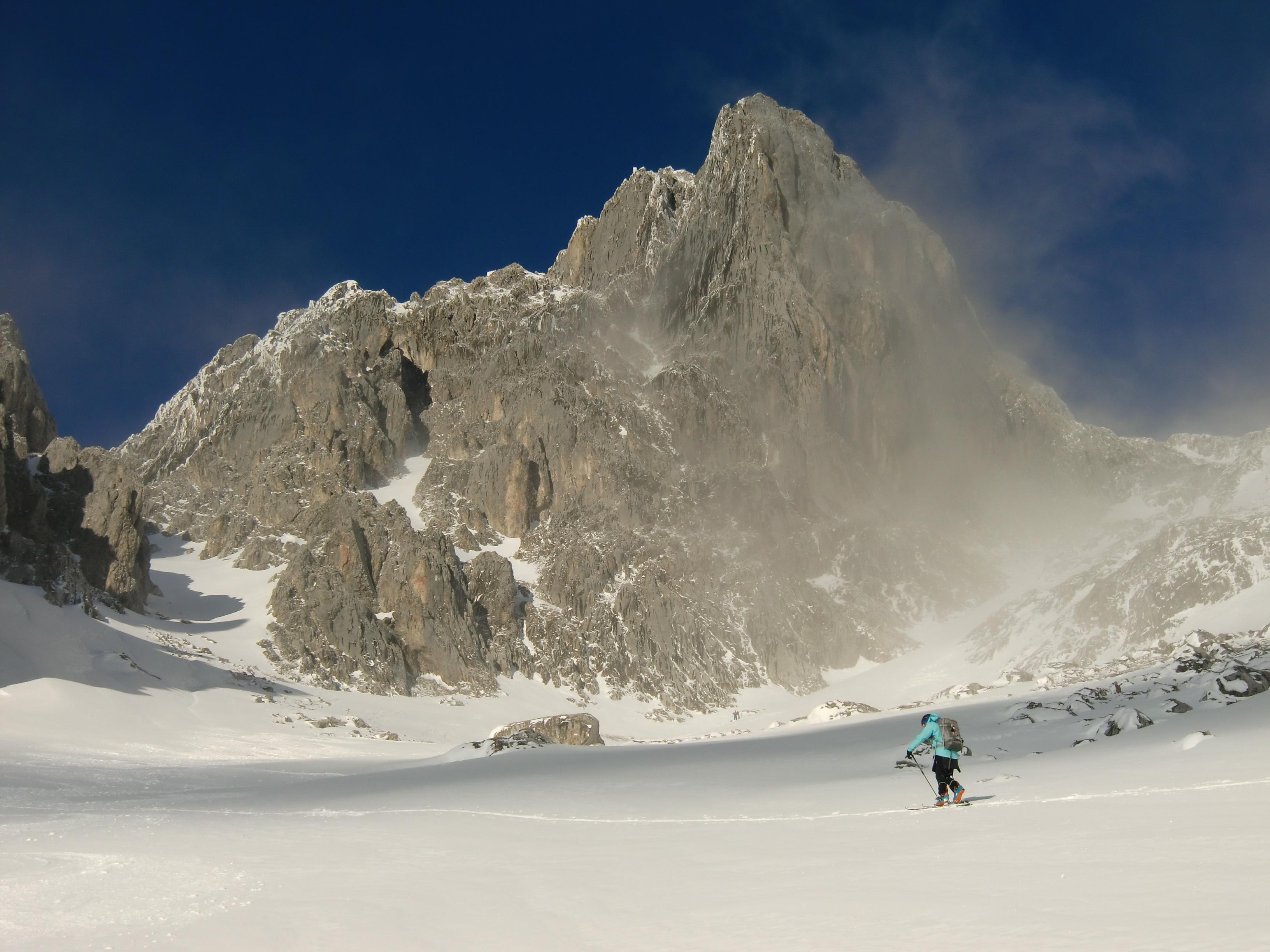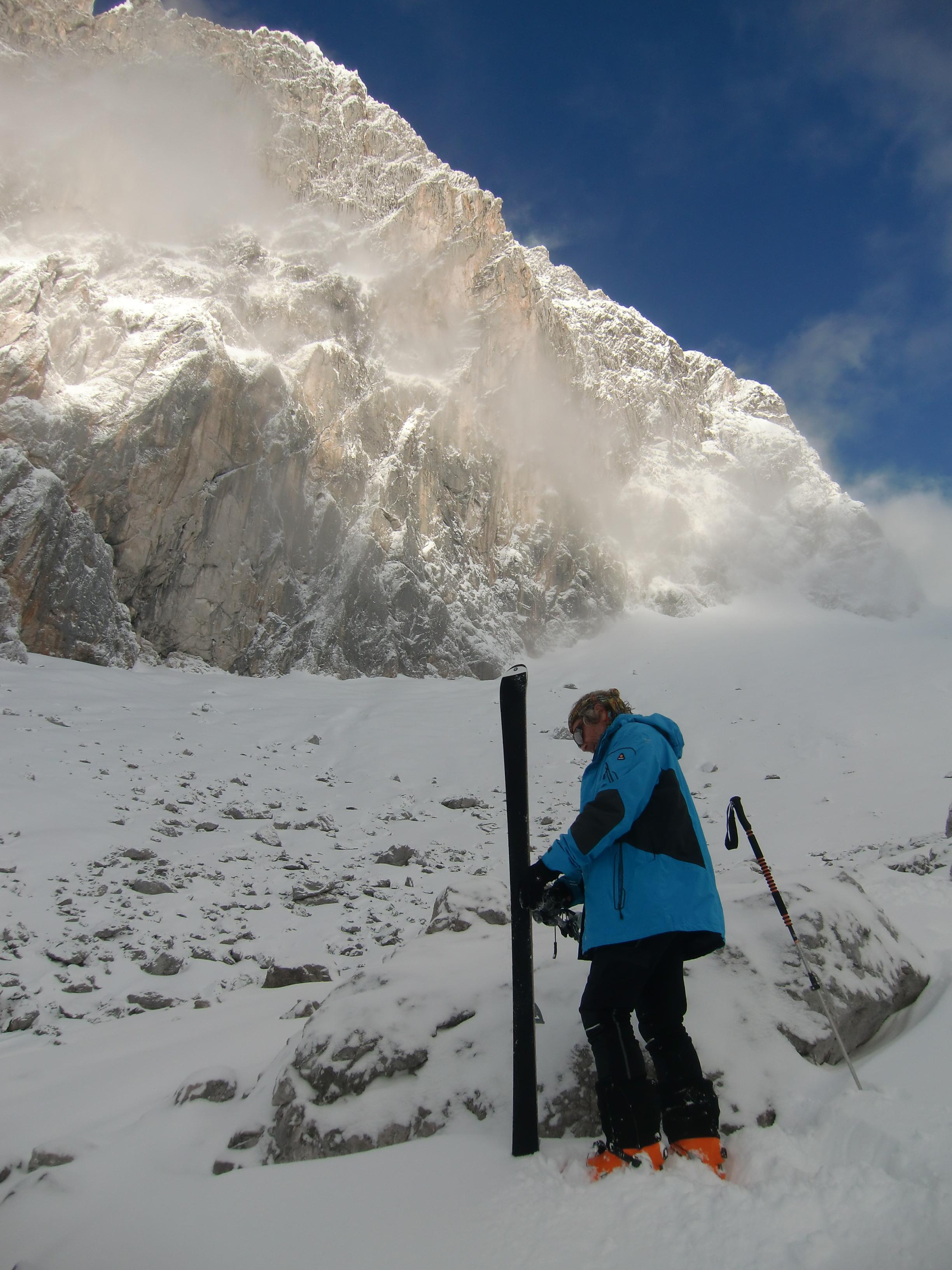 Der Wetterbericht hat ja von Salzburg nach Osten am meisten Neuschnee versprochen (Tennengebirge, Gosaukamm, Dachstein), dann noch der gestrige Eintrag von Martin und Karo zur Sulzenschneid und der Entschluss, wo das Kriterium des ersten Schnees stattfinden sollte, war gefasst. Andrang: Am Bachlalmparkplatz etwa 15 Autos. Rauchkar: 2 (wir beide). Windlegerkar: außer uns 6. Westlichster Gully im Kar: 8. Der Rest (ca. 15 Eiskarlschneid). Mehrfachbegehungen natürlich möglich.