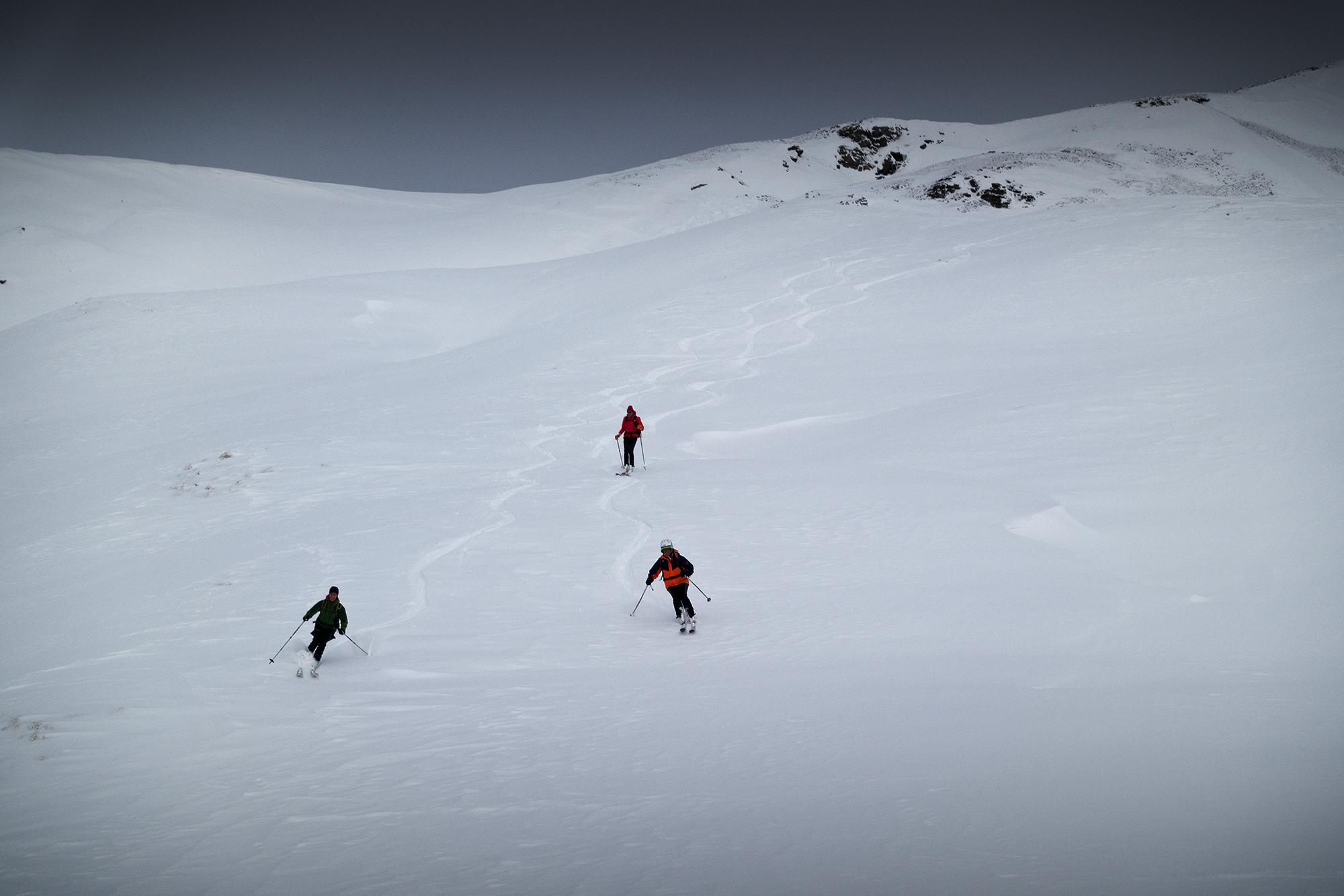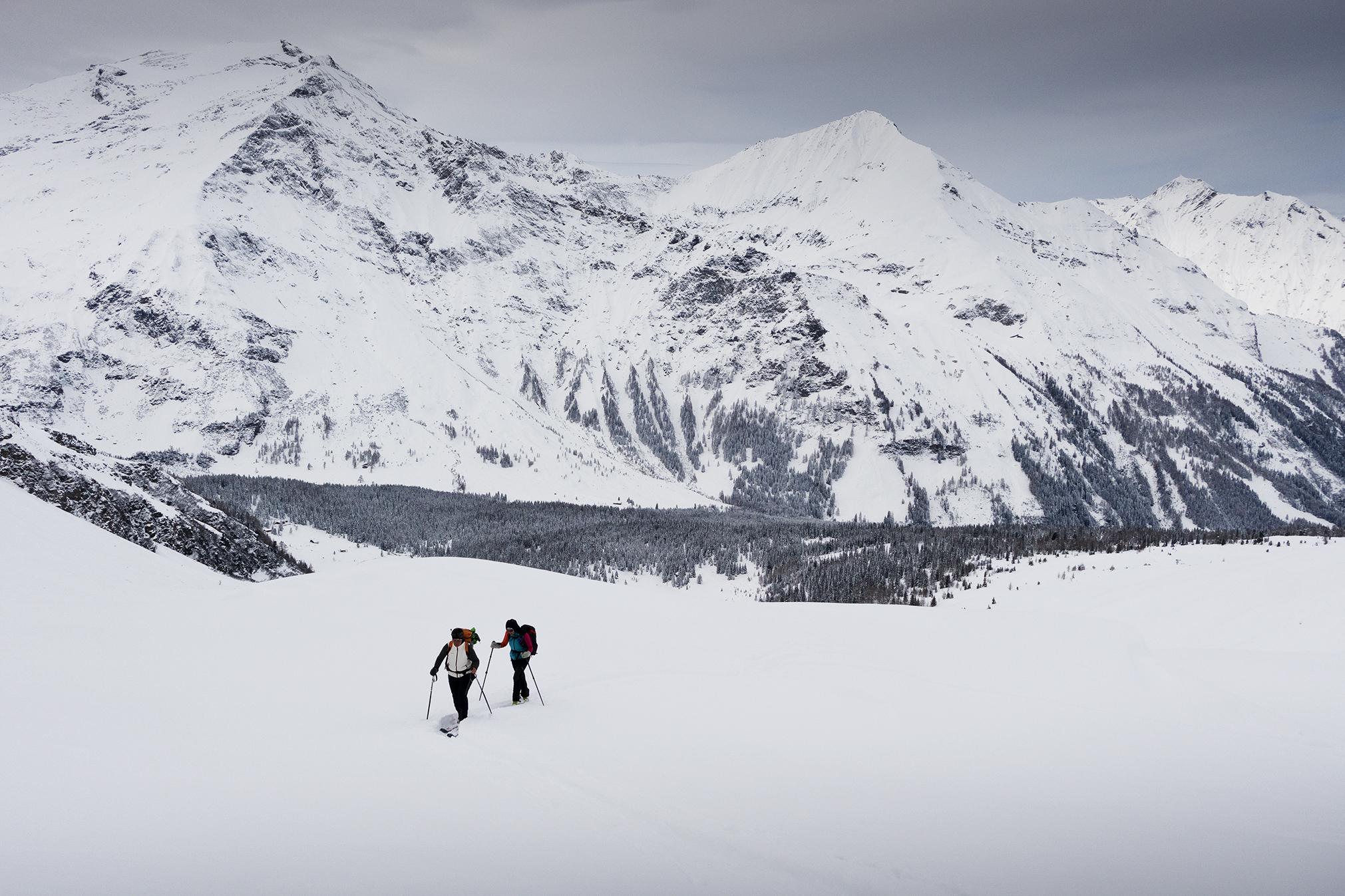 Zur Kolmkarscharte hinauf wurde der Schnee zunehmend windverfestigt und gepresst. Am Rücken war alles abgeblasen bis auf die Vegetation, mit einzelnen Eisfeldern.