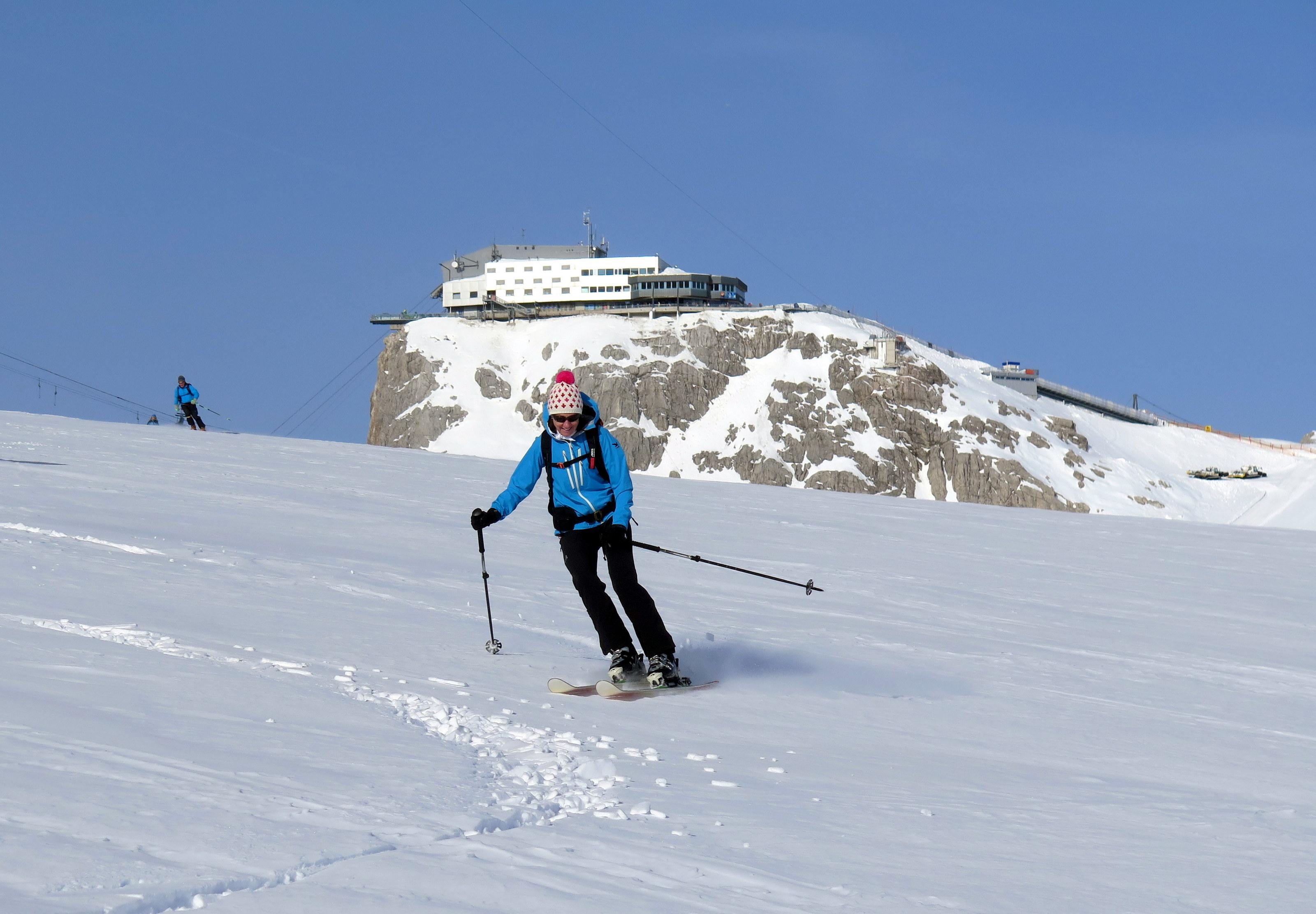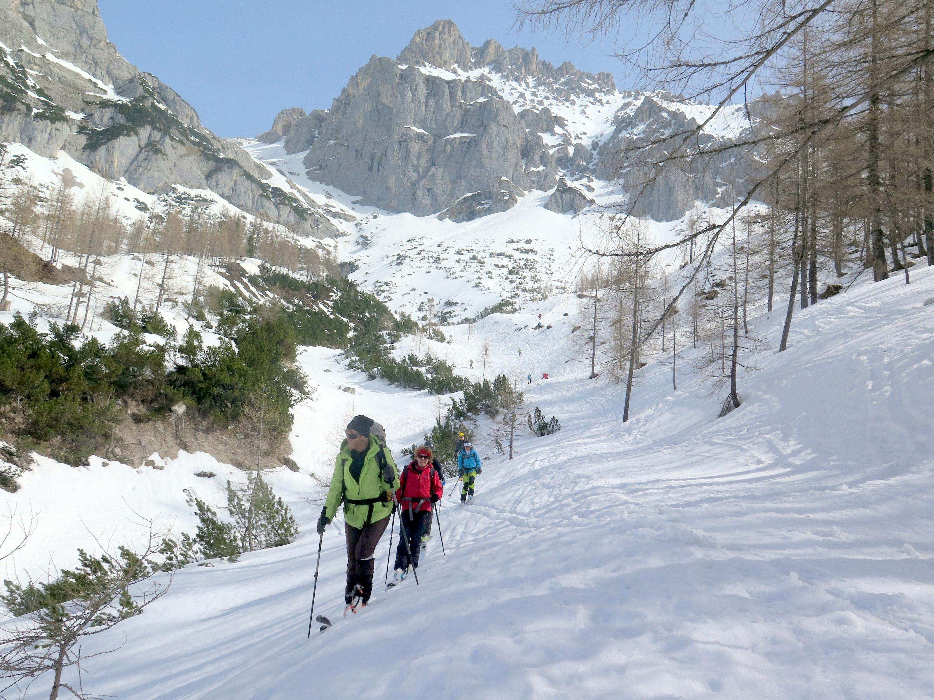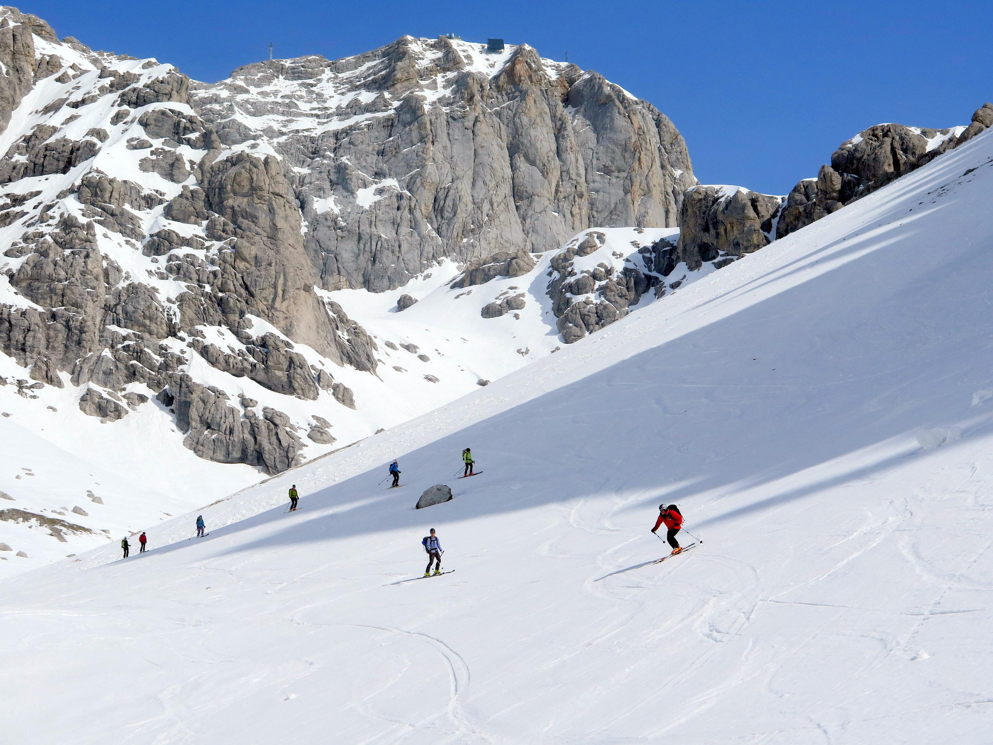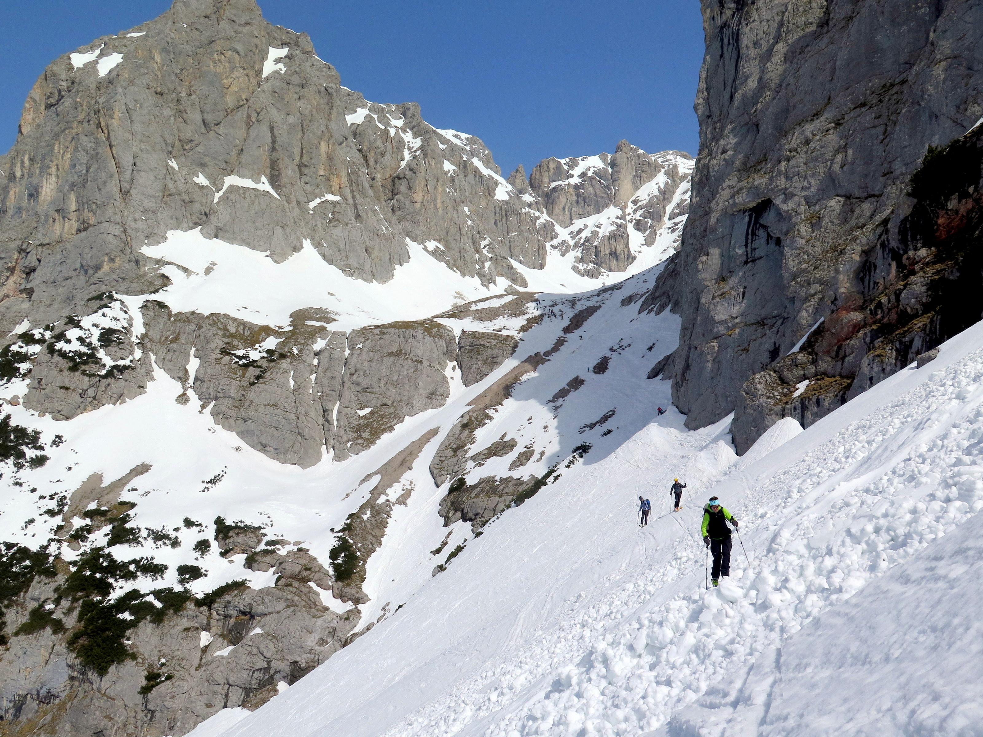 Wiederholung der Runde, die vor 10 Tagen noch beinahe winterlich und "pulverhaltig" war. Heute nur sehr schwach ausgeprägter Harscheckel, selbst die schattigen Hänge im Edelgrießkar wurden bereits am späteren Vormittag weich. Die Ausfahrt in Richtung Burgleiten beginnt in der Querung schon stark auszuapern.