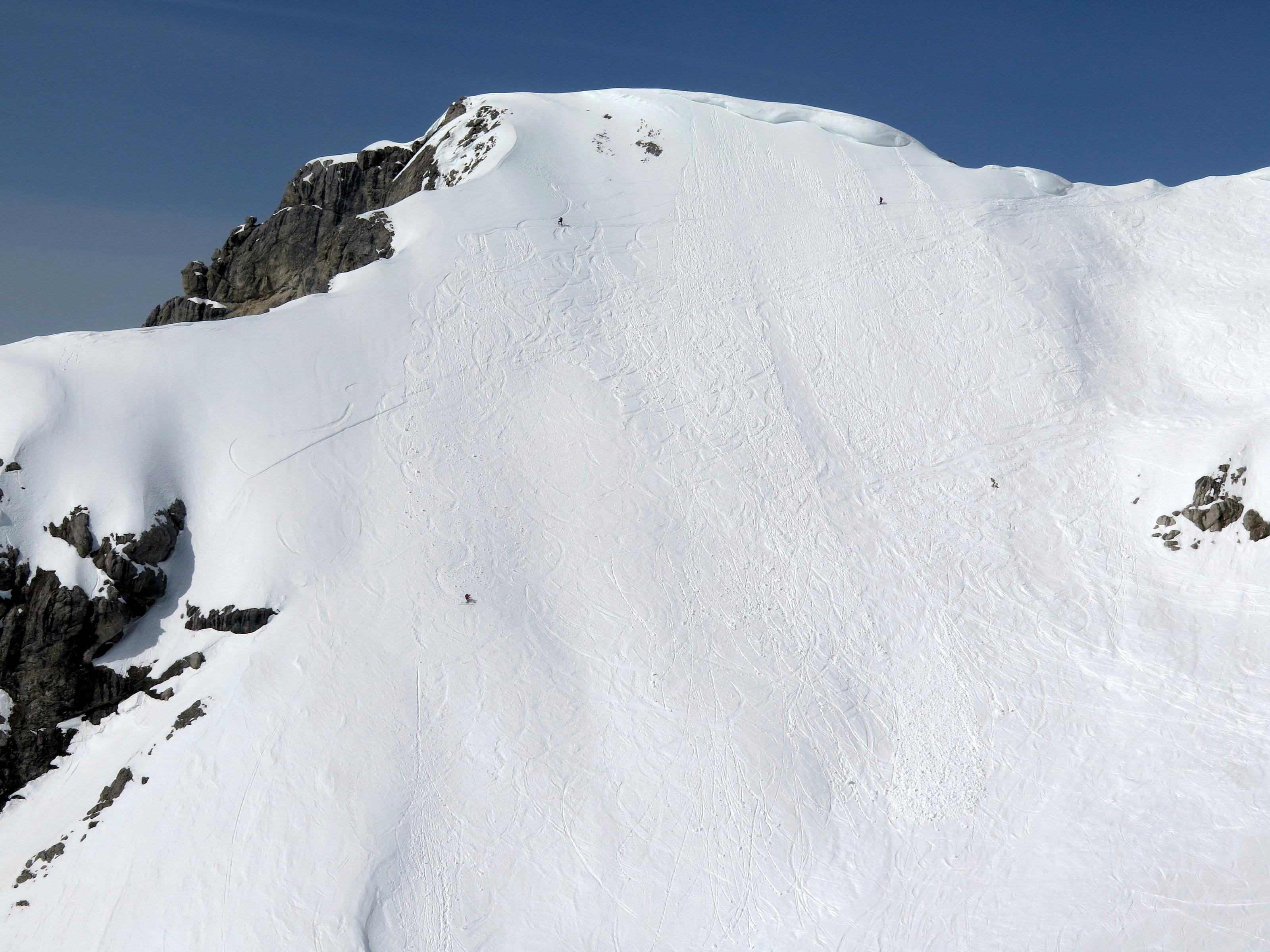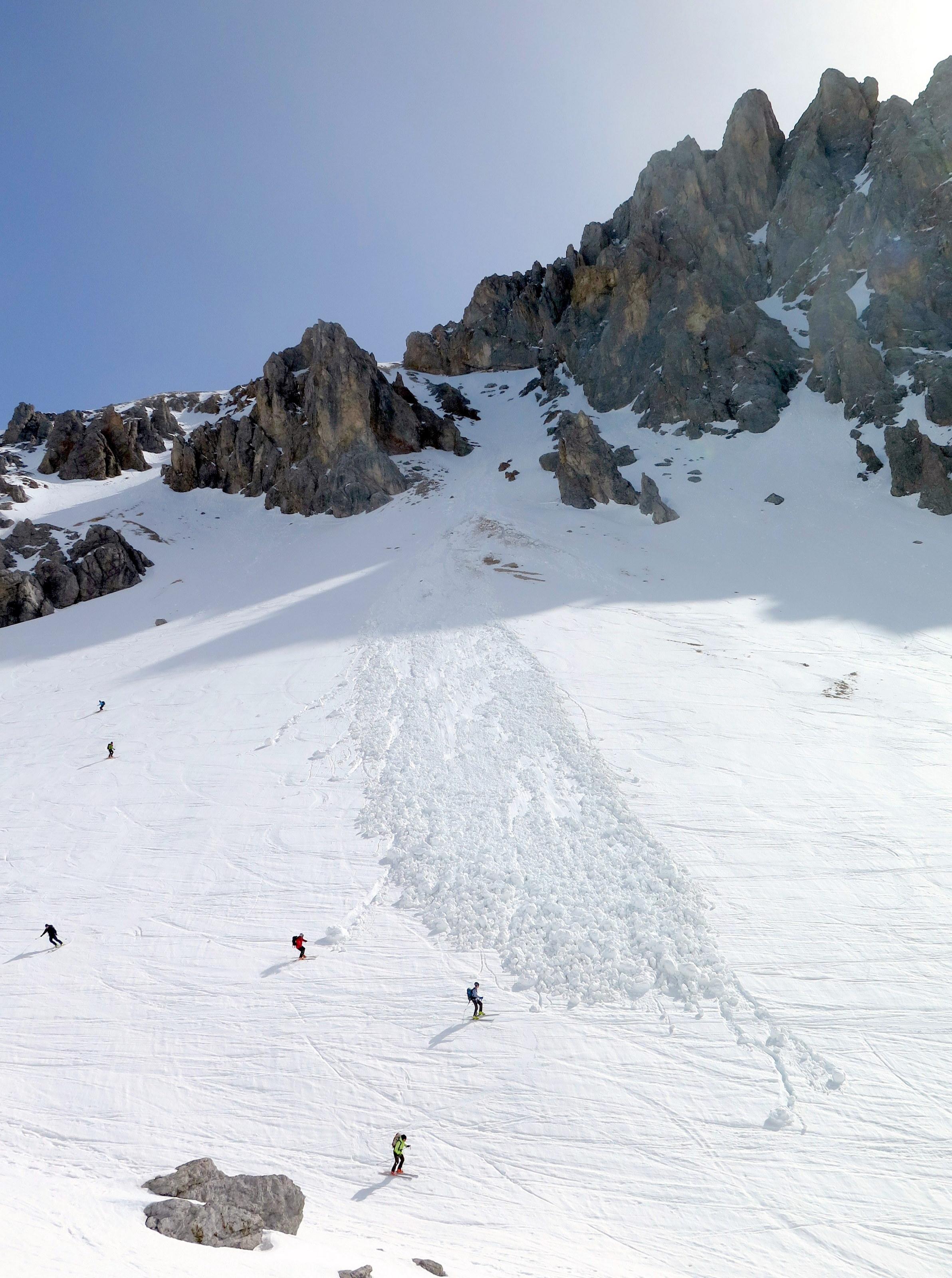 Mehrere Nassschnee-Lawinen von beiden Seiten im Edelgrießkar, die beachtliche Kegel aufgebaut haben. Die Sperre des Rosmariestollens ab 13:00 Uhr ist unter diesem Aspekt völlig verständlich. Verhältnisse und Temperaturen wie im Mai ...