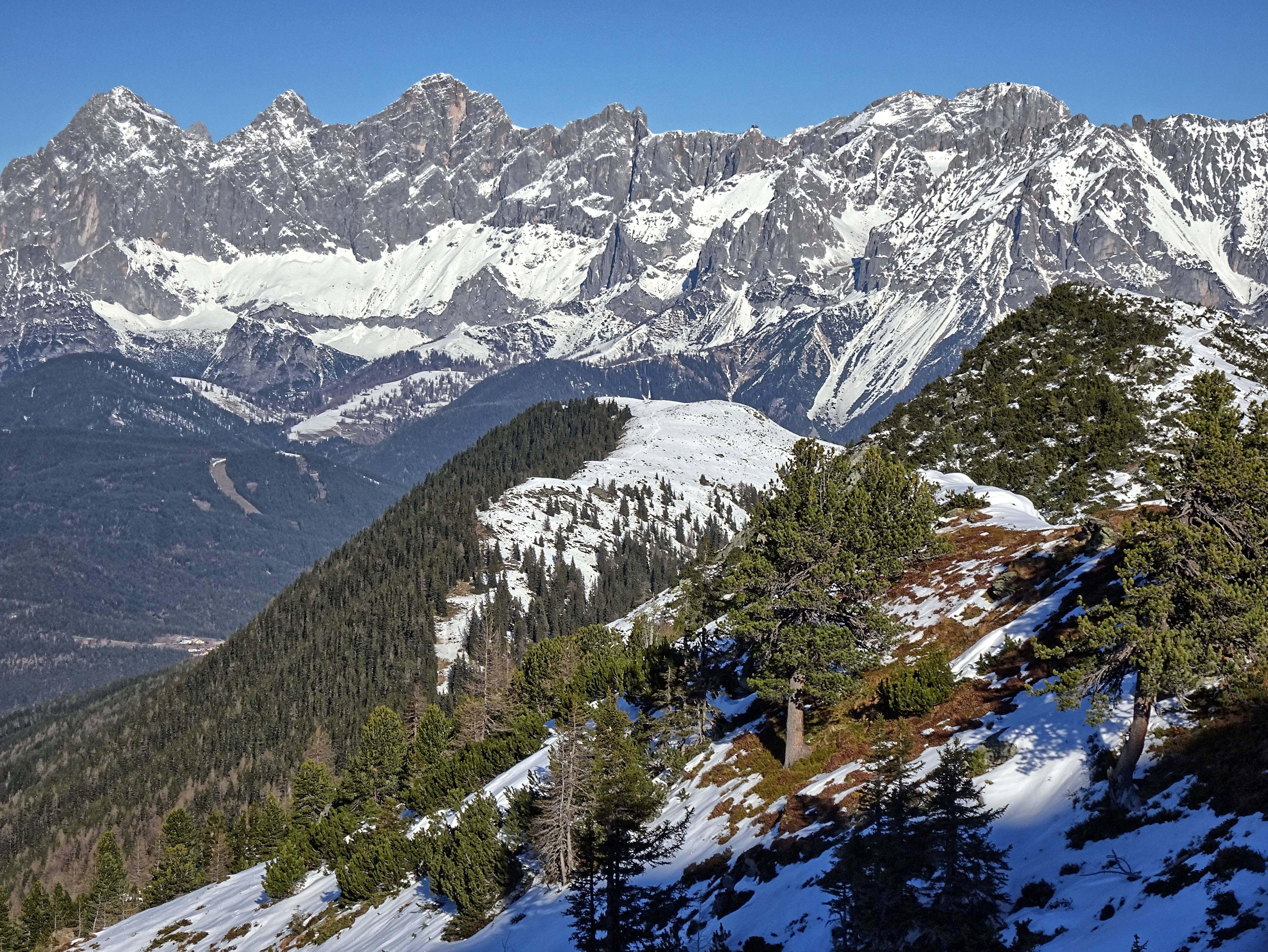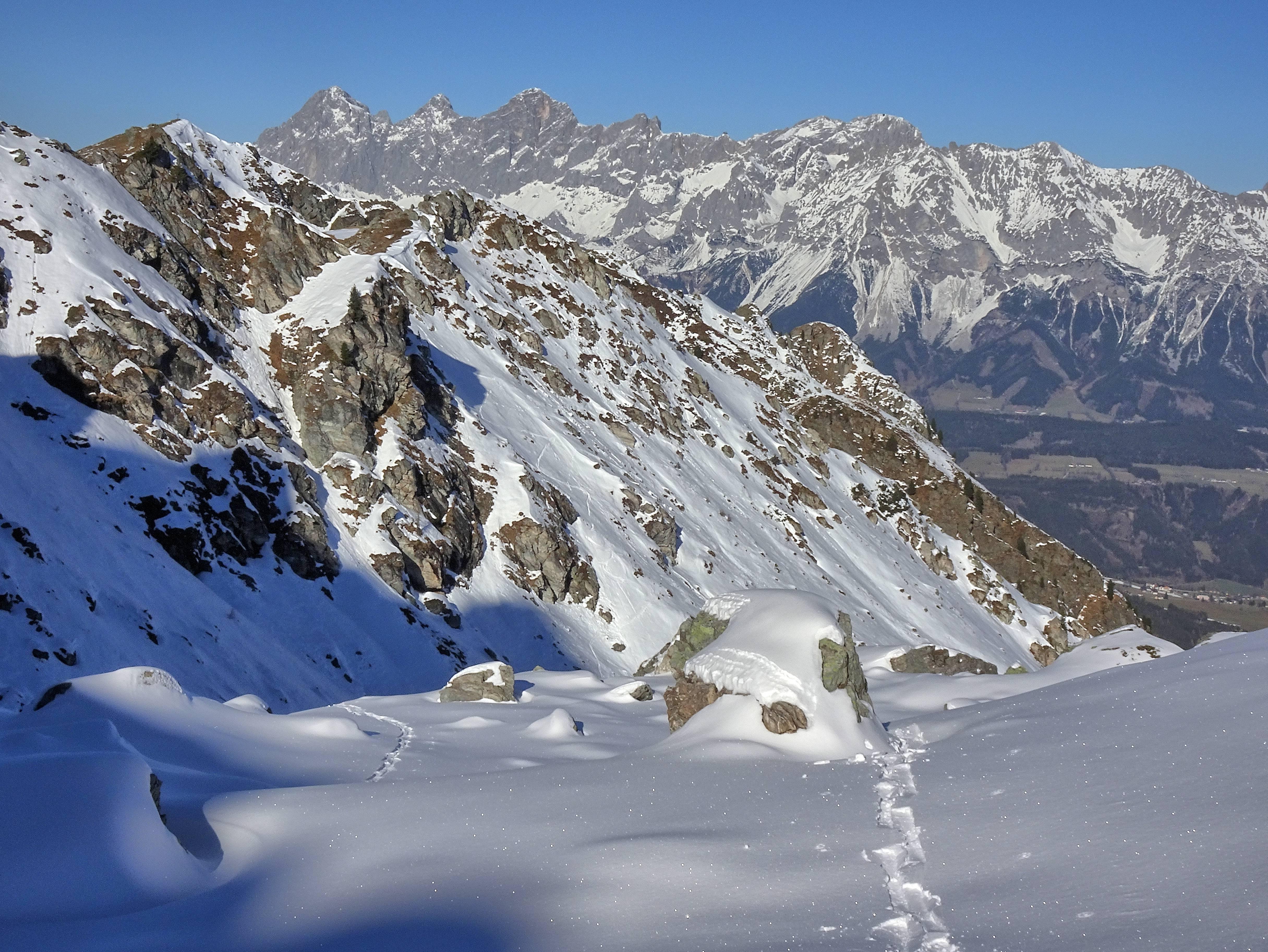 Ausreichend Schnee, auch für die Abfahrt im Gelände. Schattseitig jedoch in den Niederen Tauern nicht verfestigt. Mehr oder weniger tragender Harschdeckel. Sonnseitig z.T. am Gras abgleitend.