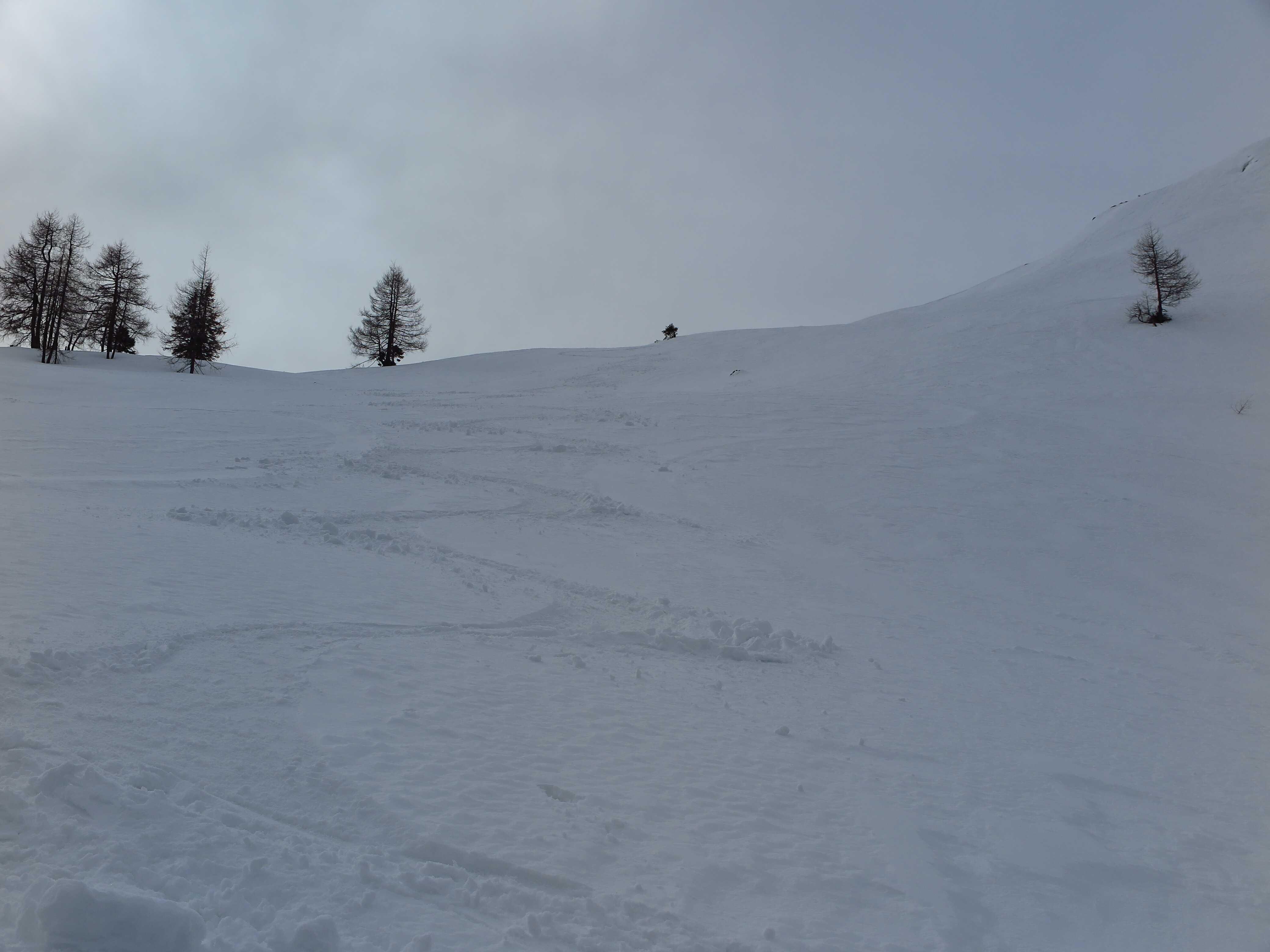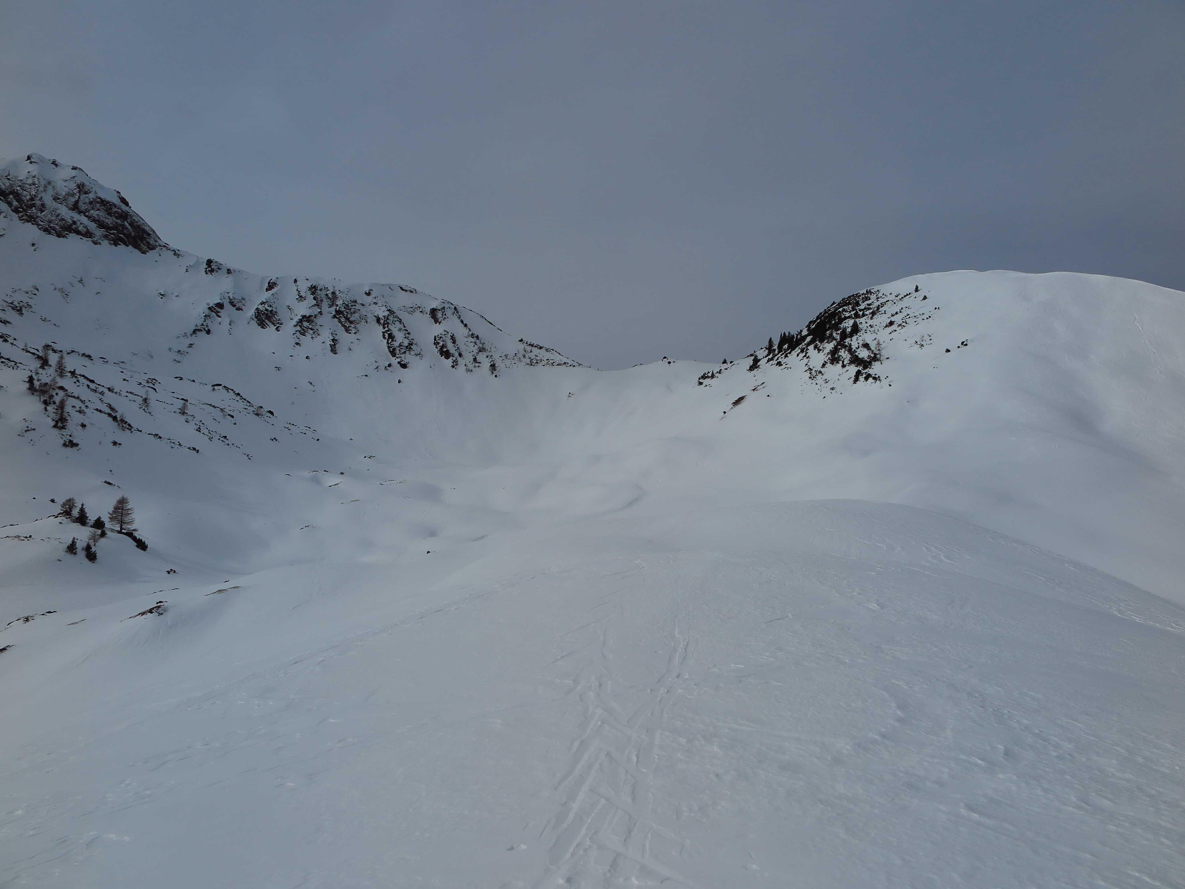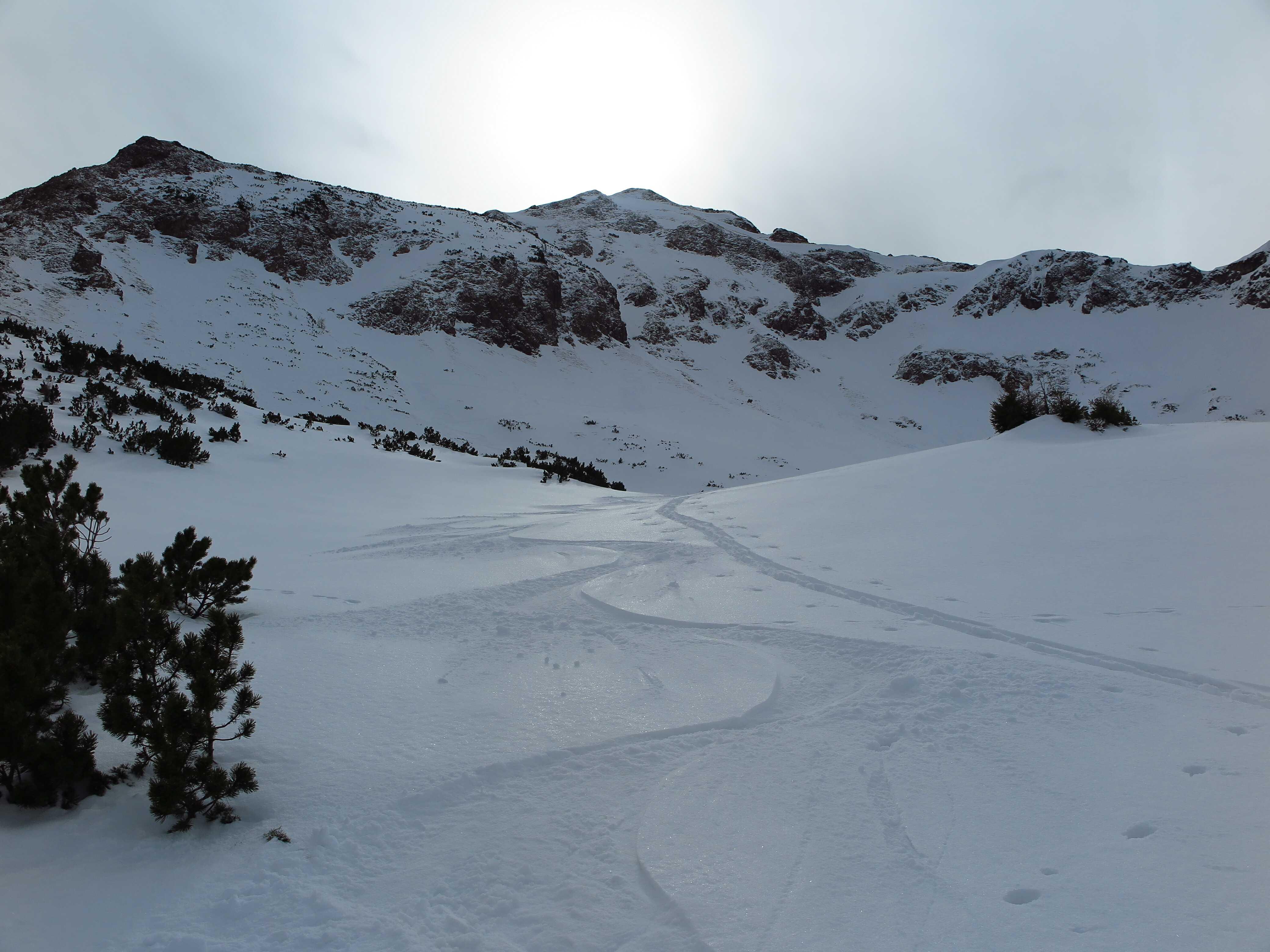 Schneelage: Wie überall, die üblichen wenigen cm Neuschneeauflage auf einem durchwegs tragfähigem Harschdeckel als Untergrund. Der Neuschnee rutschte beim Spuren oft recht leicht auf der Unterlage ab. Im unteren Teil war die Schneeauflage schon pappig, was zum Anstollen der Felle führte. Oben N-seitig noch schöne, pulvrige Auflage. Wer bei diesen Schneeverhältnissen nicht fahren kann, der lernt's wohl nie ;-).