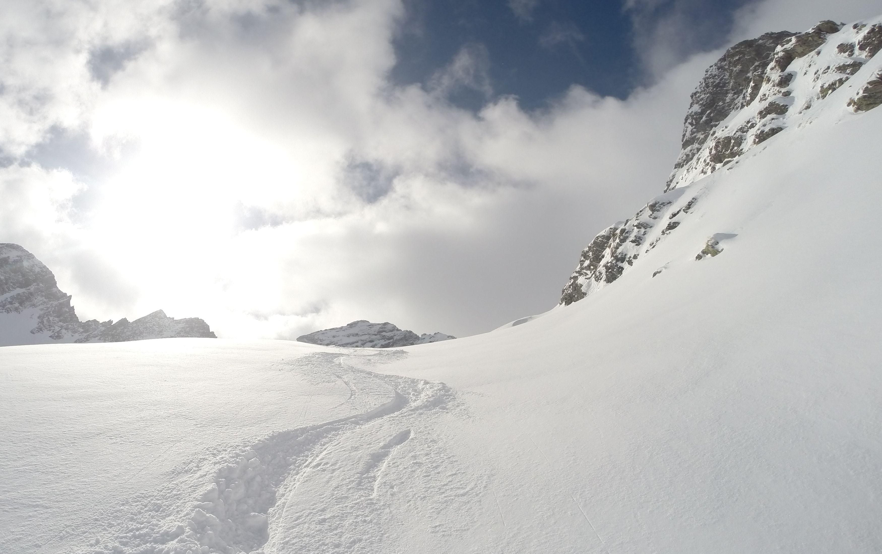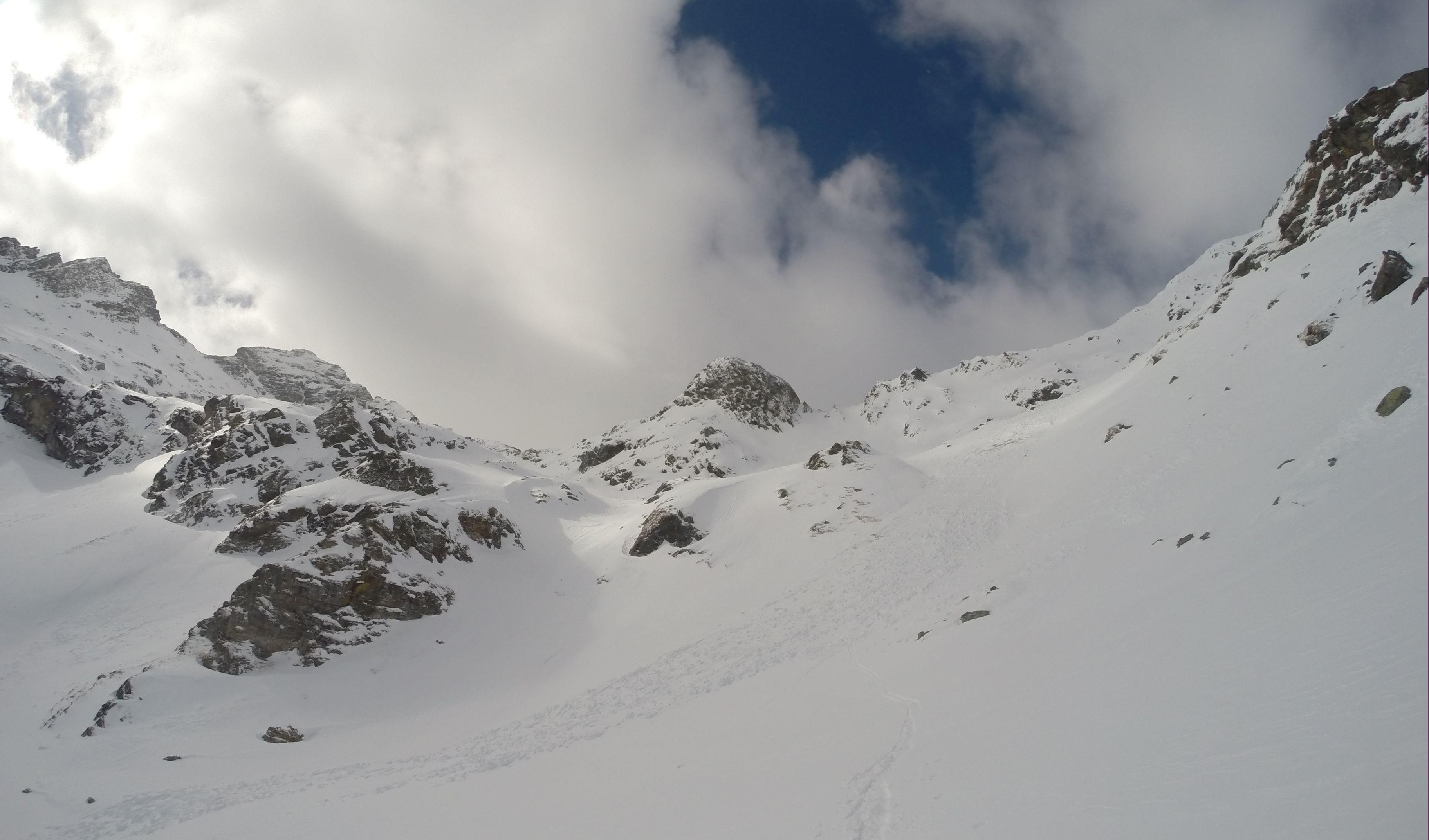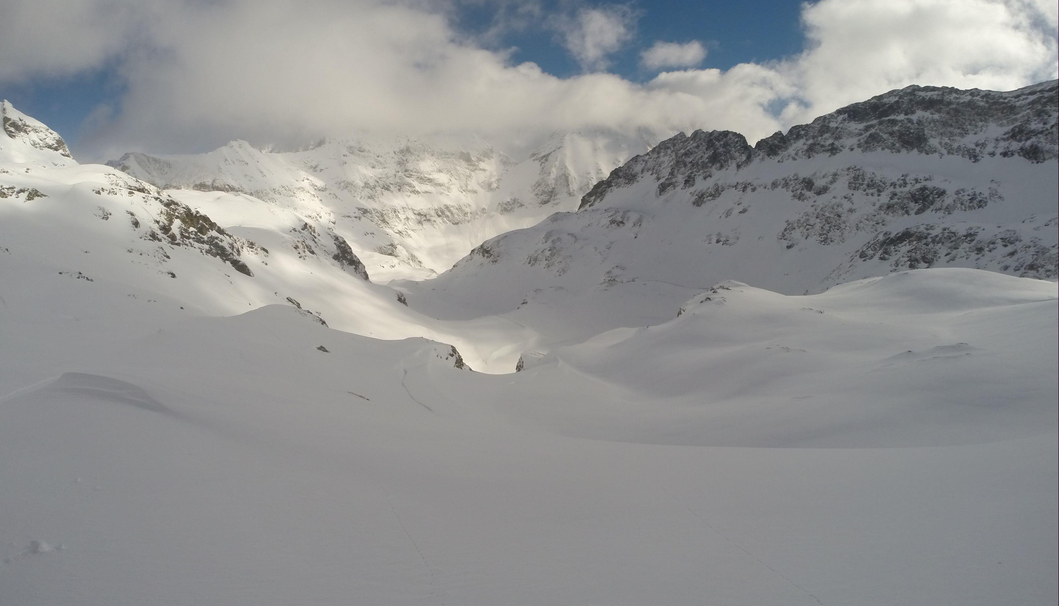 Schnee/Lawinen: vorgestern im Obertal hatte man schon die Auswirkungen von Regen und Temperaturanstieg sehen können das aus allen steilen Hängen sich die Lawinen entluden, so war ab Göriachwinkel dann ebenso, musste über einige Lawinenbahnen querren, jedoch waren diese jetzt sicher zugefroren bzw. mit ca. 20cm Neuschnee überdeckt. Meiner Ansicht nach bis auf paar einzelne Stellen wo der Nordföhn tätig war, hat der Neuschnee von ca. 20cm eine perfekte Bindung zur ehemals weichen Unterlage gebildet. Eine frische Lawine ging jedoch von der Gollingscharte ab, (leicht linker Hand von der normalen Aufstiegsspur)