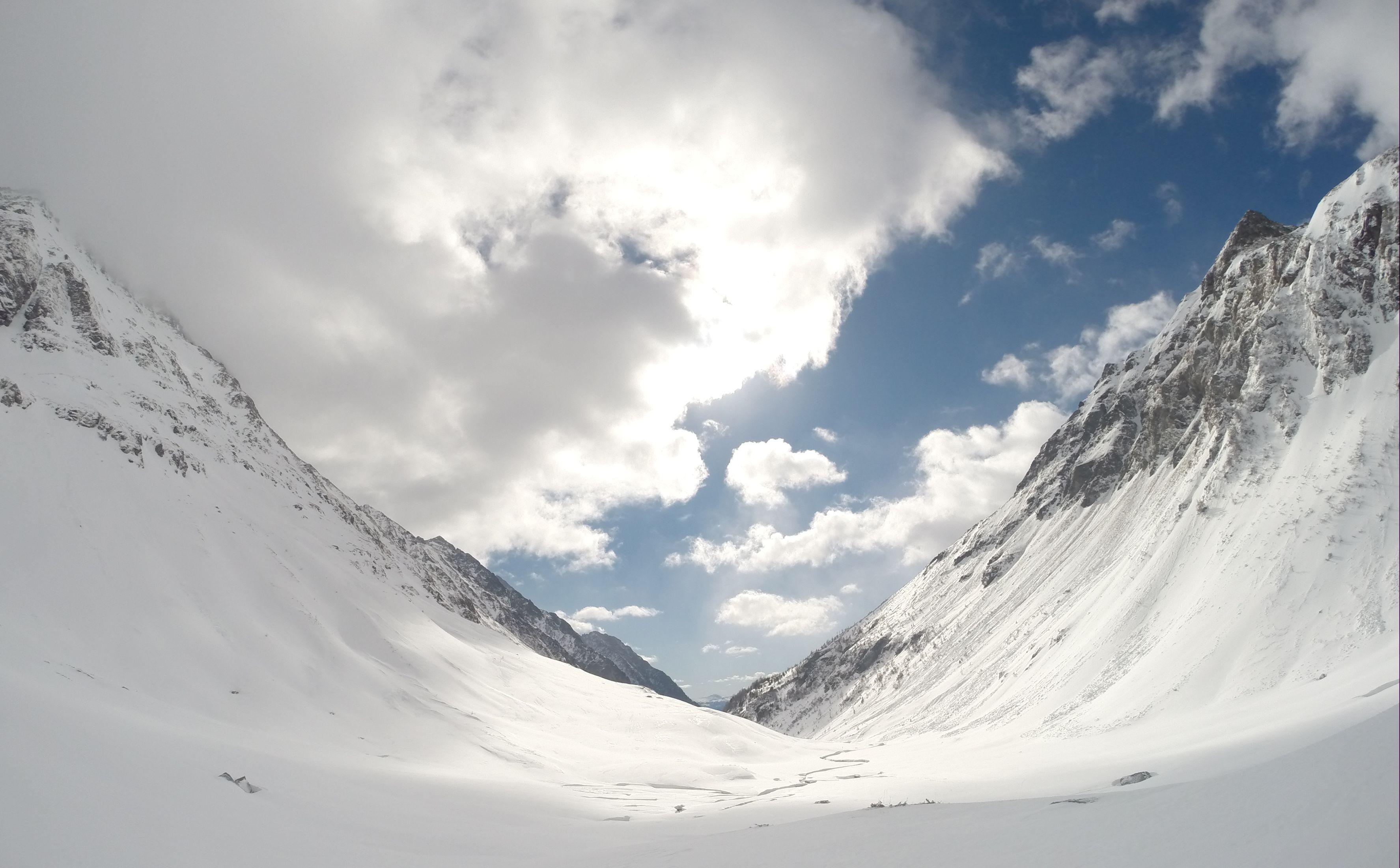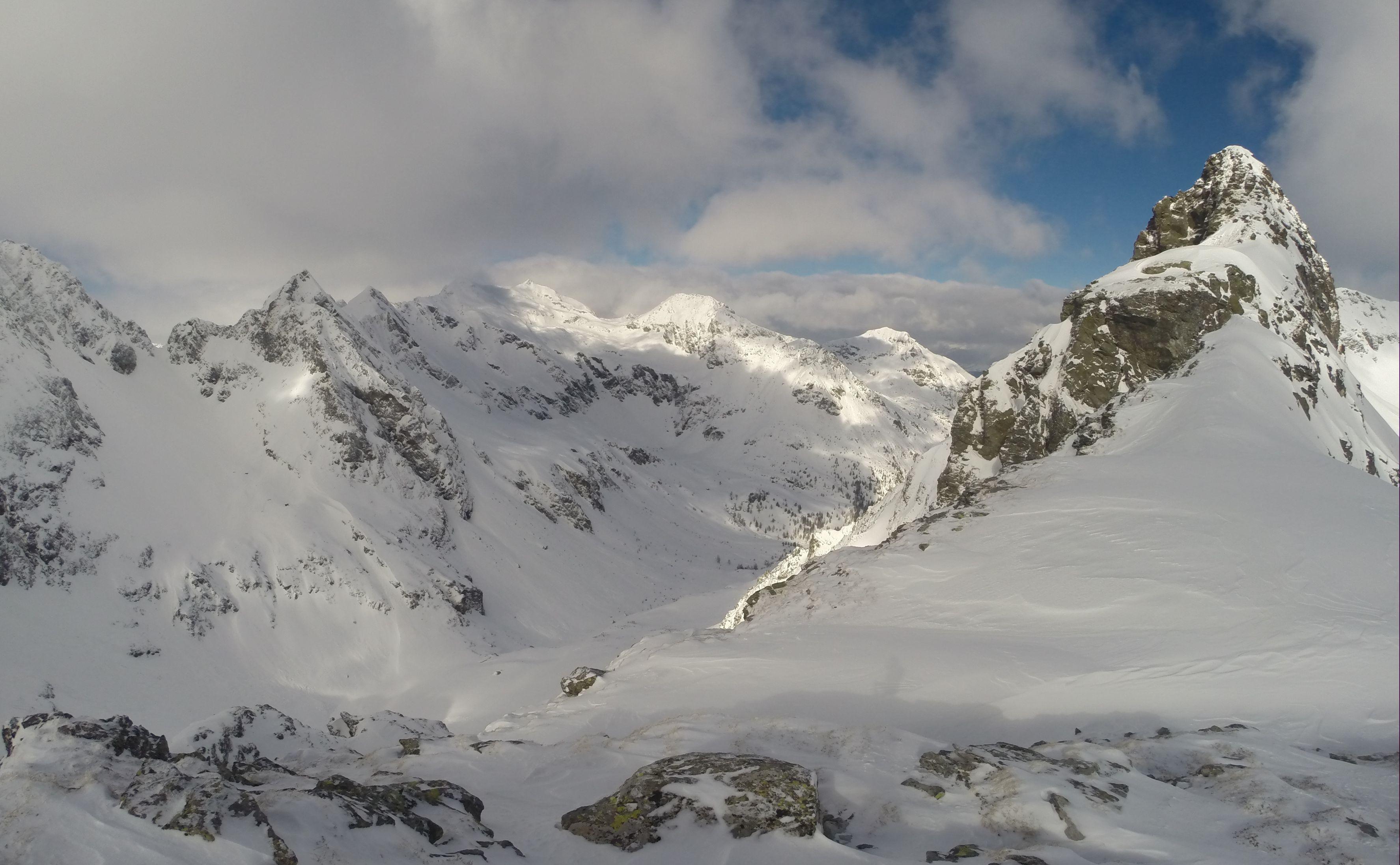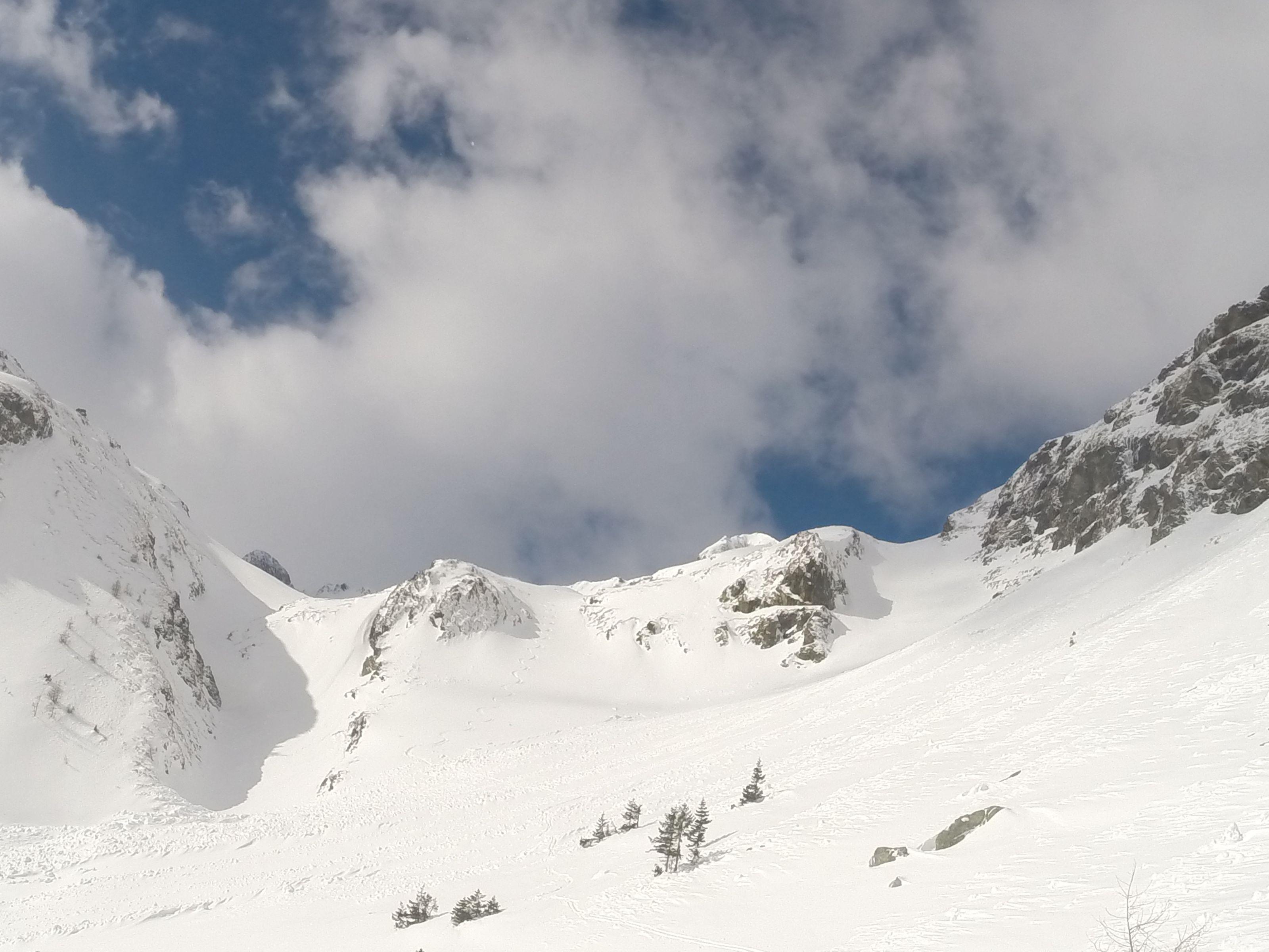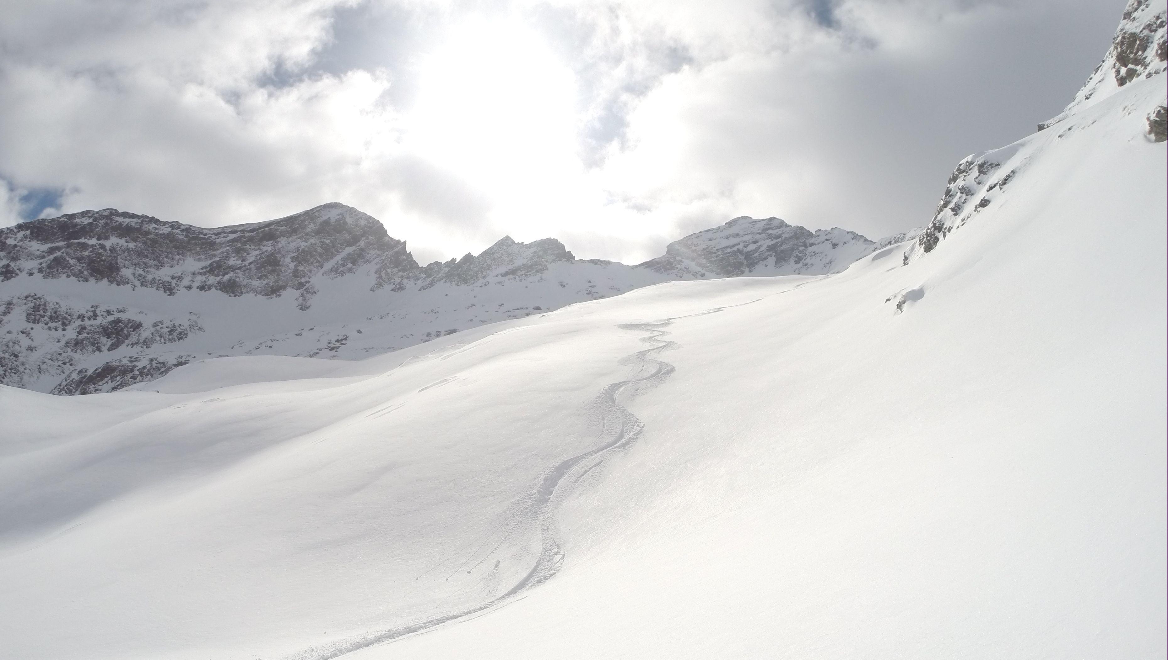 Schnee/Lawinen: vorgestern im Obertal hatte man schon die Auswirkungen von Regen und Temperaturanstieg sehen können das aus allen steilen Hängen sich die Lawinen entluden, so war ab Göriachwinkel dann ebenso, musste über einige Lawinenbahnen querren, jedoch waren diese jetzt sicher zugefroren bzw. mit ca. 20cm Neuschnee überdeckt. Meiner Ansicht nach bis auf paar einzelne Stellen wo der Nordföhn tätig war, hat der Neuschnee von ca. 20cm eine perfekte Bindung zur ehemals weichen Unterlage gebildet. Eine frische Lawine ging jedoch von der Gollingscharte ab, (leicht linker Hand von der normalen Aufstiegsspur)