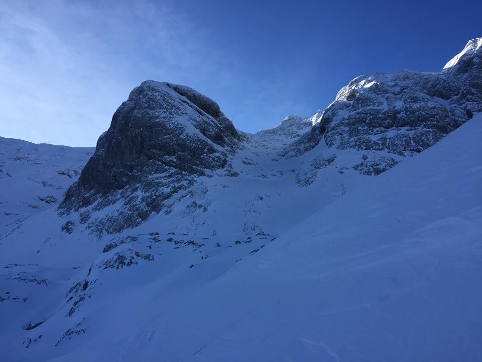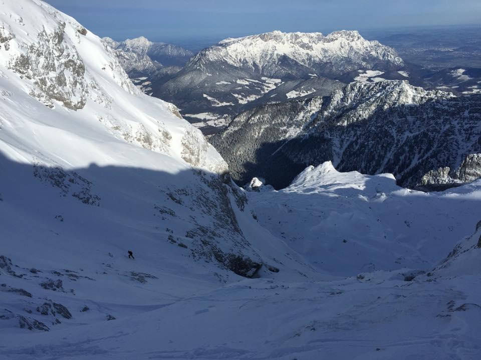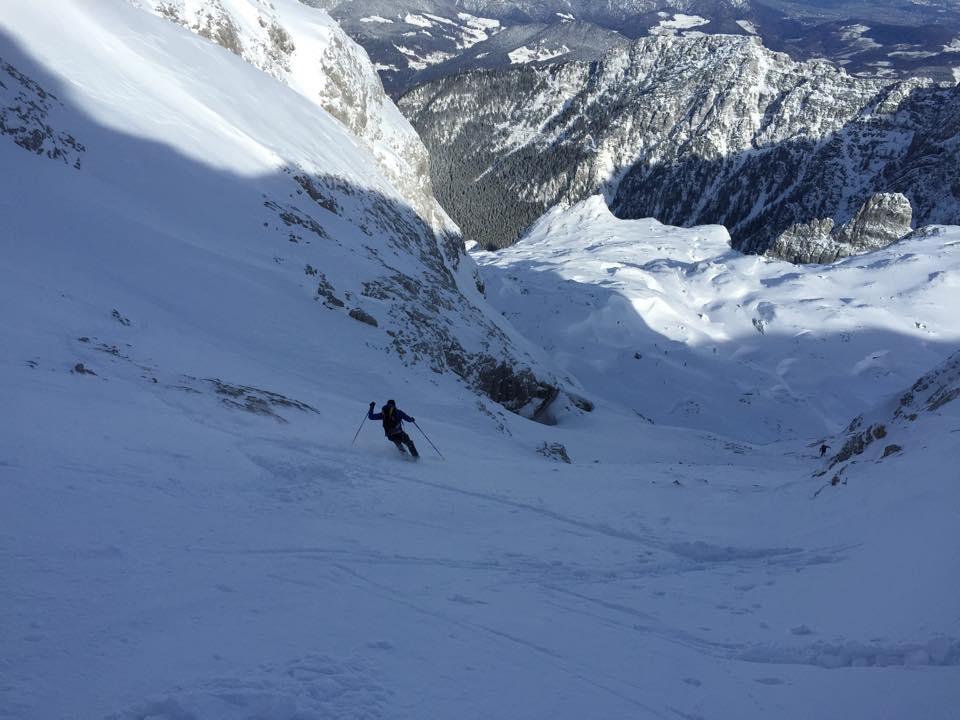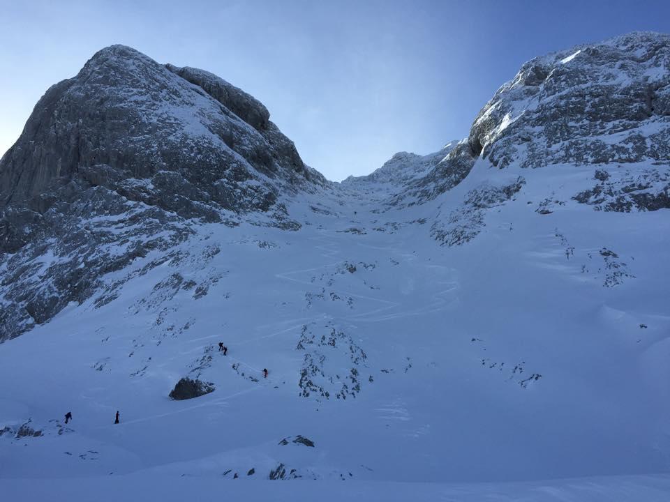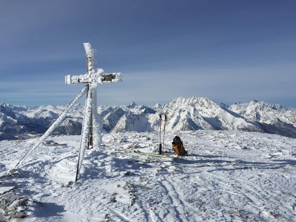 Verhältnisse: Im Alpltal 10-15 cm Pulverschnee. In der Rinne zum Gipfel starkt wechselden Verhältnisse. Teileweise windgepresst. Am Gipfel abgeblasen. Abfahrt bis zum Klettersteig möglich.