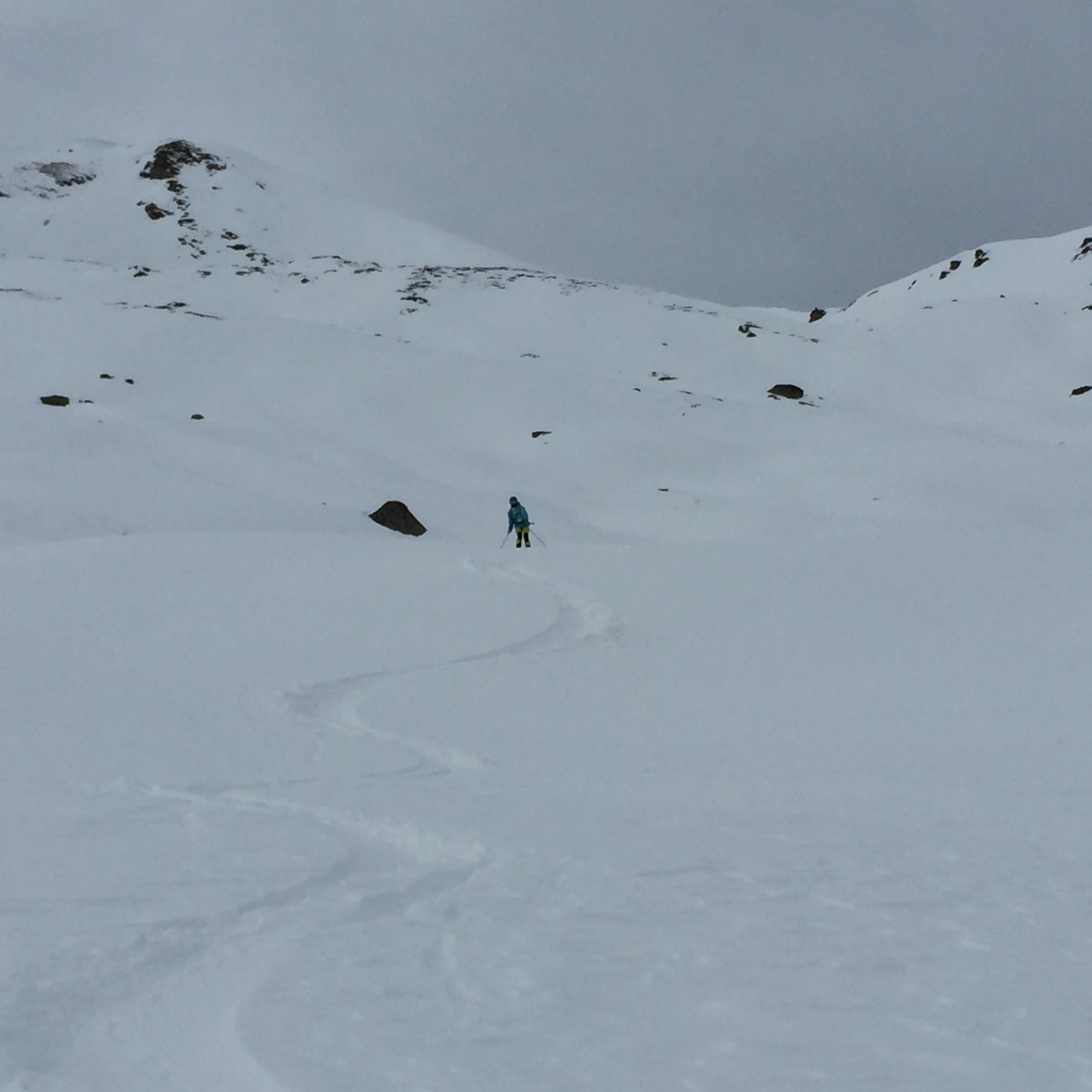 ..... so oder ähnlich sagen die Pinzgauer zum Baumgartgeier - verzeiht´s ma´s, wenn´s net ganz korrekt ist.... jedenfalls durch unsere geniale Tour am Freitag auf den Ronachgeier und von den Bildern von Dieter vom Samstag motiviert, ließen wir uns heute vom Winde nicht verwehen und folgten den noch spärlich sichtbaren Spuren. Der Föhn hat ganze Arbeit geleistet und das Pülverchen von gestern wieder ein Stück mehr verfrachtet. Die Einfahrt vom Gipfel in das Geierkar windgepresst, hart aber griffig. Die spiegelnden Gleitschichten vom Samstag vom Wind aufgerauht, und doch lassen sich noch ein paar flizige Lockerschnee - Flecken finden. Die Hänge unterhalb des Geierkars runter zu den Almhütten bieten noch Skigenuss vom Feinsten, sofern du die mit feinen Windgangeln versehene Schneedecke zwischen den Harschdeckeln als Powderline entdecken kannst.