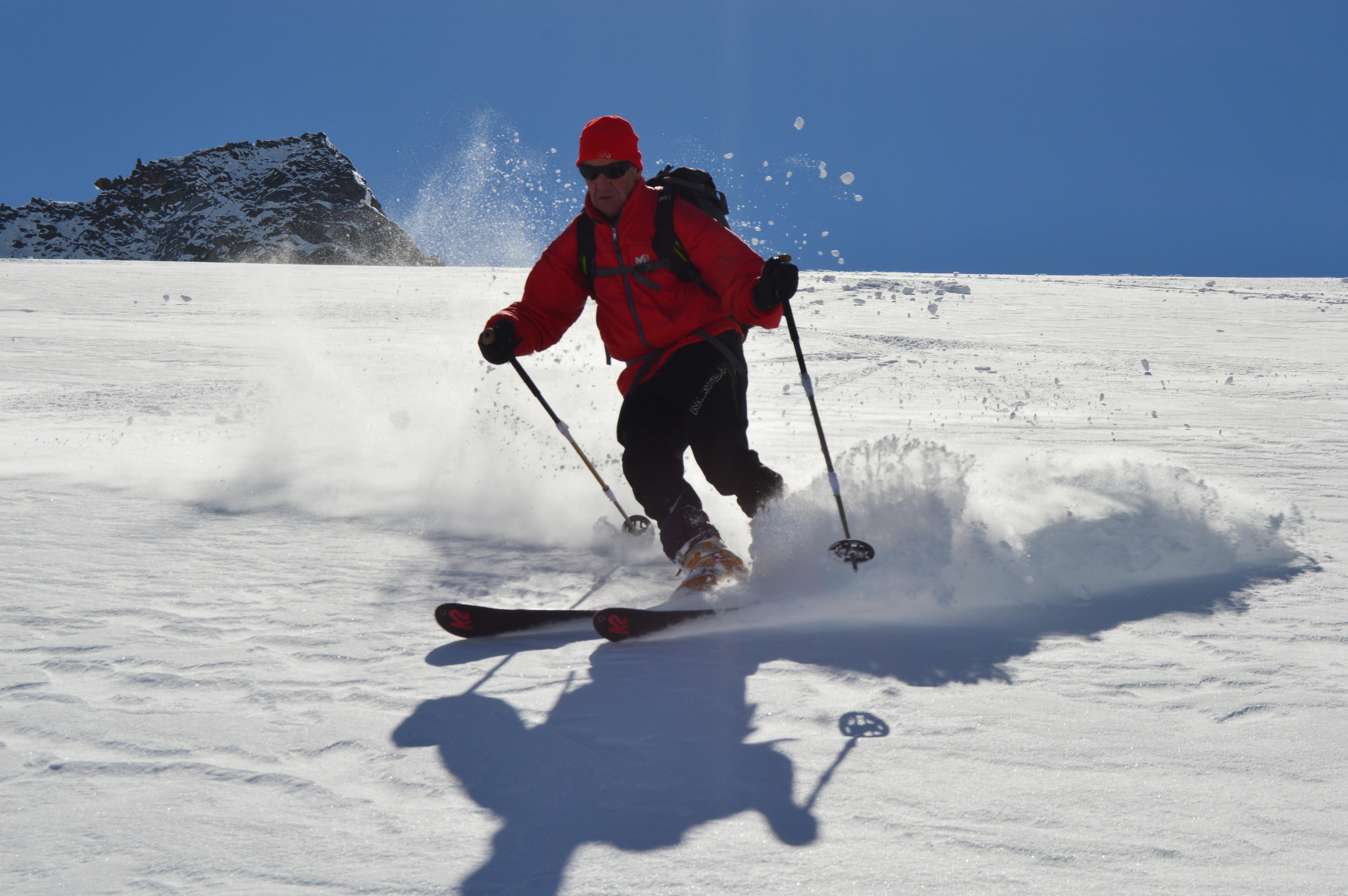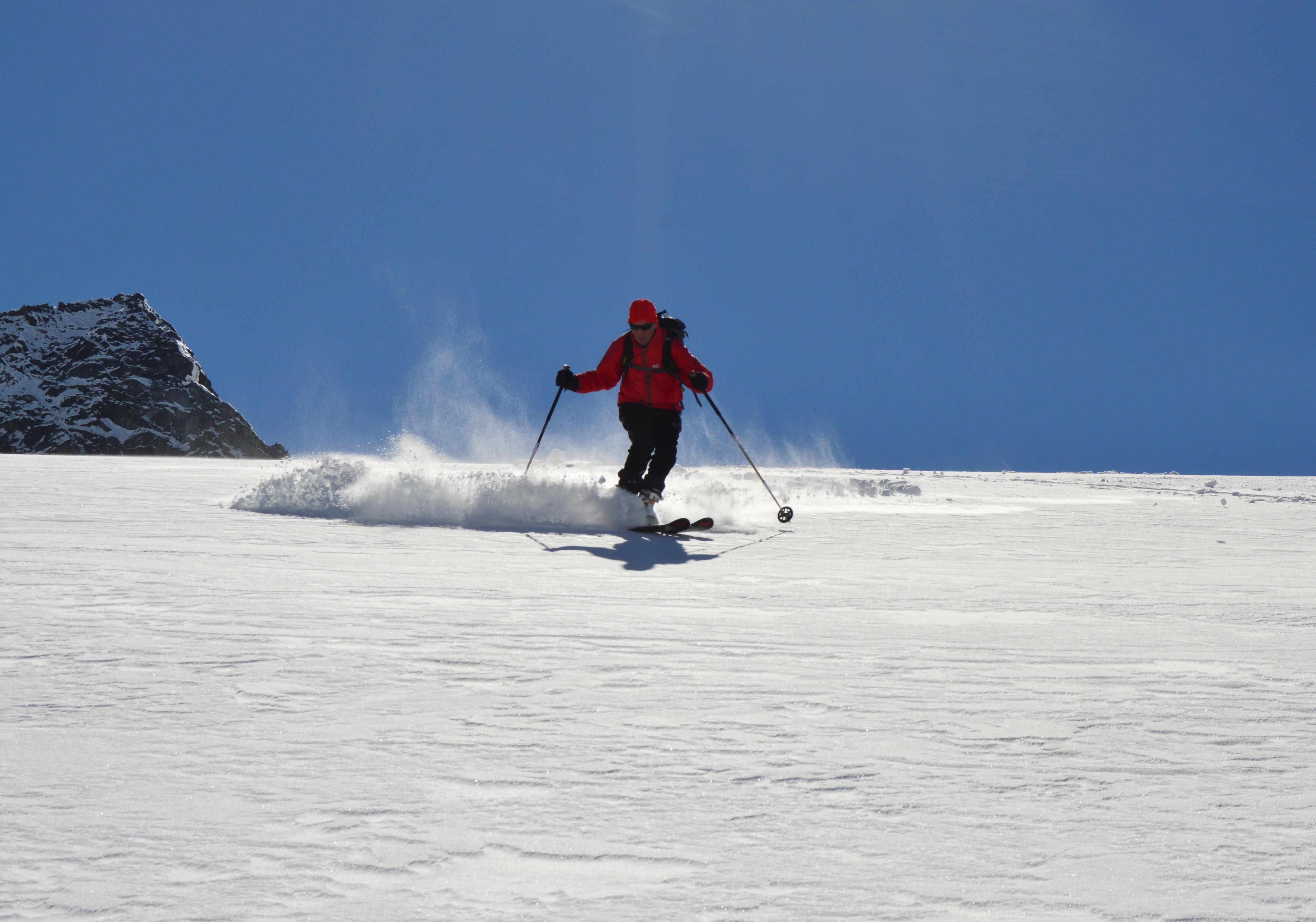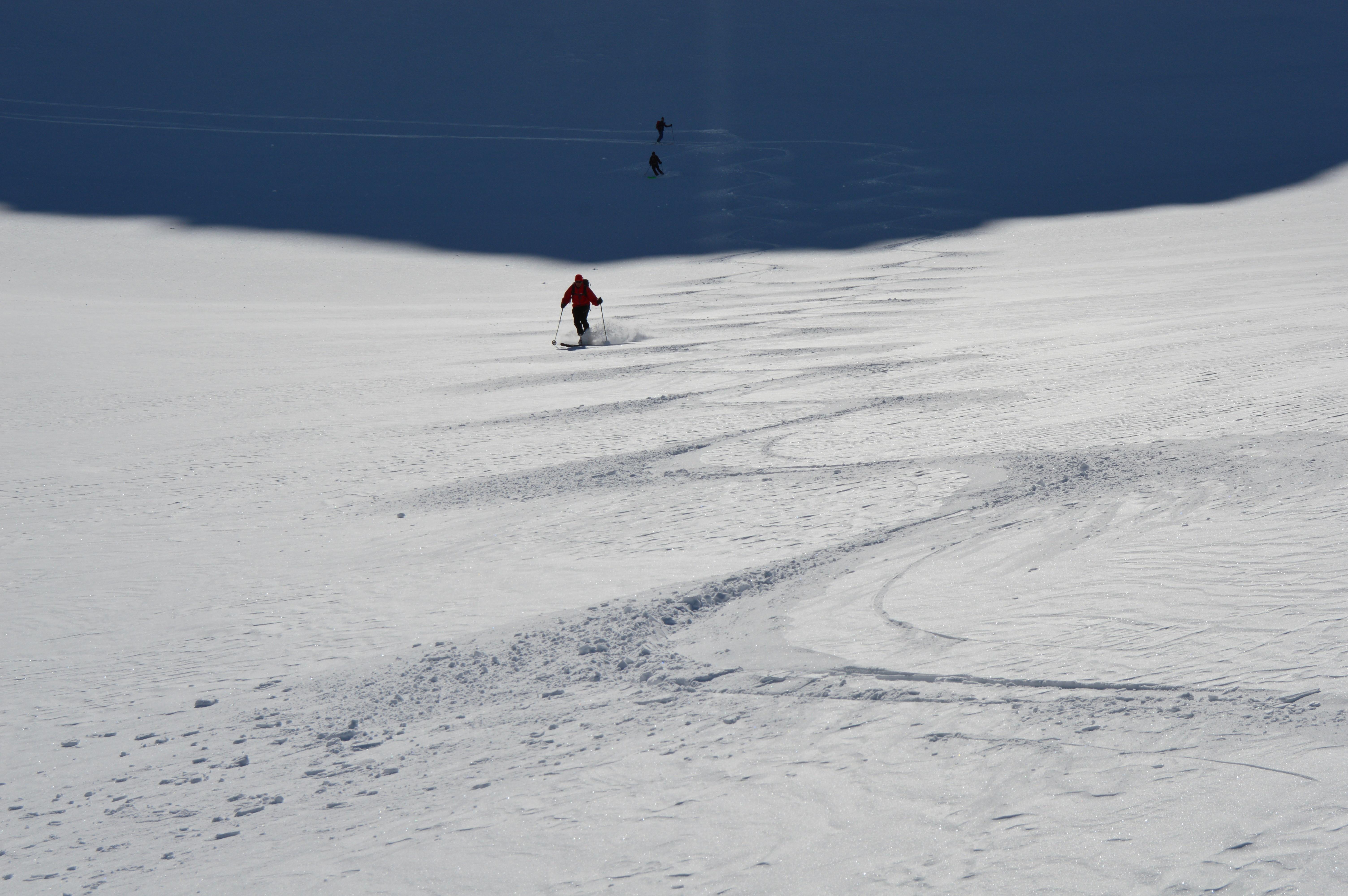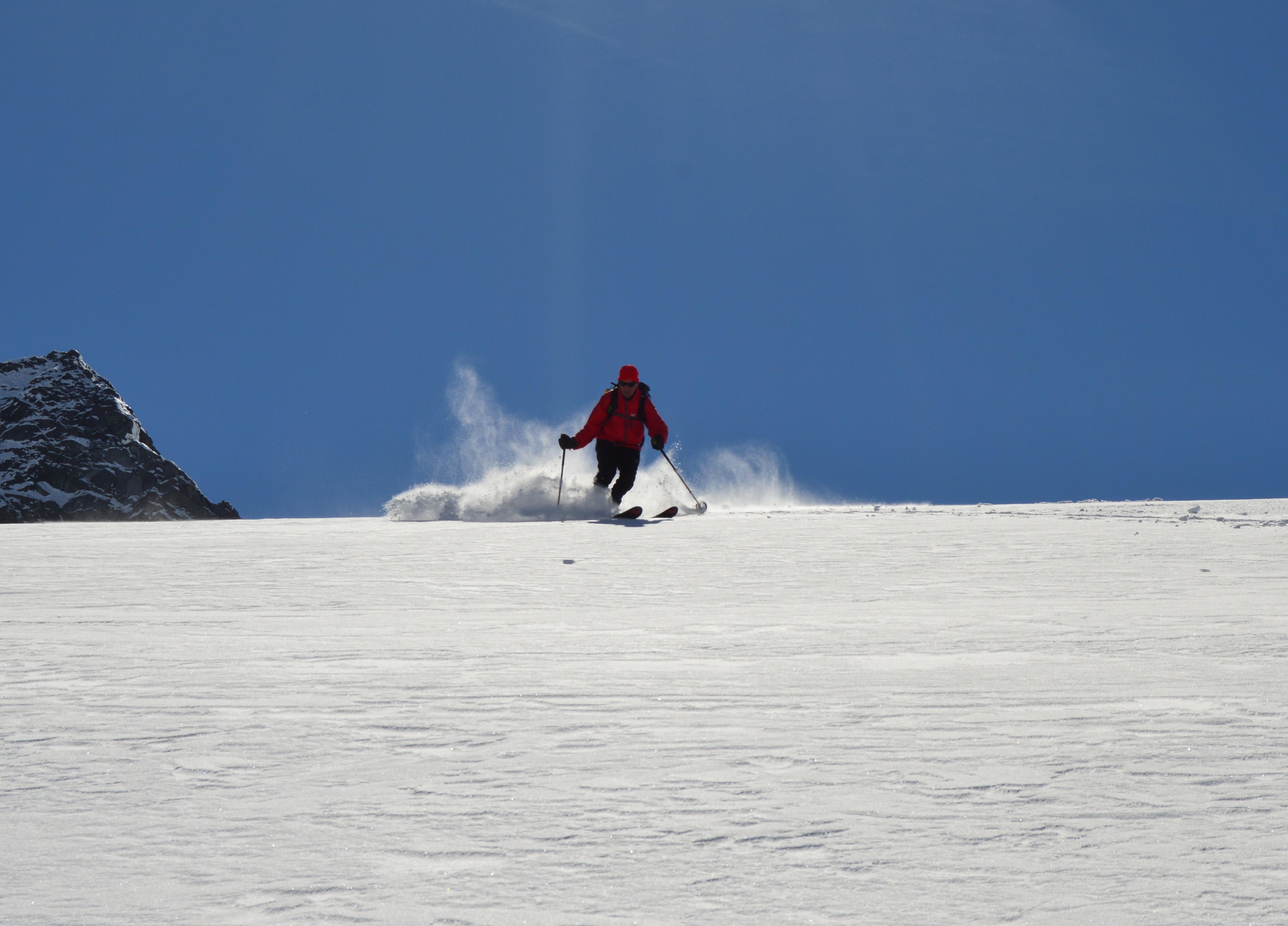 Die Tour ist noch vom Breitlahner weg mit Schi (bis auf 2-3 ganz kurze Unterbrechungen) möglich. Was allerdings die Erleichterung durchs Bike noch nicht möglich macht. Der Pulverschnee ging allerdings nur bis ca. 2200m runter. Der Wind hat vor allem unterhalb der Scharte deutliche Spuren hinterlassen. Unterhalb der Gletscherzunge war sportliches Wedeln im Bruchharsch angesagt.