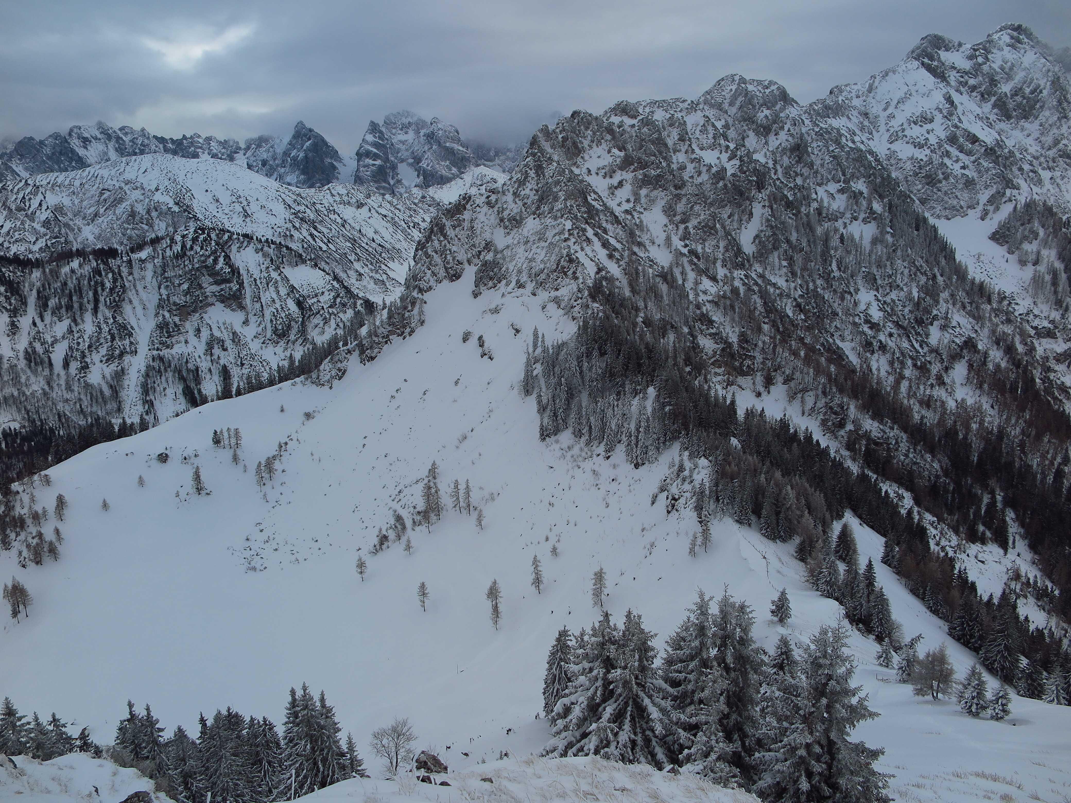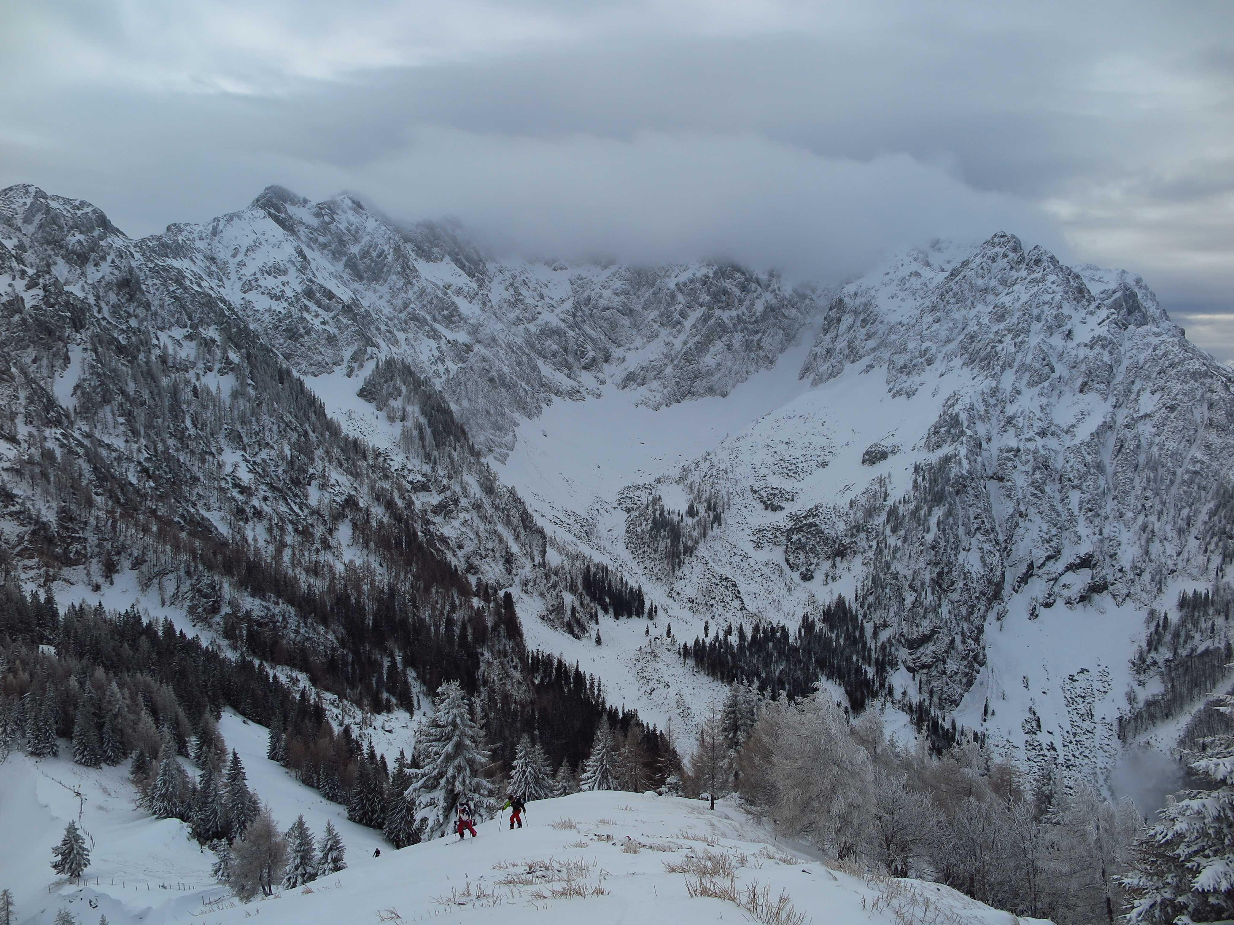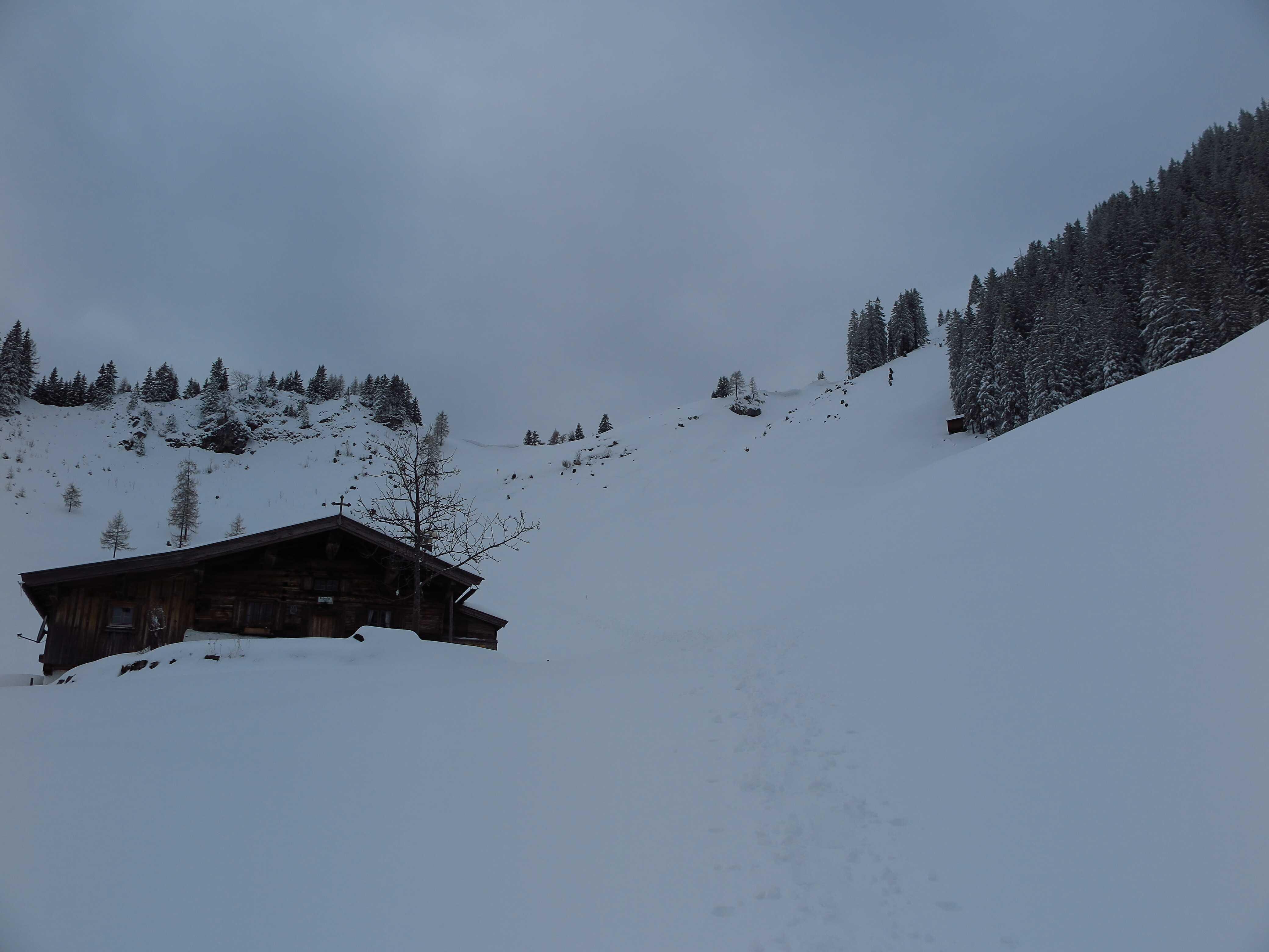 Schneelage: Im Tal ca. 10cm Pappschnee auf etwas alter Unterlage; Forststraßenabschnitt im Wald hat gerade ausreichend Schnee um abzufahren; Almwiesen haben ausreichend Schnee mit etwas Unterlage; Neuschneeauflage bis oben auf ca. 30-40cm Pappschnee ansteigend; Schneehöhe teils sehr unterschiedlich, je nach Windeinwirkung; Waldabfahrten nicht sinnvoll möglich; Pulver nur in den obersten ca. 100 Hm. Pappschnee war aber ganz gut fahrbar, bei Umsicht keine Steinberührung.