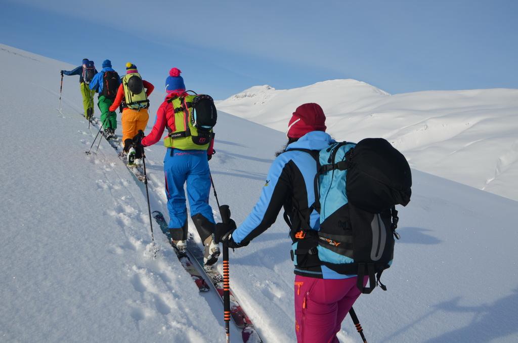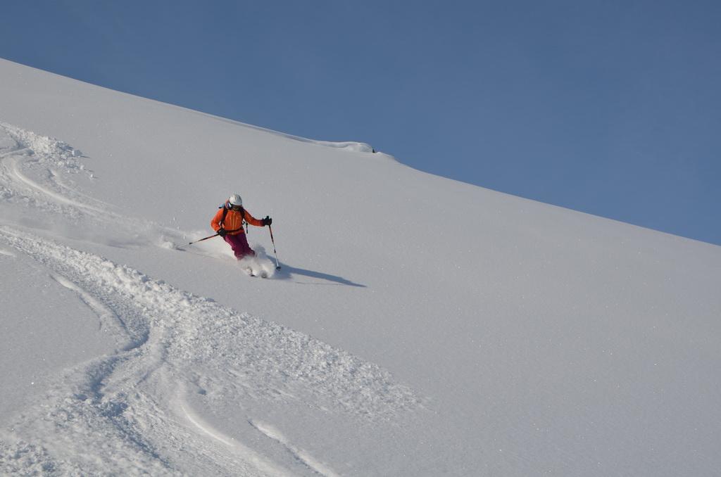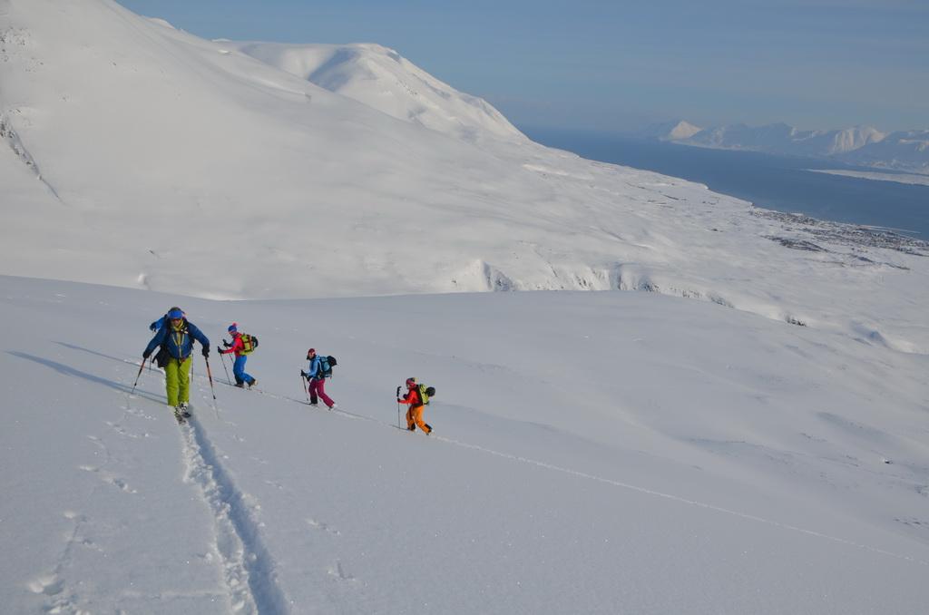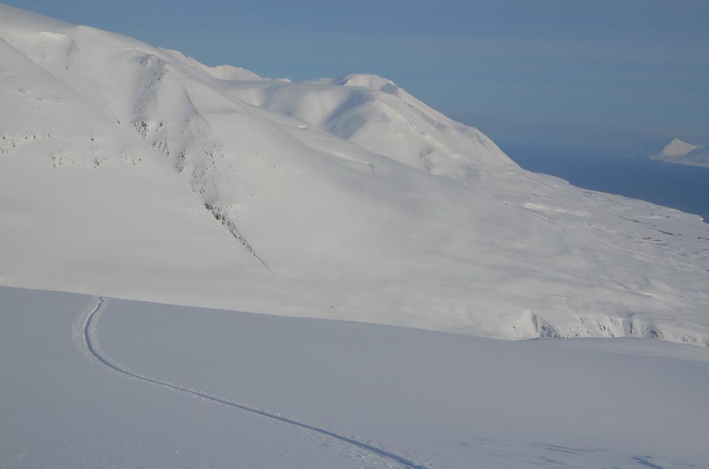 Ein weiterer und leider der letzte unserer Schitourengipfel hier in Iceland. Bei perfektem Wetter und Traumpulver auf einen Gipfel mit perfektem Schigelände, Platz ohne Ende und bei der Abfahrt immer das dunkelblaue Meer vor Augen. Leider hatte es hier die meiste Zeit Stufe 4 und so waren die steilen Sachen Tabou für uns. EIne Woche lang einfach Schitouren zum geniessen neigt sich zu Ende mit dem einstimmigen Feedback von allen dass es nicht das letzte mal Iceland war.