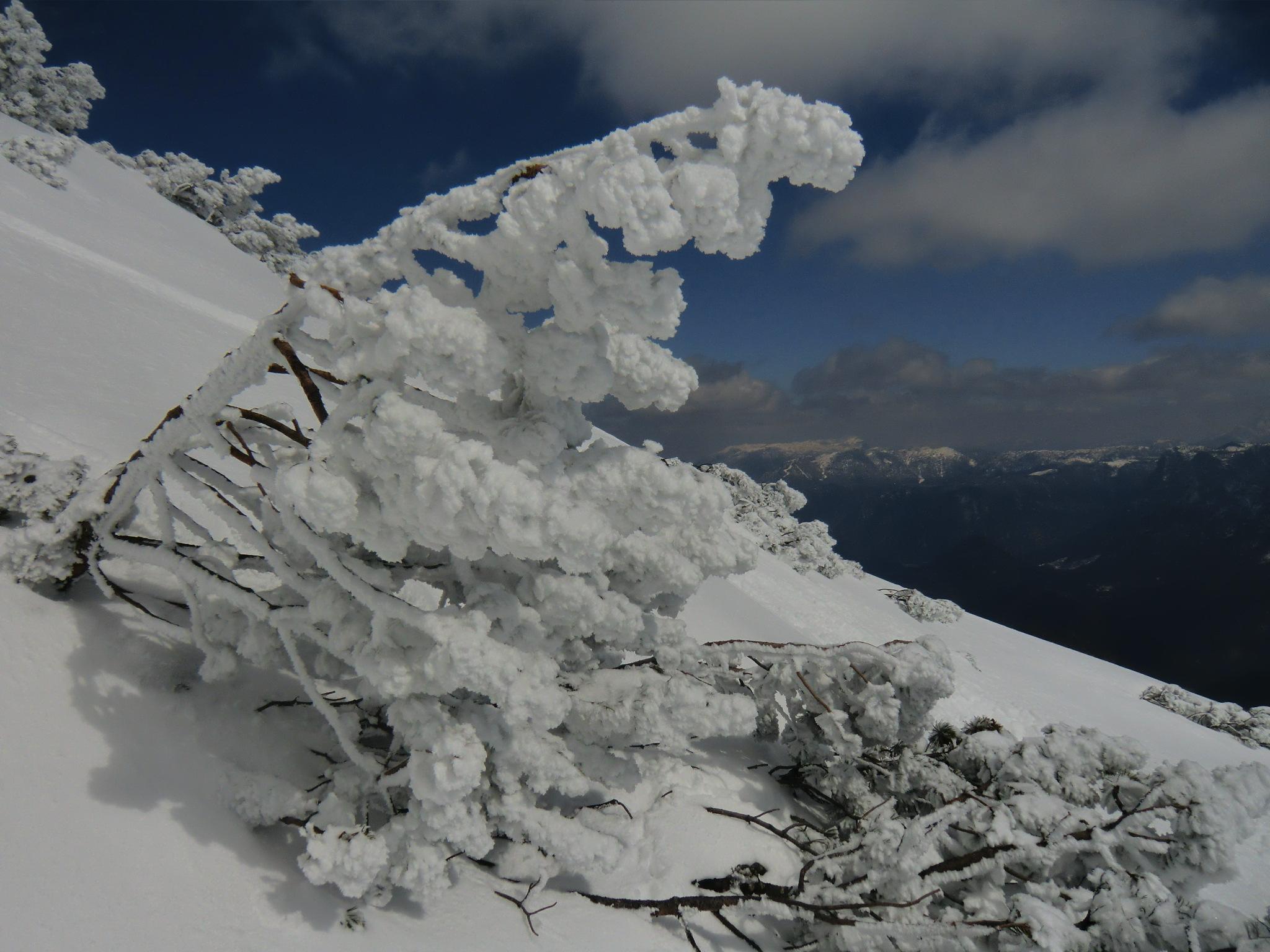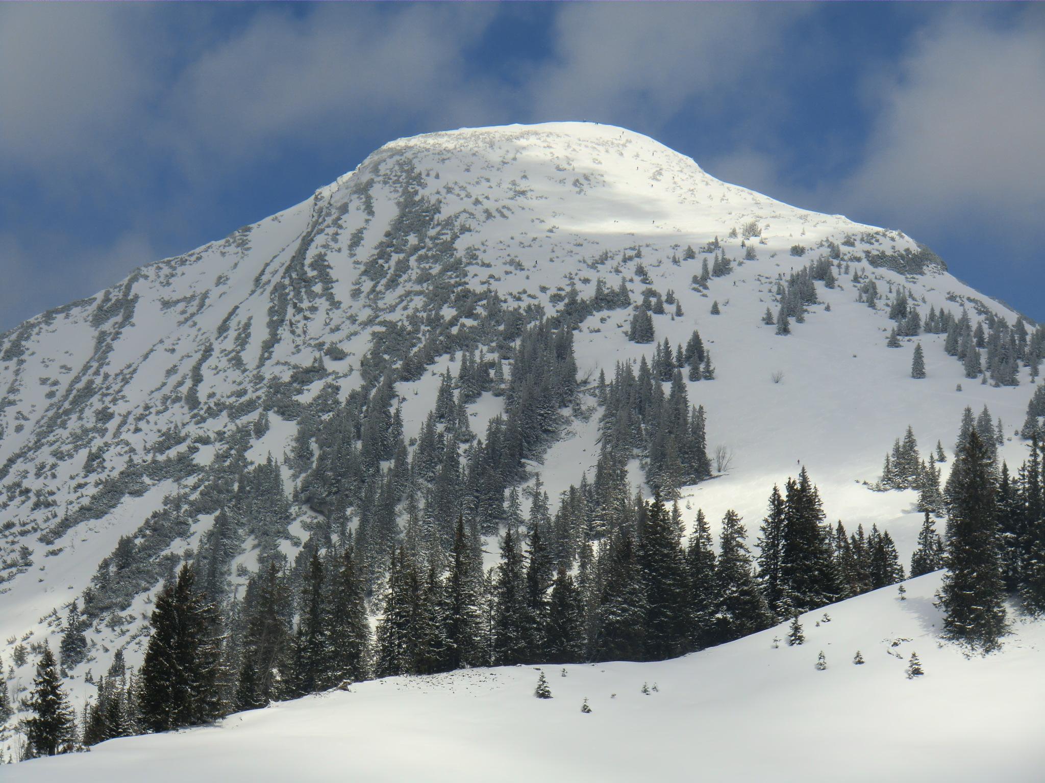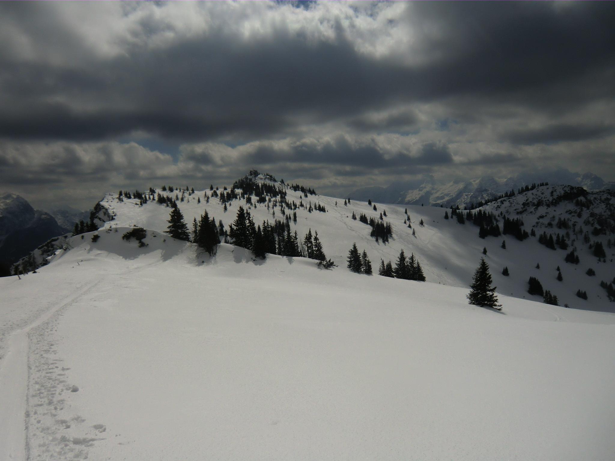 Nach dem Heutalbauer über die Brücke des Lahnersbach (1084m) schattseitig rechts davon geht es von der Reichenhaller Skihütte weg noch ohne abzuschnallen. Der Sommerweg links der Bachseite ist ausgeapert. 10-15 cm Neuschnee auf Harsch, schattseitig pulvrig, sonnseitig angewärmt. Wetter ab Mittag zunehmend sonnig, schwacher Wind aus Süd. Der Anraum an den Latschen u. Bäumen vermittelte einen hochwinterlichen Eindruck.