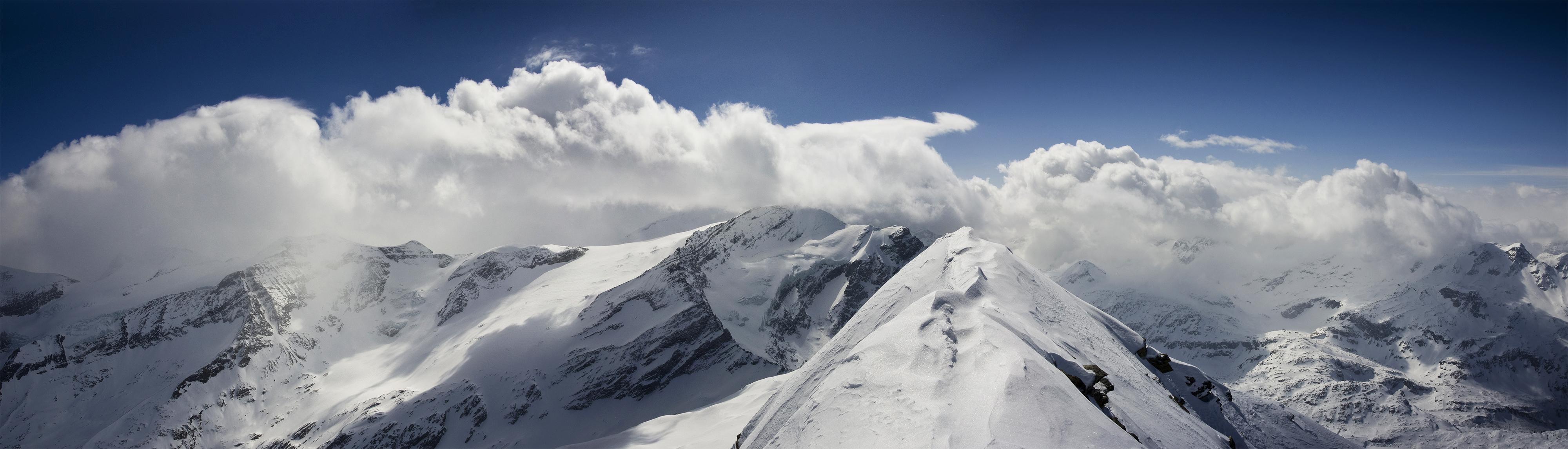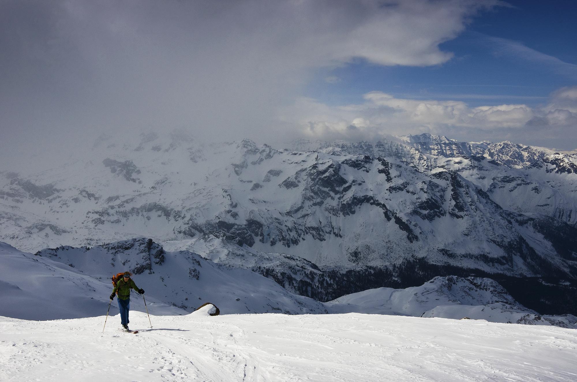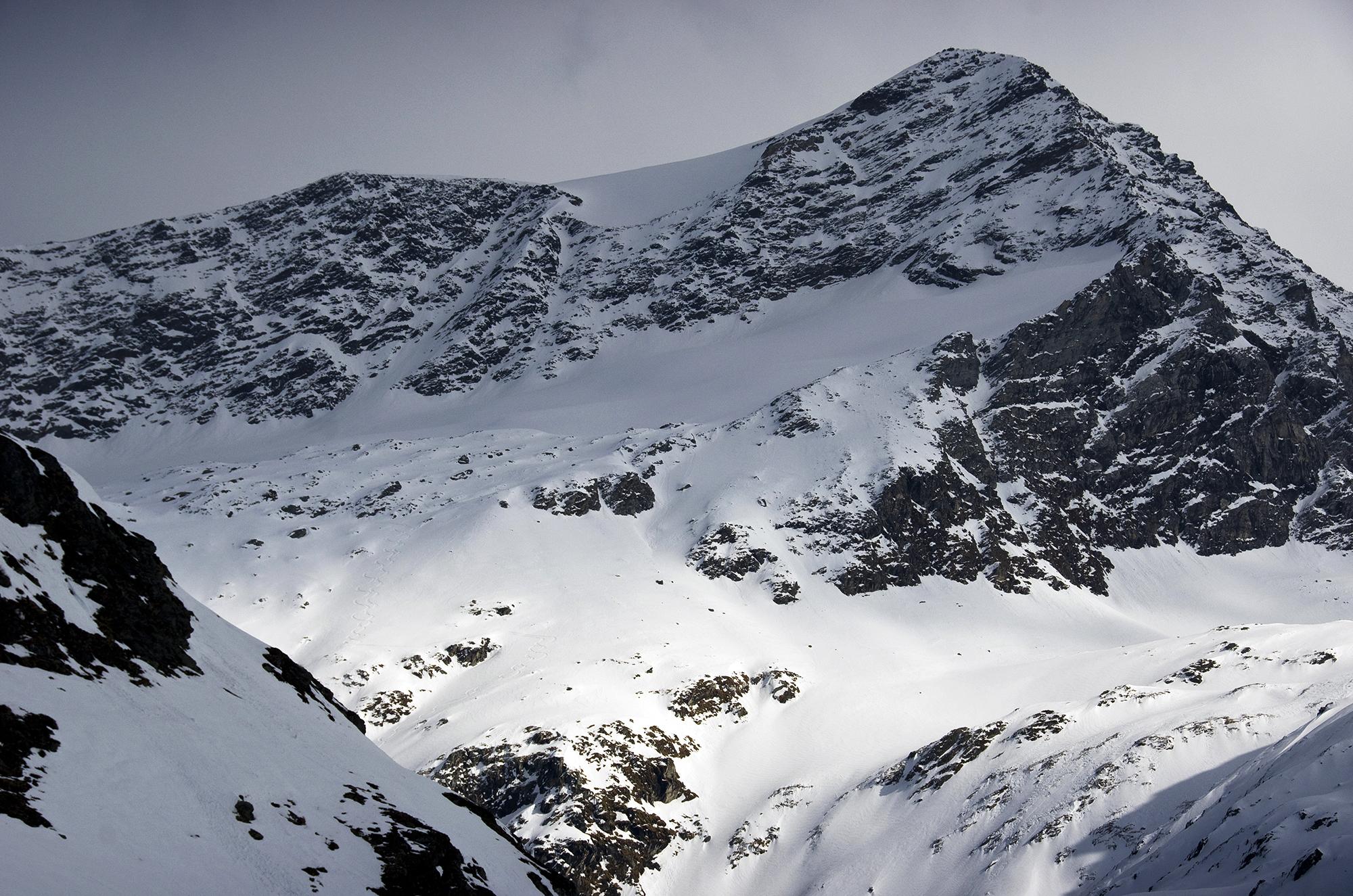 Es war nicht allzu stürmisch, und abgesehen von einem Flockenwirbel unter dem Gipfel hatten wir Sonnenschein. Granatspitze und Stubacher Sonnblick waren meist in der Wolkenwand verschwunden. Auf dem Oberen Kees gab es schon sehr windbehandelten, aber noch gut fahrbaren Pulverschnee.