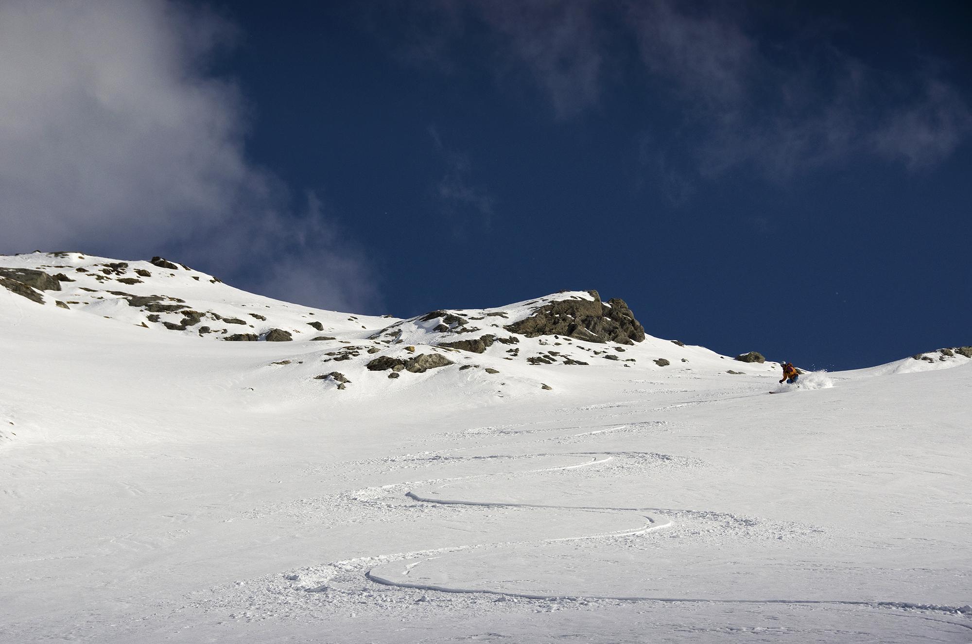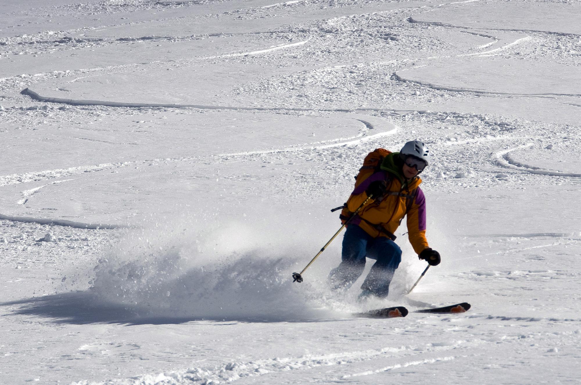 Es waren sicher an die 20 Tourengeher vor uns oben, aber es findet sich immer noch genug unverspurter Pulverschnee in der Steilstufe ab dem unteren Hocheiserkees. Die meisten fahren weiter nördlich auf eingefahrener Route. Mein Tipp: Von unten beim Aufstieg schon aussuchen, welche Rampe und Rinne man abfahren möchte.