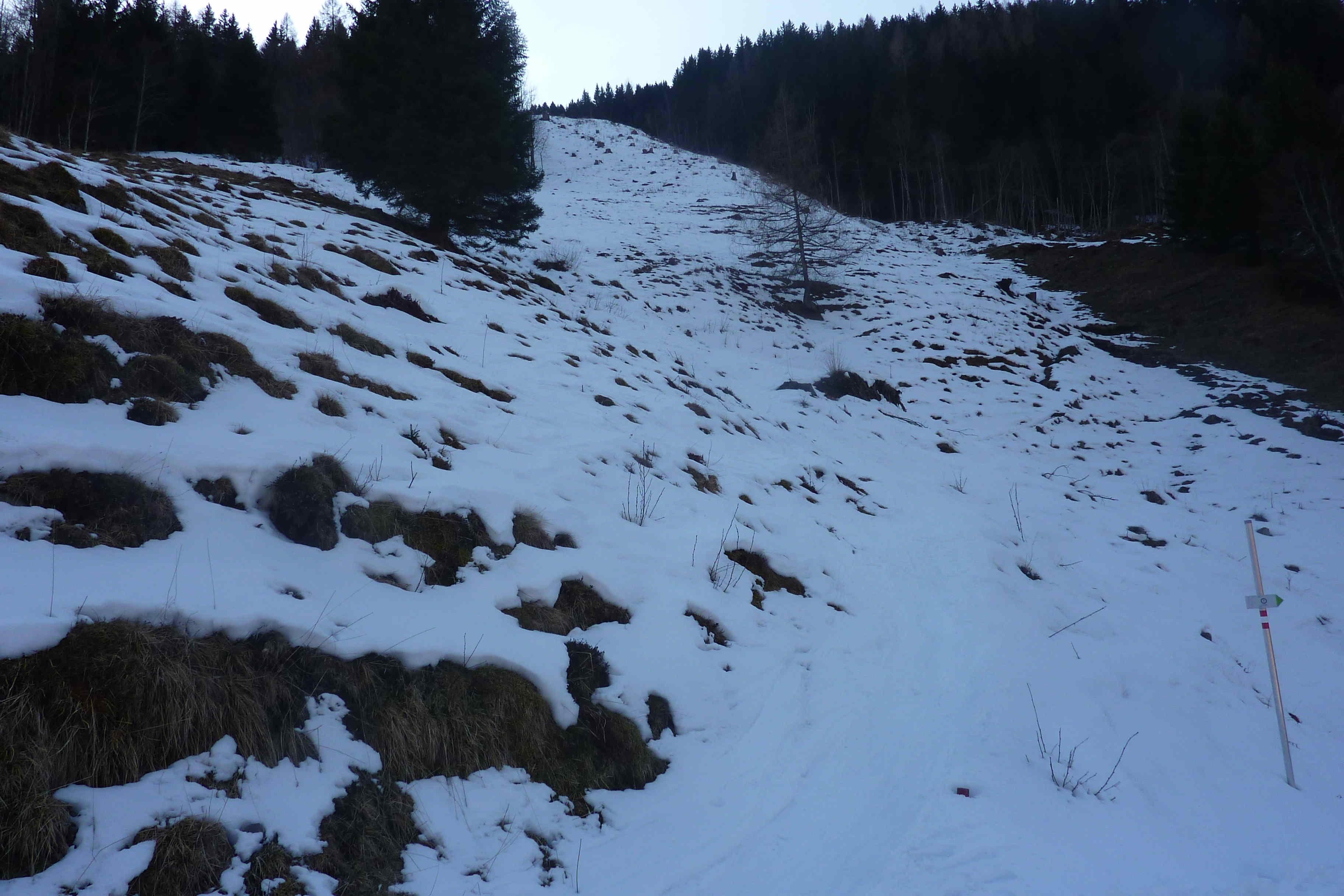 Somit war jede Menge Platz, um eine eigen Spur im schönen Pulverschnee zu ziehen. Dieser war schon am Gipfelhang sehr gut zu fahren, Traumpulver gab es dann nach der Scharte beim Rosskopf - auch noch im Waldbereich bis zum Flachstück vor der Hinterjudendorferalm. Was Vormittags in der Sonne war, war jetzt im Schatten und daher etwas schnittig zu fahren. Deshalb bin ich auch ab der Alm auf der Straße geblieben, die bis ca. 200Hm vorm Parkplatz durchgehend befahrbar war. Die 25 min (sehr gemütliches) zu Fuß gehen haben den schönen Tourentag nicht beeinträchtigen können. Aber das Tragestück wird sich bei den vorhergesagten Temperaturen der nächsten Tage wohl rapide verlängern.