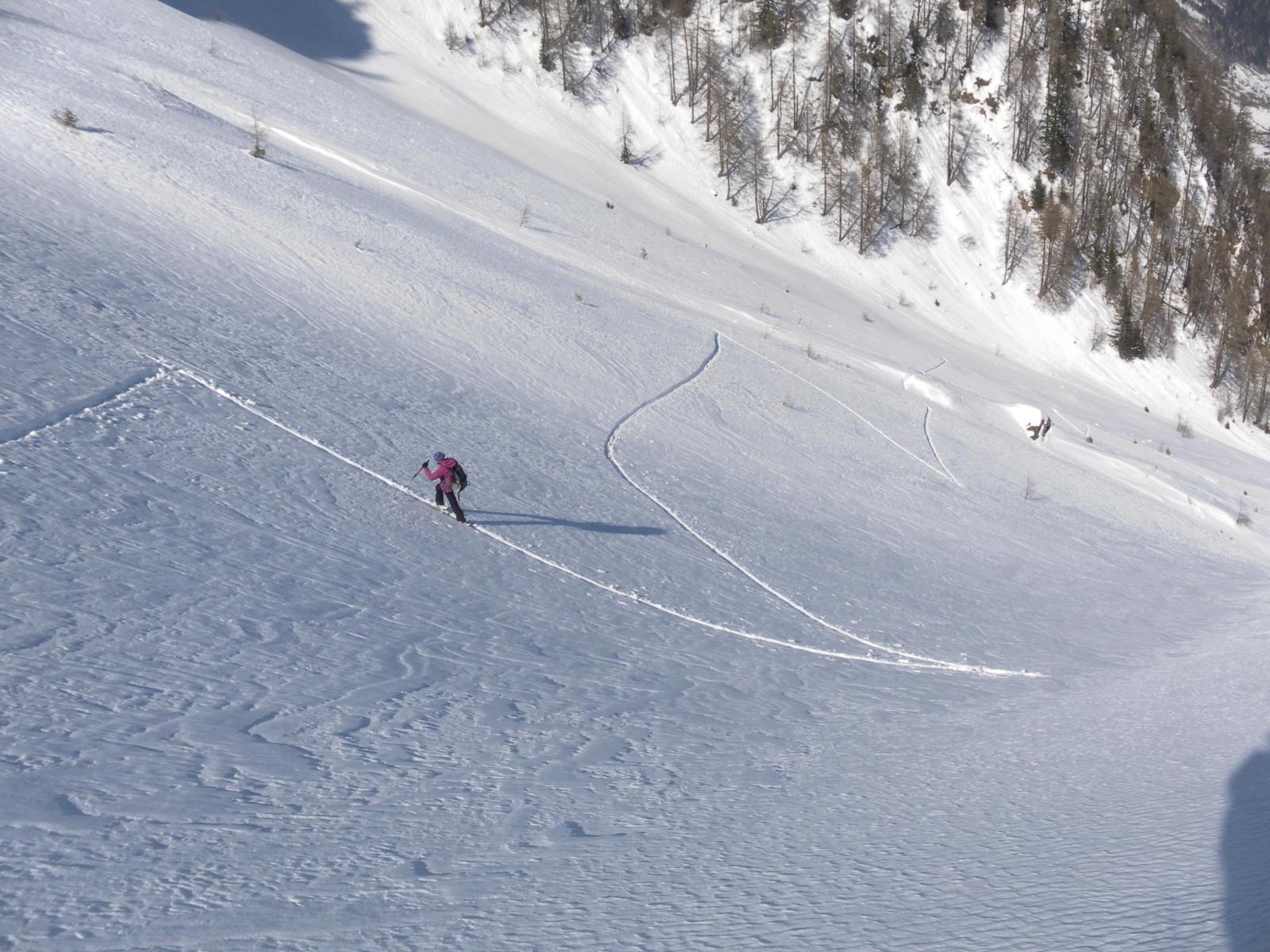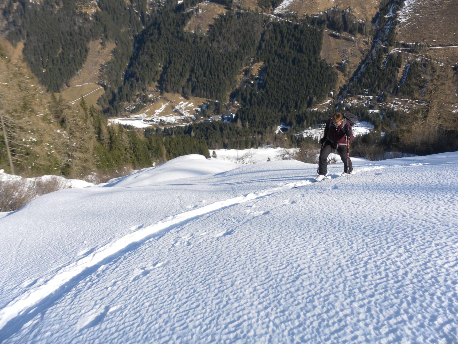 Von Bad Fusch bis zum Gipfel durchwegs aufbauend umgewandelter Schnee - im Staudenkar nicht tragend und ungebunden, lästig sowohl im Aufstieg wie bei der Abfahrt - ab dem freien Kar wie gebundener Pulver wirkend, aber auch plattige Verdichtungen sind vorhanden. Obwohl keine Lawinen oder deren Vorzeichen erkennbar sind (wenige kleine alte Neuschneerutscher aus felsigem Steilgelände schon), hätte ich lokal die Lawinengefahr im Gegensatz zu den im Forum üblichen Herabsetzungen eher höher als die heute ausgegebene LWS2 eingeschätzt - nahe an der STOP-Entscheidung.