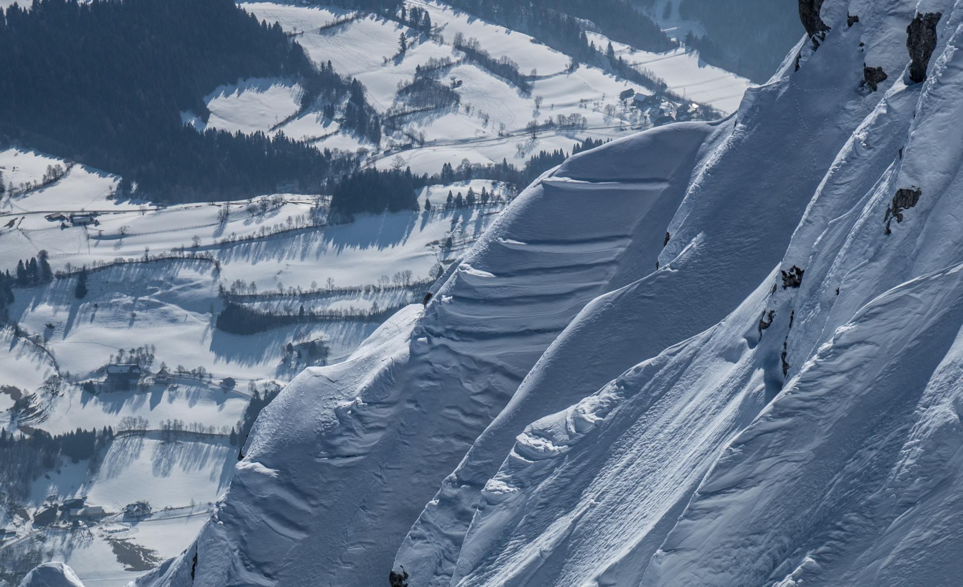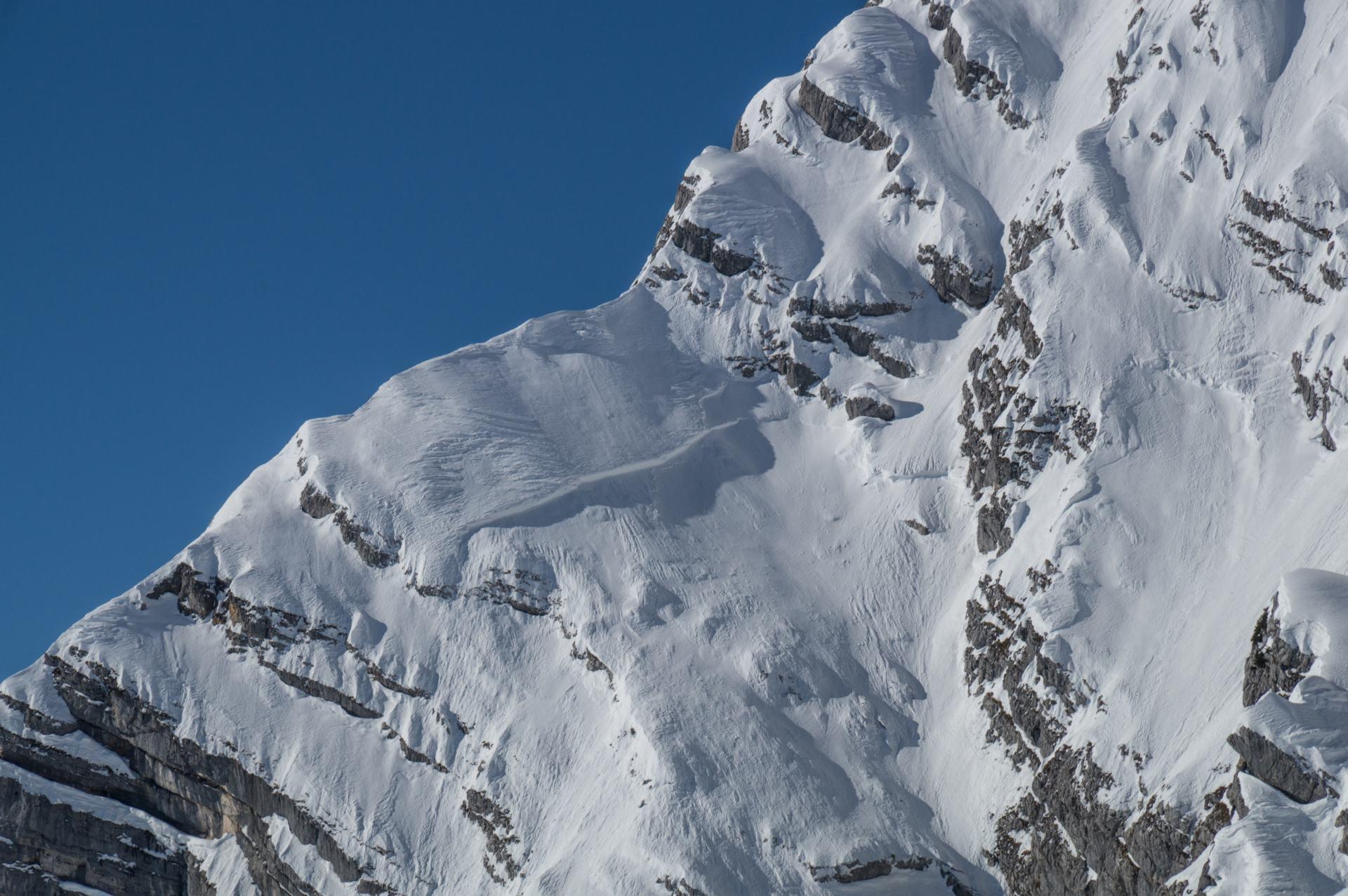Die Spuren des letzten Sturmes sind immer noch eindrucksvoll. Einige gewaltige Anrisse wenn man zum SO-Grat schaut und einige "komische" Schneegebilde.