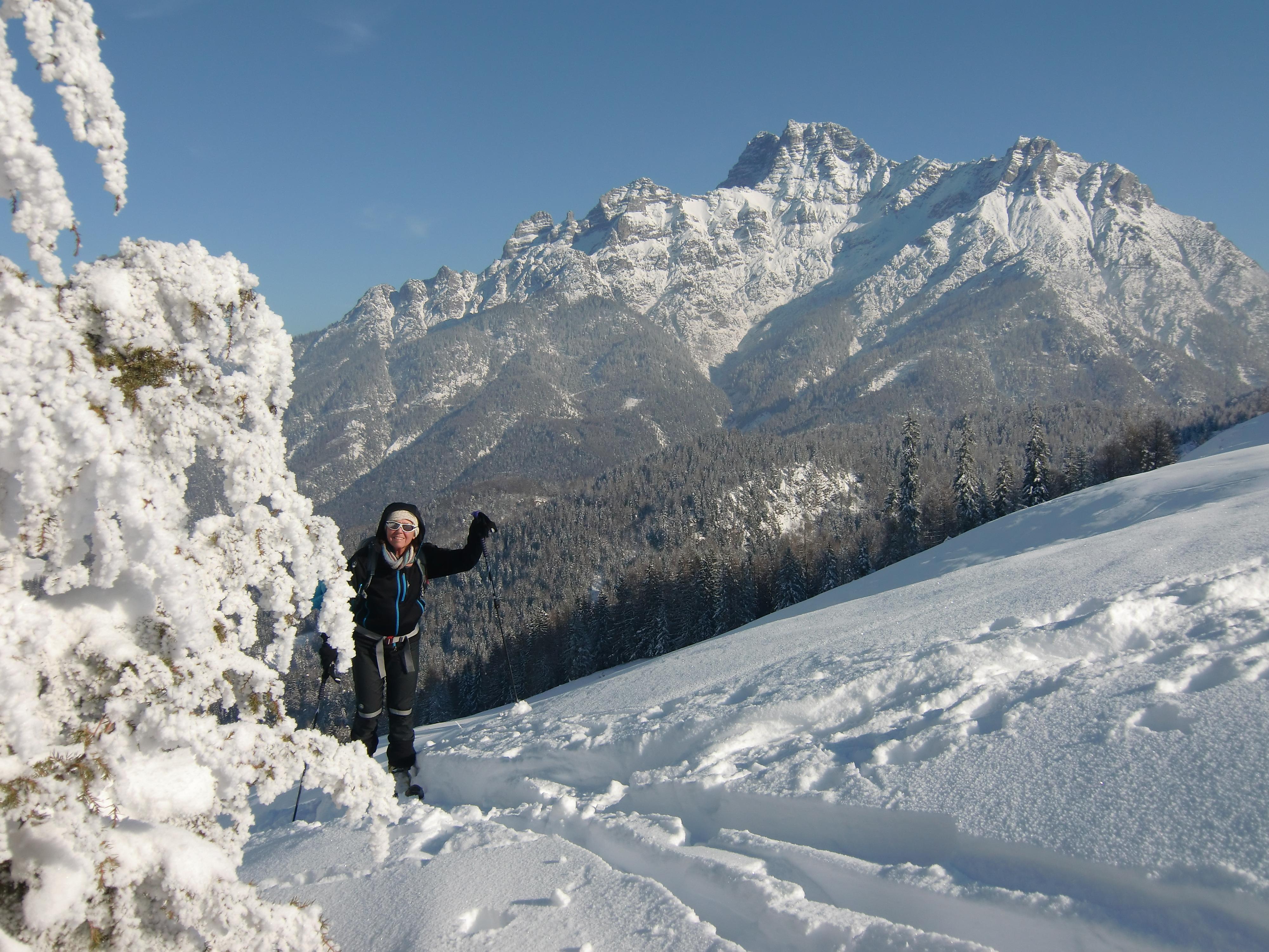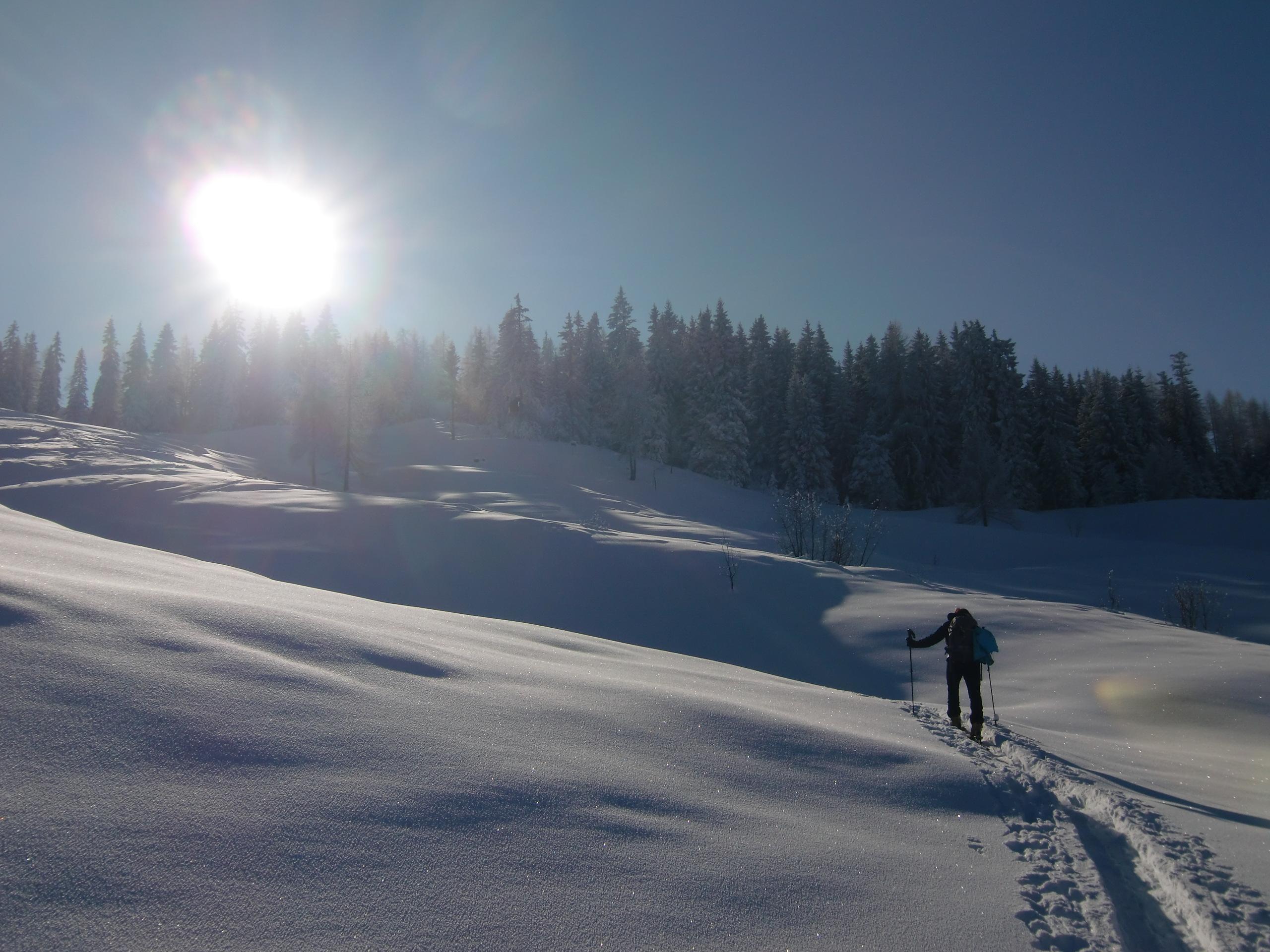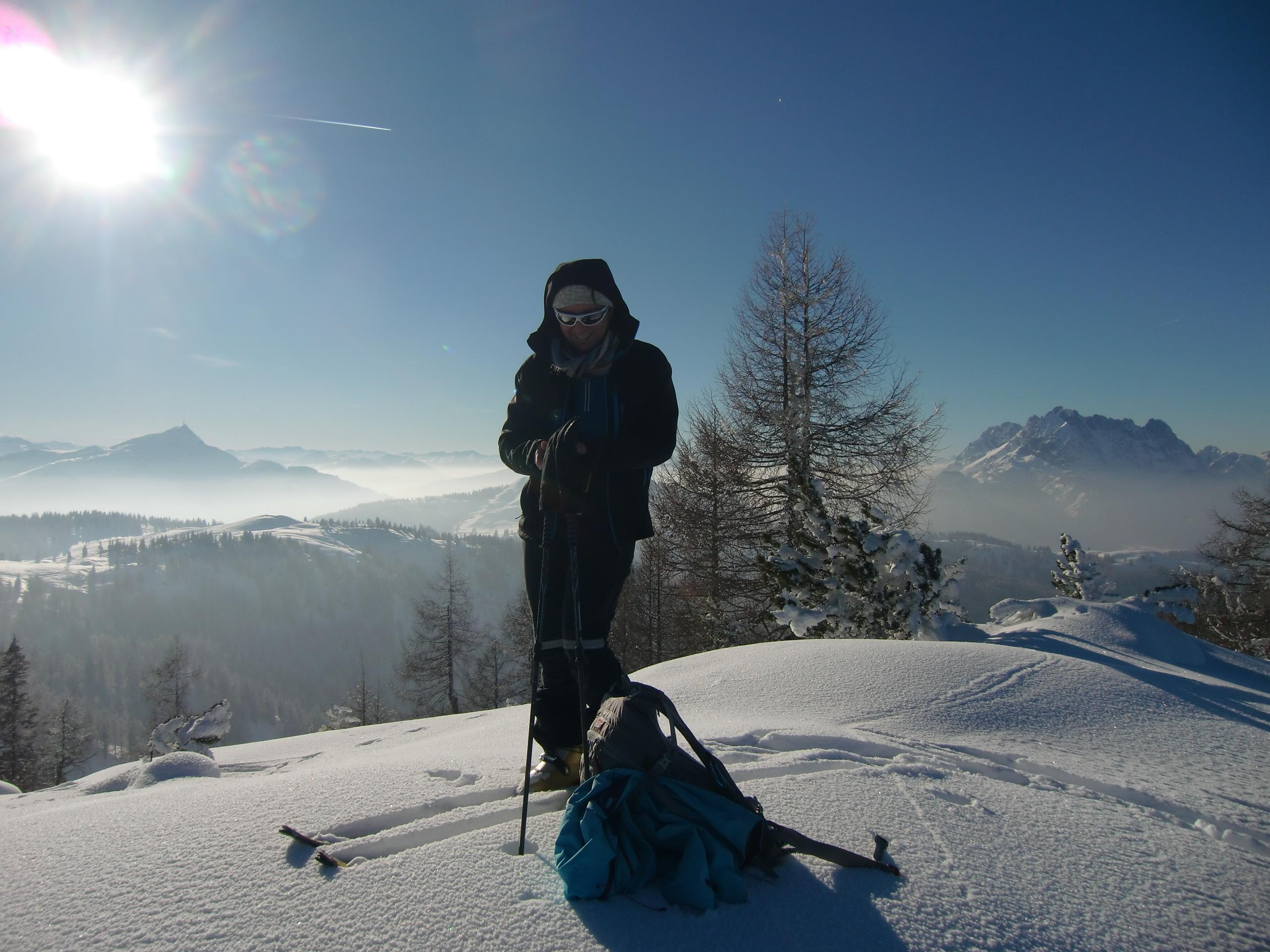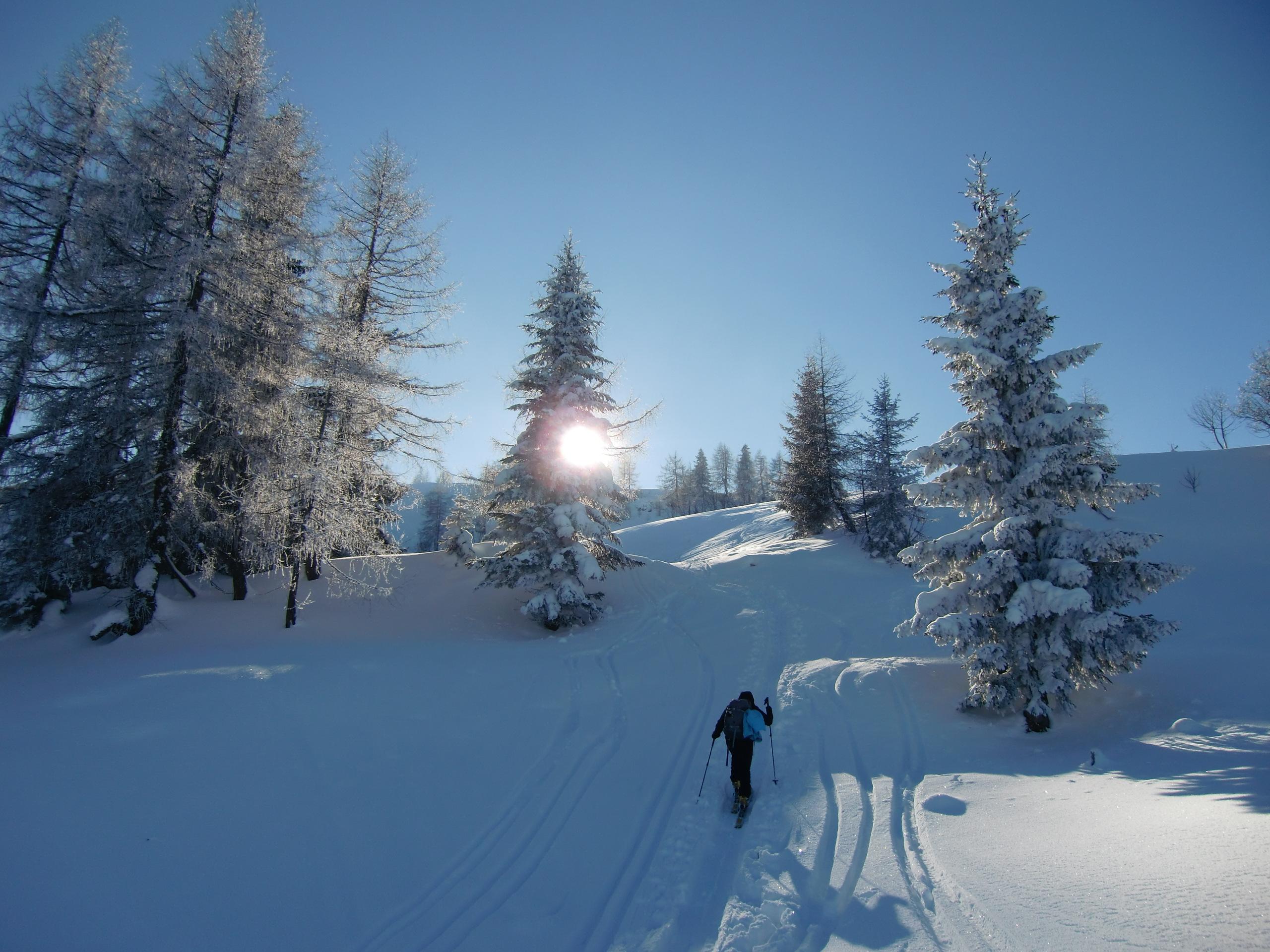 Schnee: Immer noch trockener, unbearbeiteter Pulver vom Feinsten, mit Pelz aus Oberflächenreif. Noch jede Menge Platz auf den breiten Almwiesen.