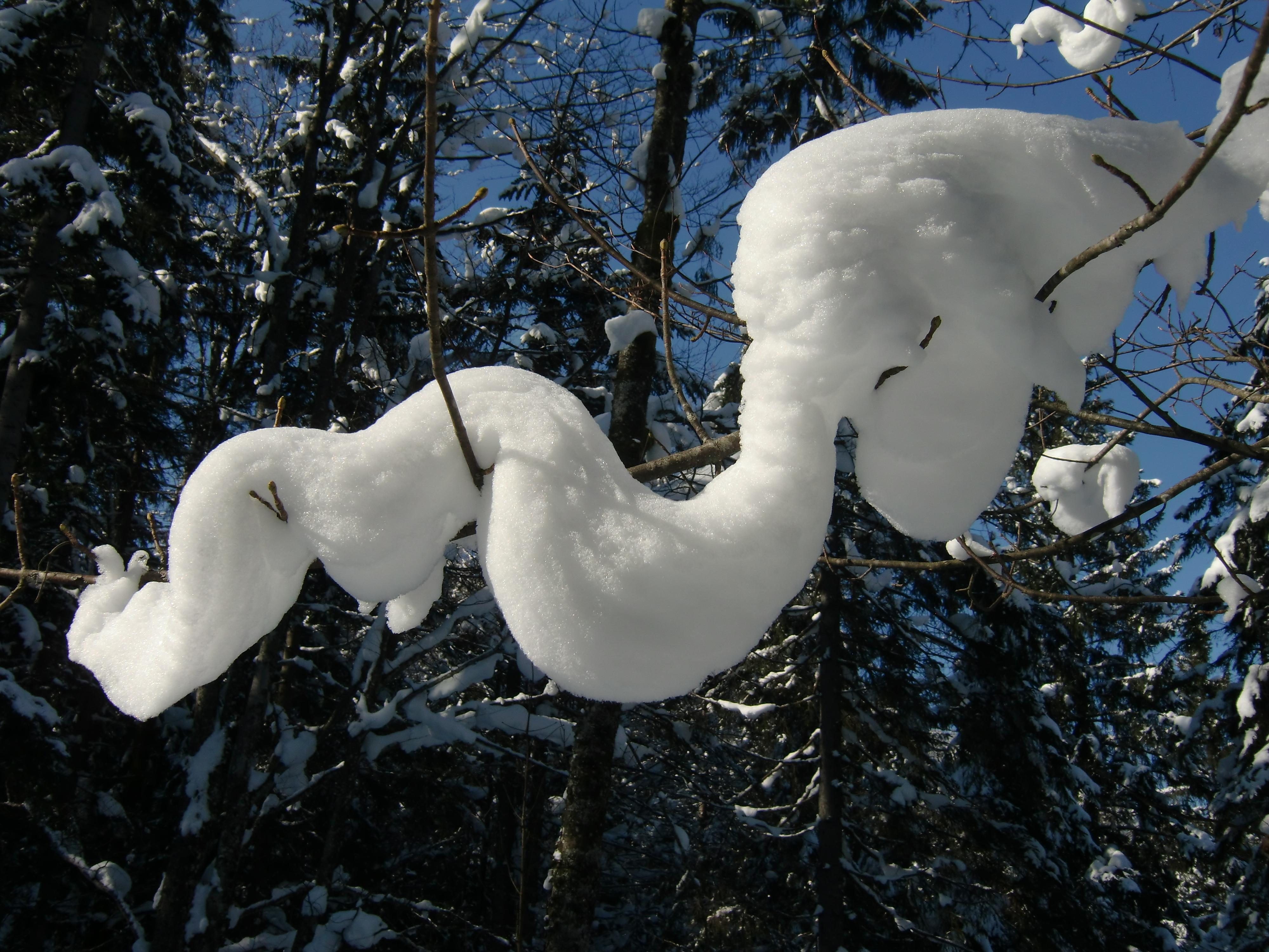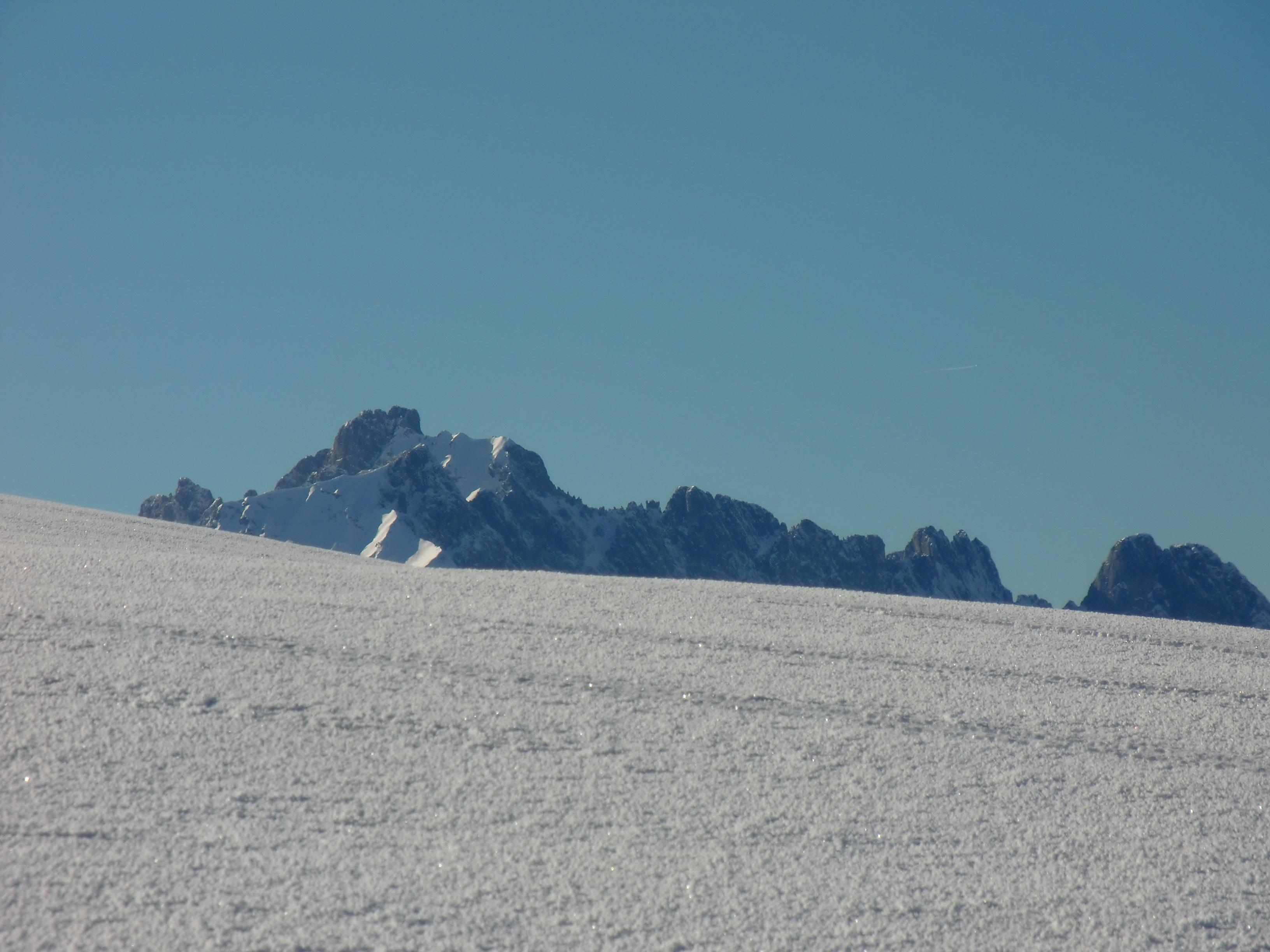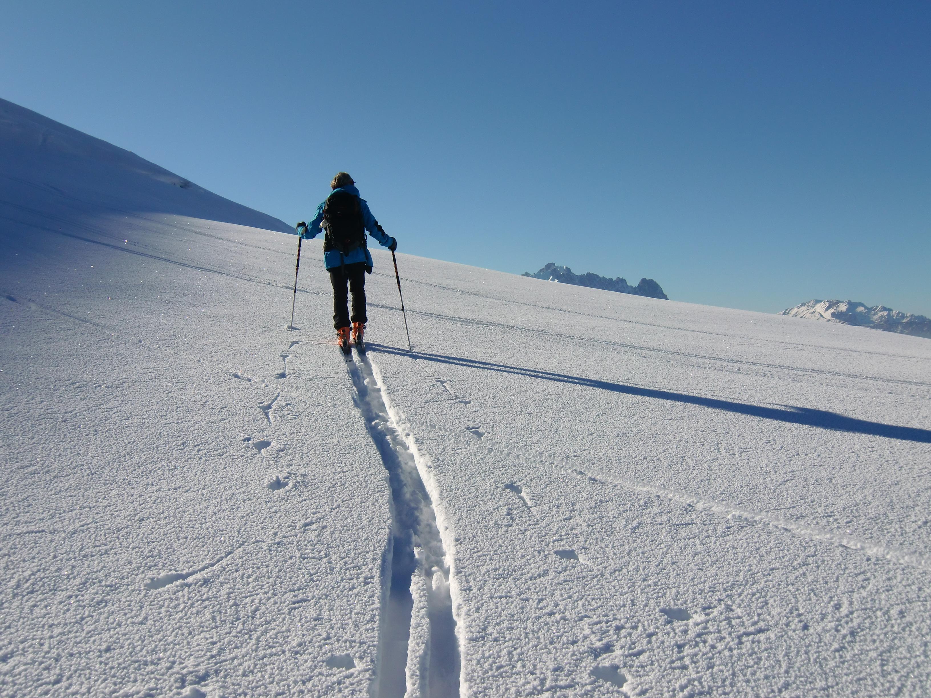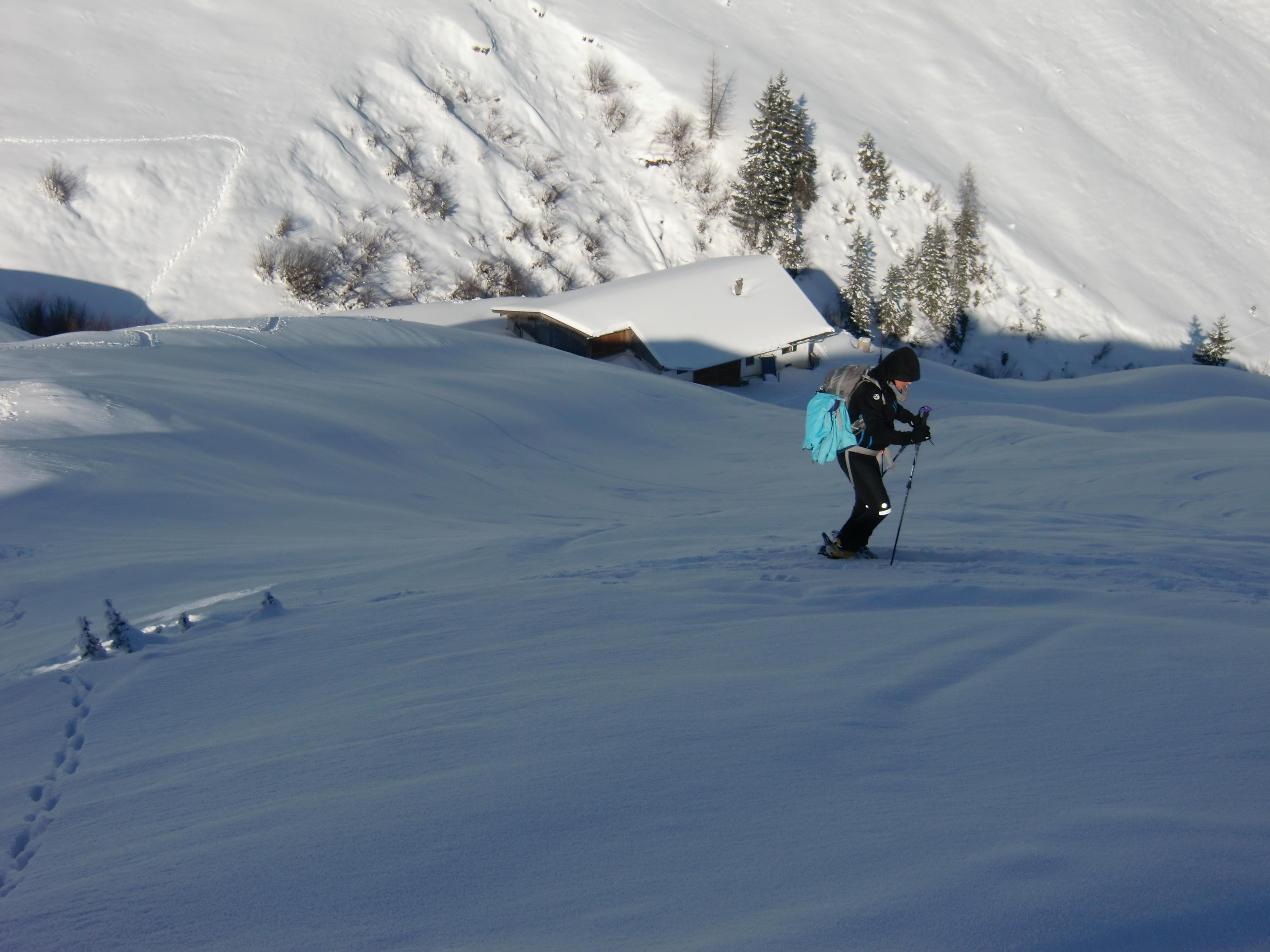 Schnee: Immer noch trockener, unbearbeiteter Pulver vom Feinsten, mit Pelz aus Oberflächenreif. Noch jede Menge Platz auf den breiten Almwiesen.