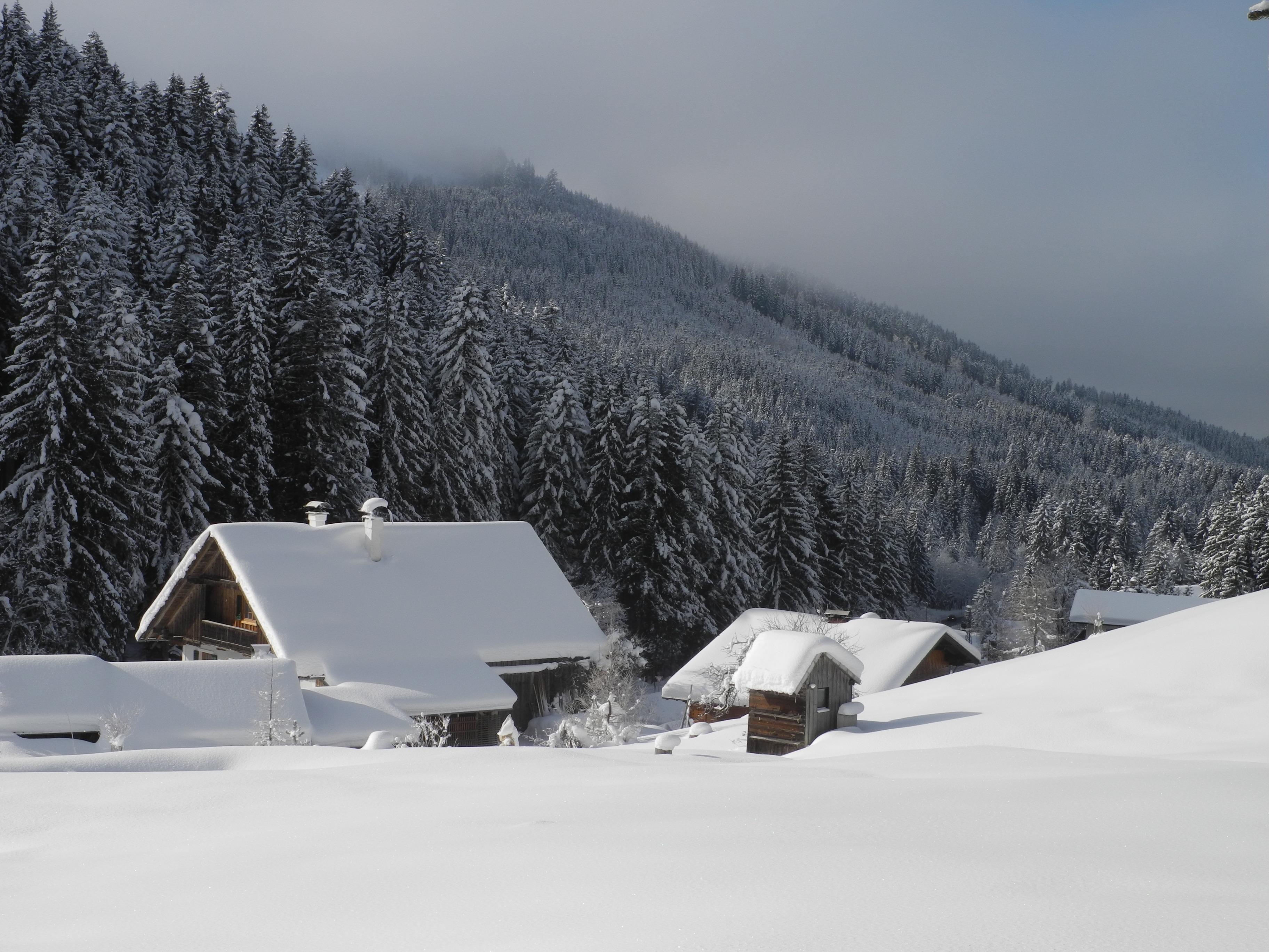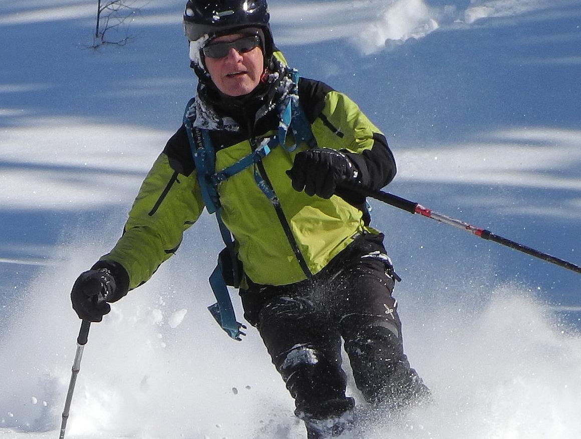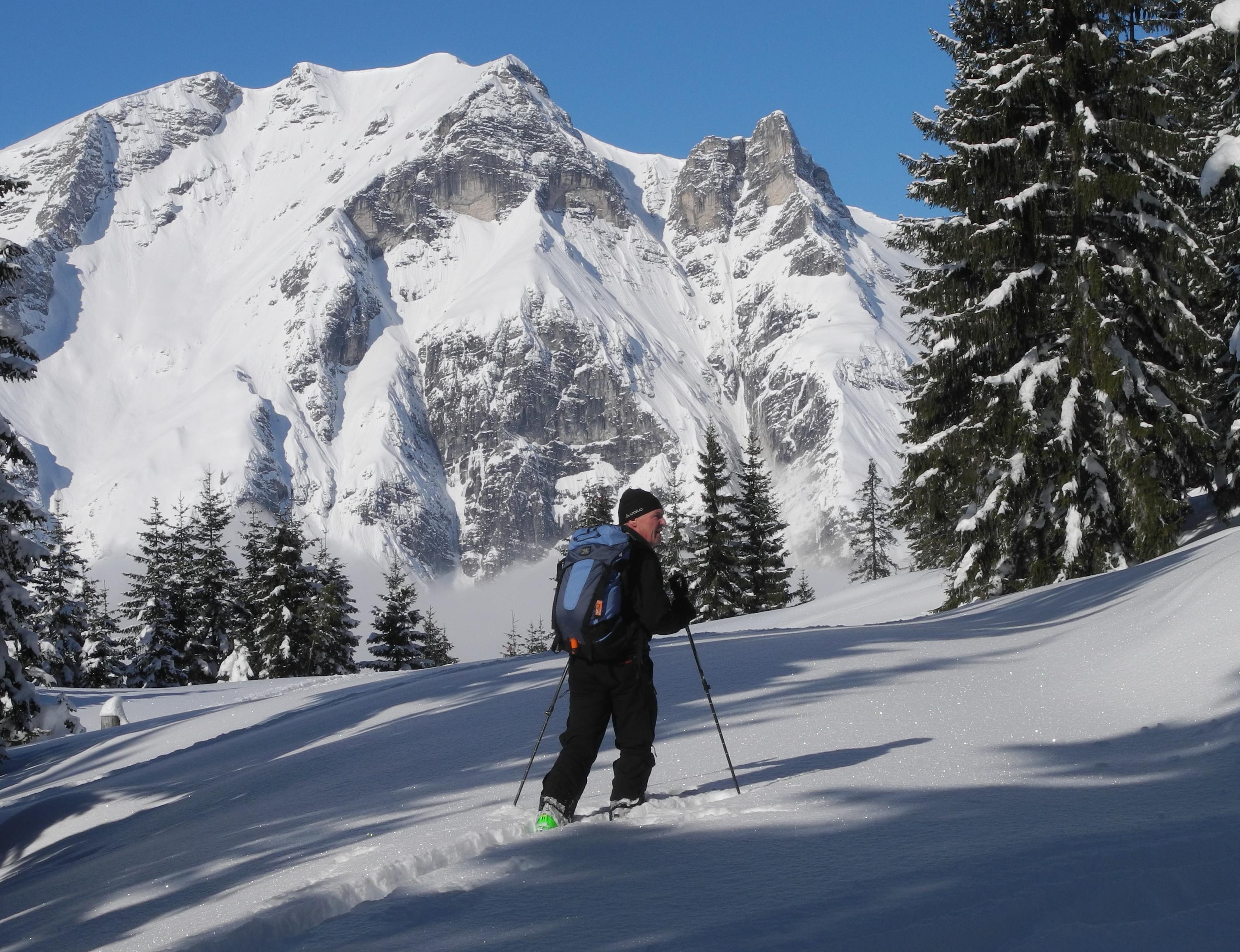 Während südseitig der Schnee durch Sonneneinstrahlung bereits durchfeuchtet war gab es westseitig 500 Höhenmeter traumhaften Pulverschnee durch lichten Waldbestand!