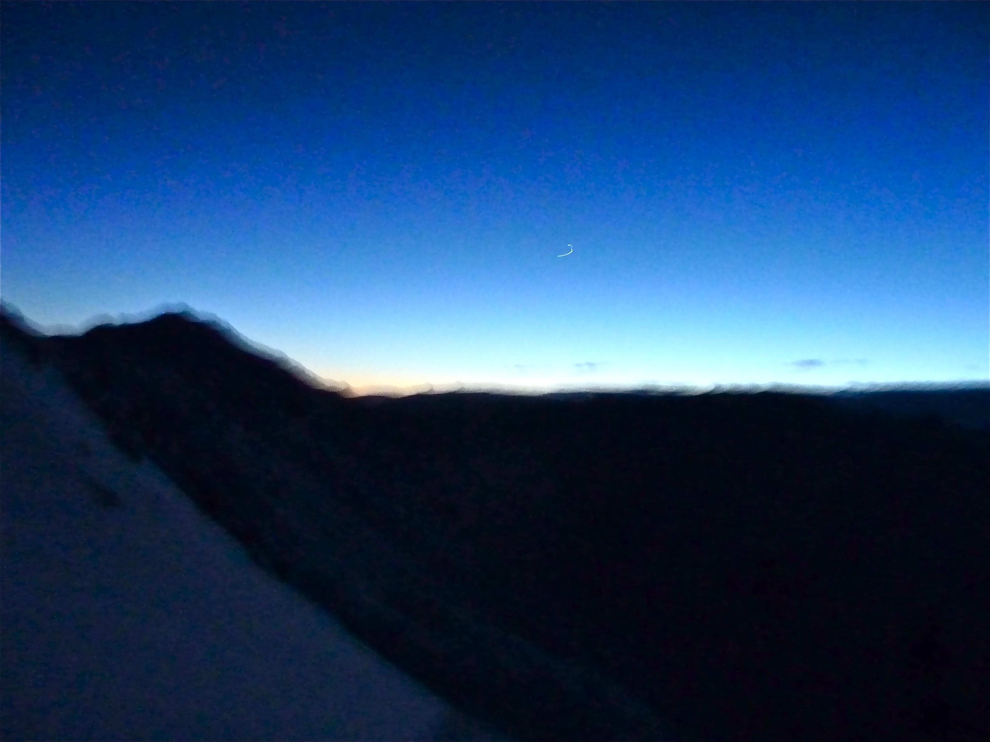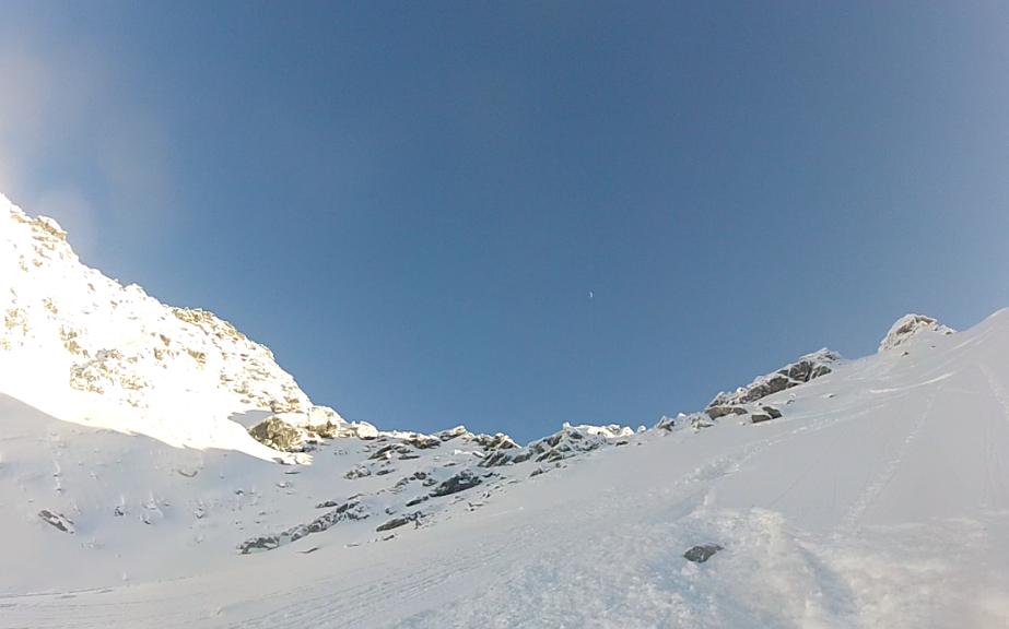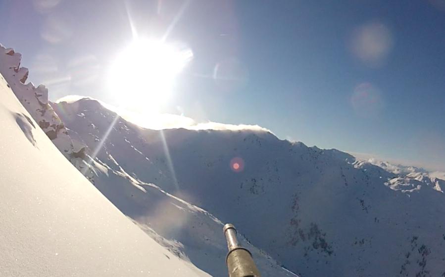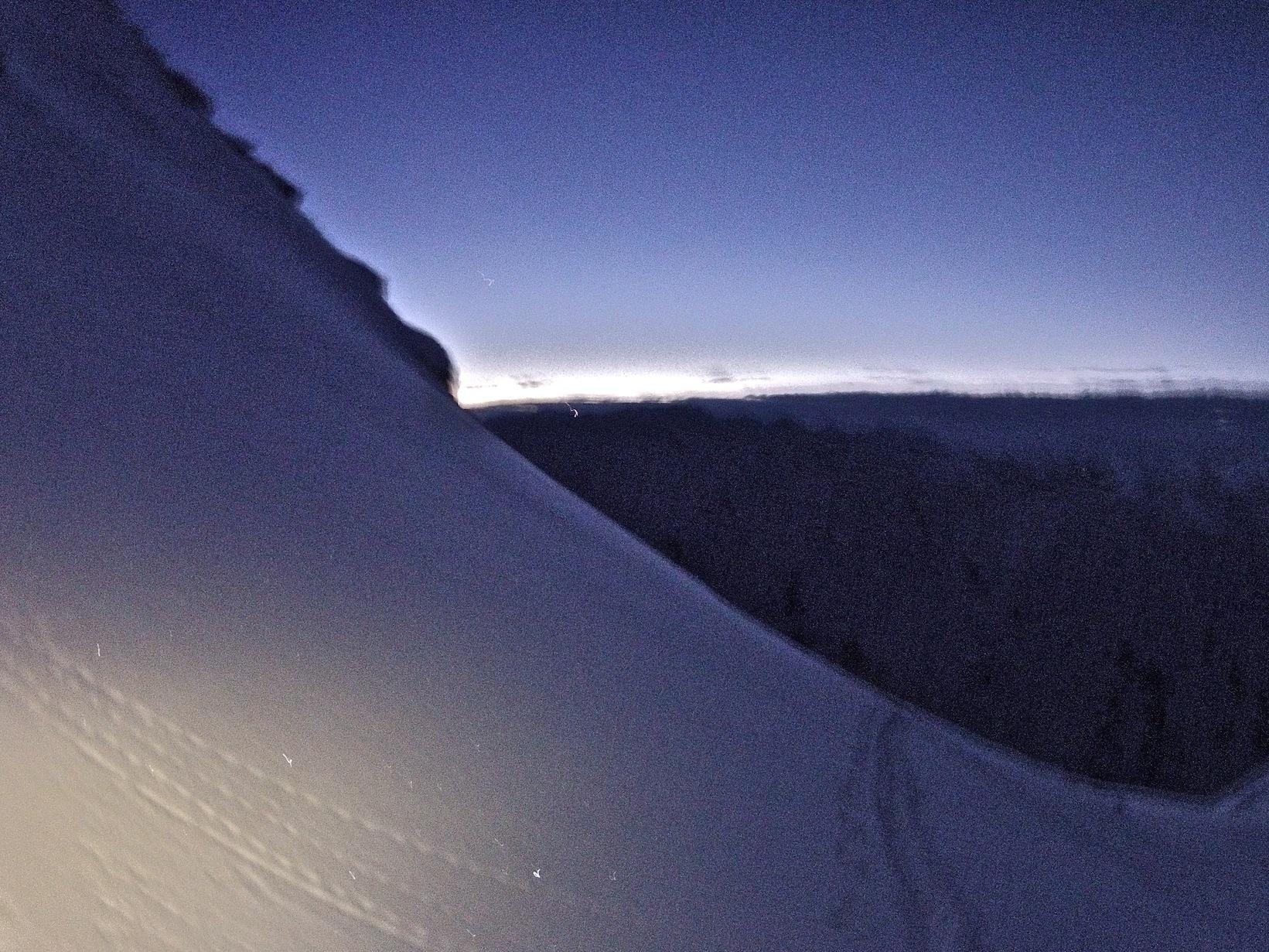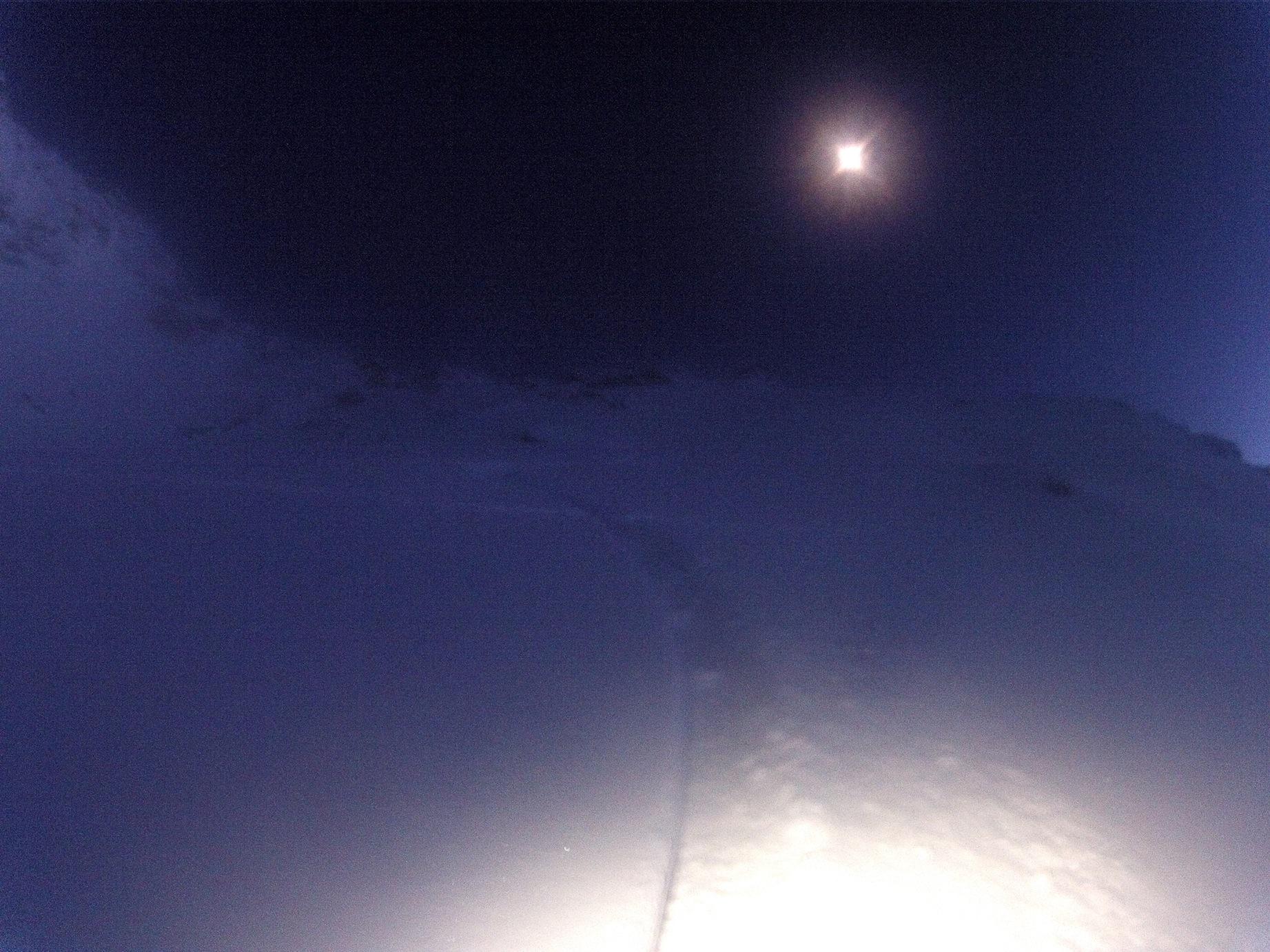 ....nach 3 Tagen Whiteout, gabs auch morgens noch Schneefall, doch pünktlich zu Mittag kam dann die Sonne. Fast schon kitschig ging`s also um 13:00 bei Pulverschnee und Kaiserwetter los zu einem nachmitäglichen unverspurtem Pulververgnügen. Diese wurde allerdings bereits nach wenigen Schwüngern der ersten Abfahrt ordentlich getrübt, denn ein gewaltiger Shark überraschte mich bei hohem Tempo. Die Folge war ein ordentlicher Salto inkl. Landung auf einem weiterern Fels :-(( Nach kurzen atemberaubenden Momenten, war klar, dass ich noch einigermaßen heil war, wenn man davon absieht, dass ich nun eine linke Hüfte hab, die es in der Größe mit Shakira`s aufnehmen kann und morgen wohl bunter als mein Outfit sein wird. Mein Board hat`s leider nicht überlebt :-( Gut runter musste ich sowieso und zur Regeneration ging`s wie geplant auch glecih noch einmal hoch um im Sonnenuntergang ein 2. Mal abzufahren. Den hab ich allerdings versäumt, da die neuen Felle Eiseskälte und Pulverschnee nicht vertragen haben, weshalb es ein wenig länger gedauert hat. Also ging`s mit Stirnlampe und Sharks fürchtend sehr behutsam retour zum Auto.
