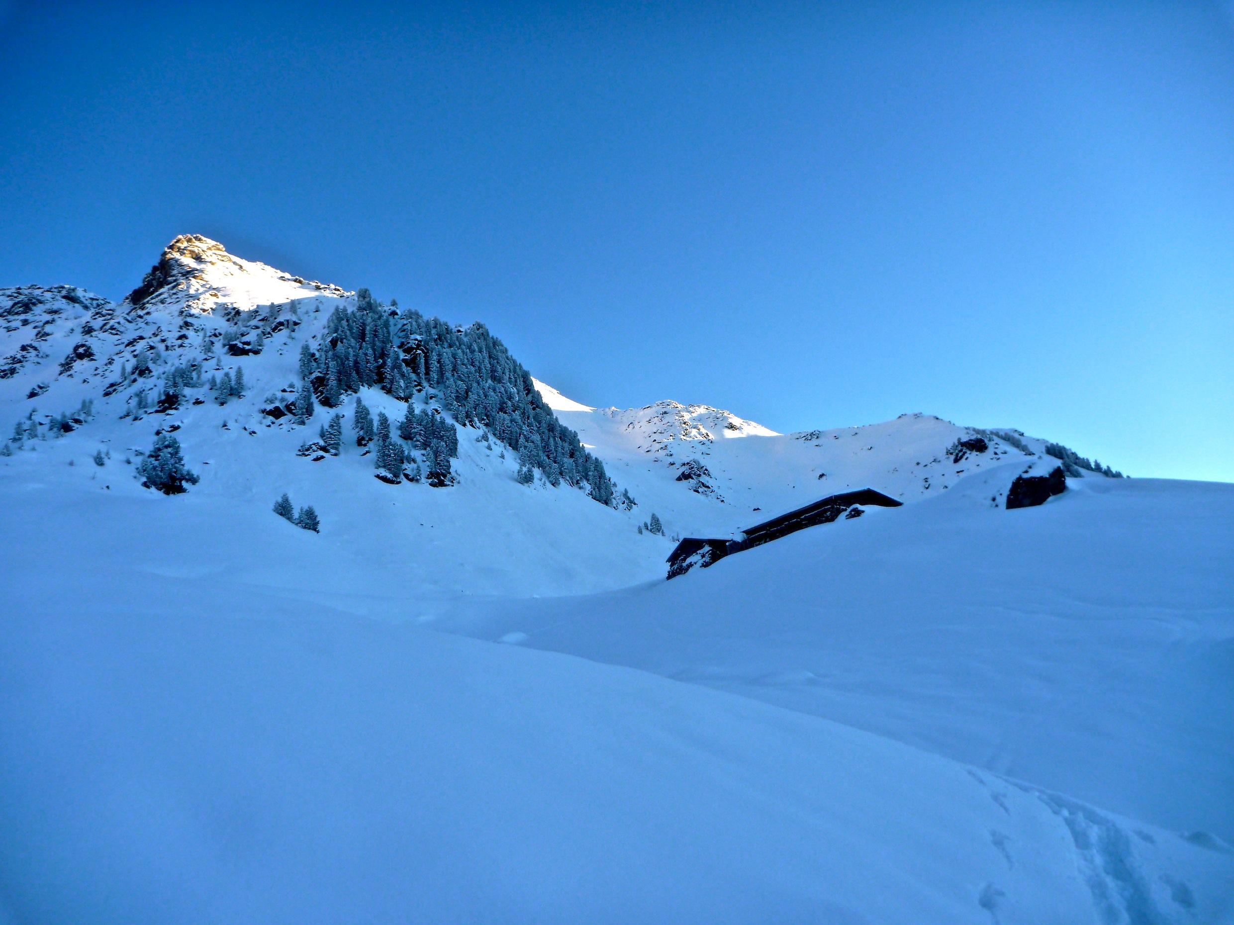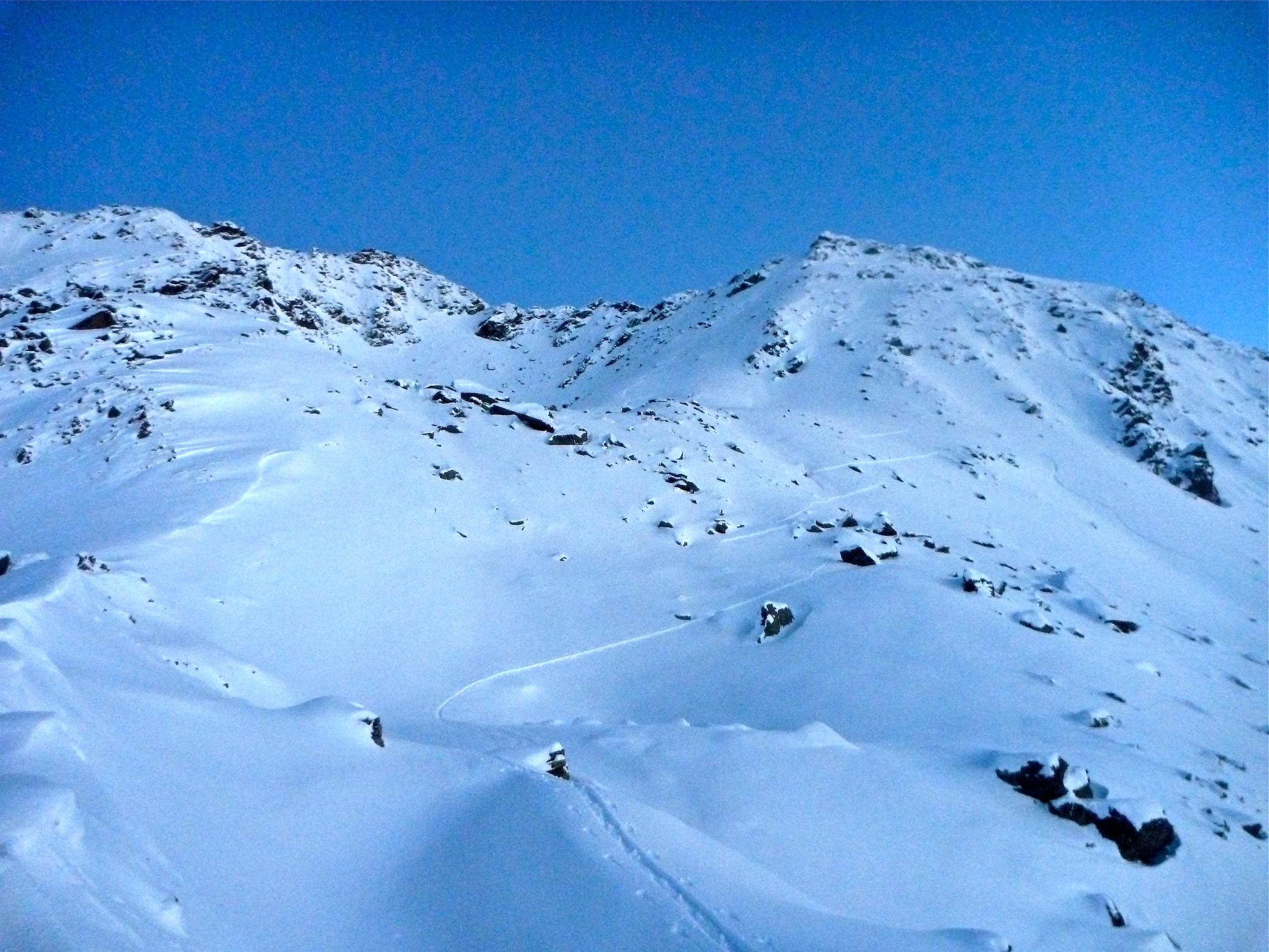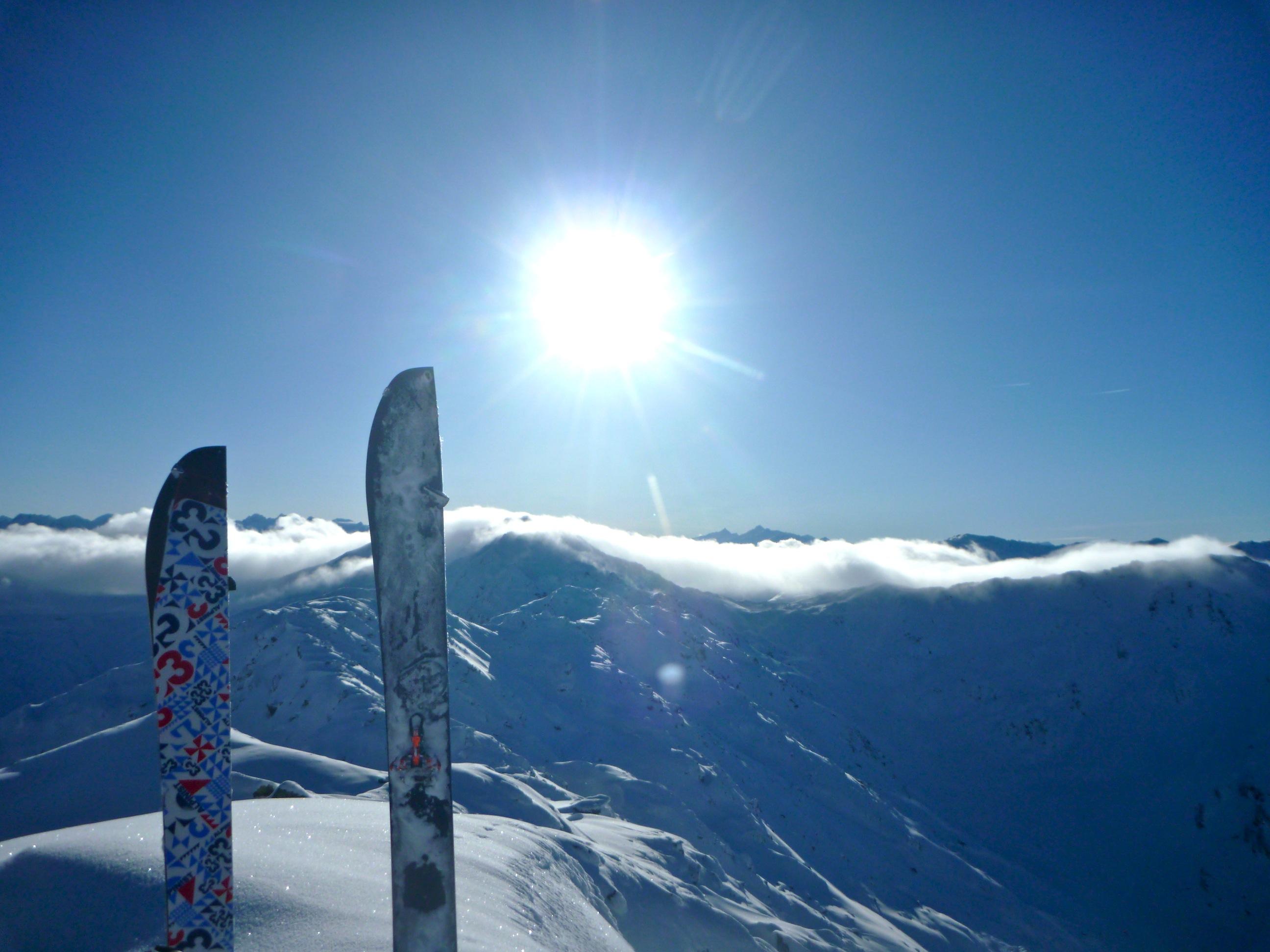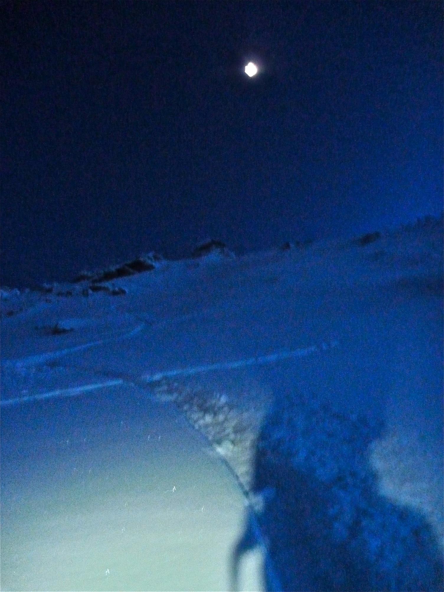 ....nach 3 Tagen Whiteout, gabs auch morgens noch Schneefall, doch pünktlich zu Mittag kam dann die Sonne. Fast schon kitschig ging`s also um 13:00 bei Pulverschnee und Kaiserwetter los zu einem nachmitäglichen unverspurtem Pulververgnügen. Diese wurde allerdings bereits nach wenigen Schwüngern der ersten Abfahrt ordentlich getrübt, denn ein gewaltiger Shark überraschte mich bei hohem Tempo. Die Folge war ein ordentlicher Salto inkl. Landung auf einem weiterern Fels :-(( Nach kurzen atemberaubenden Momenten, war klar, dass ich noch einigermaßen heil war, wenn man davon absieht, dass ich nun eine linke Hüfte hab, die es in der Größe mit Shakira`s aufnehmen kann und morgen wohl bunter als mein Outfit sein wird. Mein Board hat`s leider nicht überlebt :-( Gut runter musste ich sowieso und zur Regeneration ging`s wie geplant auch glecih noch einmal hoch um im Sonnenuntergang ein 2. Mal abzufahren. Den hab ich allerdings versäumt, da die neuen Felle Eiseskälte und Pulverschnee nicht vertragen haben, weshalb es ein wenig länger gedauert hat. Also ging`s mit Stirnlampe und Sharks fürchtend sehr behutsam retour zum Auto.