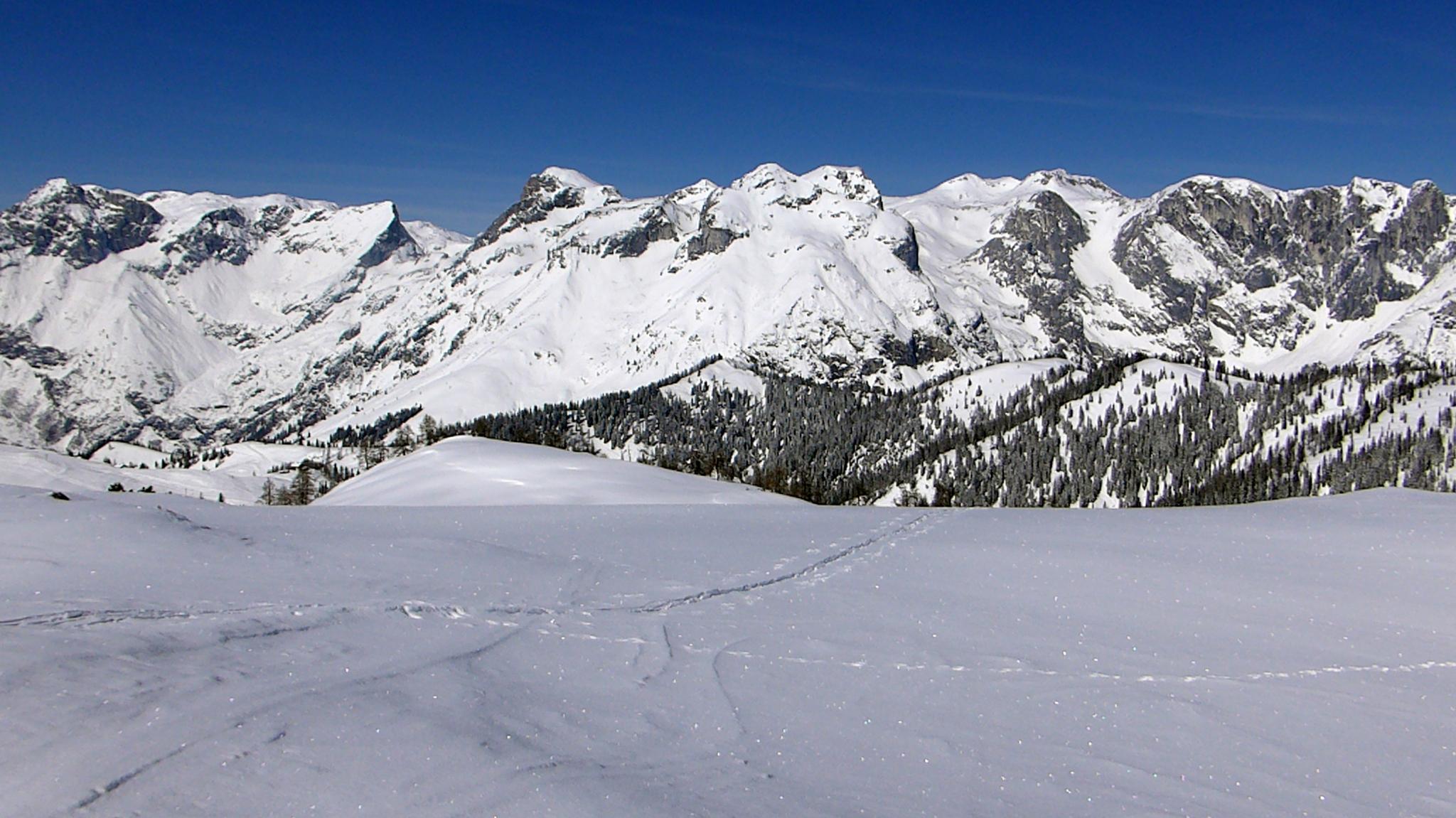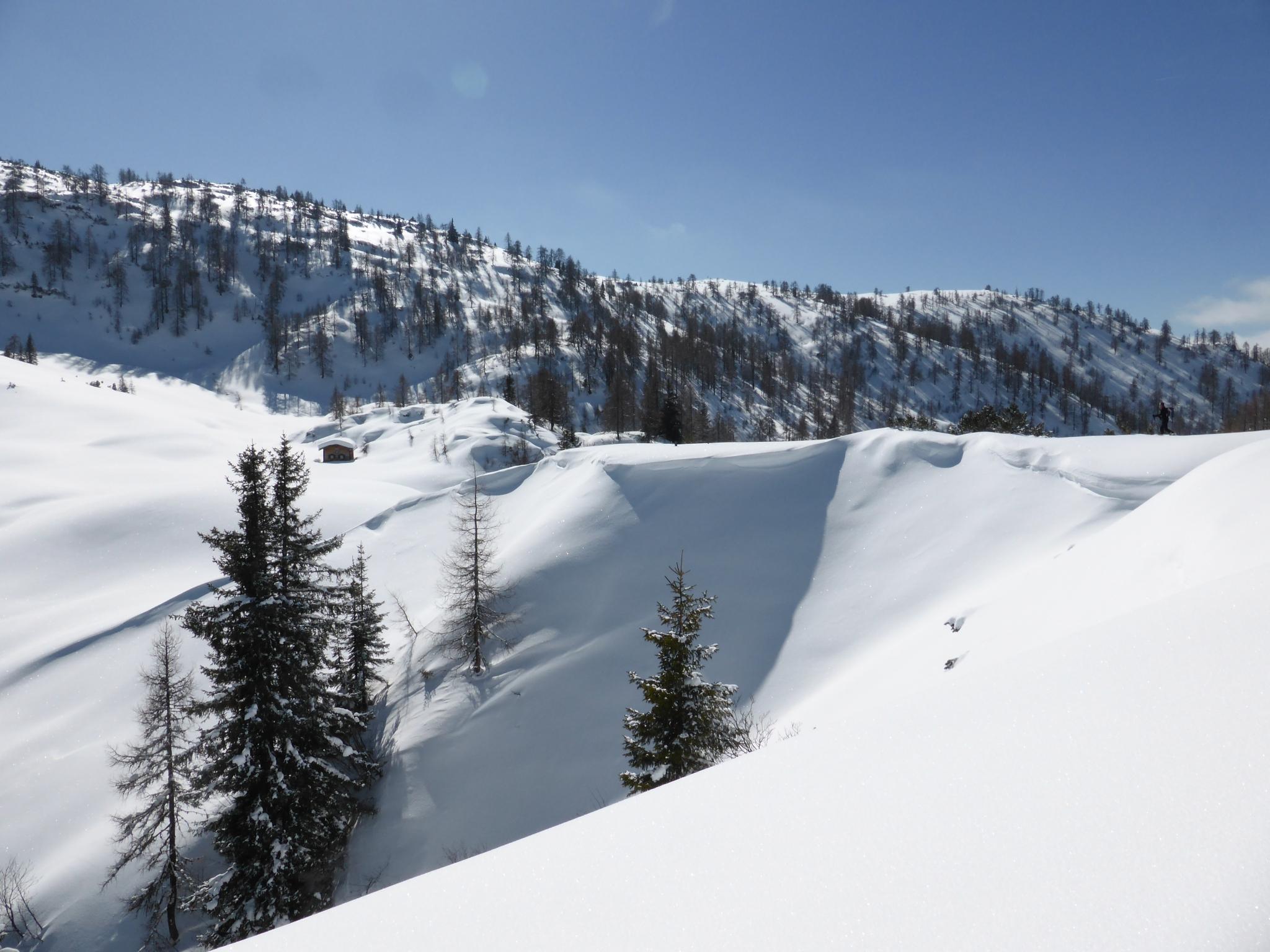 Lawinen: Immer wieder deutliche Setzungsgeräusche im flachen Almgelände und im gesamten Kammbereich zwischen Frommerkogel und Korein, nordseitig liegt der Pulverschnee im windgeschützten Bereich spannungsfrei. Sonnseitig vom Fritzerkogel immer wieder optisch eindrucksvolle Staublawinen.