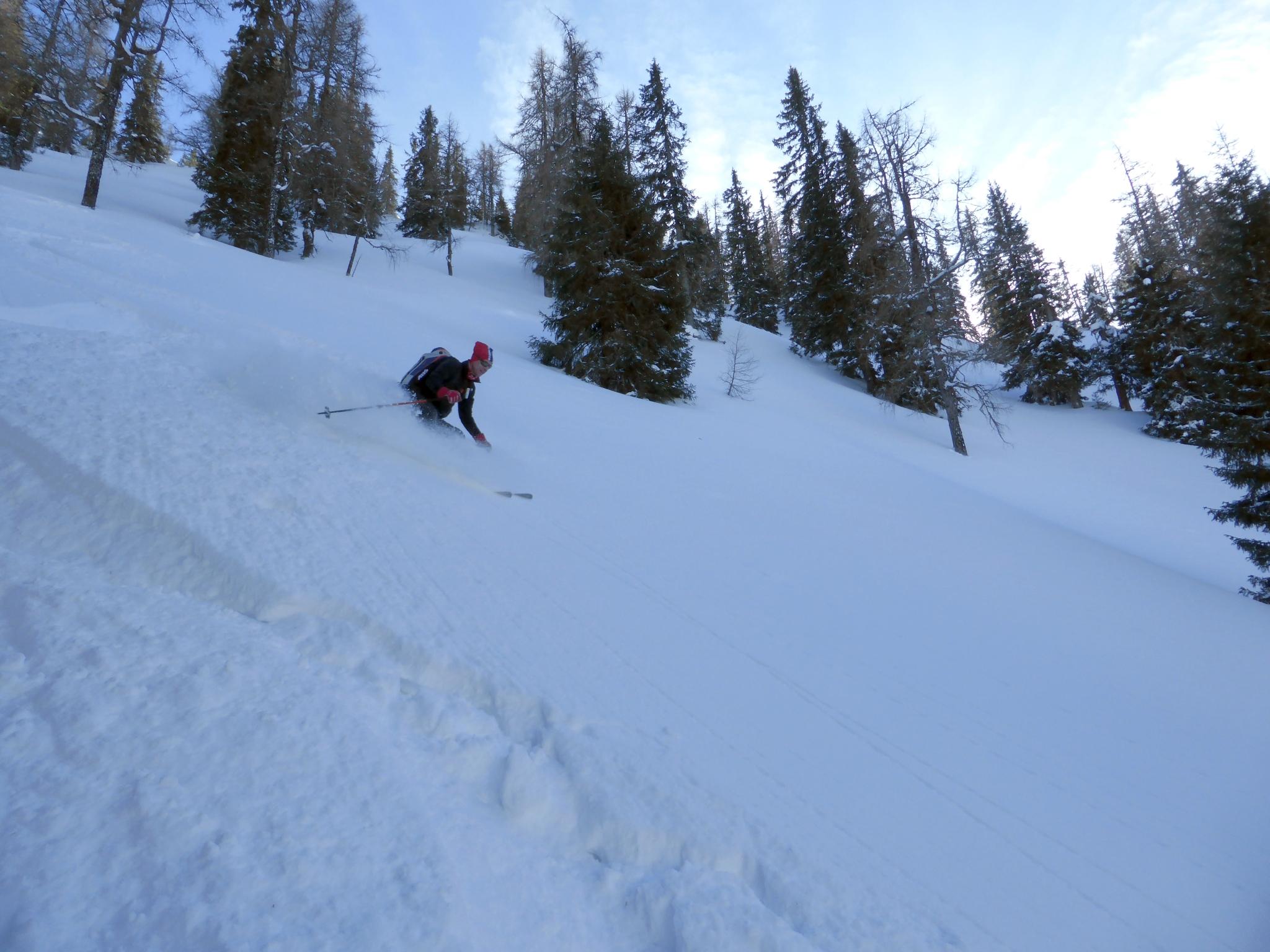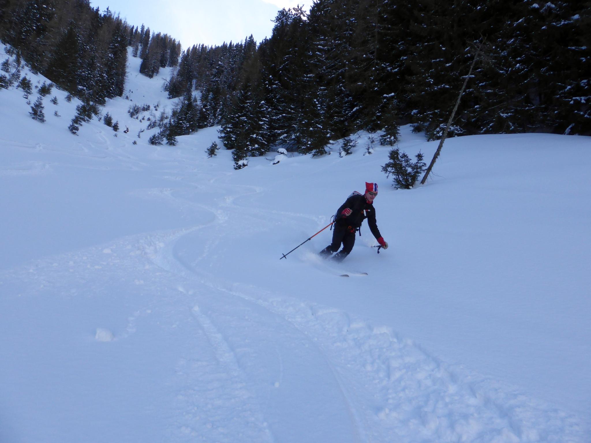 Allgemeine Verhältnisse, Schnee: Pulverschnee, der dort, wo die Sonne auch nur kurz drauf scheint, sofort anfeuchtet und beim zweiten, teils schon im Schatten liegenden Aufstieg bereits eine Kruste hat. Die nordseitigen Abfahrten erfolgen im besten Pulver, ca. 20 bis 30 cm. Beim Spuren teilweise aber auch knietief eingesunken.