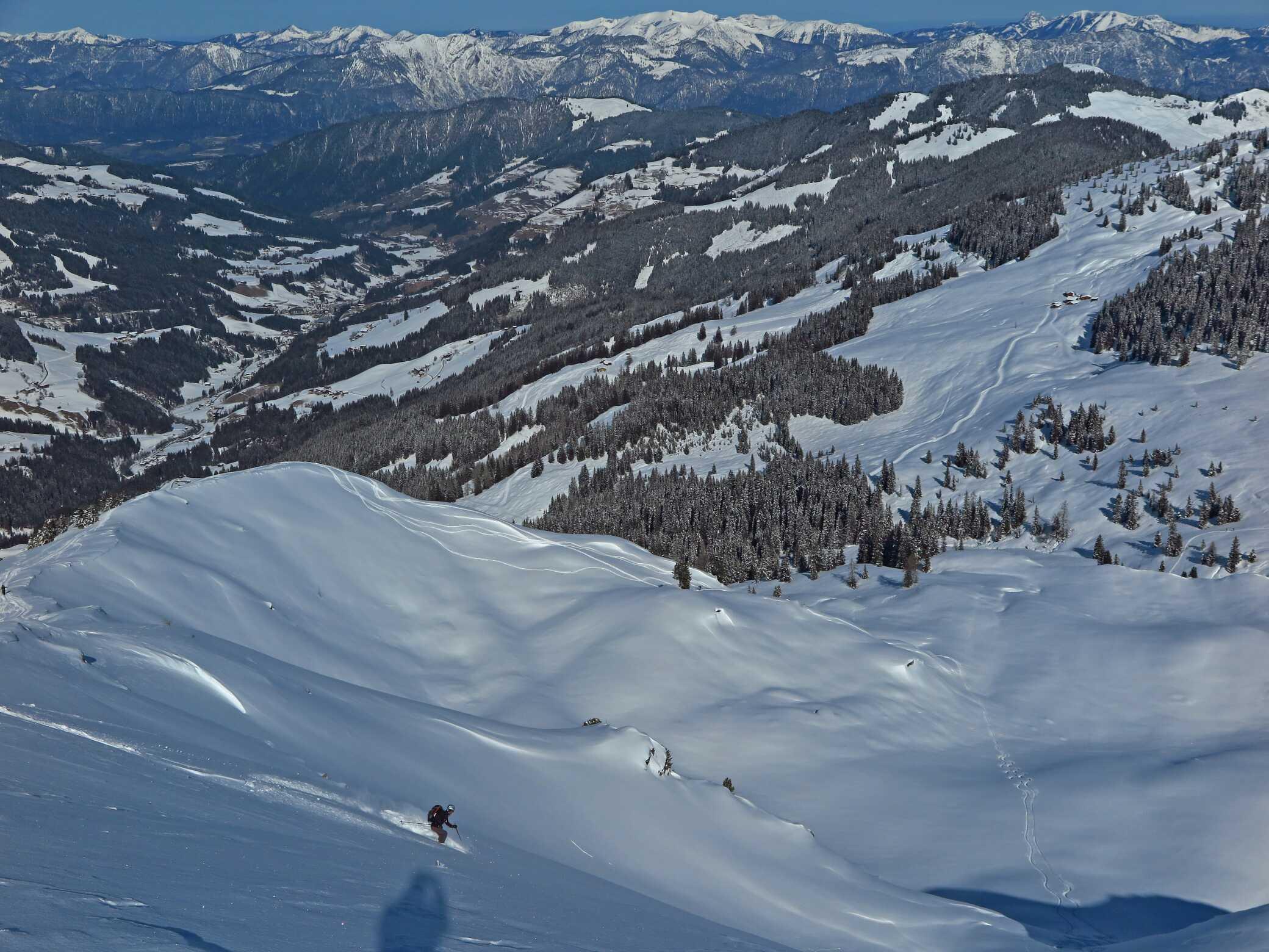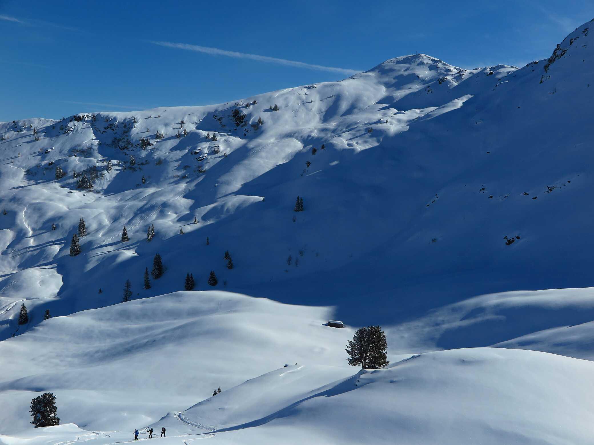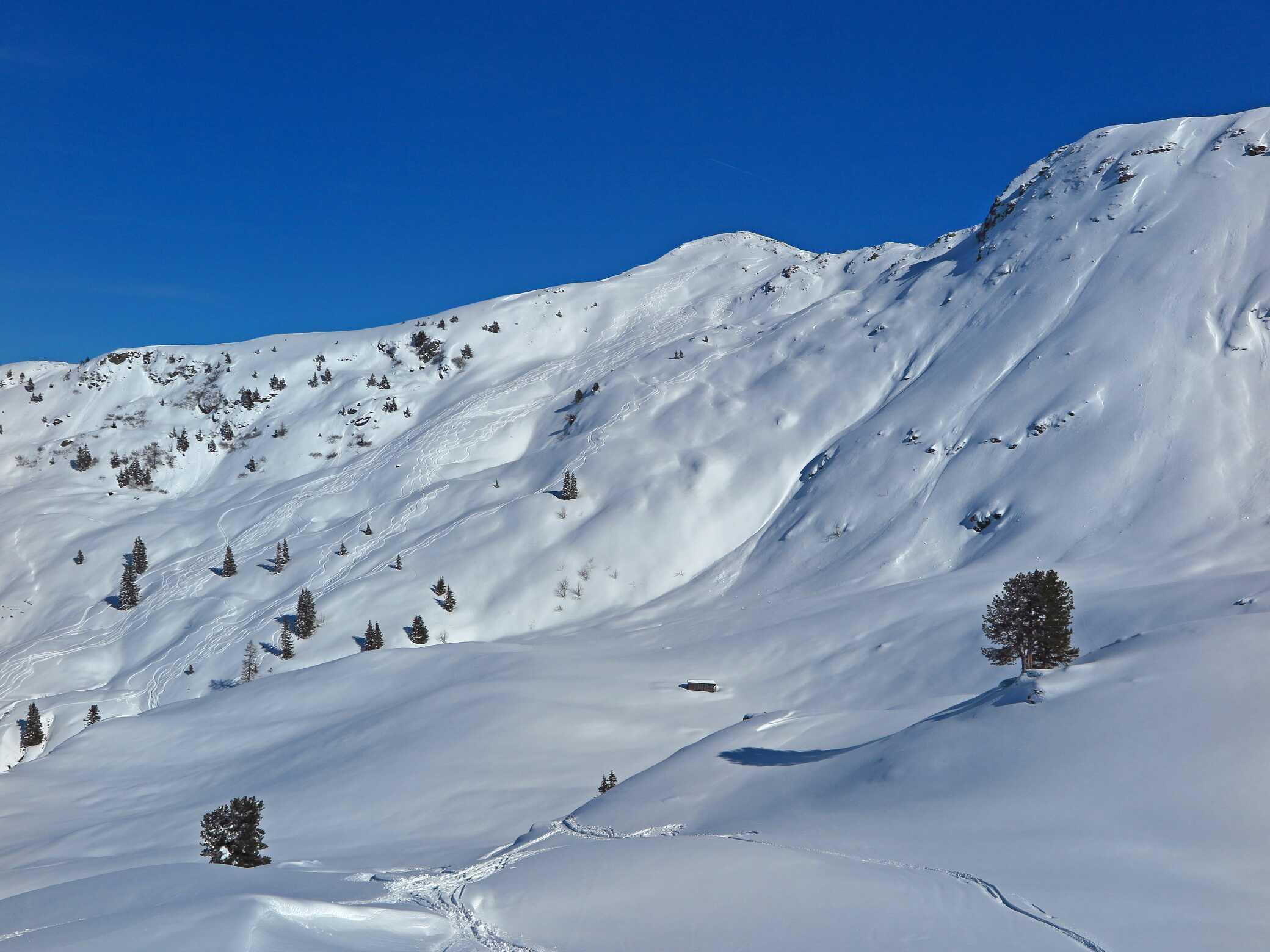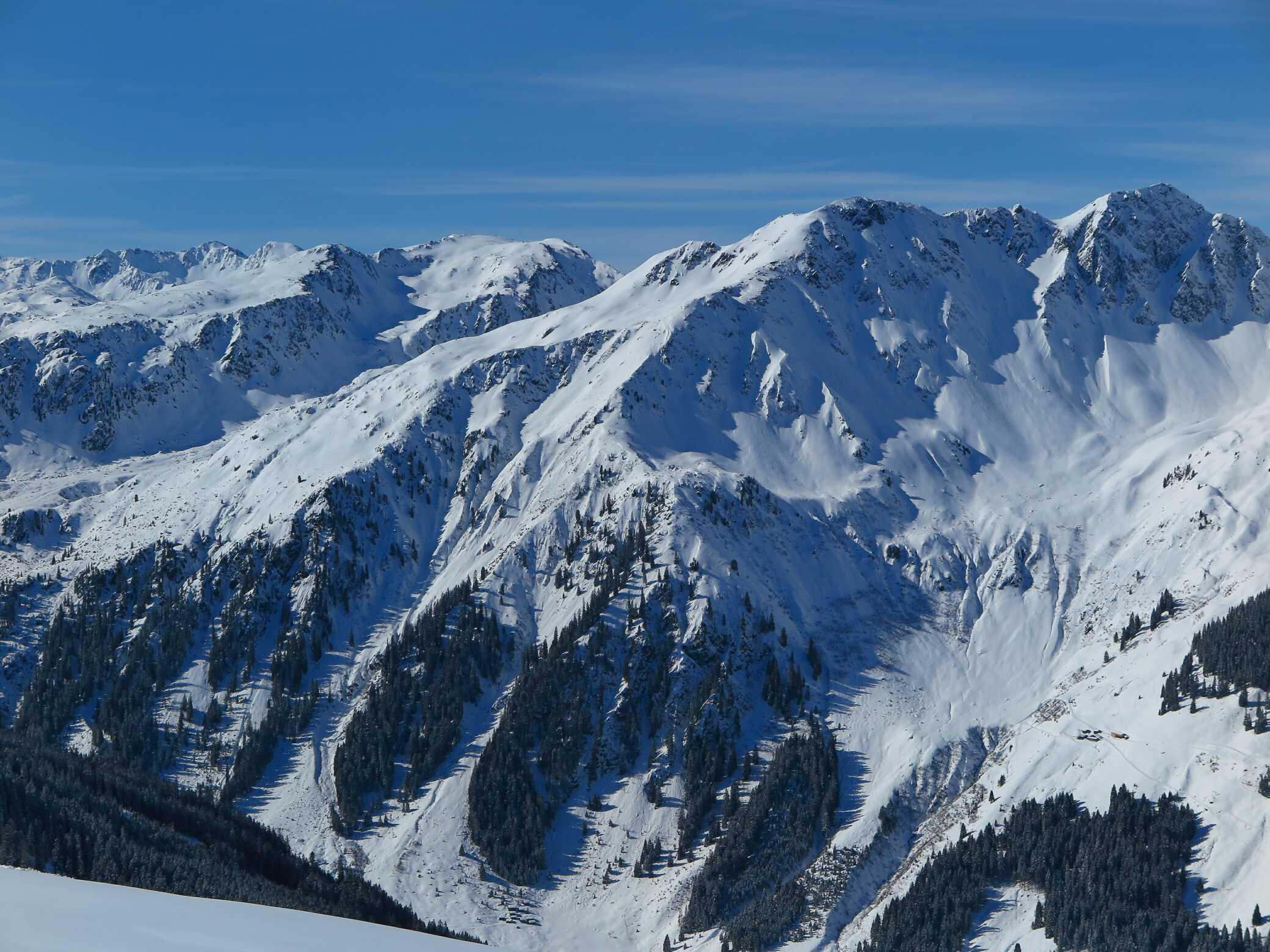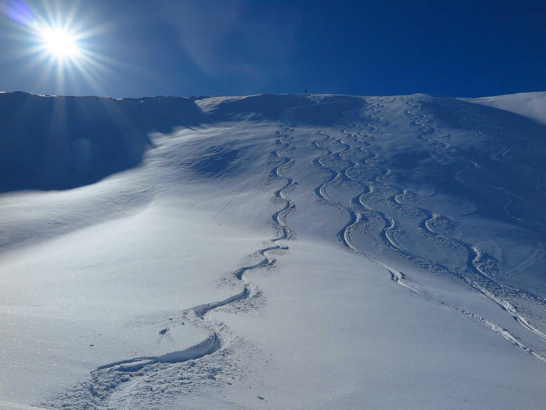 Schneelage: Unten ca. 10-15cm, oben ca. 20-30cm Pulverauflage auf meist guter Unterlage (manchmal etwas inhomogen). Keine Untergrundkontakte und alle Abfahrten in gutem Pulverschnee, bis auf die letzten ca. 200Hm ins Tal (Pappschnee). Insgesamt ca. 2000 Hm sehr schöne Abfahrtshänge, die heute zu meiner Überraschung nur relativ wenig besucht waren.