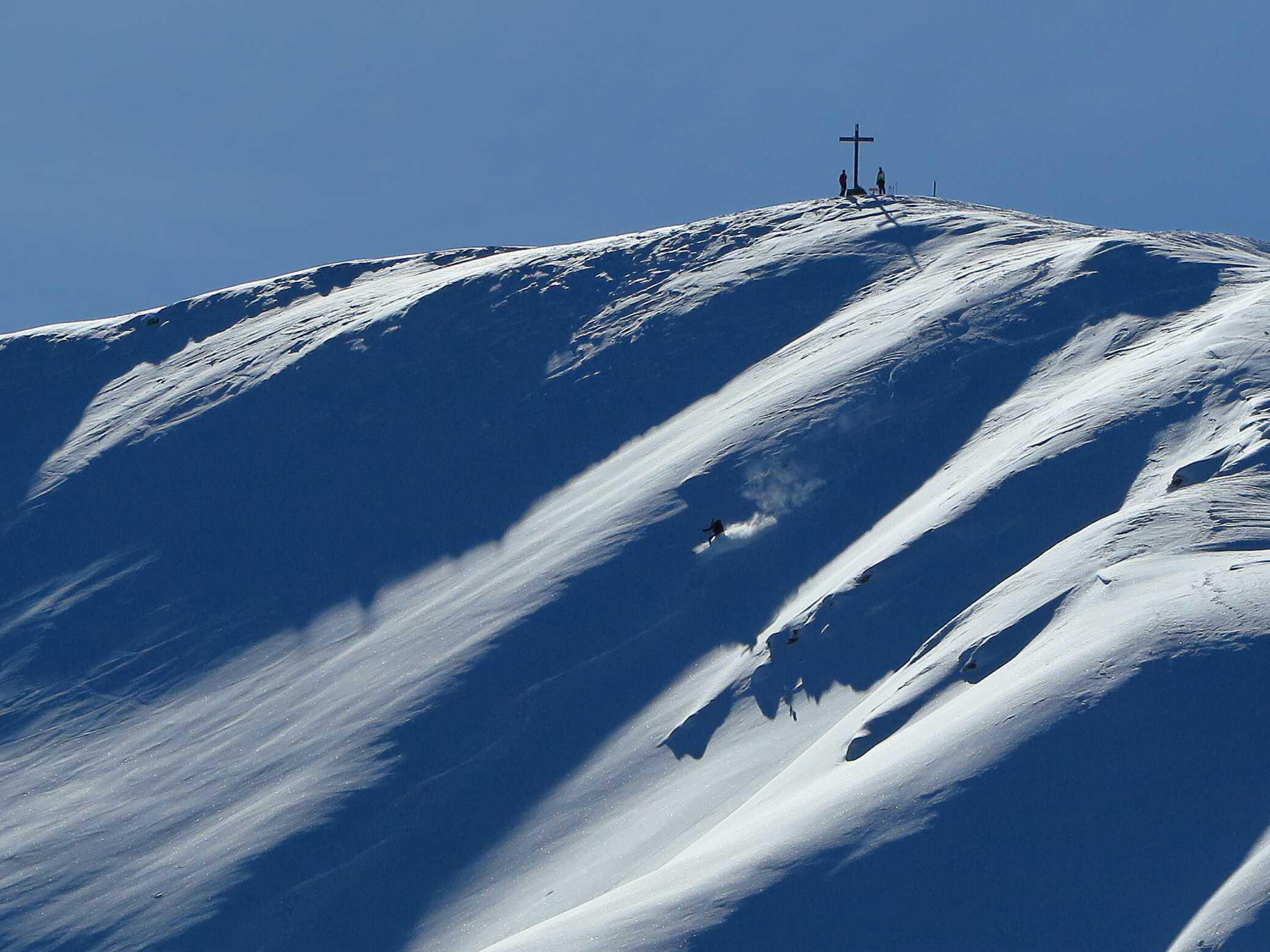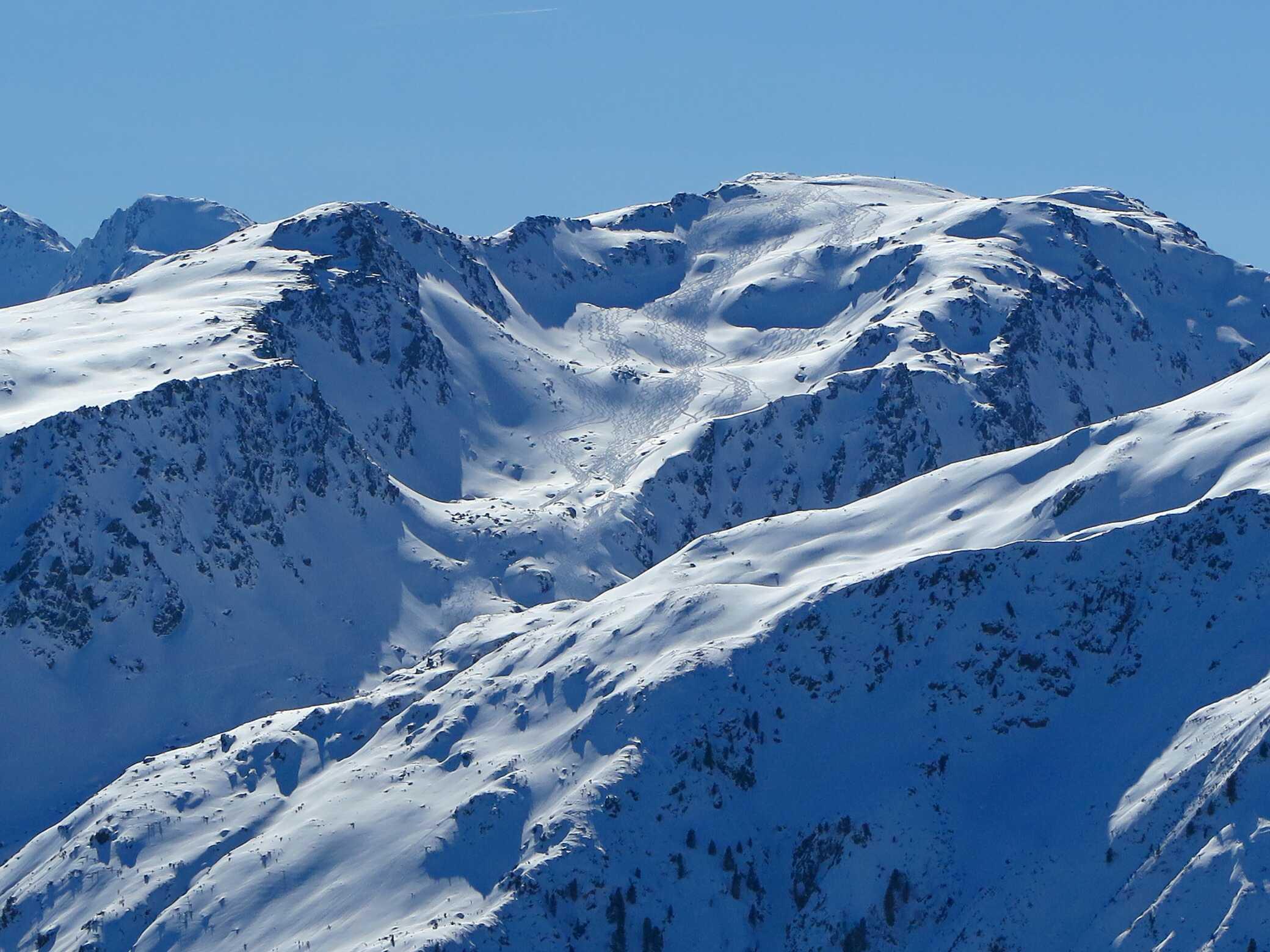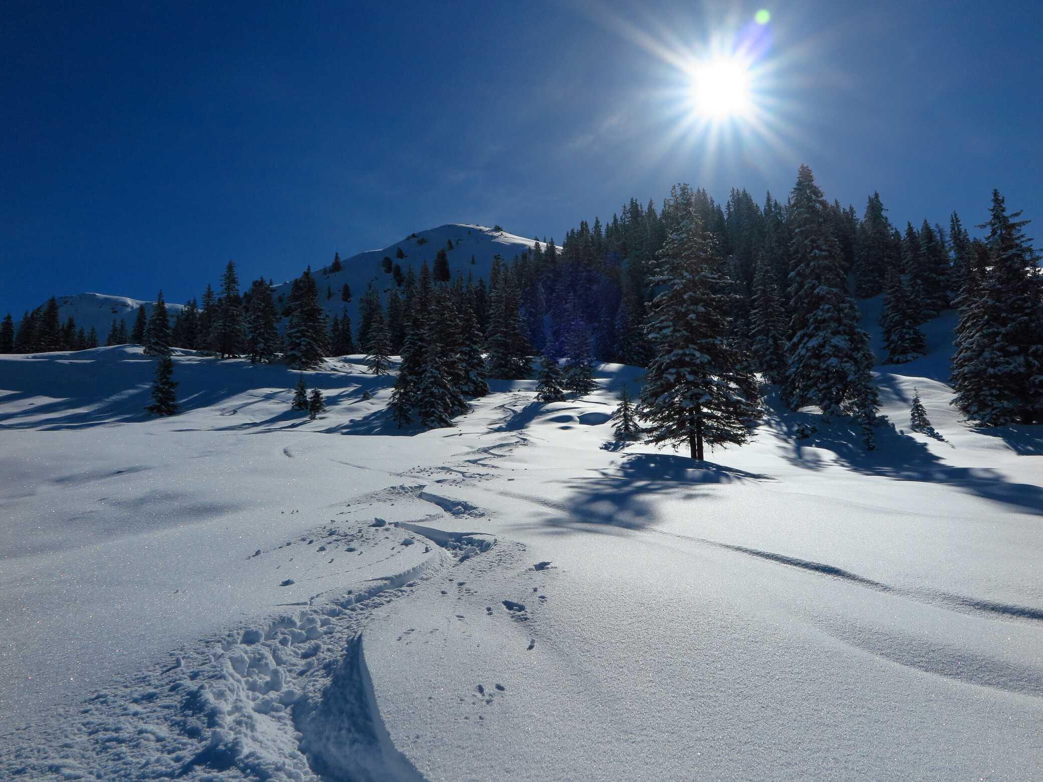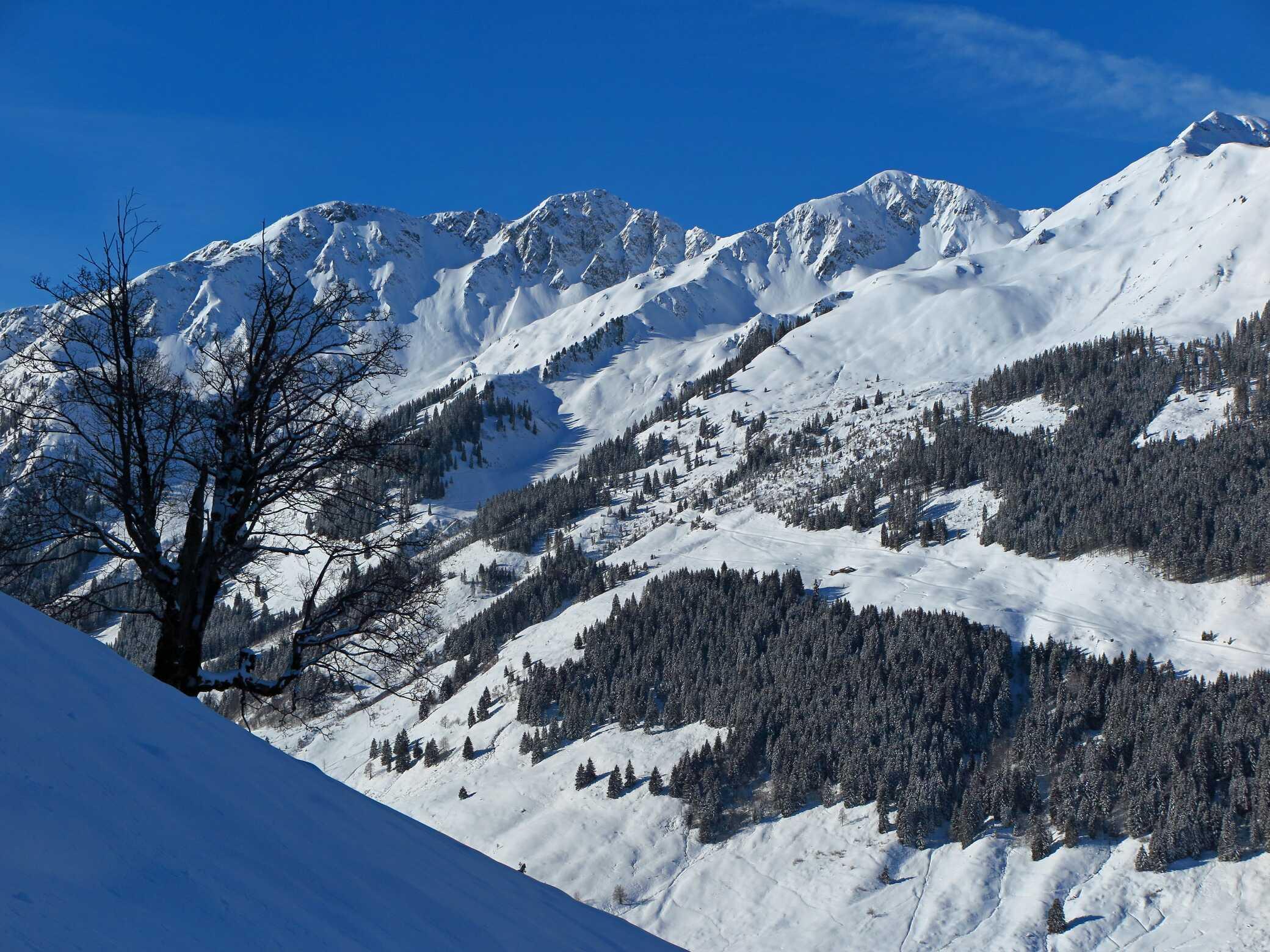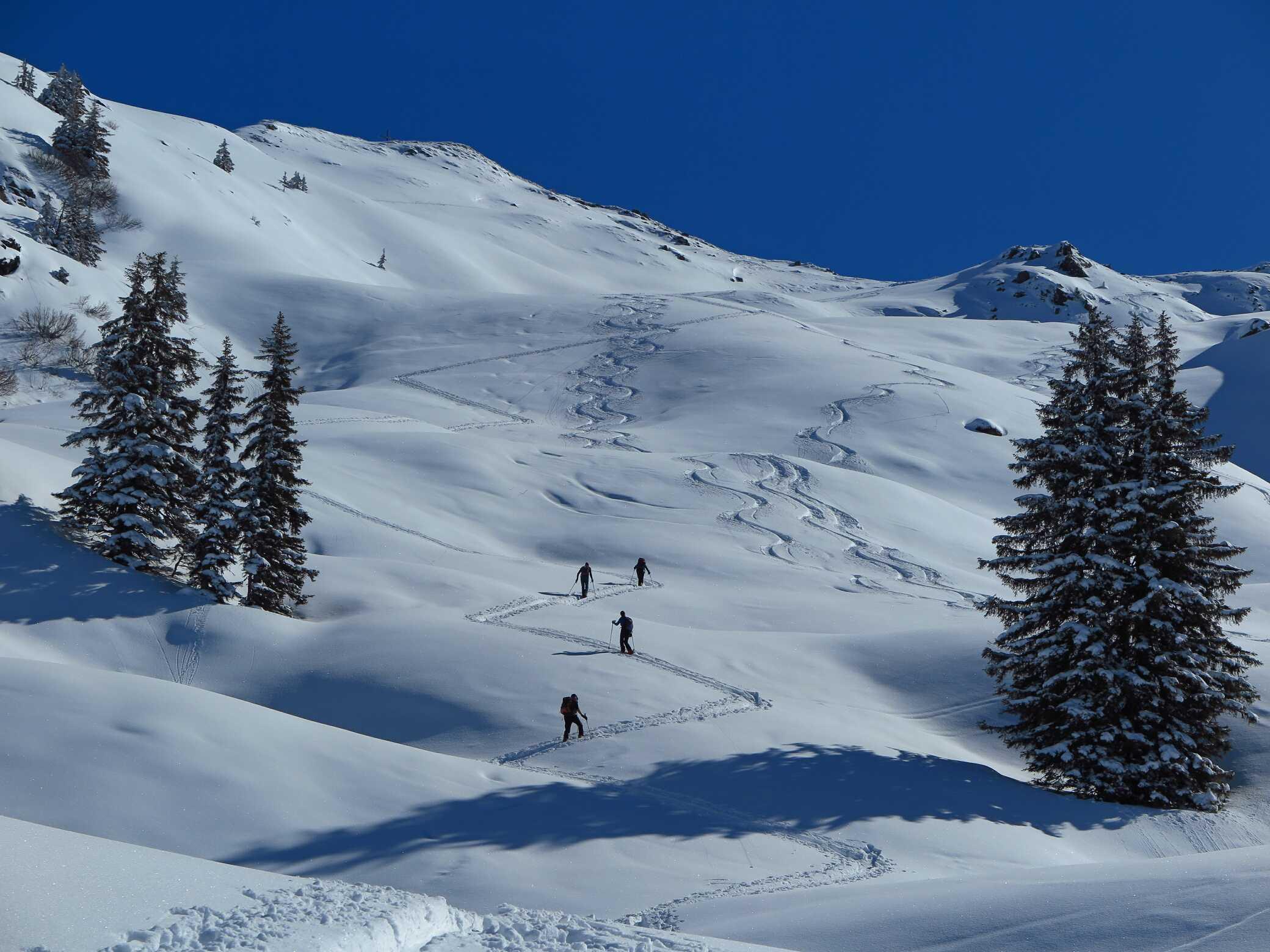 Schneelage: Unten ca. 10-15cm, oben ca. 20-30cm Pulverauflage auf meist guter Unterlage (manchmal etwas inhomogen). Keine Untergrundkontakte und alle Abfahrten in gutem Pulverschnee, bis auf die letzten ca. 200Hm ins Tal (Pappschnee). Insgesamt ca. 2000 Hm sehr schöne Abfahrtshänge, die heute zu meiner Überraschung nur relativ wenig besucht waren.