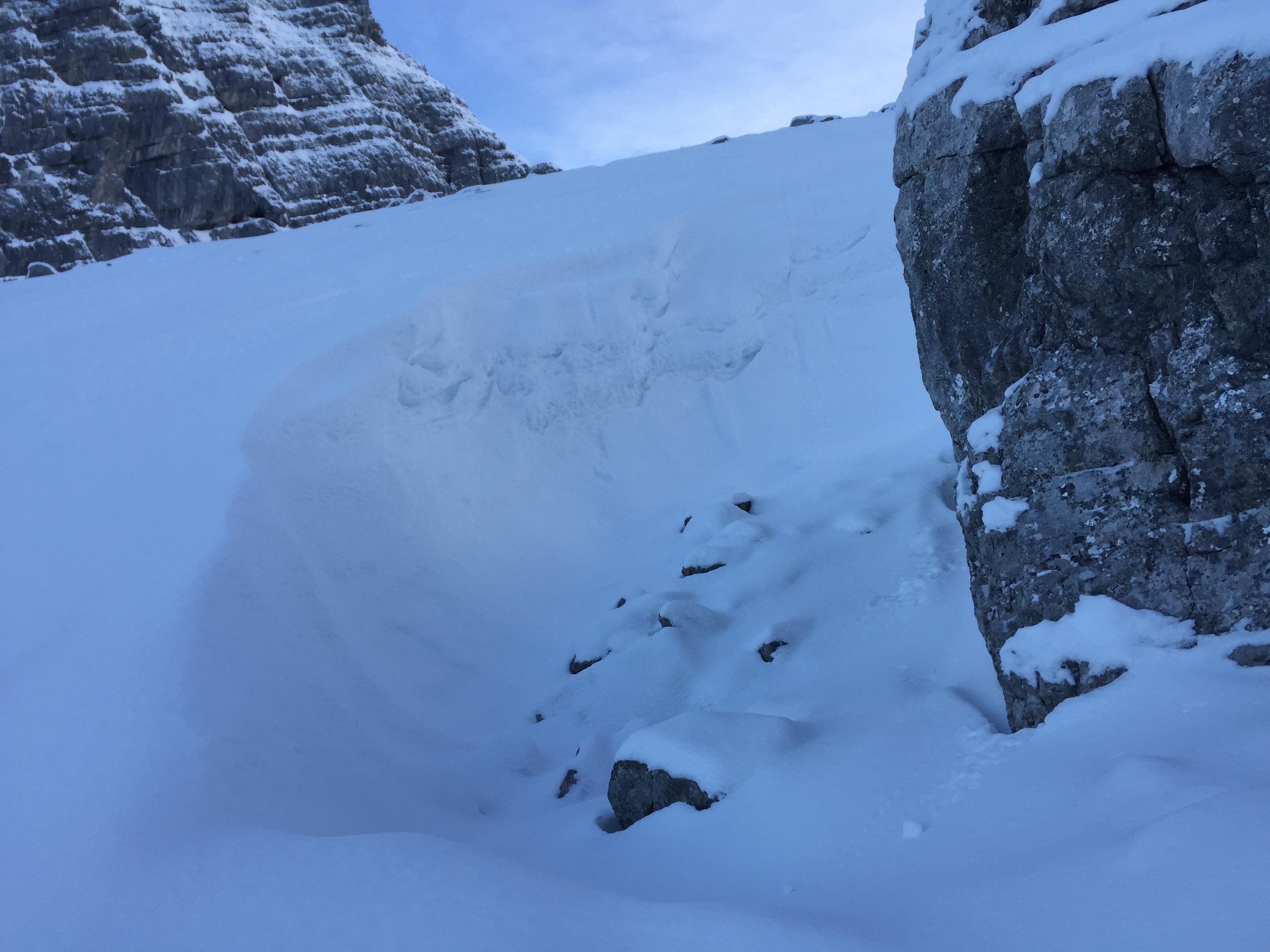 Lawinengefahr: Ausser einigen kleinen oberflächlichen Lockerschneerutschen in den steilen und flankennahen Hangbereichen und dem oben geschilderten Eindruck von eingeschneitem Triebschnee ohne weitergehenden Anhalt für irgendeine Instabilität keine Beobachtungen; Gefahrenstufe Lawinenlagebericht Bayern 2 (oberhalb 1800 m) bzw. 1 (unterhalb 1800 m) und Salzburg 2.