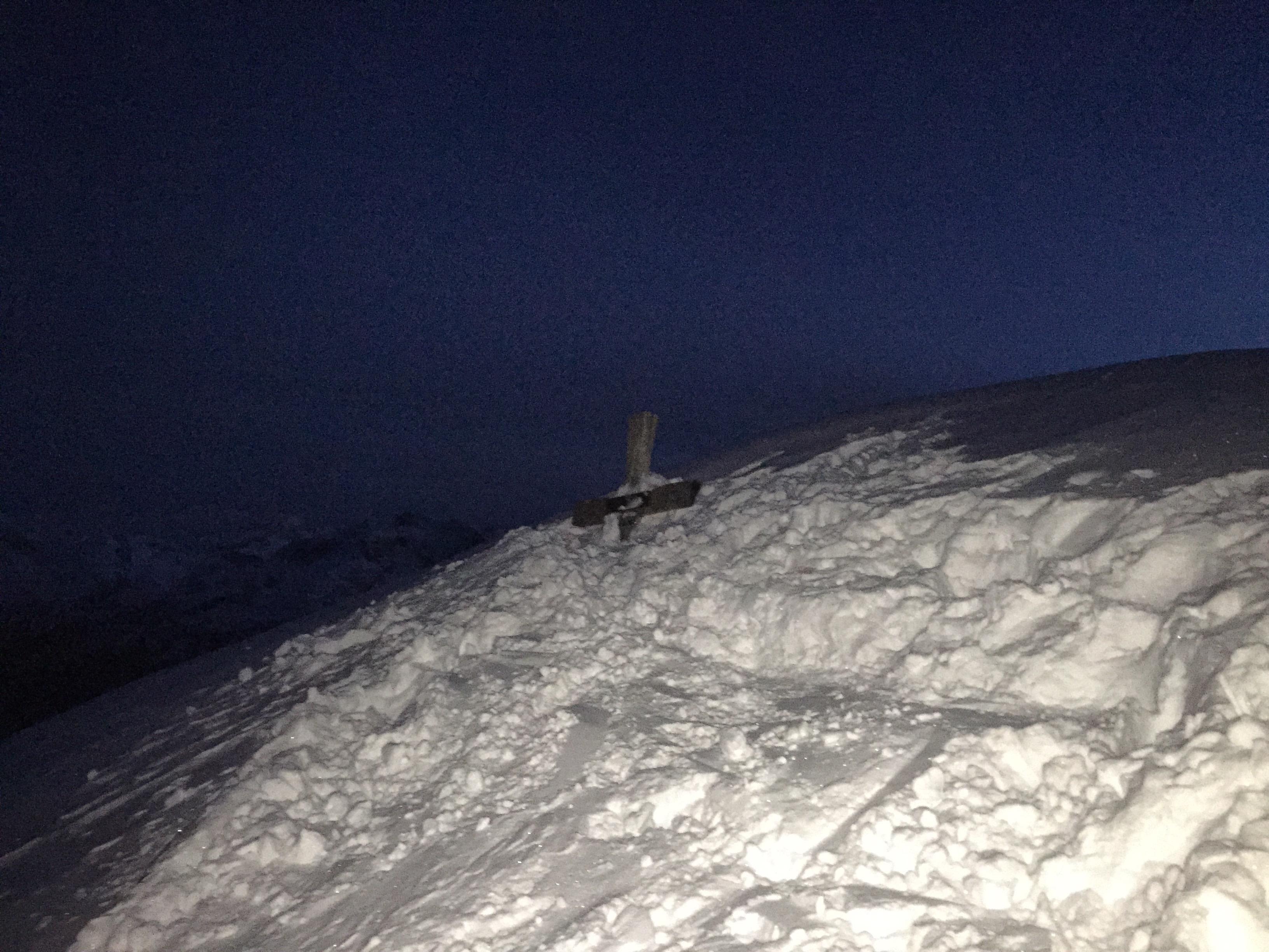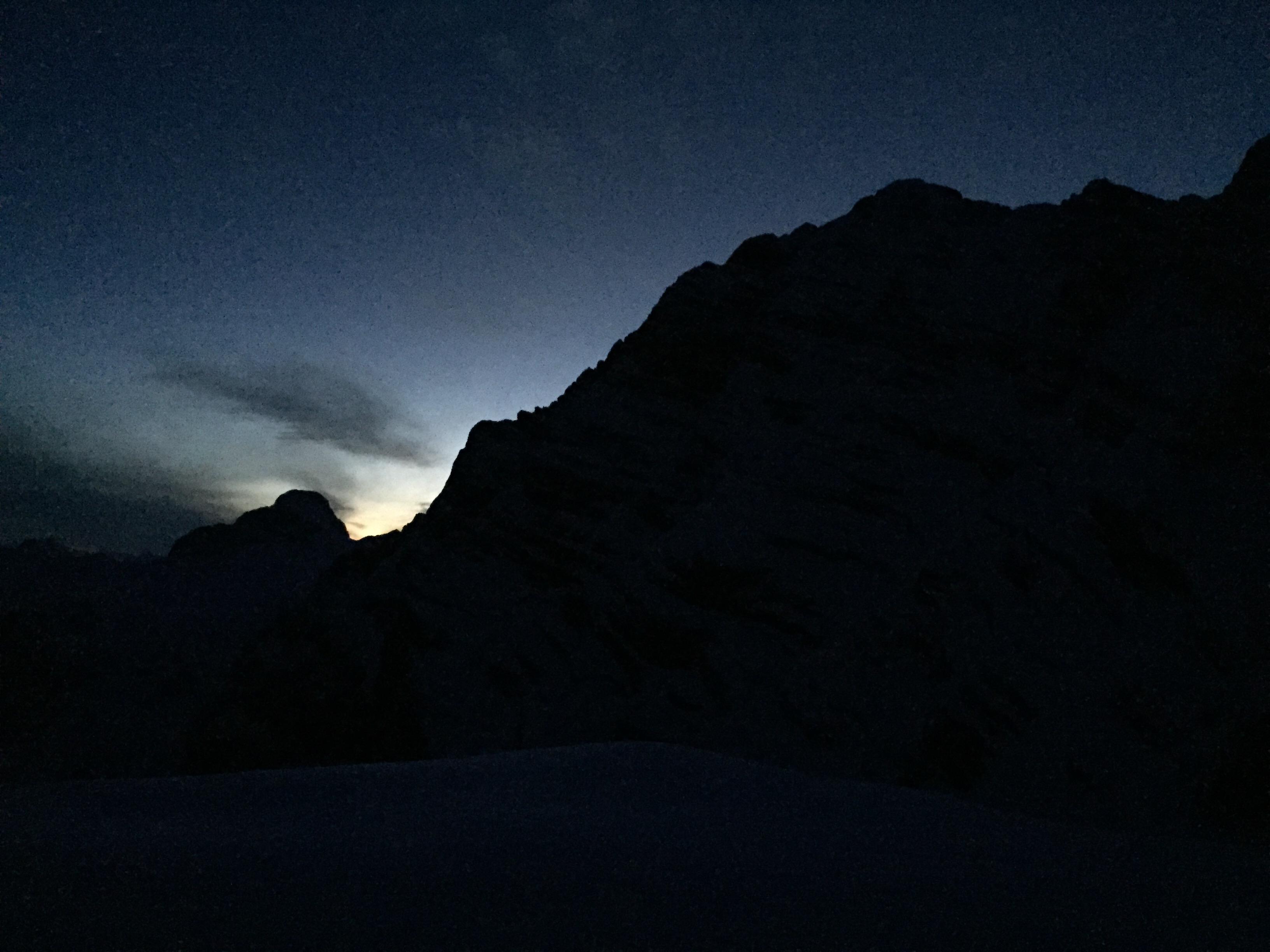 Die erstmals durchgehende und auch dann nur knapp geschlossene Schneedecke beginnt etwas unterhalb der Schapbachalmen, ab der Benzinkurve gehts mit Schneeschuhen bei anfangs häufigem Steinkontakt weiter, nach dem Verlassen des Forstwegs in den Anstieg nach links ab jetzt durchgehend bis zum Gipfel um 15 cm Pulverschnee auf einer nicht-tragenden verharschten Schicht von 3 cm Dicke und darunter in der "Mächtigkeit" sehr variabler Altschneedecke. Im unteren Watzmannkar sind noch etliche Steinkontakte in überall oberflächlich verharschten Abfahrtsspuren zu sehen, die im weiteren deutlich seltener werden; hier extrem unangenehmer eisiger Wind, der Gesicht und Hände kalt und den Gedanken an Umkehr recht konkret werden lässt. Kurz vor dem Fuss des Vierten Watzmannkindes beginnend dann mühsamerer Aufstieg in den steileren Bereich wegen unter den Schneeschuhen abrutschender ungebundener Pulverschneeauflage, im weiteren Eindruck von eingeschneitem Triebschnee. Wundervolle abendliche Stimmung bei Restlicht am Gipfel. Abstieg unter Sternenhimmel entlang der Aufsstiegsspur im Schein der Stirnlampe (nach Anruf bei der Integrierten Leitstelle Traunstein, dass die evtl. vom Tal aus zu sehenden Lichtzeichen kein Hilferuf sind).