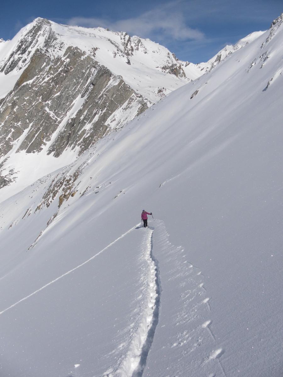Um Kasern im hintersten Ahrntal (Südtirol) ist die Schneelage nicht gerade üppig, nordseitig jedoch ausreichend. Pulver und viel aufbauend umgewandelter Schnee in den Nordlagen, die Südhänge sind am ausapern. Nur ein kurzes Sonnenfenster am Samstag erlaubt bei LWS3 eine klassische Tour, für die restlichen Sauwettertage bietet der Talschluss nur wenige Ausweichziele (Fr.:Golatsch über Stegeralm, So.: Achsel von Trinkstein).