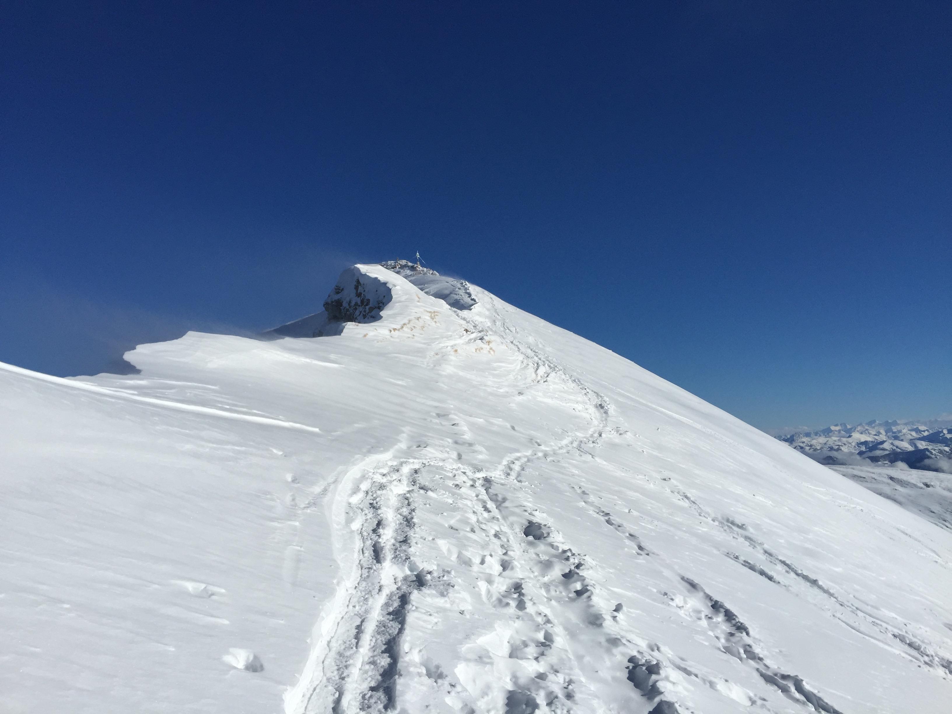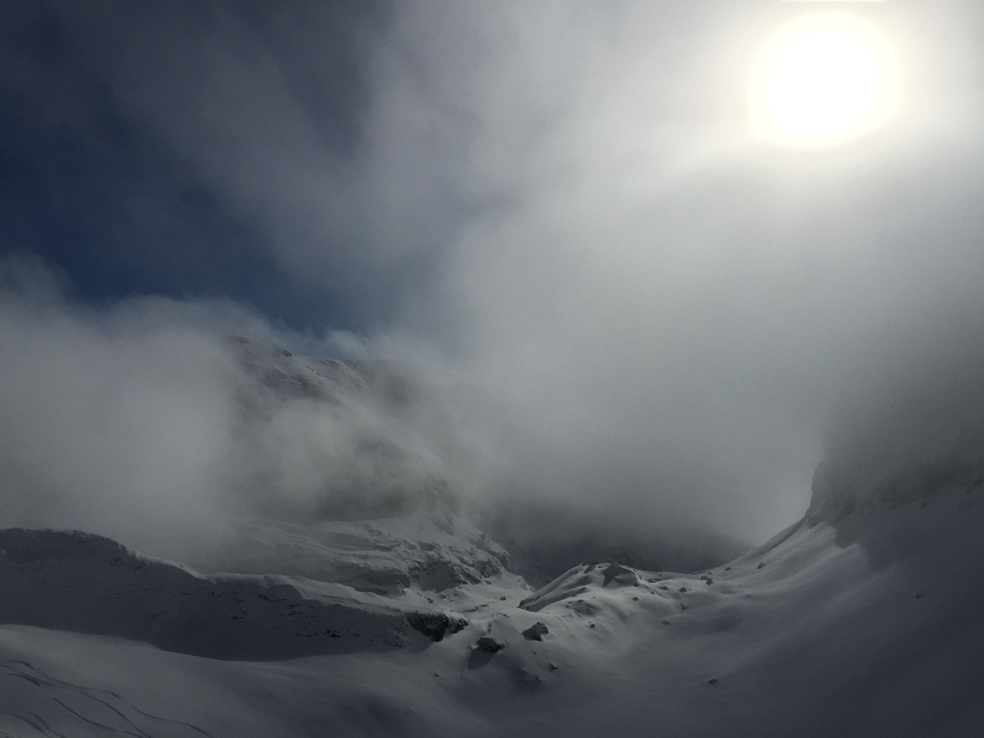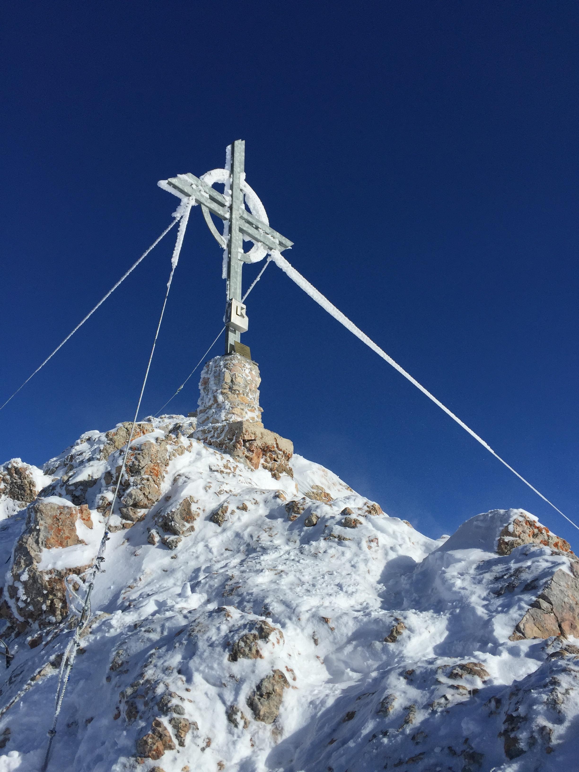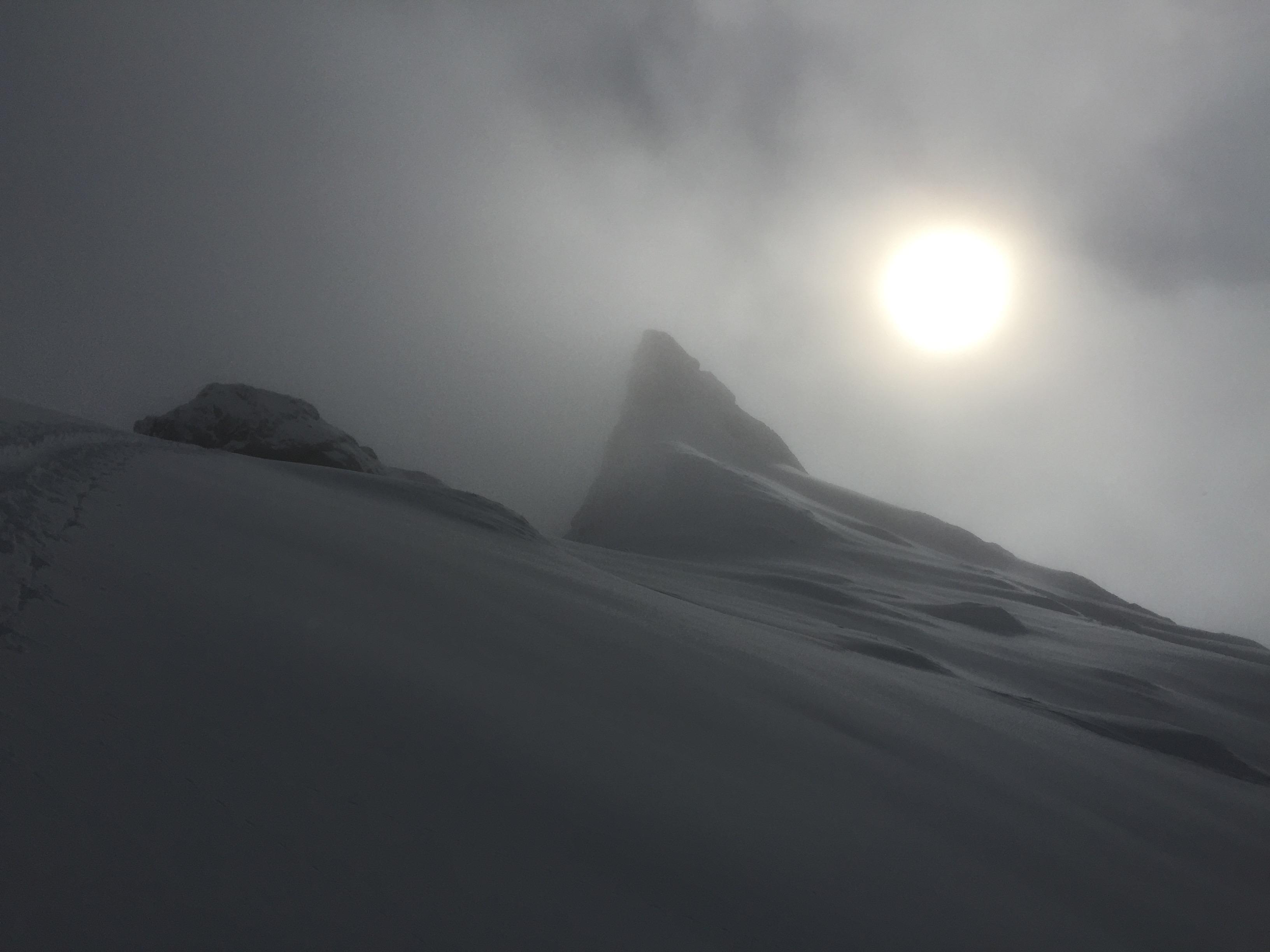 Auf etwa 15 cm frischem Pulverschnee und drunter Altschnee in variabler und insgesamt geringer Höhe im wechselnden Lichtspiel zur Rofanspitze, der Gipfelhang wegen fehlendem Schneefundament etwas unangenehm zu gehen, am Gipfel stürmisch mit deutlichen Schneefahnen und eiskalt, dafür ein phänomenales Panorama in alle Richtungen.